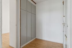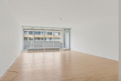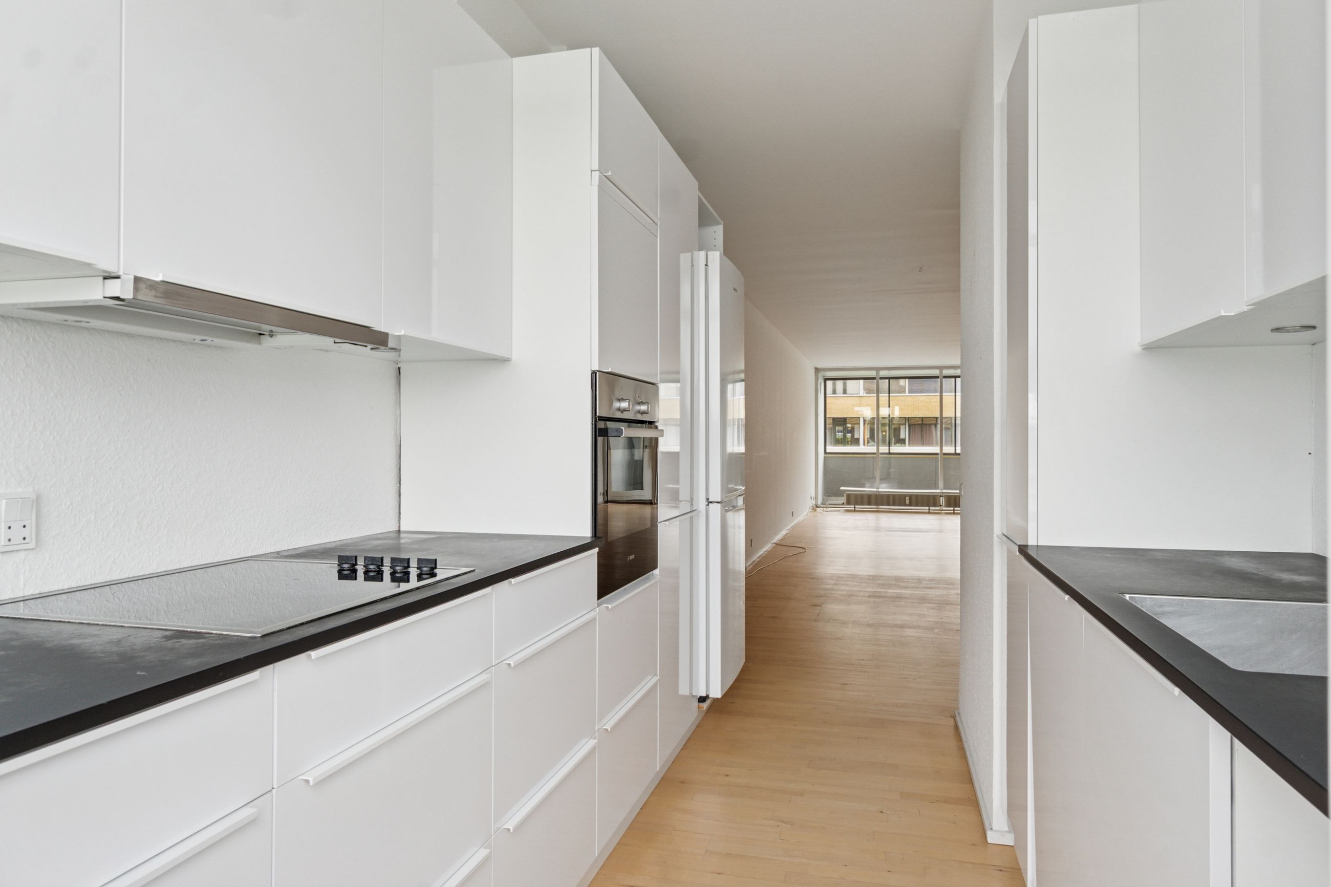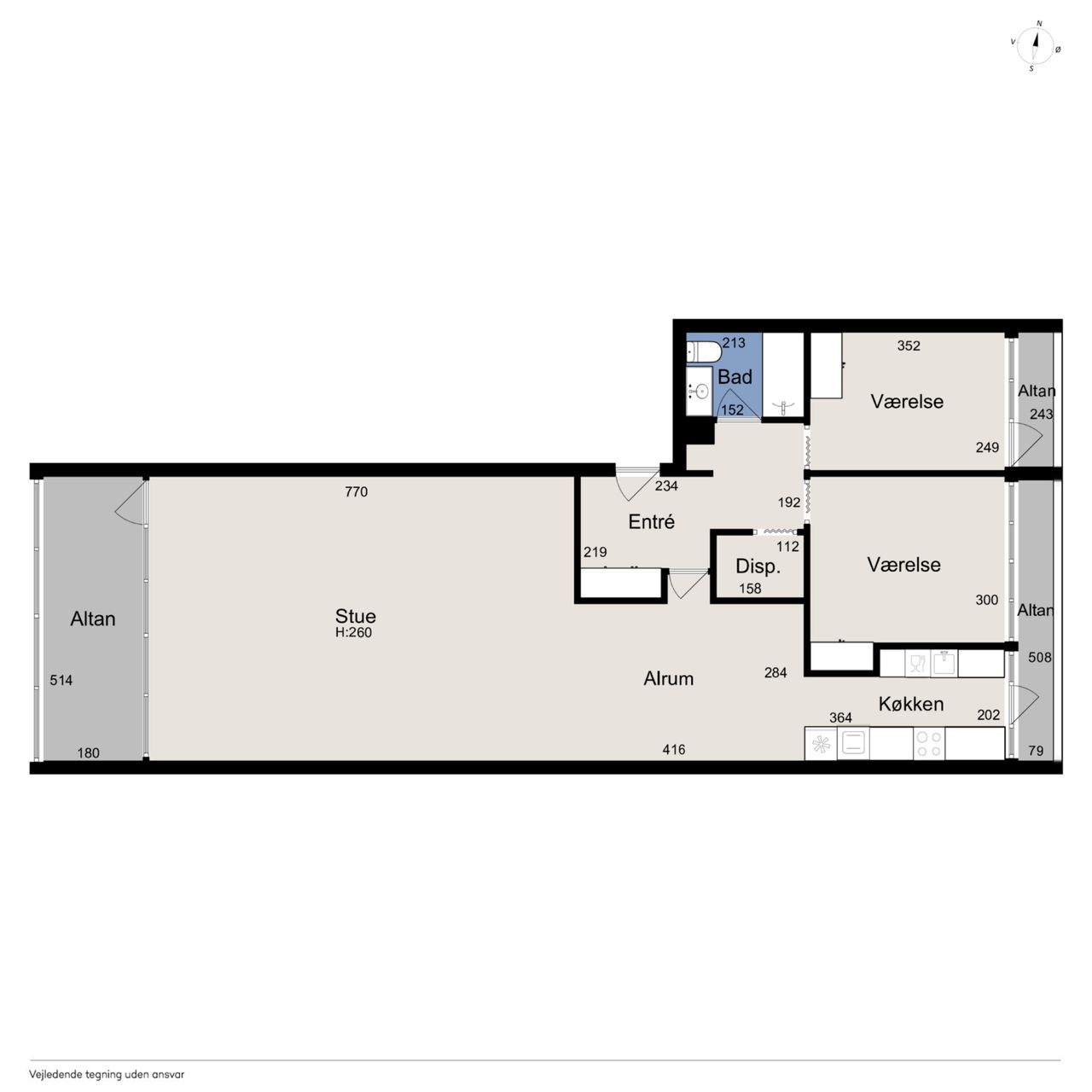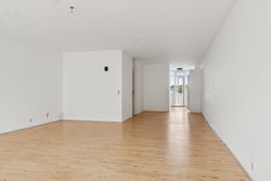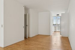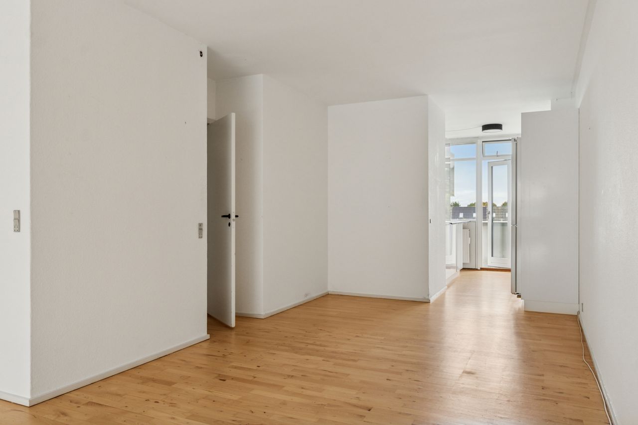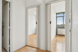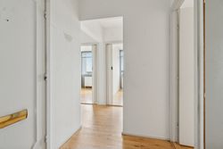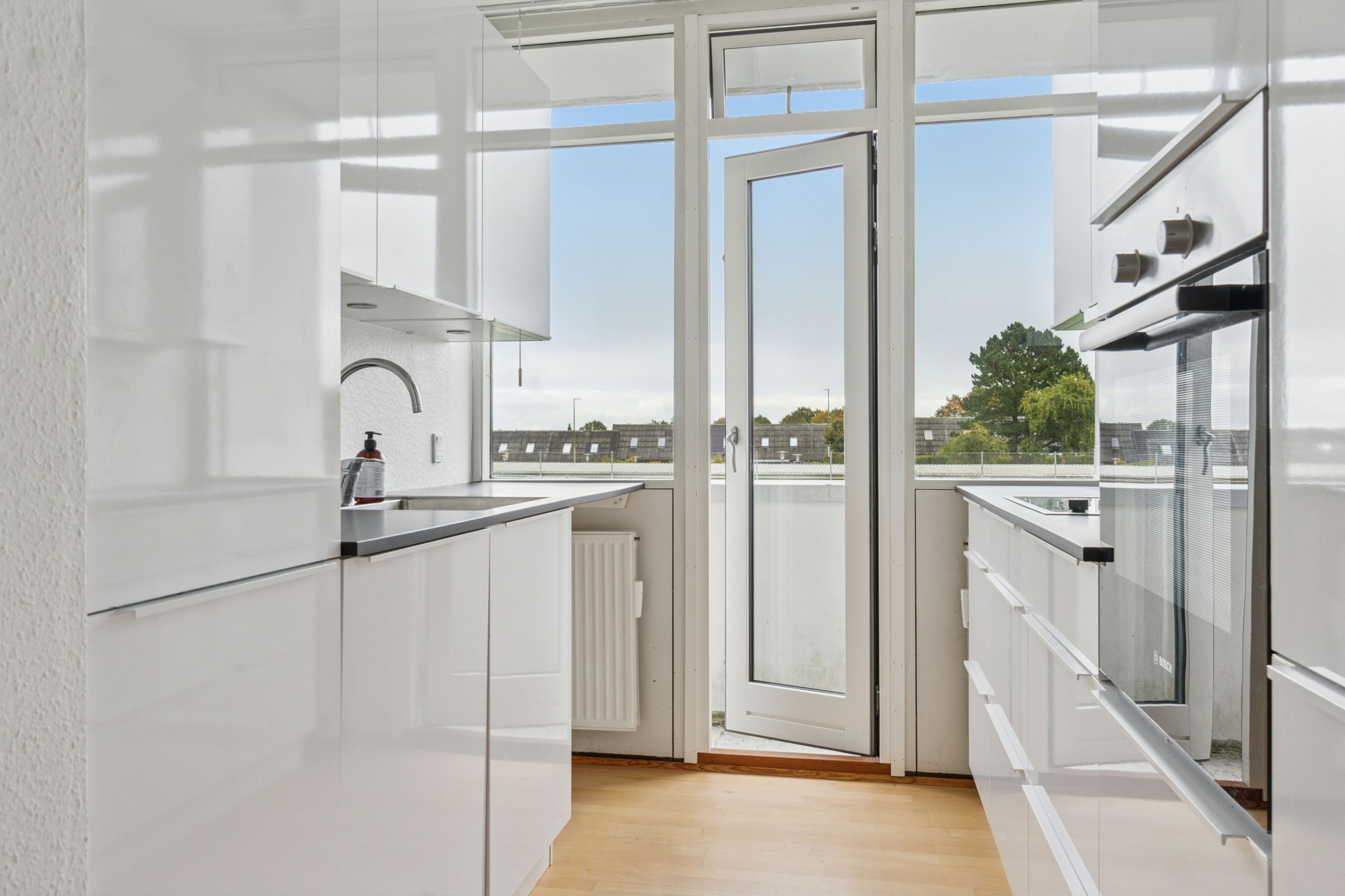 Lejligheden er umøbleret og har pæne trægulve. Den helt regulære planløsning gør det let at forestille sig indretningen. Her er ingen spildplads. I stedet folder boligens kvadratmeter sig ud over en entré med indbyggede skabe, der først og fremmest giver adgang til karbadeværelset og boligens to gode værelser. De har ligeledes indbyggede skabe. Tilbage er der køkkenet som er lyst og nyere samt stuen, som på naturlig vis skaber alrumsfornemmelser, og til begge sider kan man åbne altandøre ud til den friske luft. I den ene retning er der morgensol, mens den vestvendte – og største altan, som er lukket – i praksis udvider opholdsarealet i sommerhalvåret.