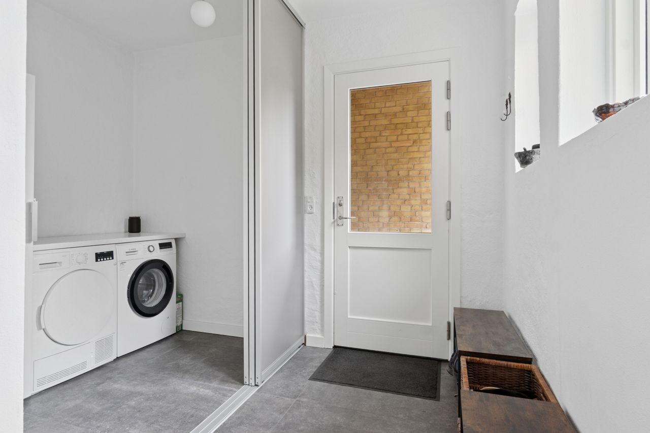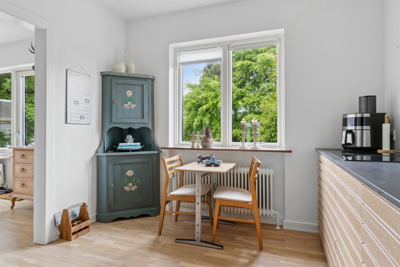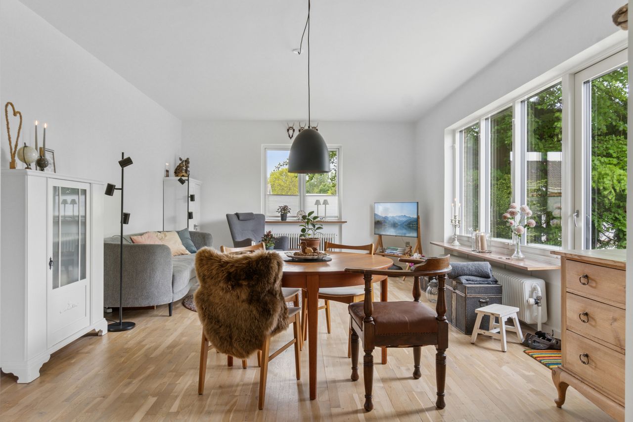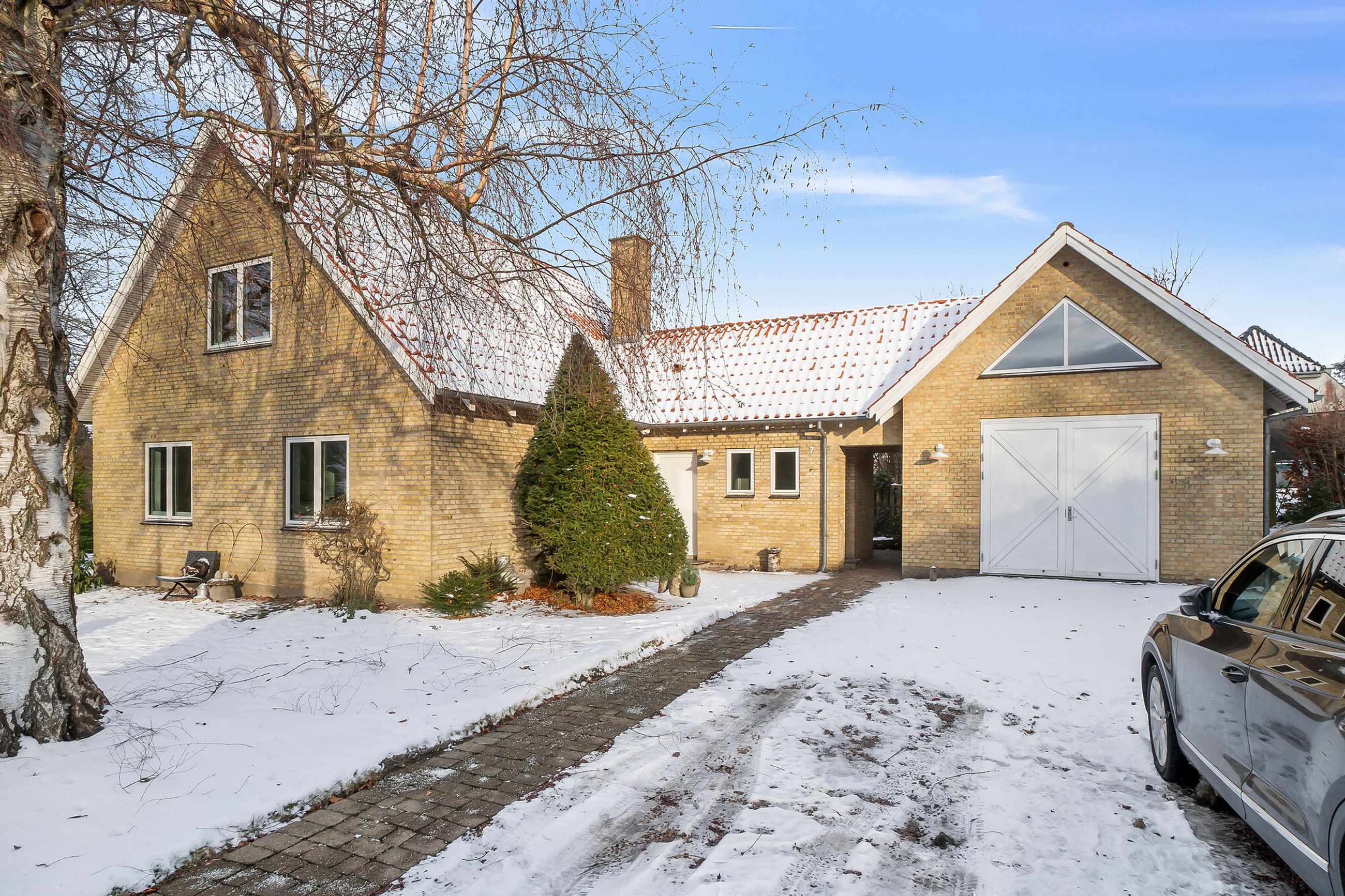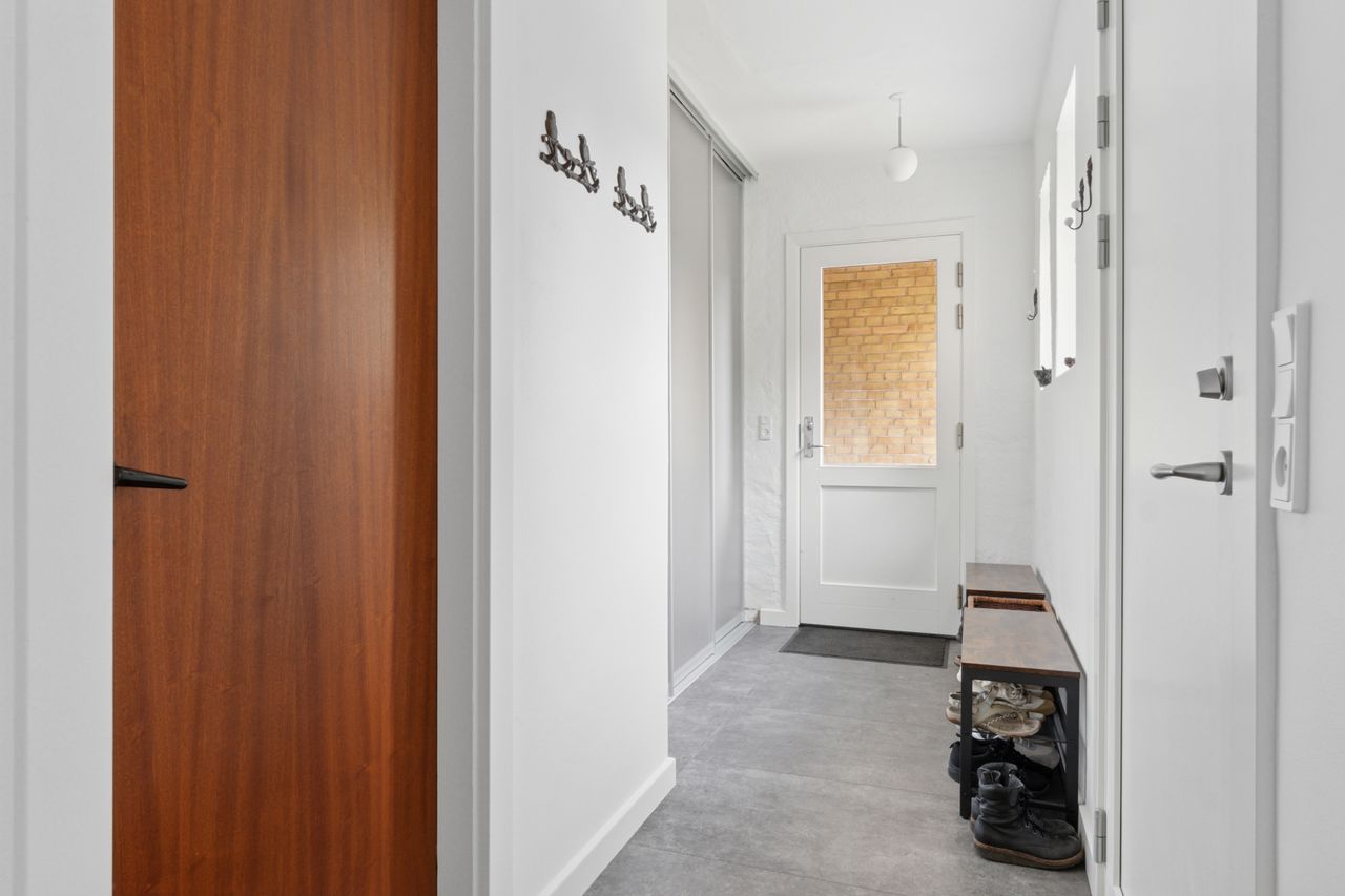 Ejendommen er opført i 1963 og præsenterer sig pænt med gule sten, rødt tag og en rummelig indkørsel med plads til mere end to biler. Hjemmet er renoveret fra slut 2023 til starten af 2024, og det ses tydeligt i det elegante køkken fra Kvik, der ligger i delvis åben forbindelse med stuen. I den indretningsvenlige stue stråler solen gavmildt ind fra syd og vest gennem de nye vinduer og havedøren, og resten af stueplanet rummer to gode værelser samt et nyt badeværelse og bryggers, der begge har gulvvarme.