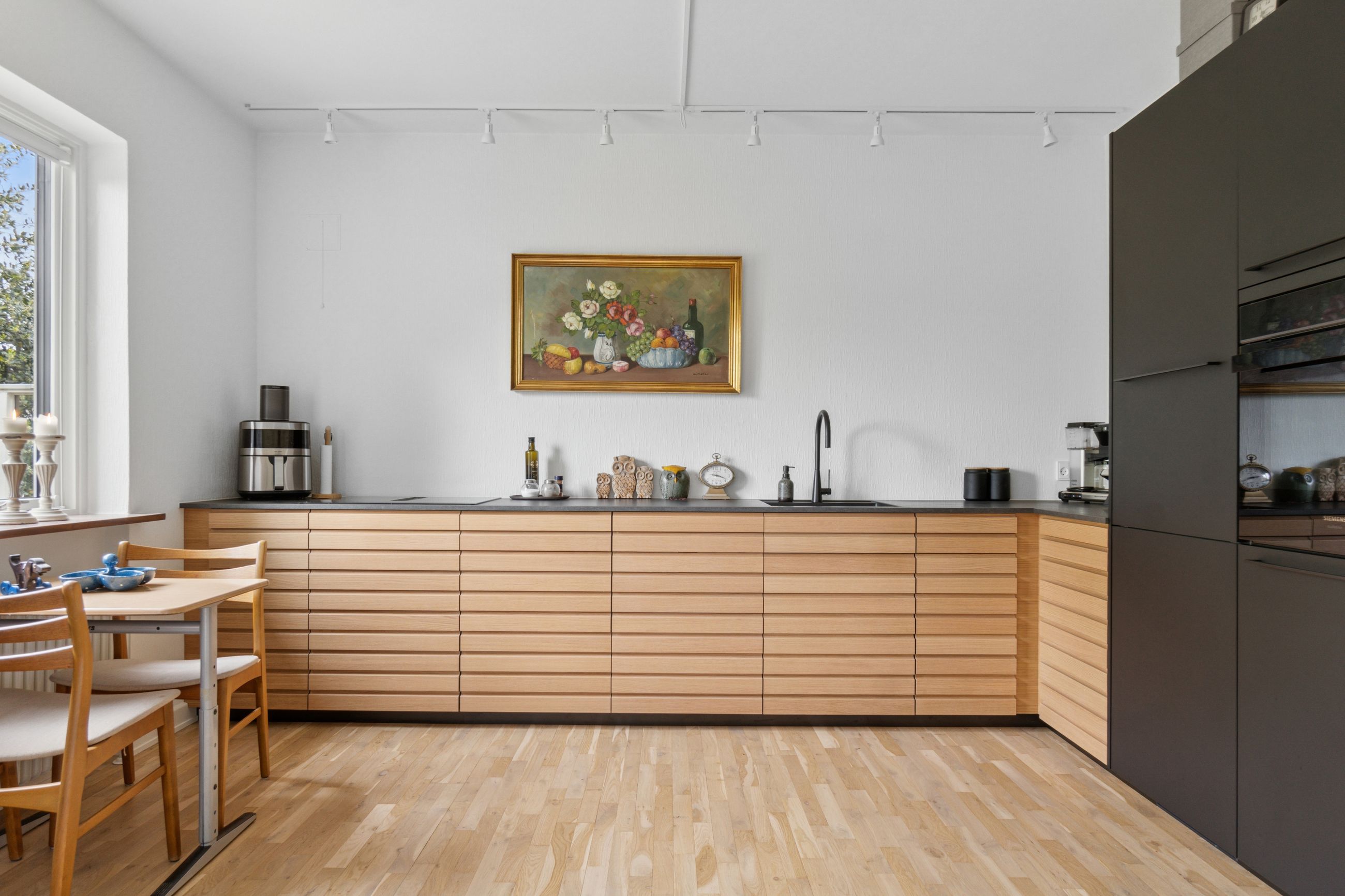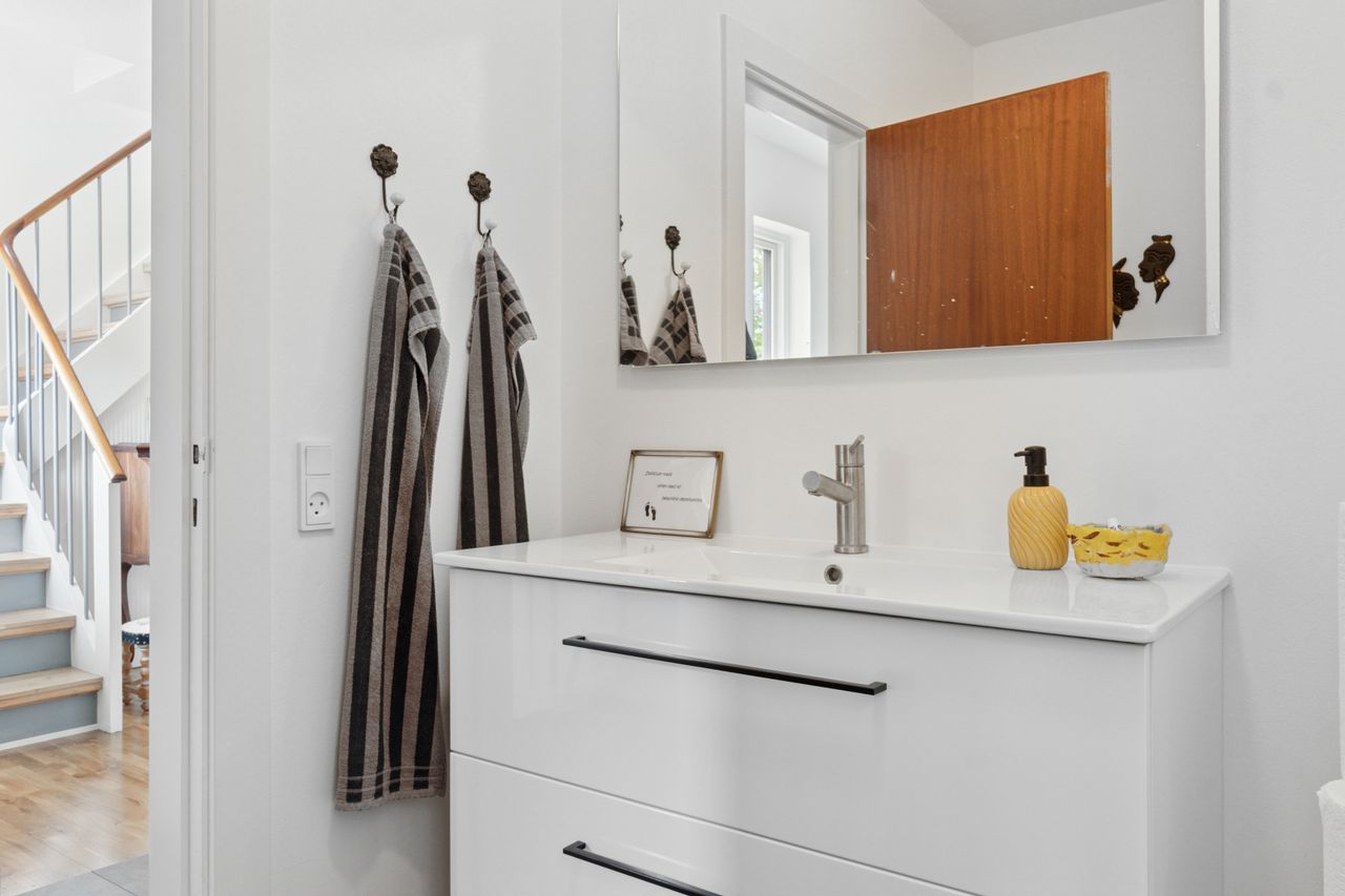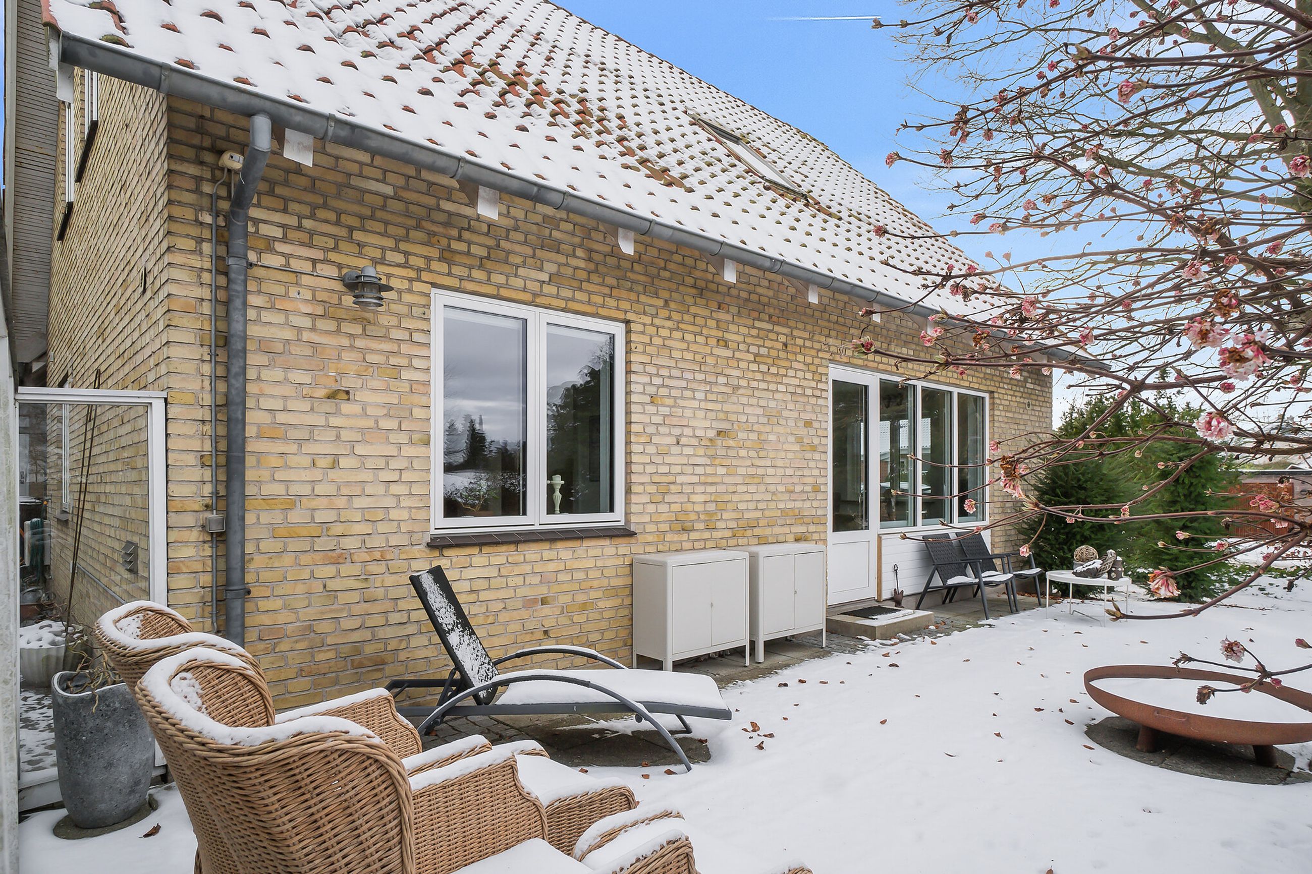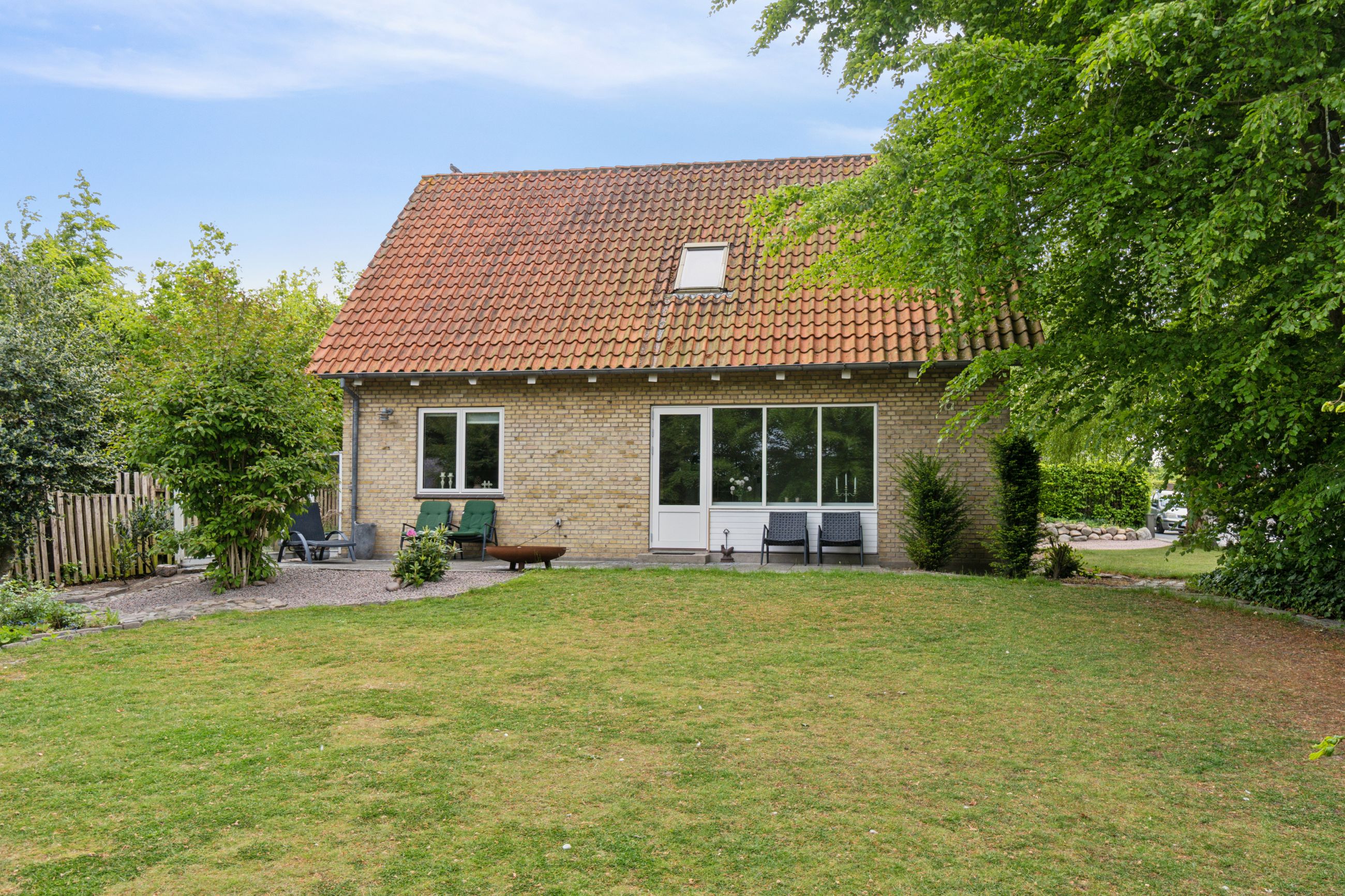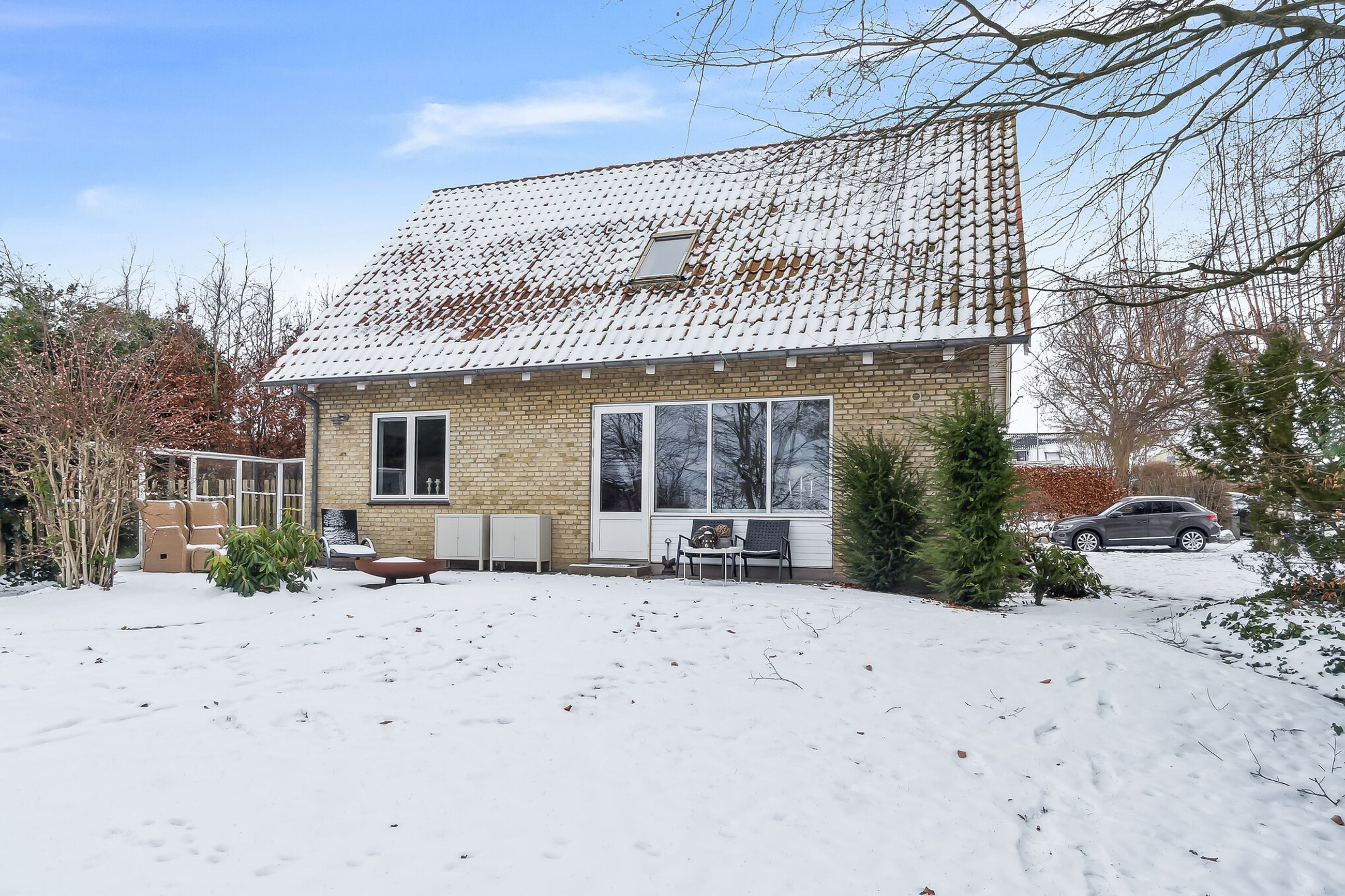 Ejendommen er opført i 1963 og præsenterer sig pænt med gule sten, rødt tag og en rummelig indkørsel med plads til mere end to biler. Hjemmet er renoveret fra slut 2023 til starten af 2024, og det ses tydeligt i det elegante køkken fra Kvik, der ligger i delvis åben forbindelse med stuen. I den indretningsvenlige stue stråler solen gavmildt ind fra syd og vest gennem de nye vinduer og havedøren, og resten af stueplanet rummer to gode værelser samt et nyt badeværelse og bryggers, der begge har gulvvarme.