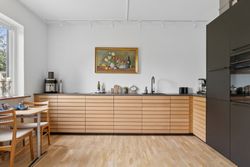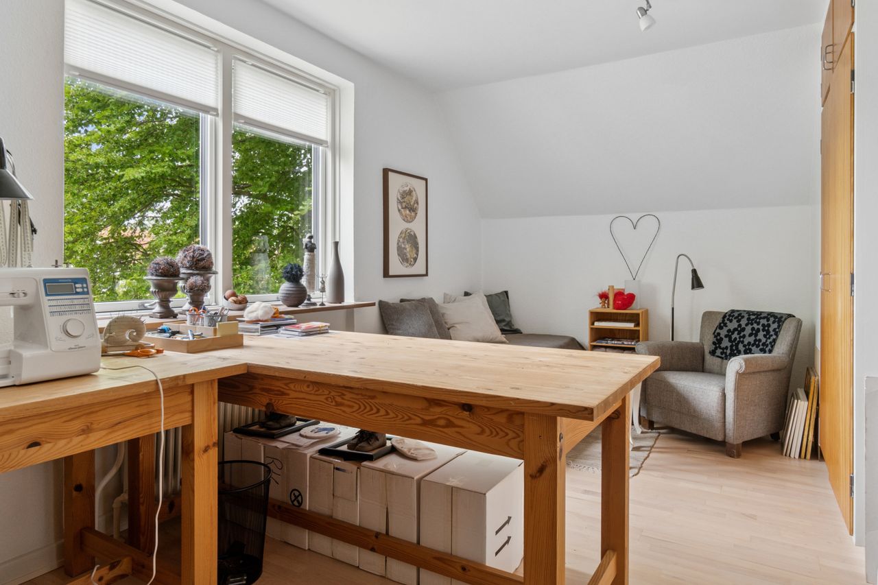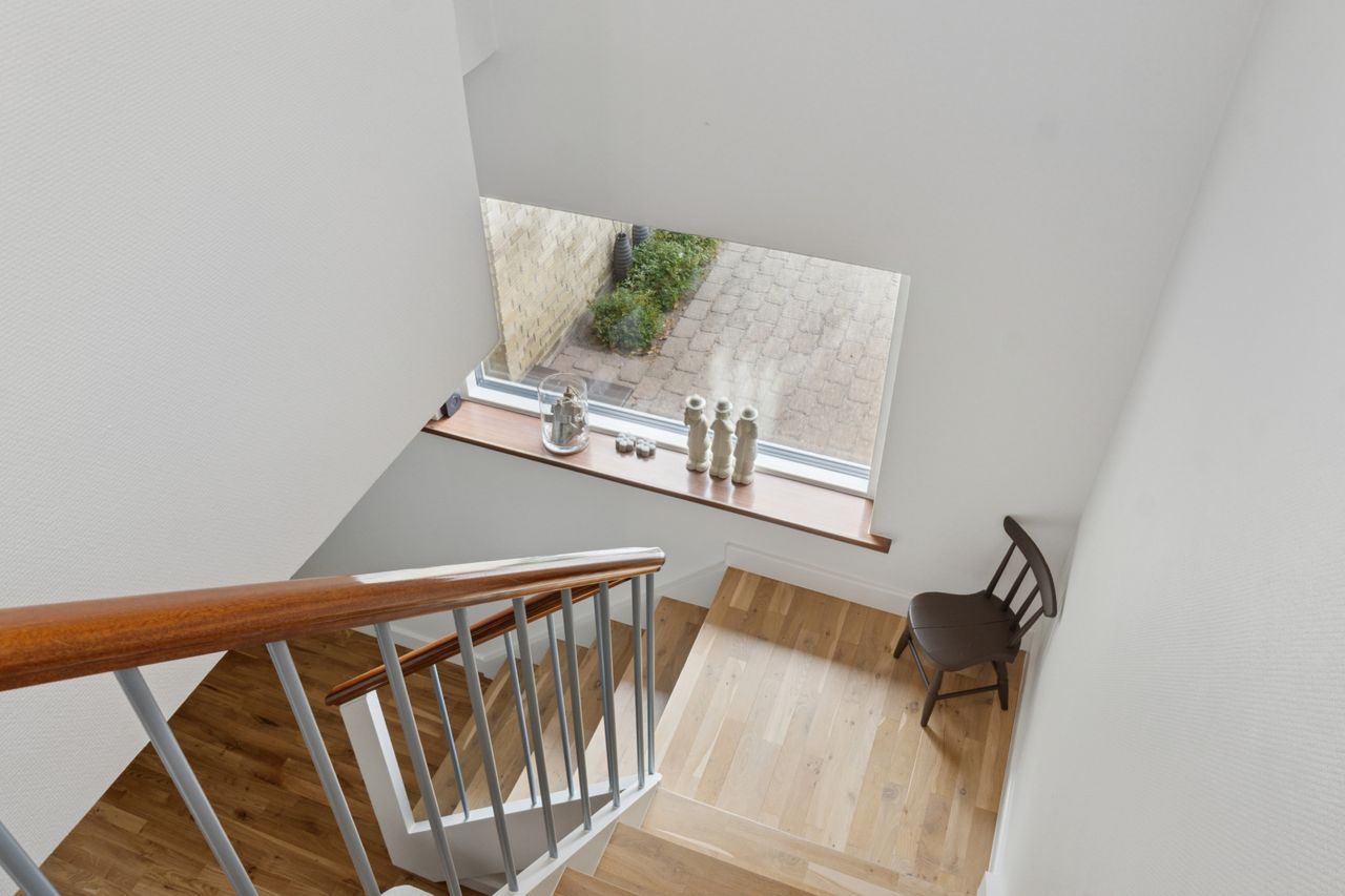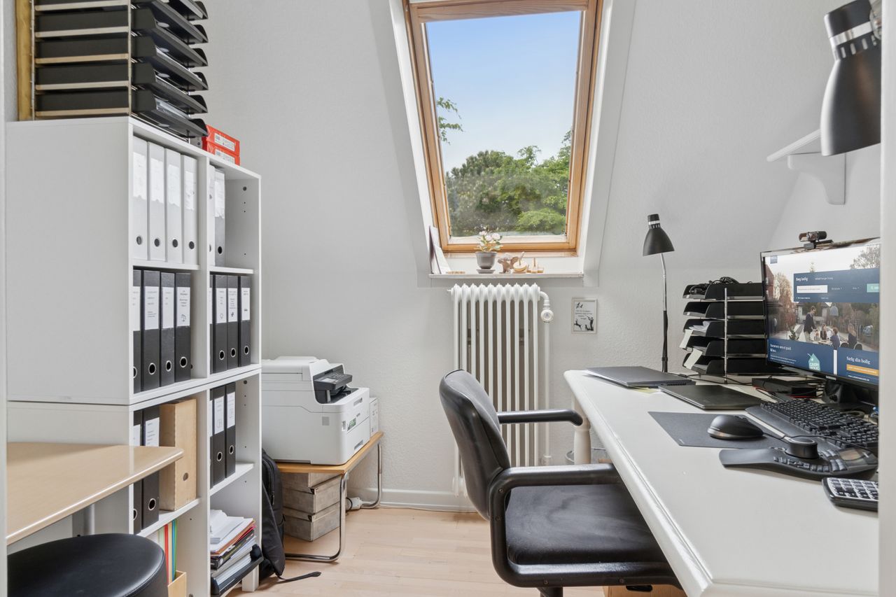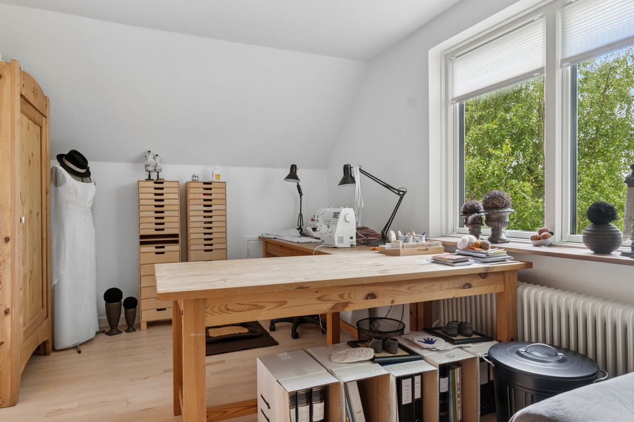 Førstesalen er indrettet med to gode værelser, et kontor, garderoberum og endnu et badeværelse, hvor terrazzogulvet er slebet flot op.