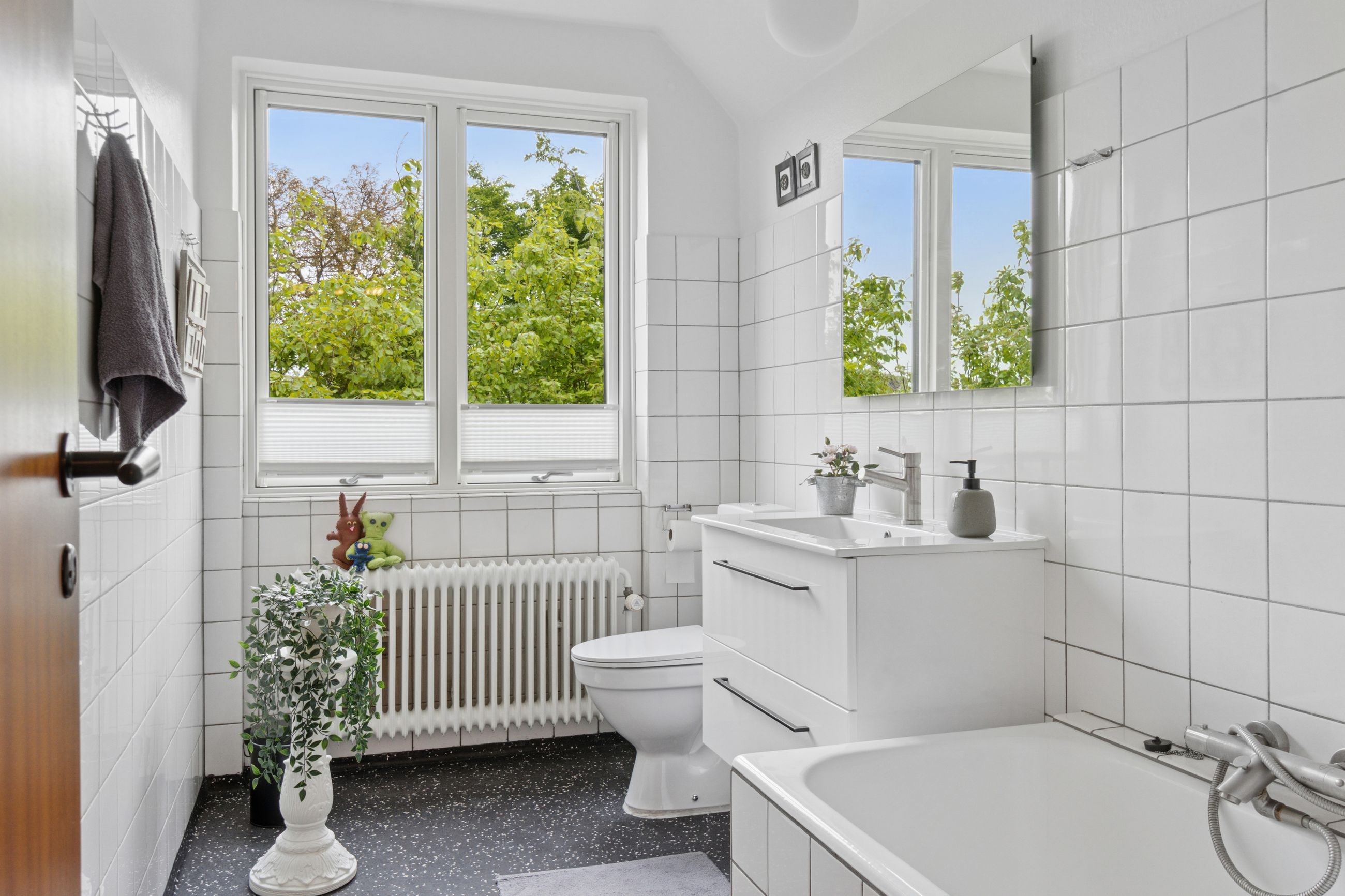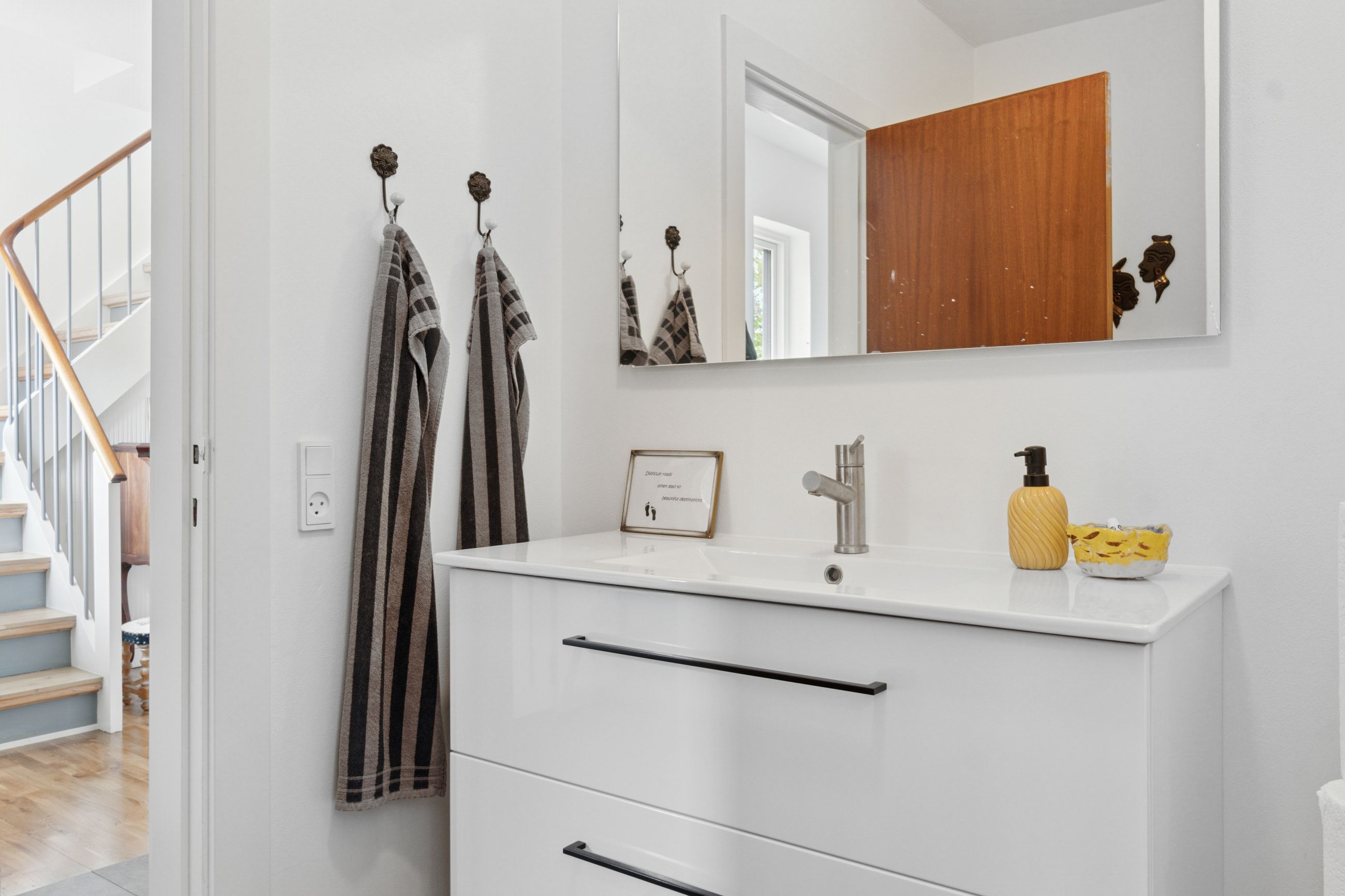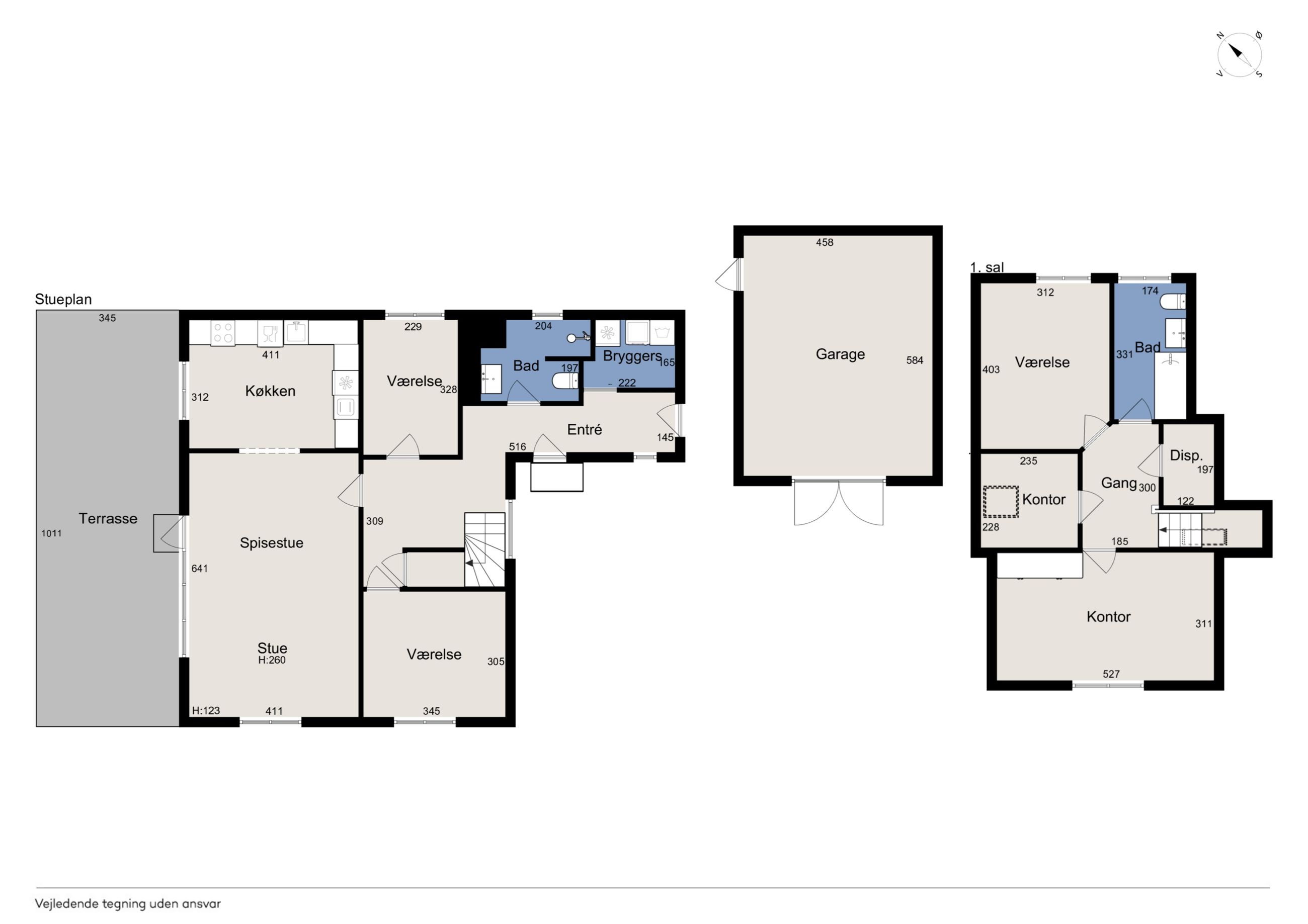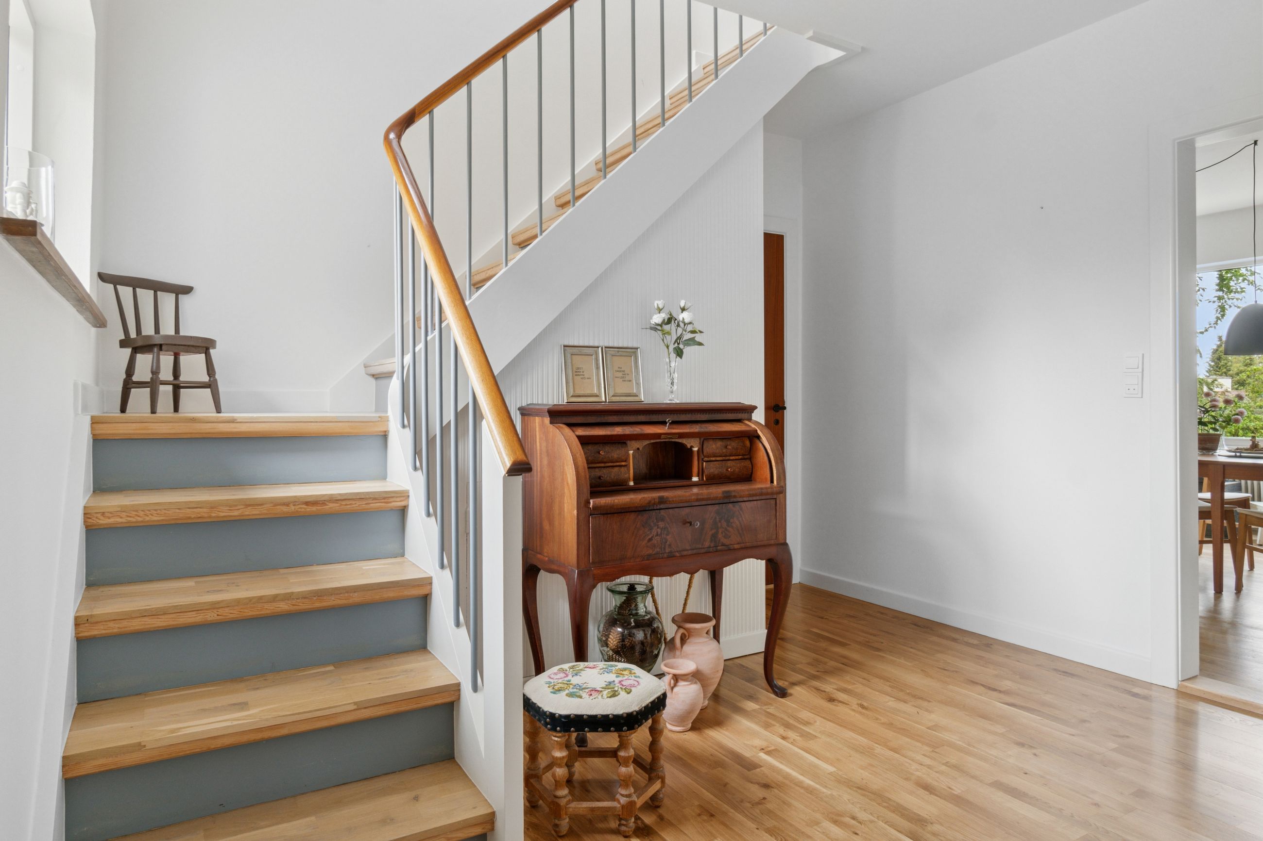 Førstesalen er indrettet med to gode værelser, et kontor, garderoberum og endnu et badeværelse, hvor terrazzogulvet er slebet flot op.