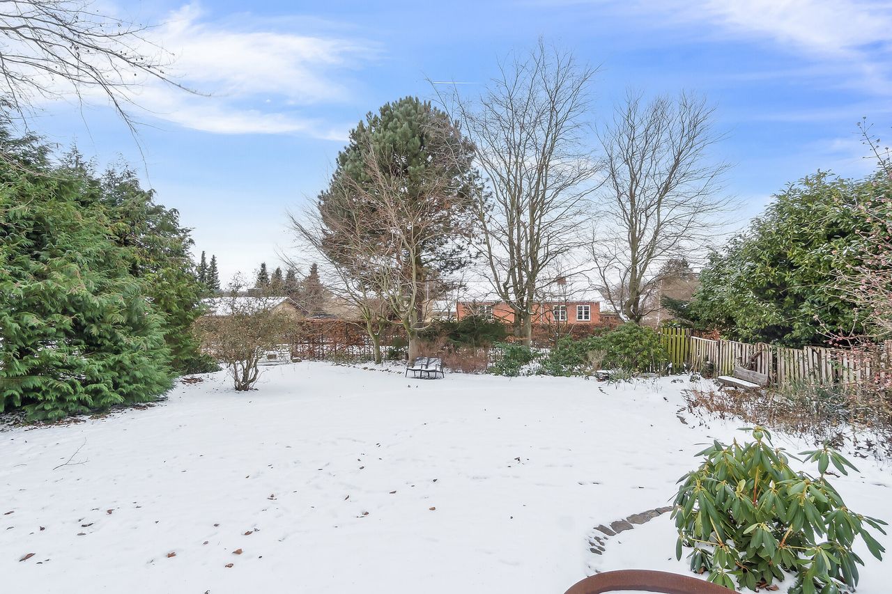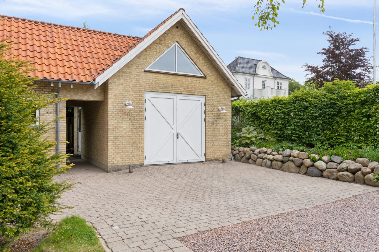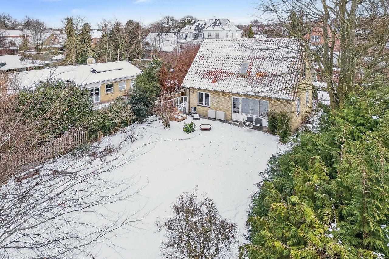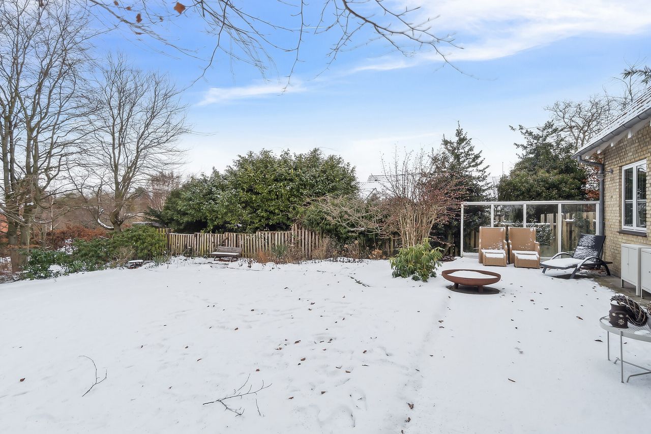 Grunden har en god størrelse på 968 kvm, og takket være arkitektens kloge streger og den flot opvoksede beplantning får I det skønneste uderum. Foran stuen ses en fliseterrasse med aftensol, og for enden af indkørslen har I en muret garage med rigtig god opbevaringsplads.