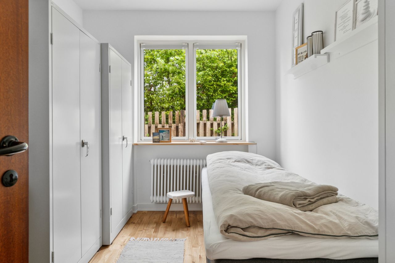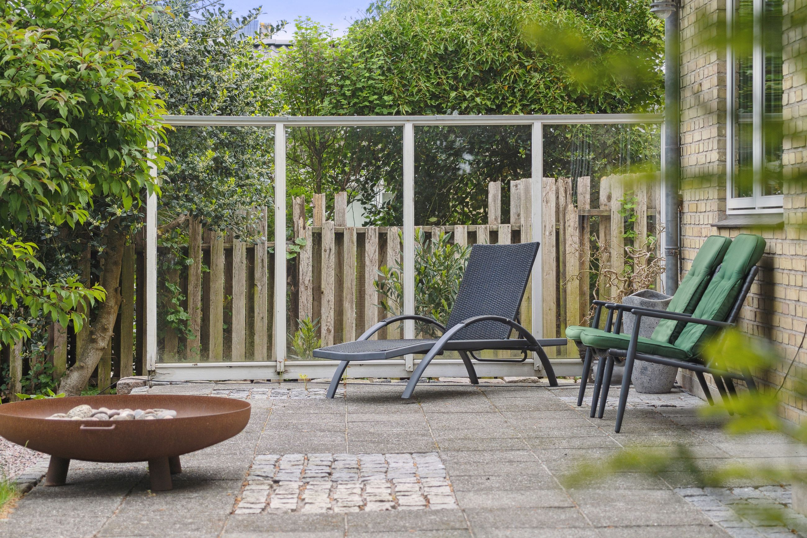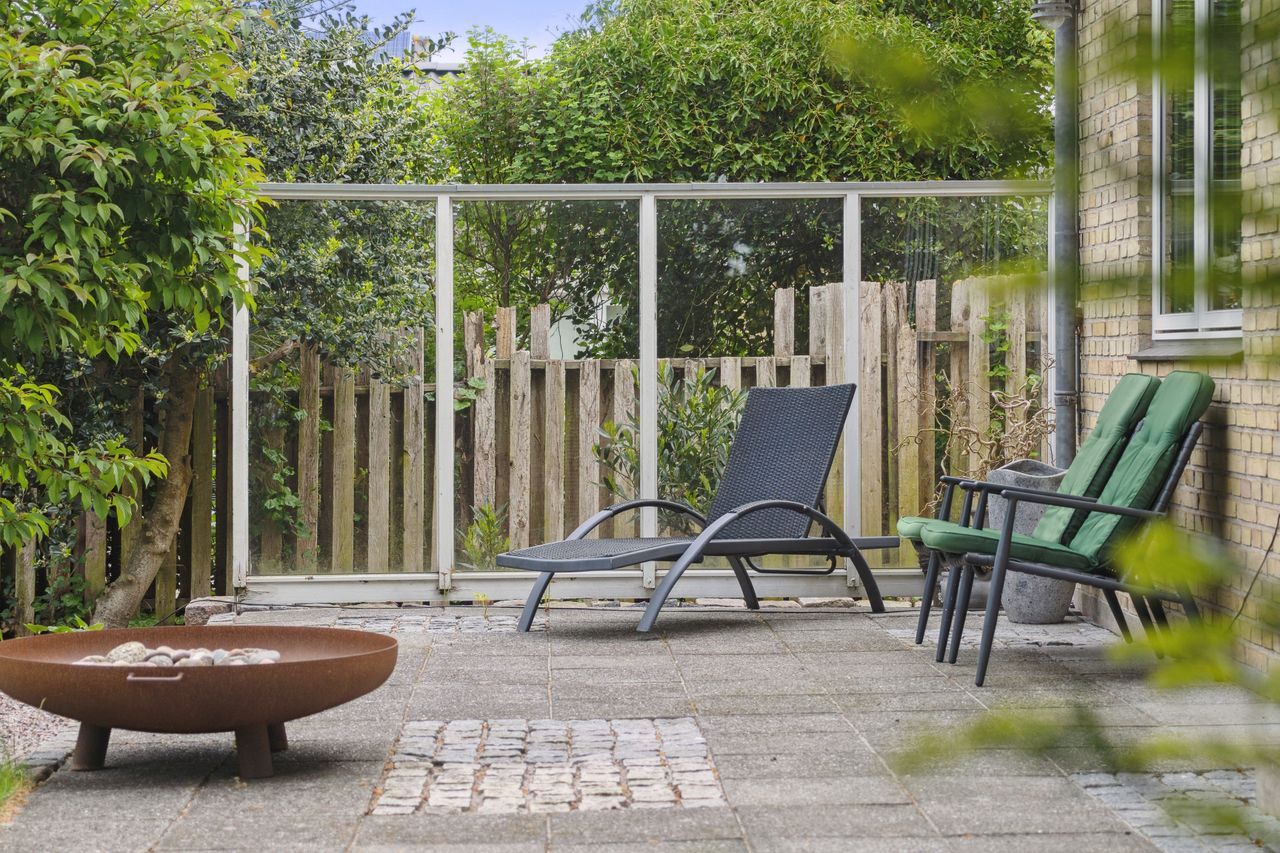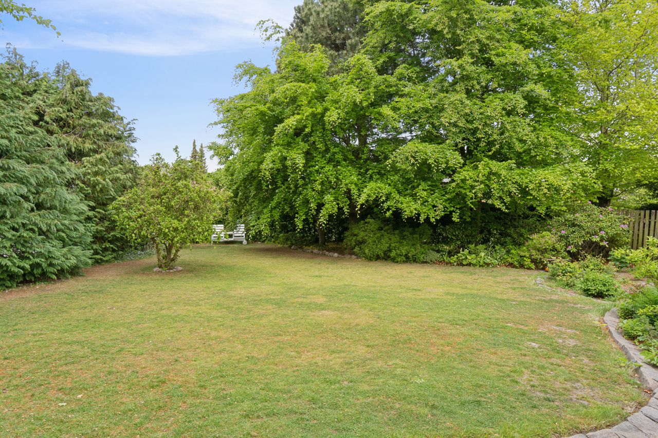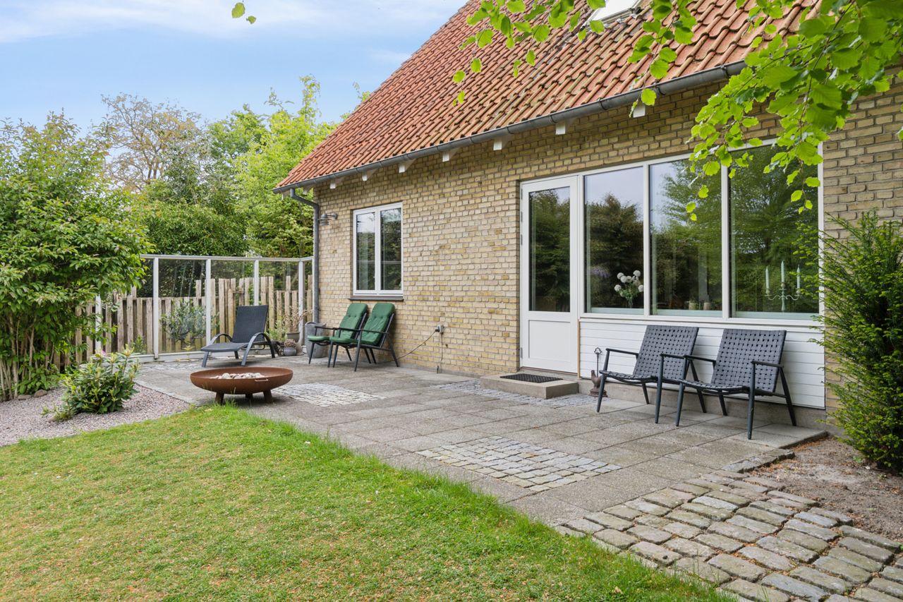 Grunden har en god størrelse på 968 kvm, og takket være arkitektens kloge streger og den flot opvoksede beplantning får I det skønneste uderum. Foran stuen ses en fliseterrasse med aftensol, og for enden af indkørslen har I en muret garage med rigtig god opbevaringsplads.