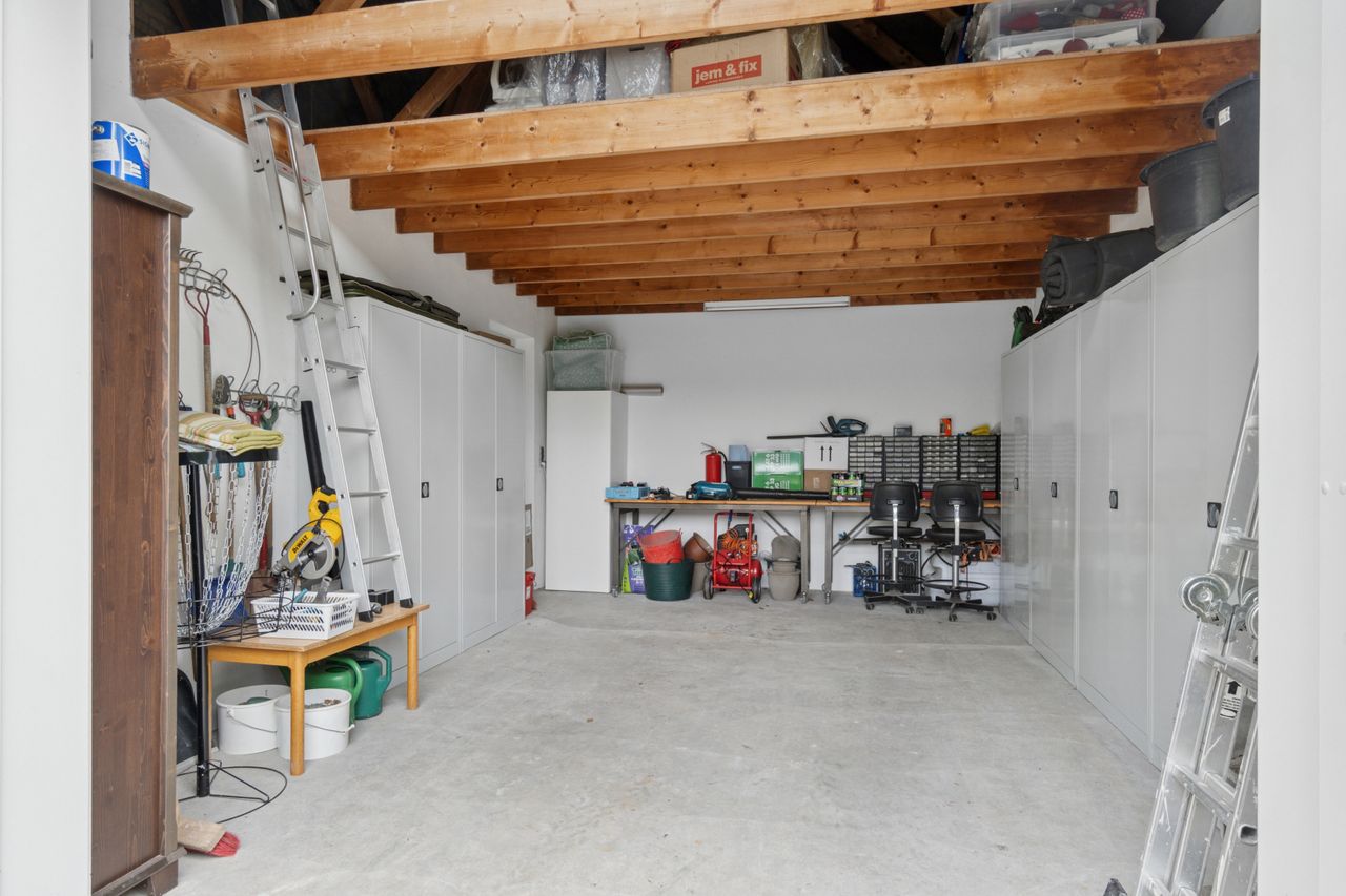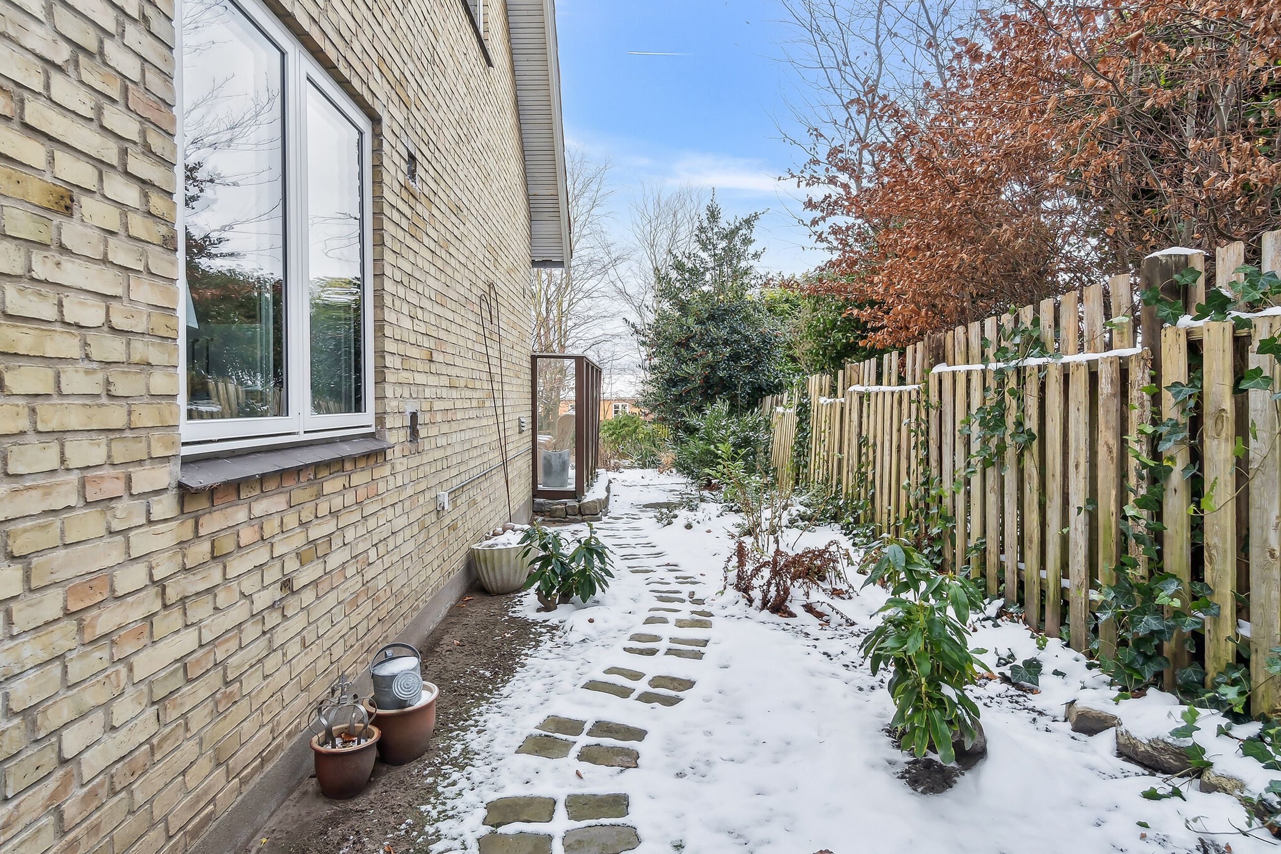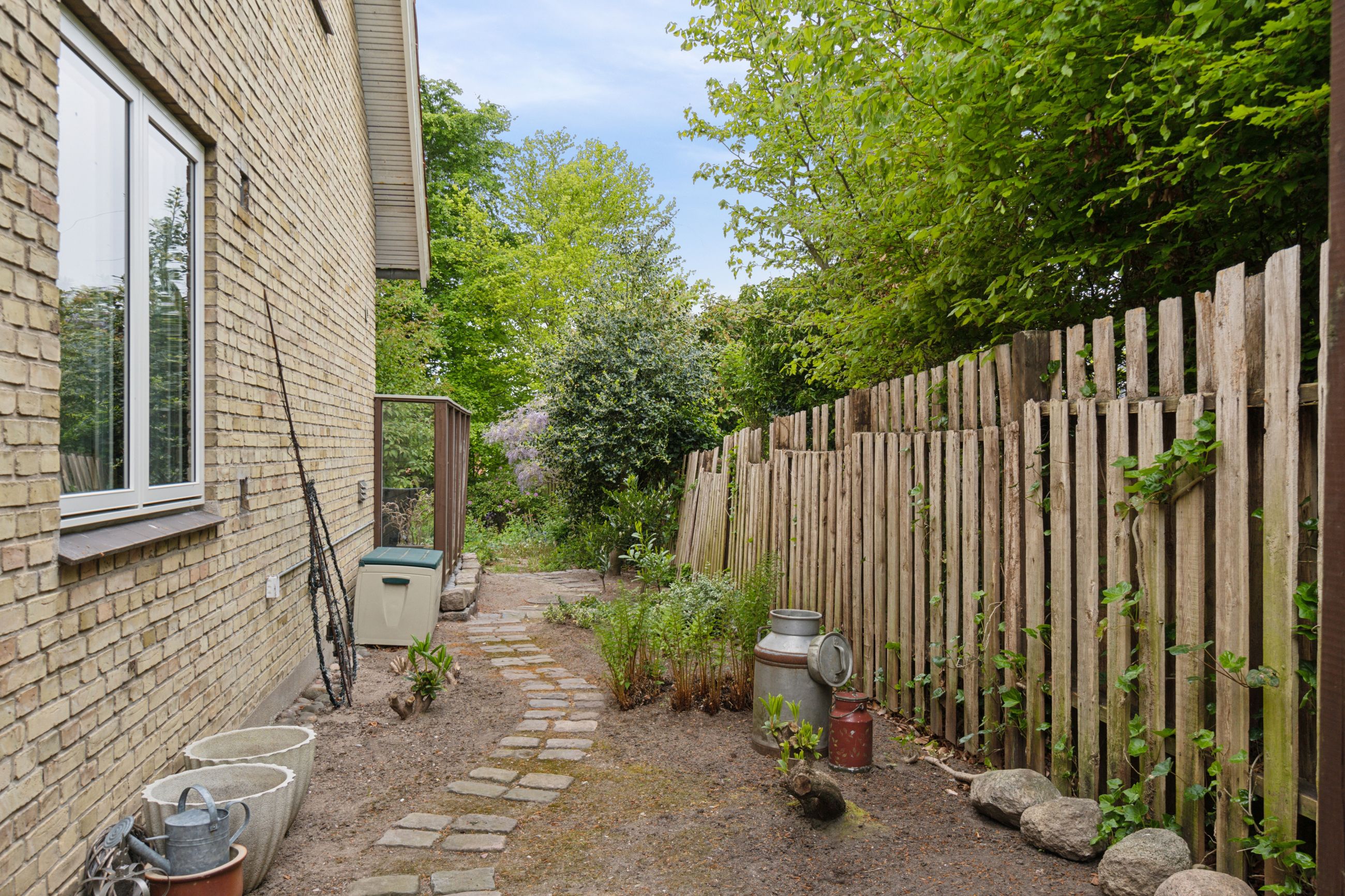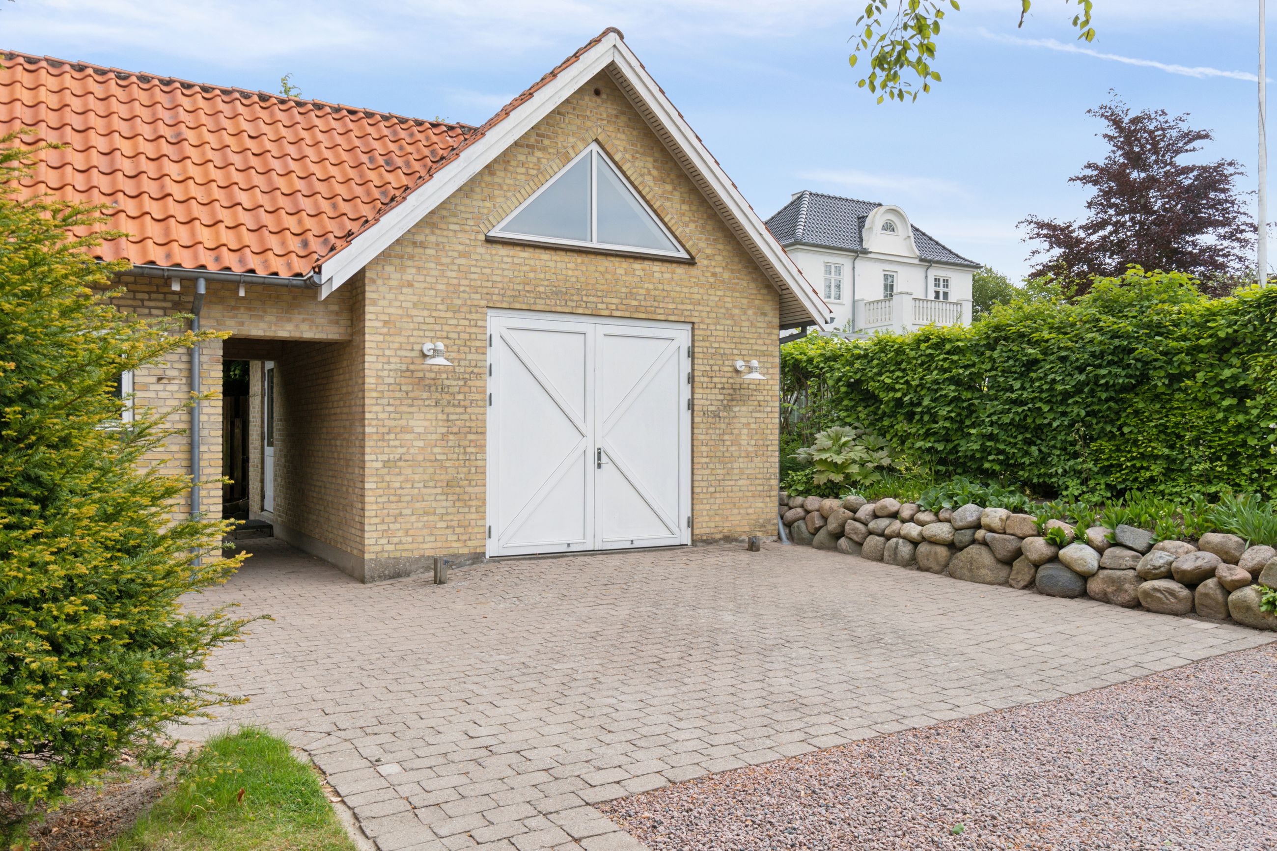 Grunden har en god størrelse på 968 kvm, og takket være arkitektens kloge streger og den flot opvoksede beplantning får I det skønneste uderum. Foran stuen ses en fliseterrasse med aftensol, og for enden af indkørslen har I en muret garage med rigtig god opbevaringsplads.