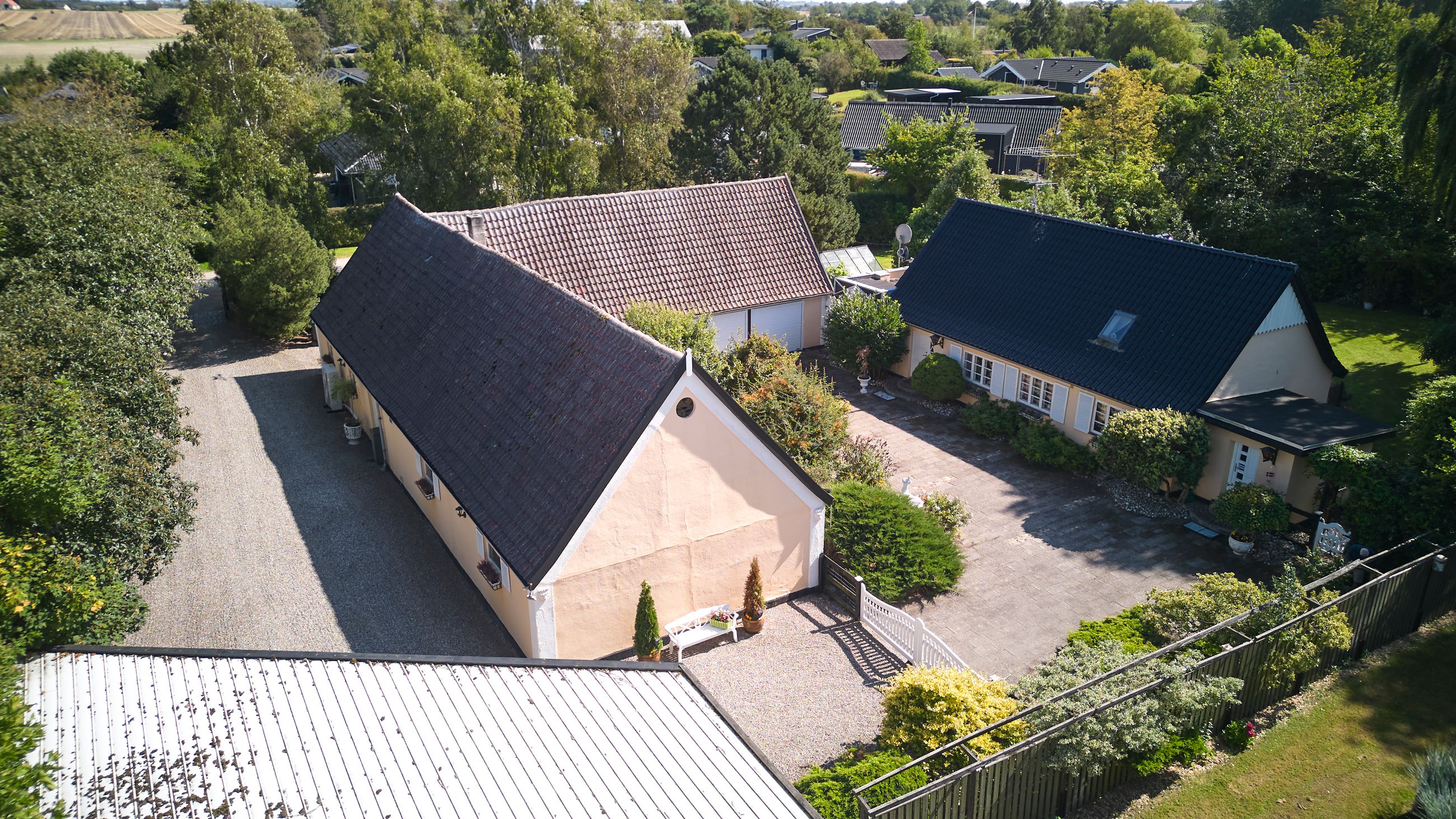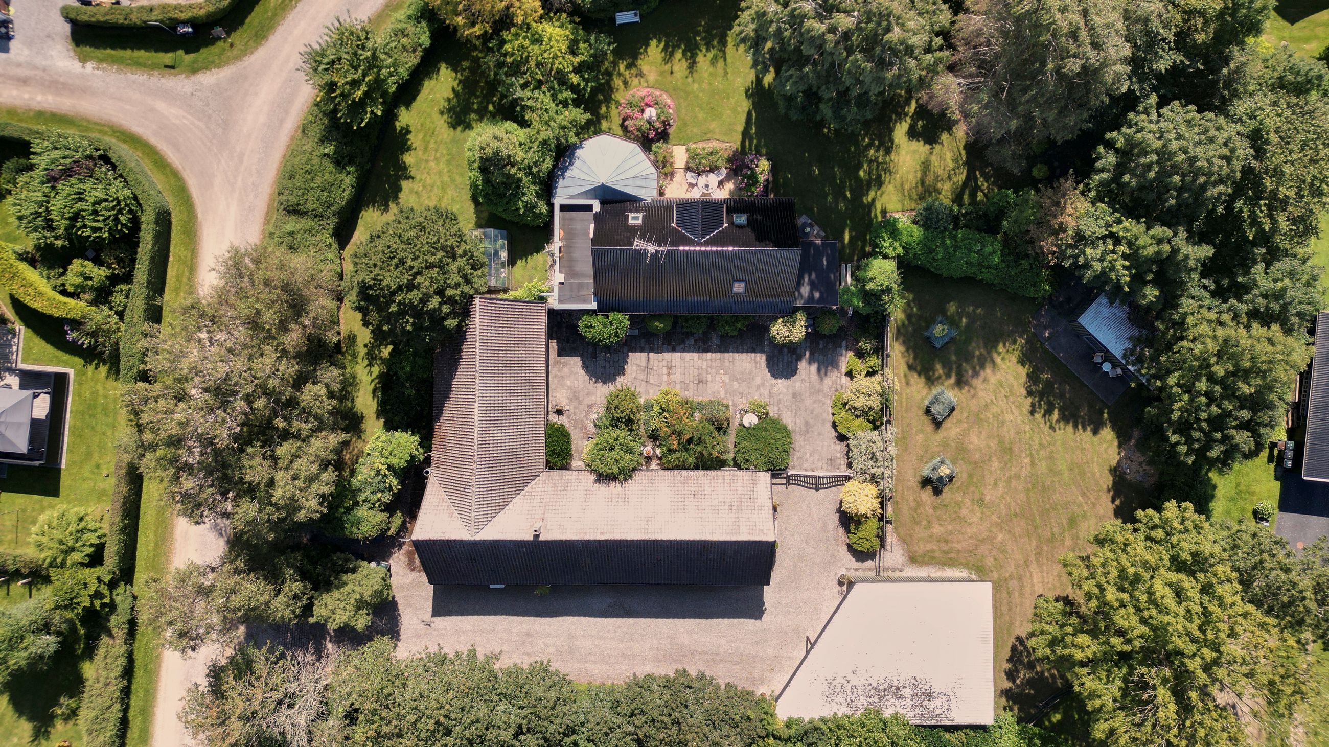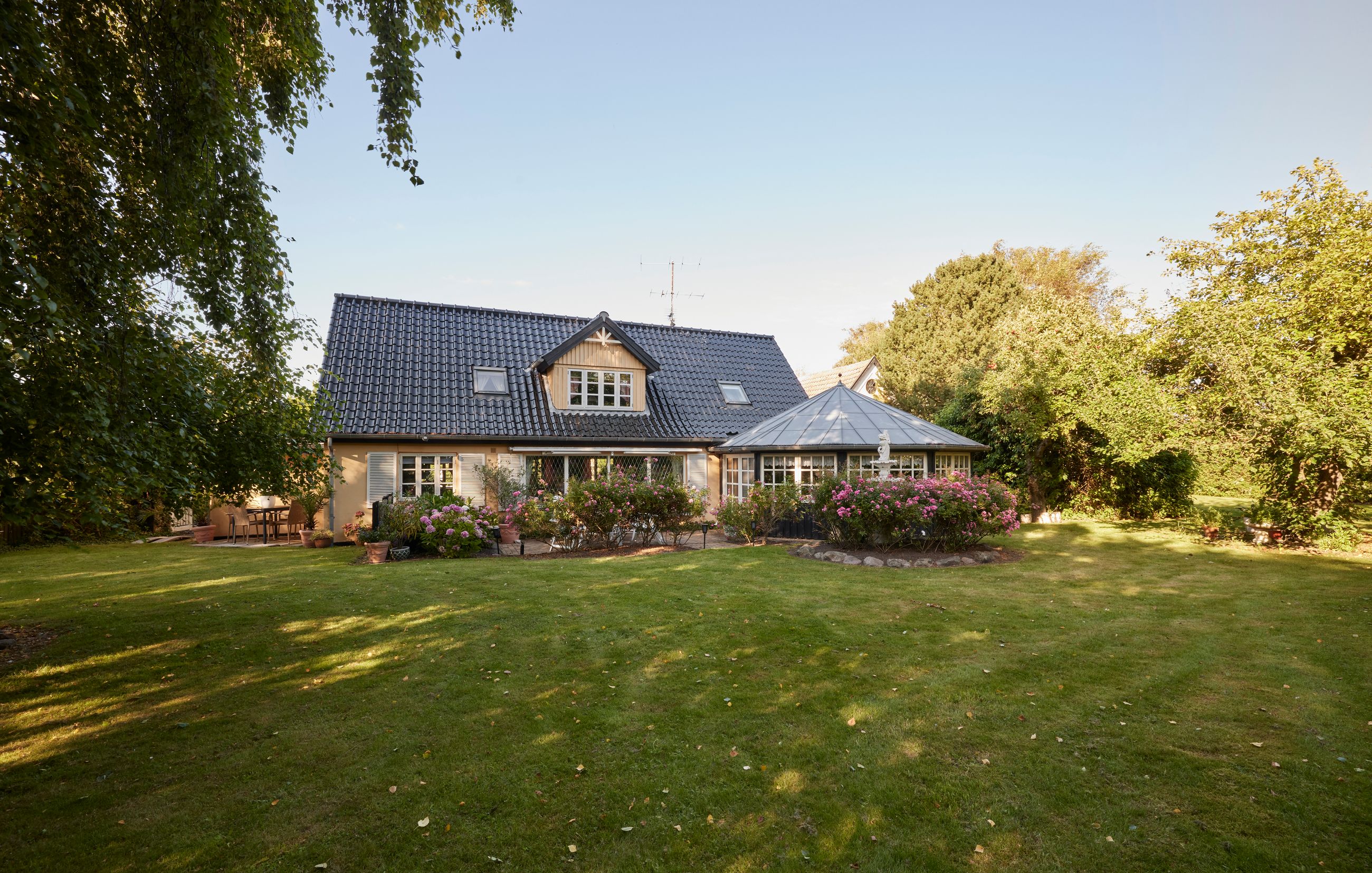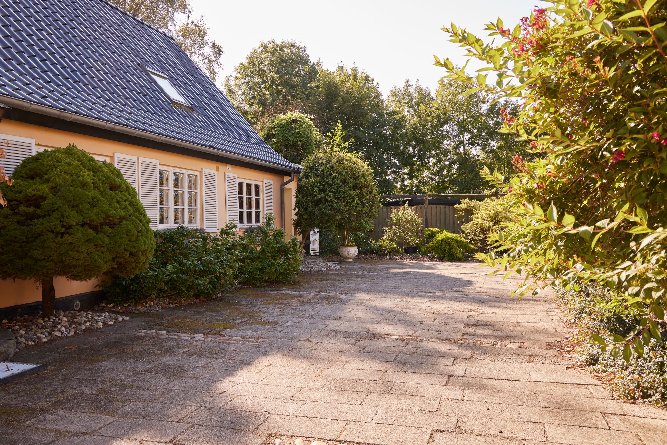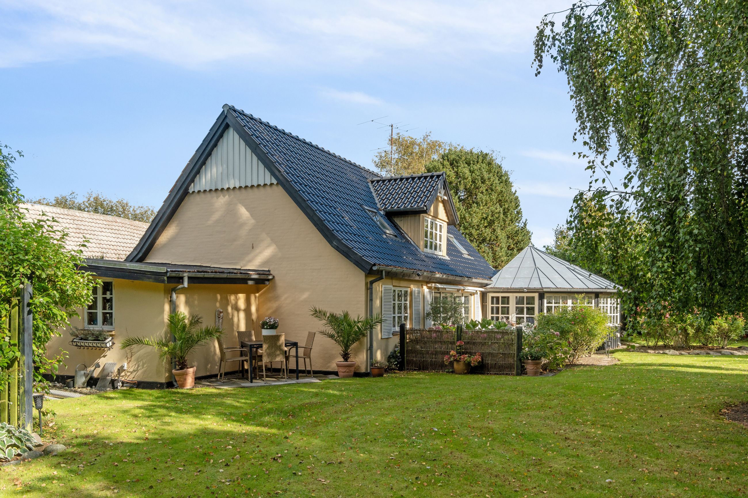 Udearealerne er anlagt med stor gårdsplads, solvendte terrasseområder og en frodig have, der indrammer ejendommen med grønne flader. Den store udestue giver en smidig overgang mellem hus og have, og grunden giver i øvrigt rig plads til haveliv, leg og mange andre projekter.