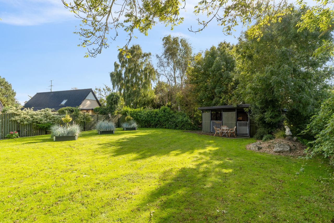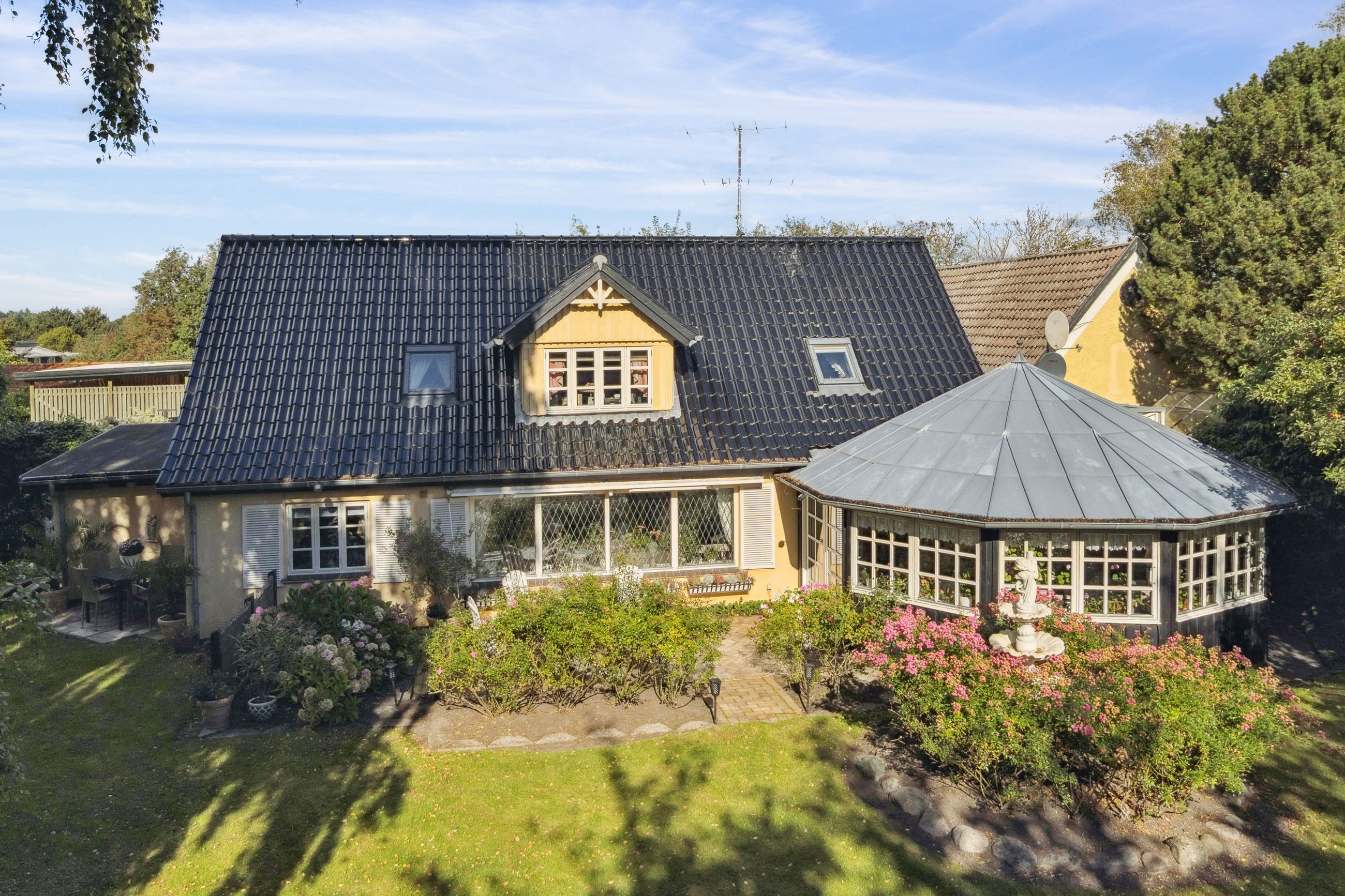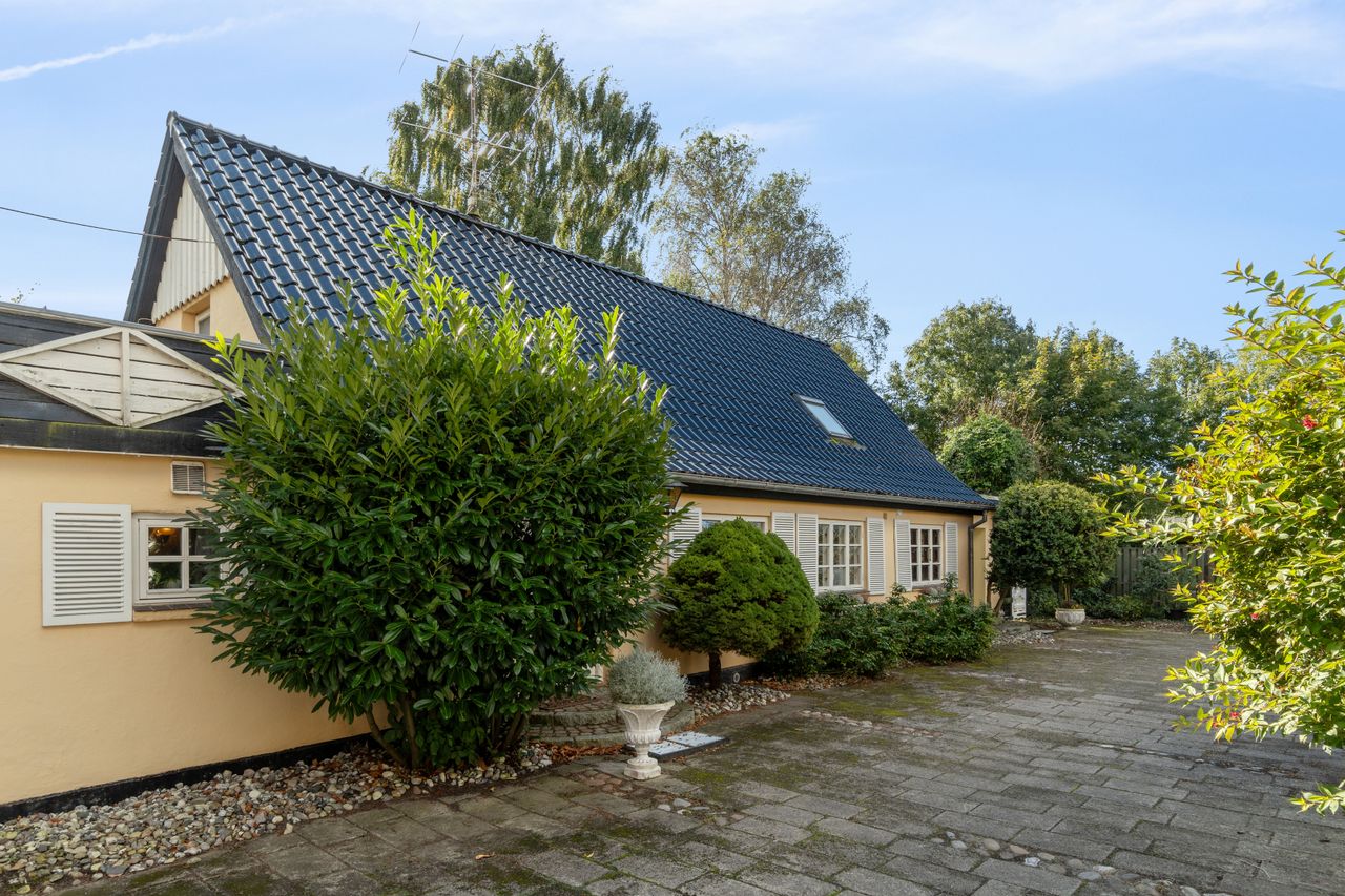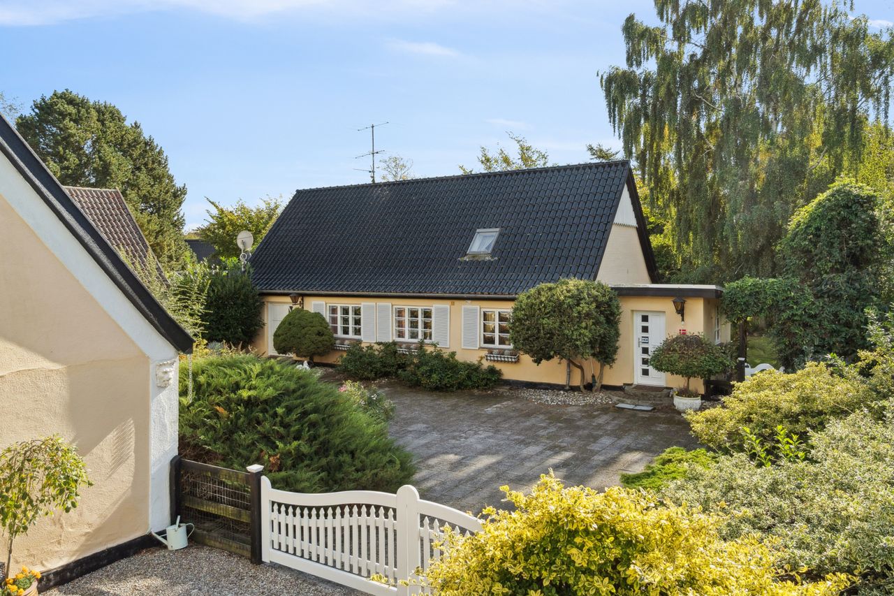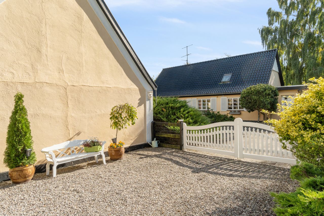 Udearealerne er anlagt med stor gårdsplads, solvendte terrasseområder og en frodig have, der indrammer ejendommen med grønne flader. Den store udestue giver en smidig overgang mellem hus og have, og grunden giver i øvrigt rig plads til haveliv, leg og mange andre projekter.