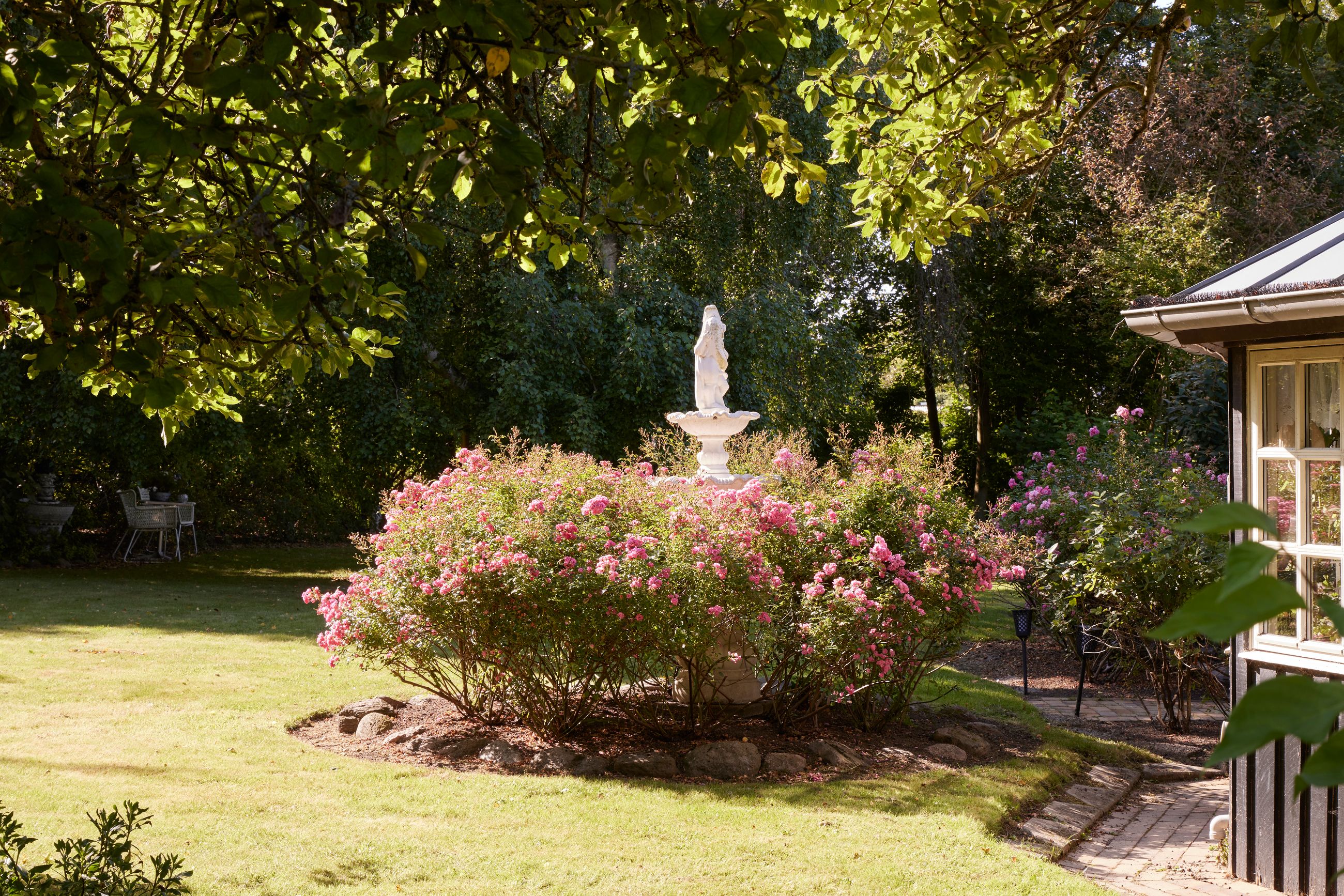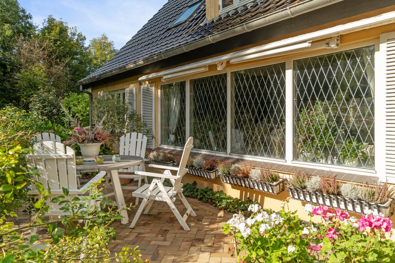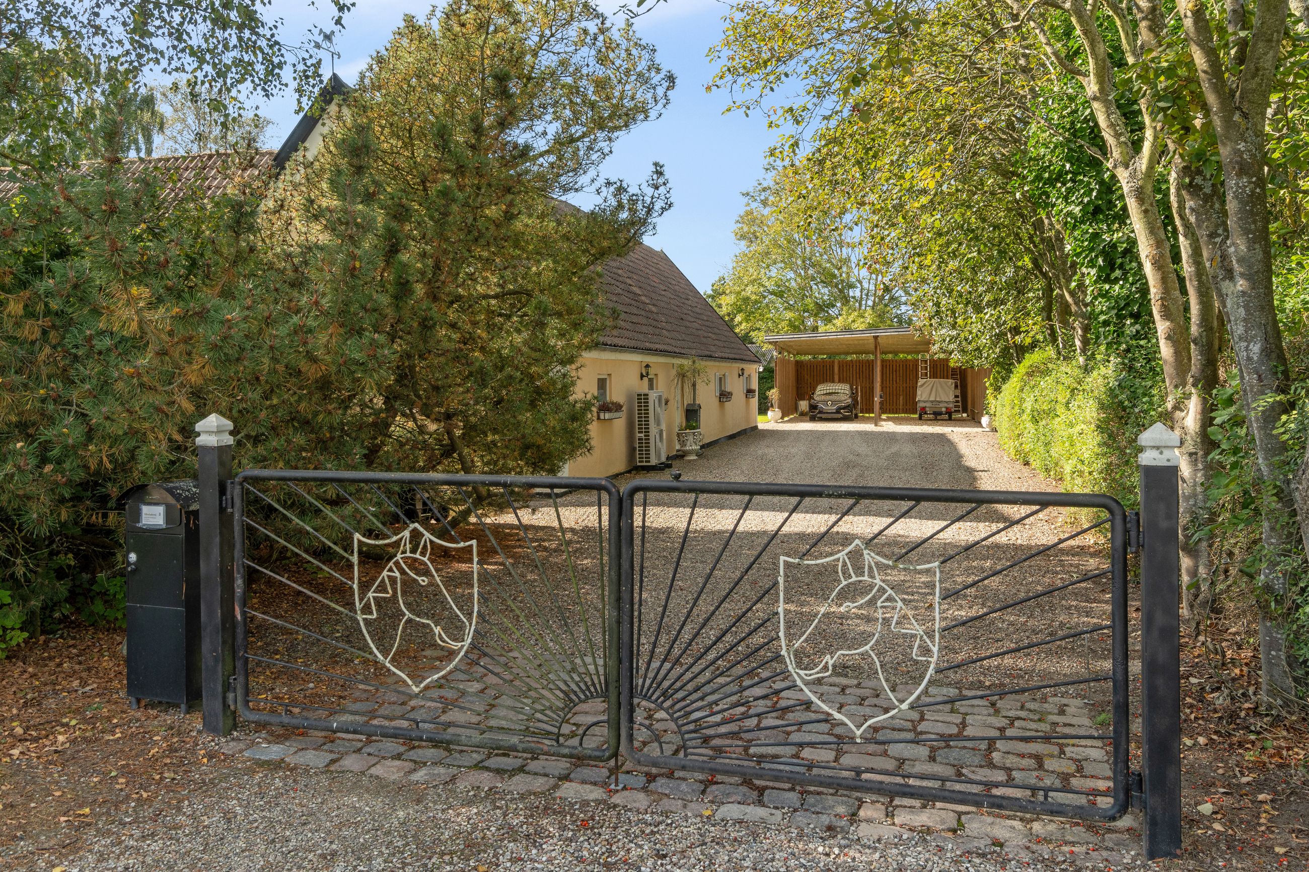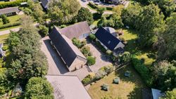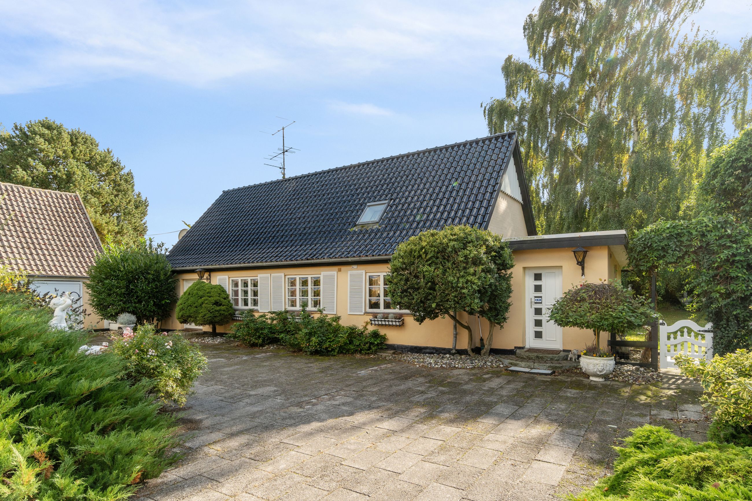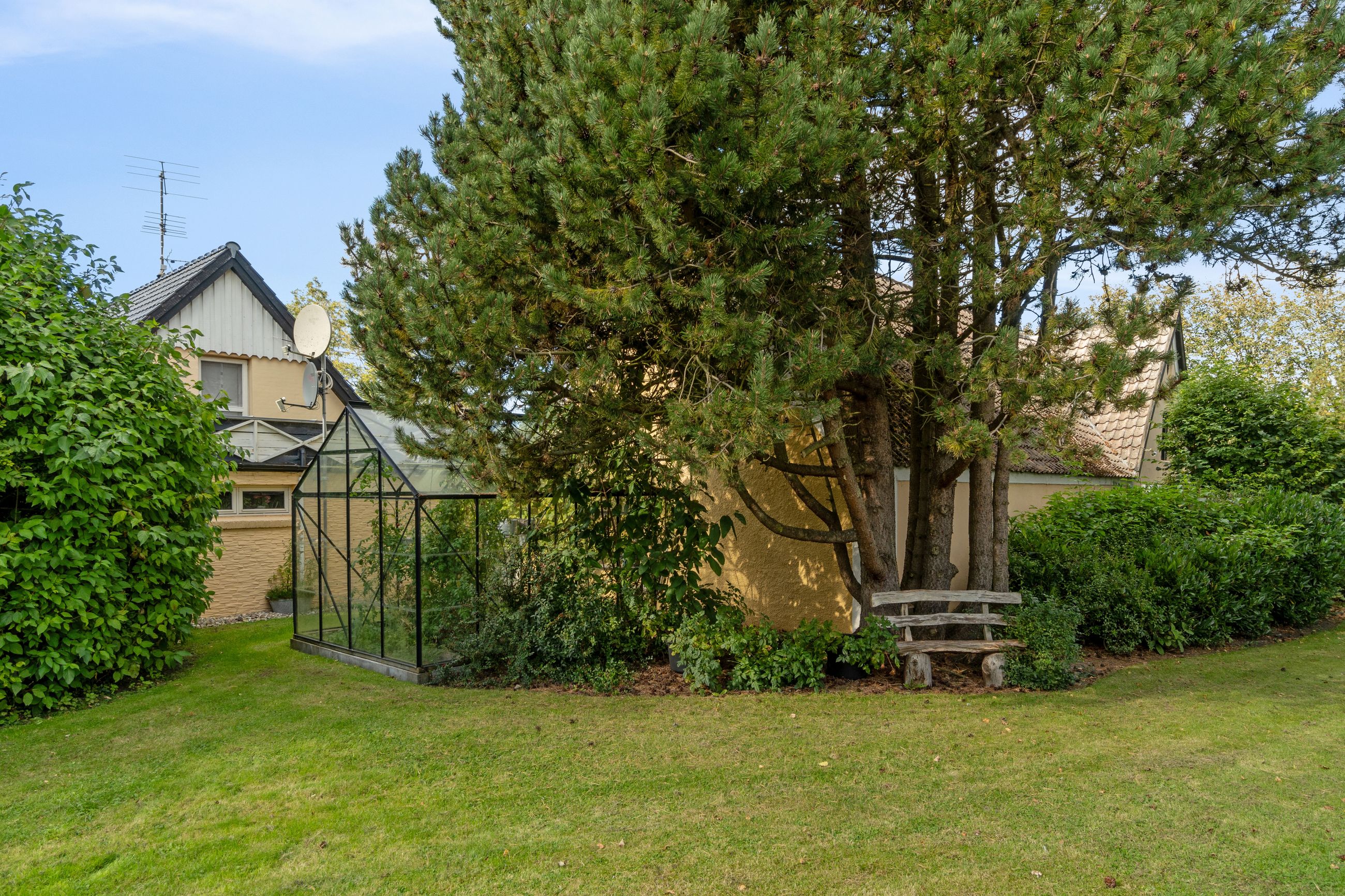 Udearealerne er anlagt med stor gårdsplads, solvendte terrasseområder og en frodig have, der indrammer ejendommen med grønne flader. Den store udestue giver en smidig overgang mellem hus og have, og grunden giver i øvrigt rig plads til haveliv, leg og mange andre projekter.