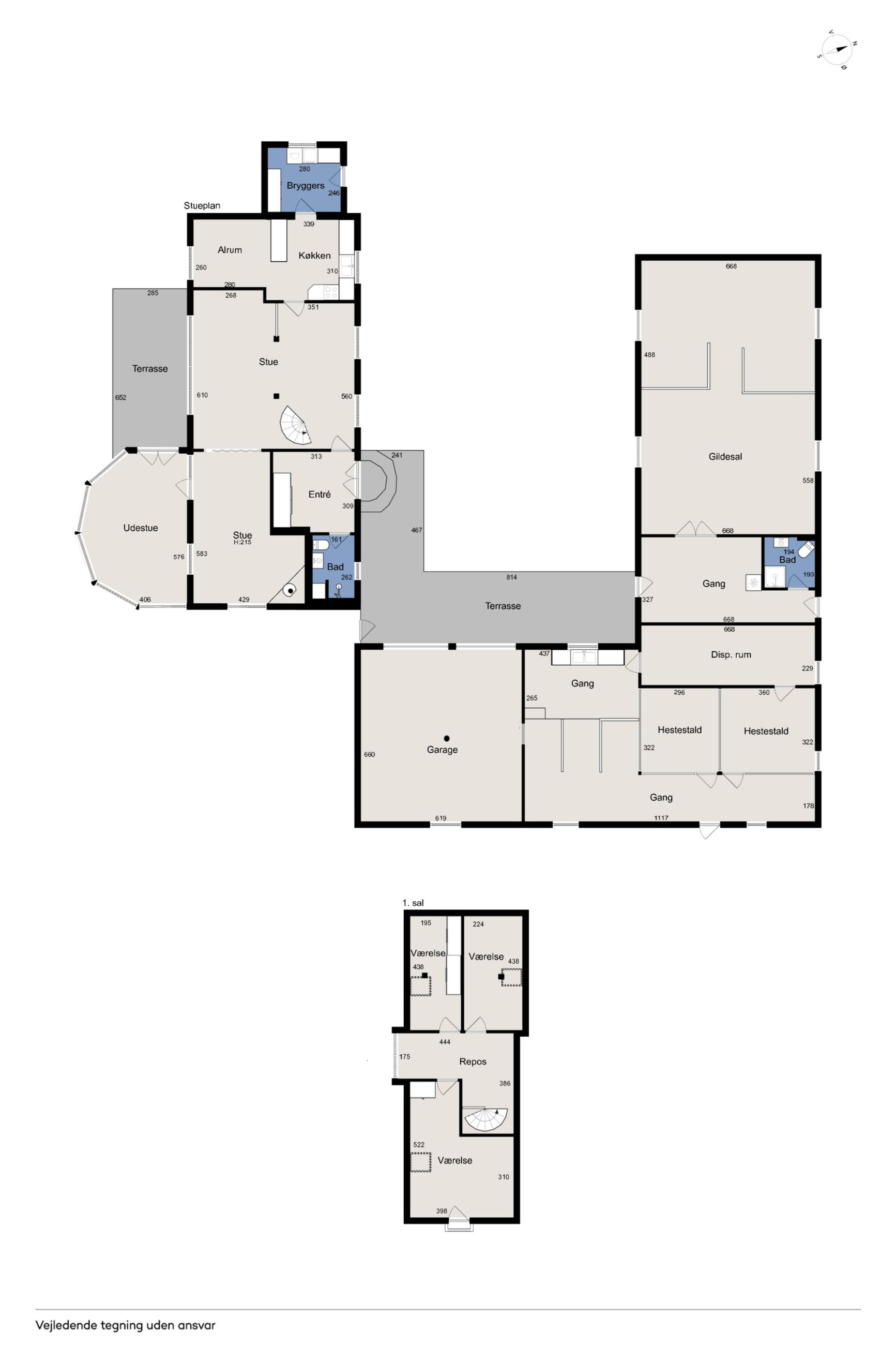 Udlængerne er for nuværende indrettet med blandt andet en stor gildesal med tilhørende badeværelse, en garage og et areal, der kan bringes i brug ved dyrehold. Potentialet for udbygningerne er enormt, og det er kun jeres fantasi, der sætter grænser.