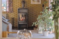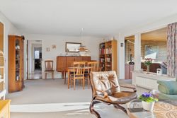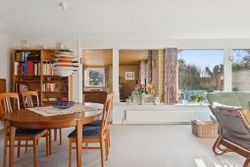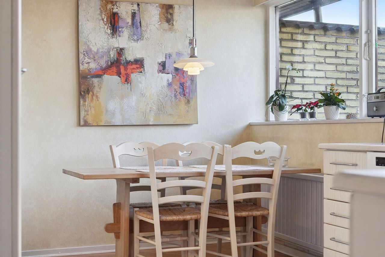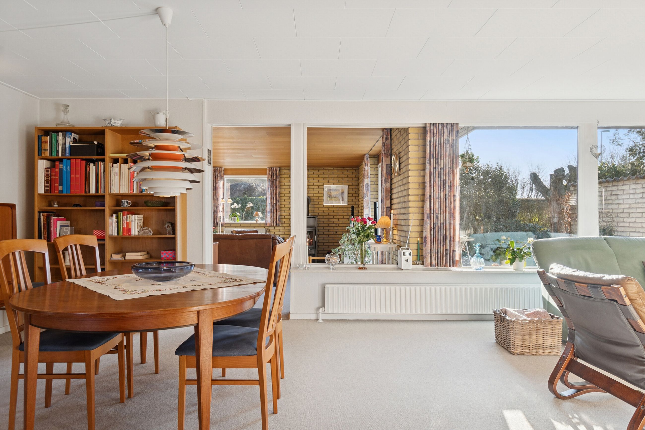 Husets køkken kan indrettes med spisekrog, og køkkenet er funktionelt udført med mange skabe og skuffer. Fra køkkenet er der direkte adgang til den ene af de to stuer, som ligger i åben forbindelse. Begge stuer er rummelige og har store vinduespartier, og i den ene stue er der både brændeovn og blottede murstensvægge samt skydedør ud til haven.