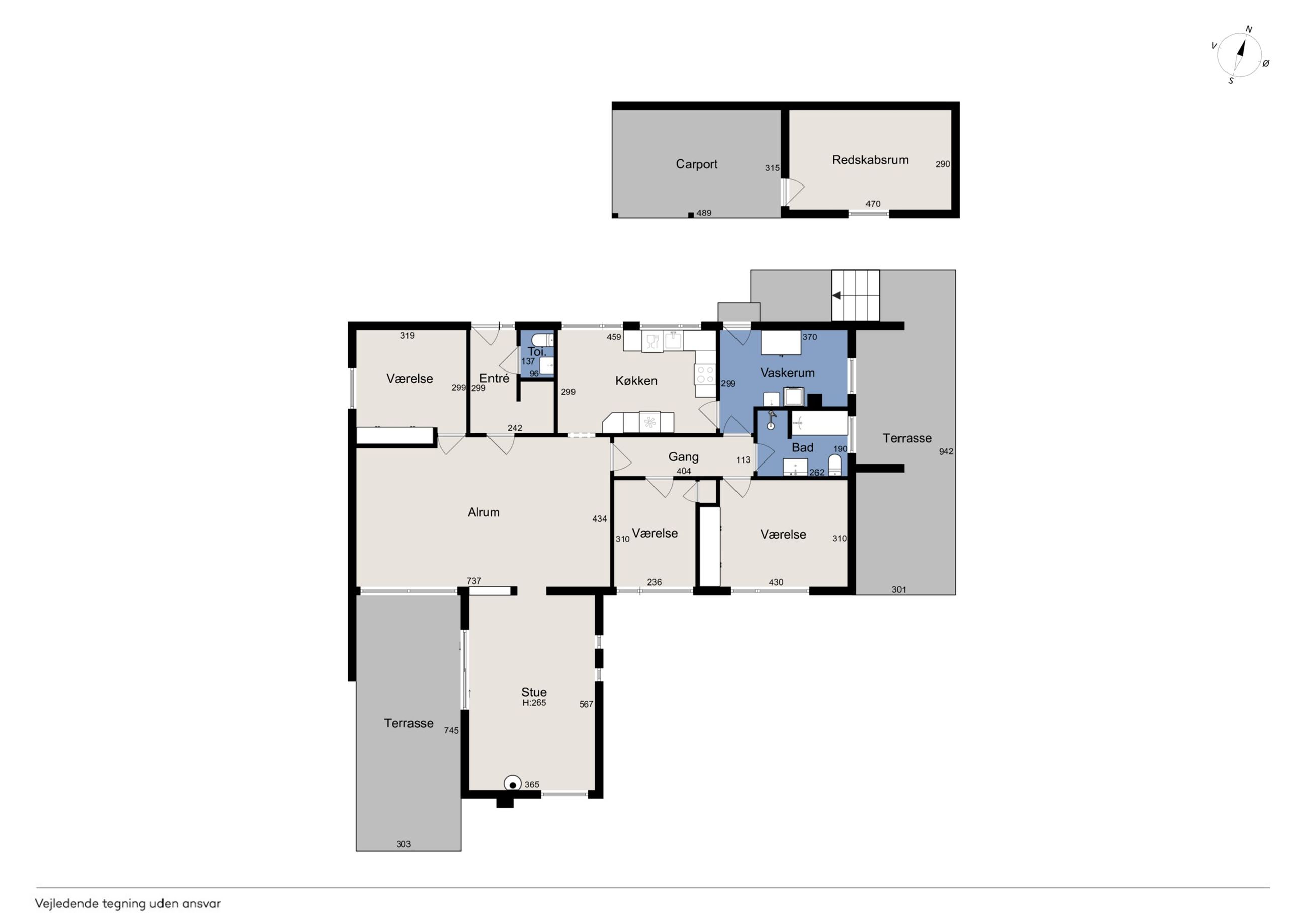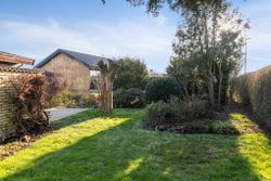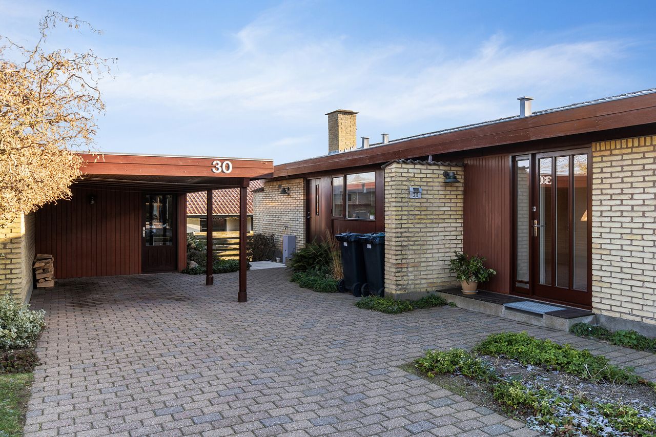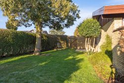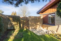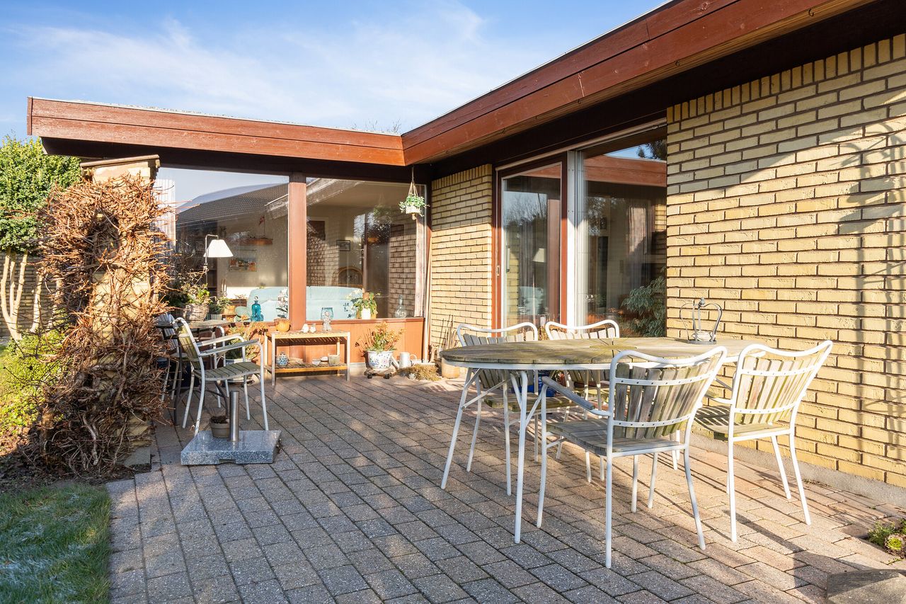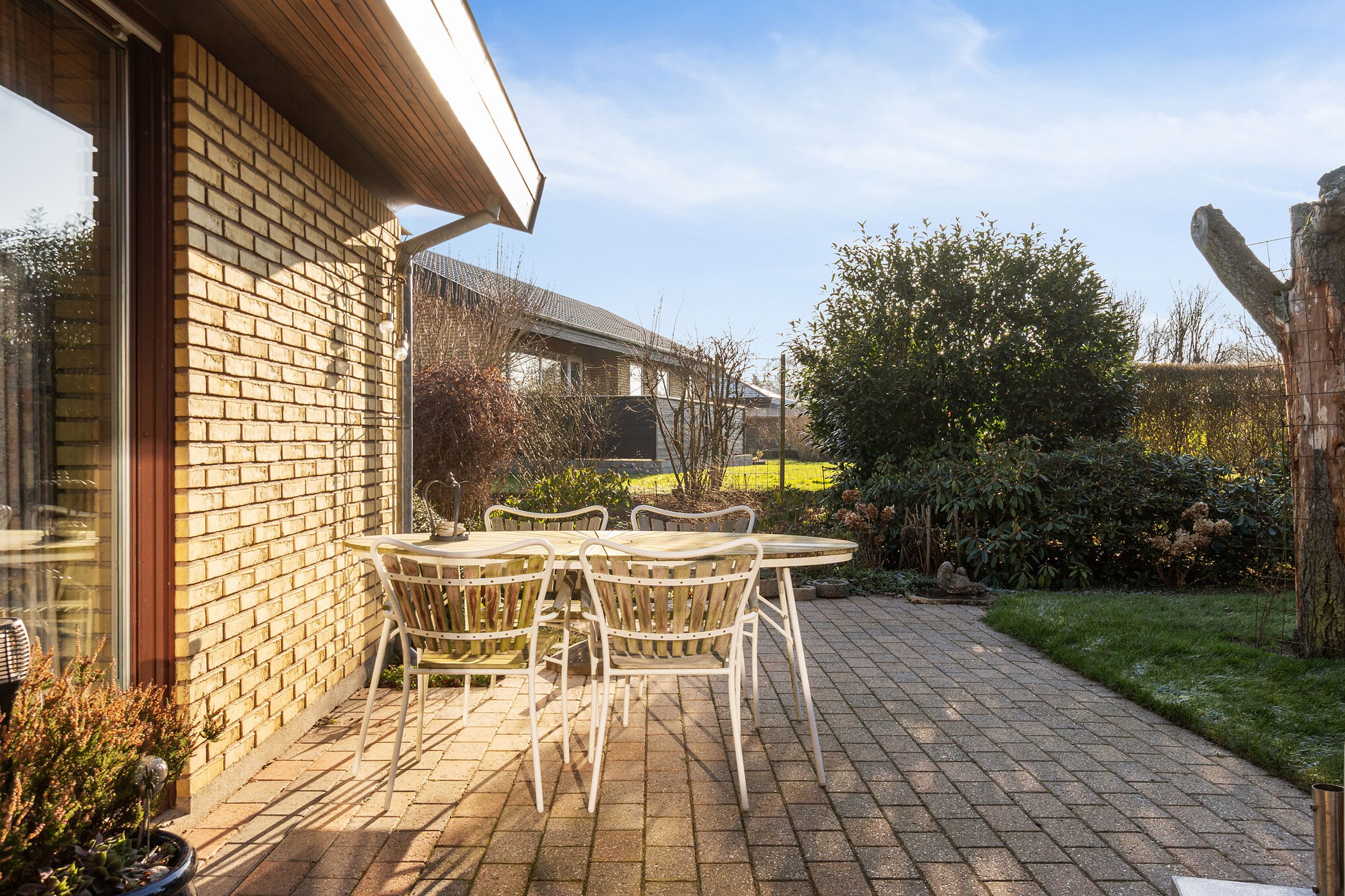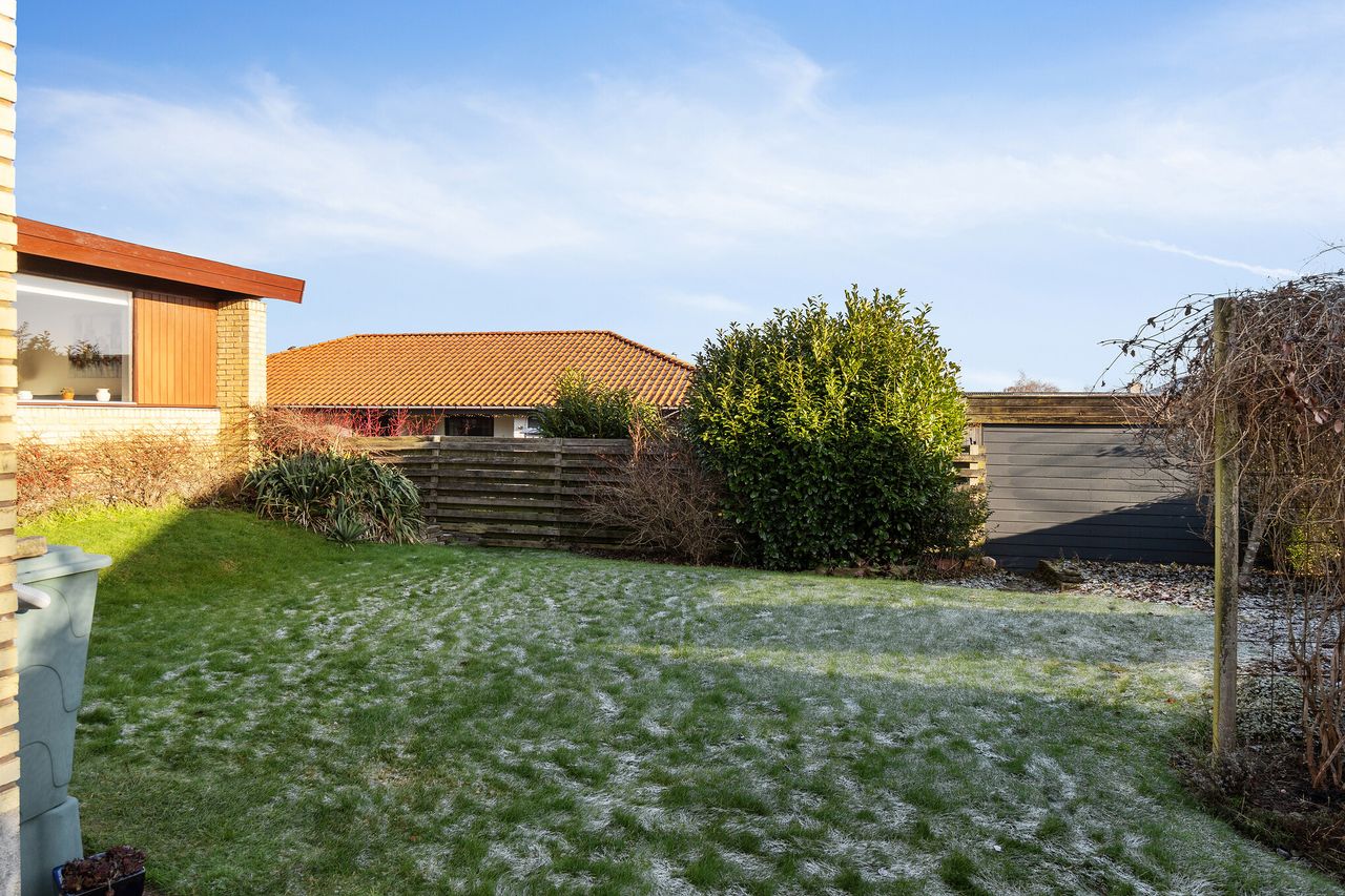 Grunden fremtræder lige så velplejet som villaen, og den er anlagt med en hyggelig have. Denne har frodig beplantning og to dejlige fliseterrasser, som vender mod sydøst og sydvest. Med til ejendommen følger endvidere en carport med indbygget redskabsrum.