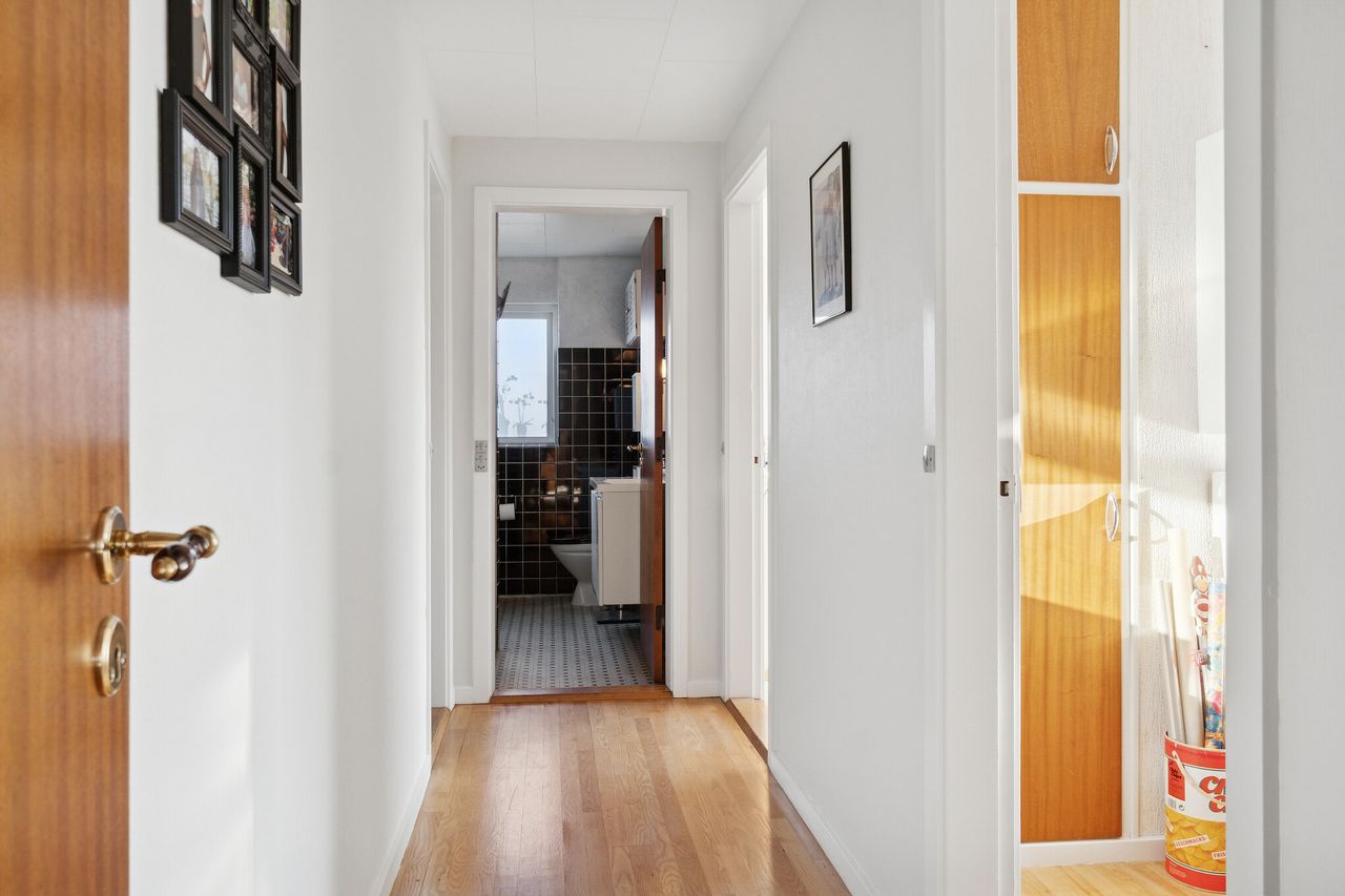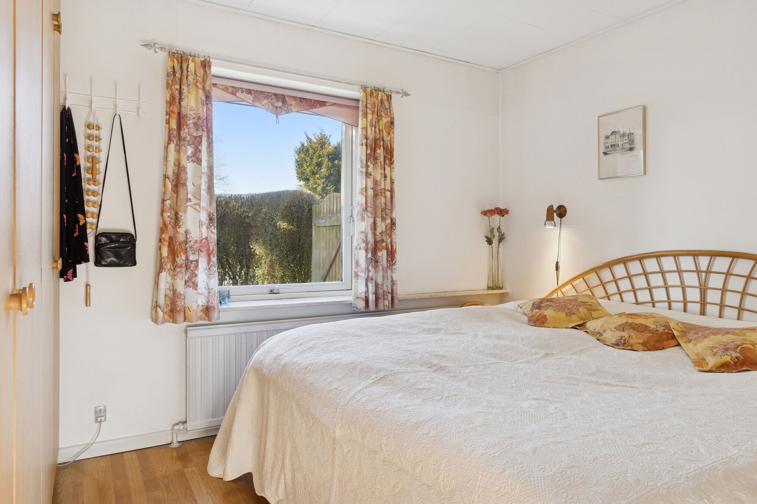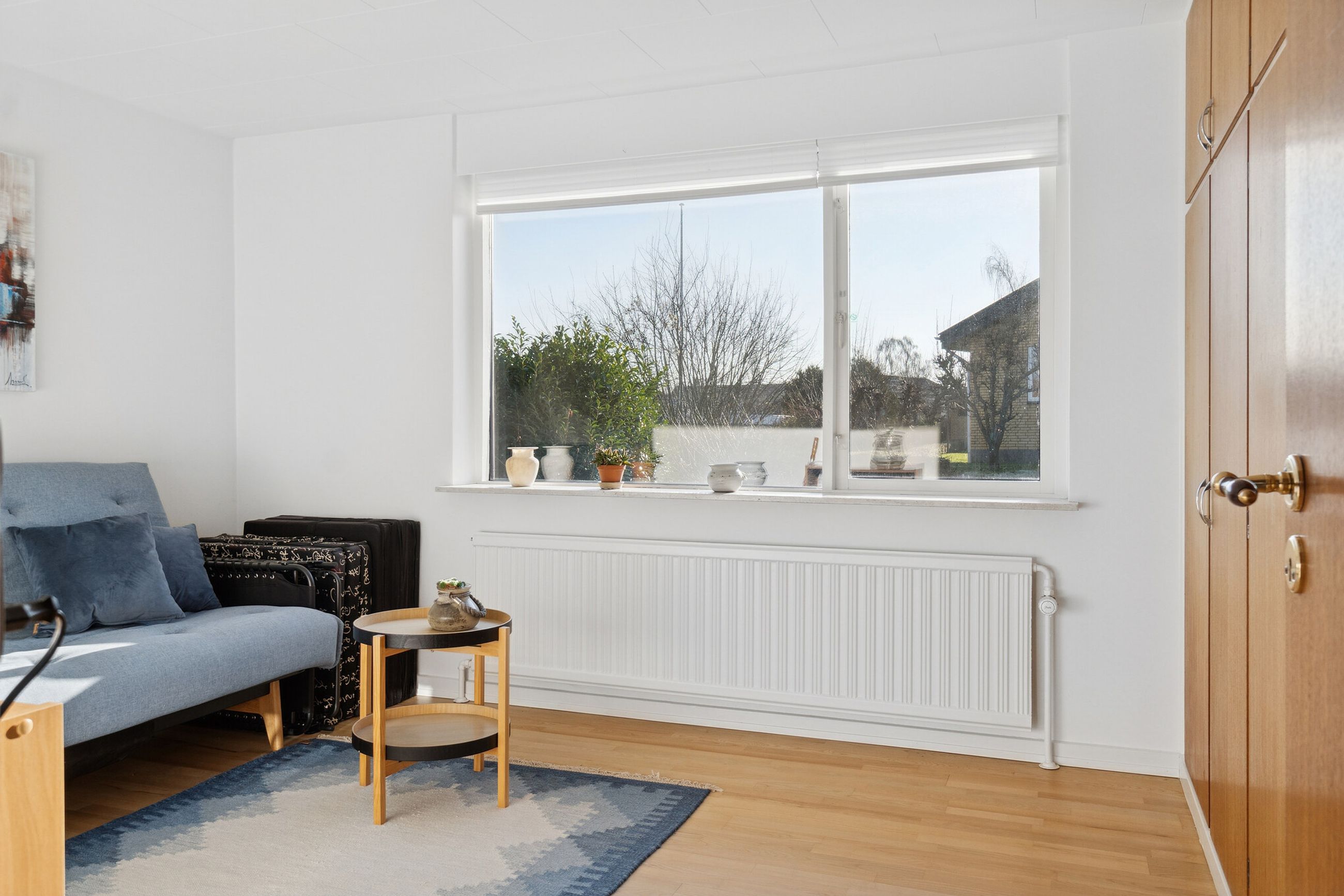 Alle tre værelser er regulære, og i to af dem er der indbyggede skabe. Det separate værelse er oplagt for de voksne, mens de to andre værelser udgør en potentiel børnesektion. Denne del af boligen indeholder tillige et flisebadeværelse og et bryggers, og badeværelset har badekar og muret bruseniche. Planløsningen afrundes af et gæstetoilet og en entré med garderobeafsnit.