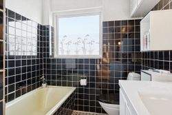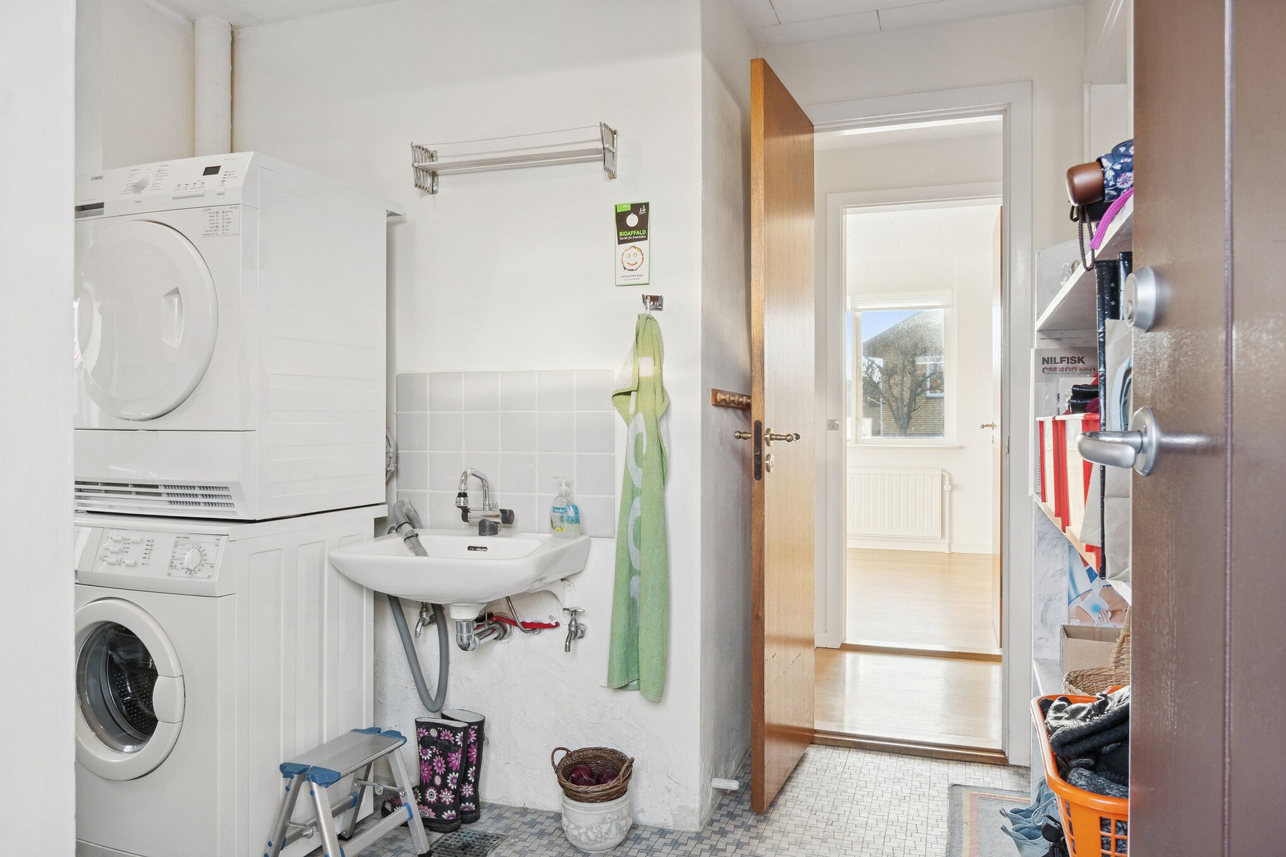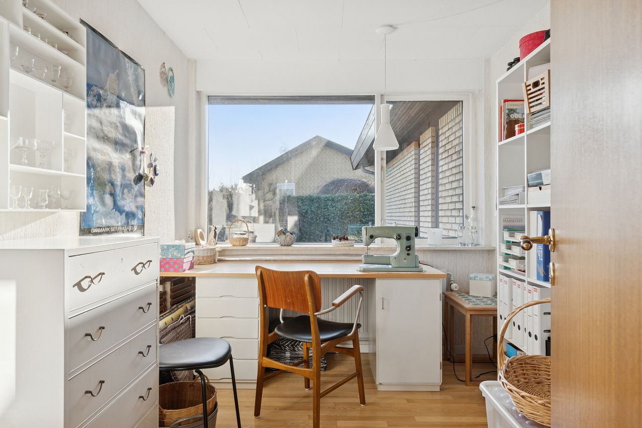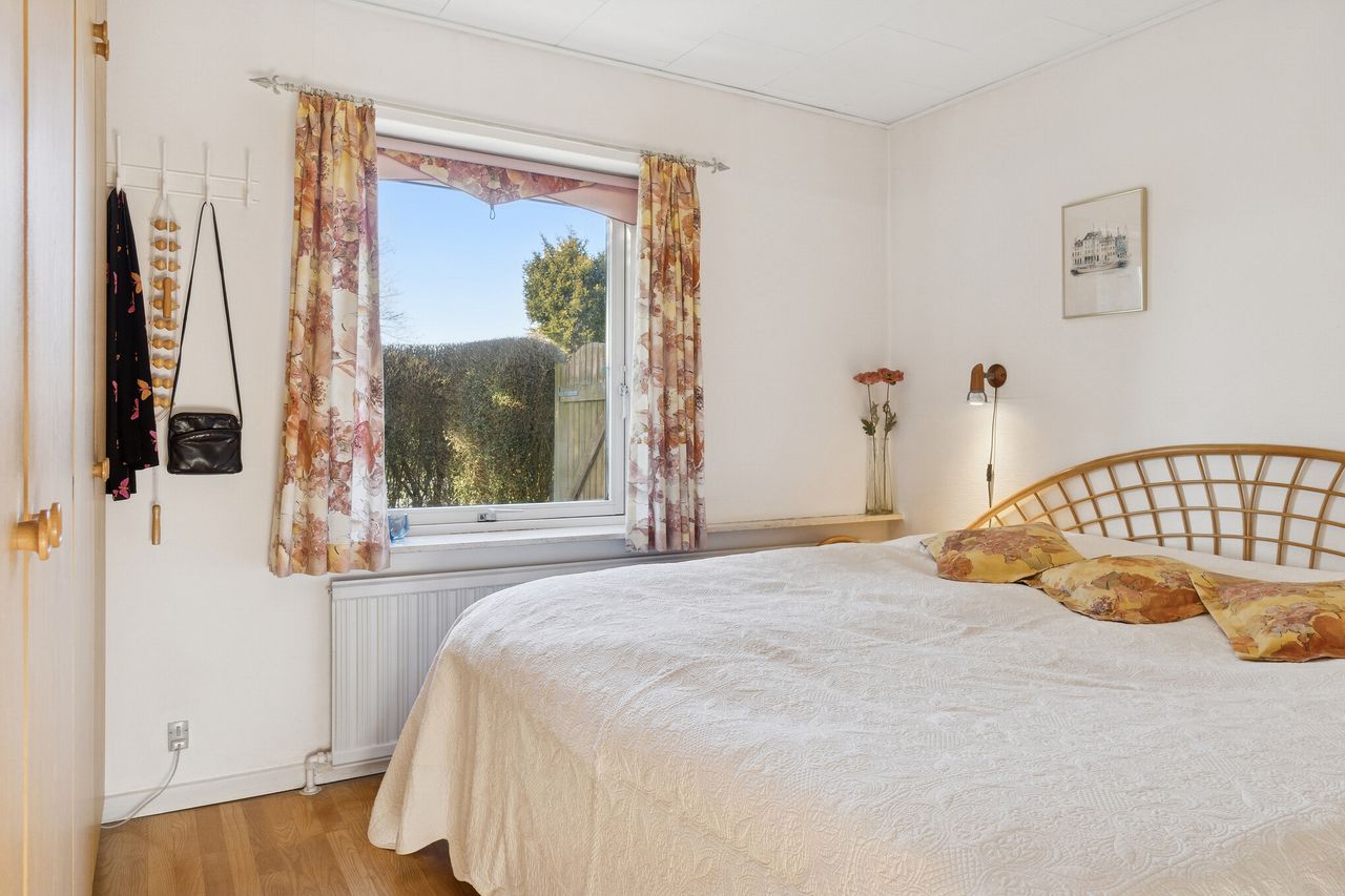 Alle tre værelser er regulære, og i to af dem er der indbyggede skabe. Det separate værelse er oplagt for de voksne, mens de to andre værelser udgør en potentiel børnesektion. Denne del af boligen indeholder tillige et flisebadeværelse og et bryggers, og badeværelset har badekar og muret bruseniche. Planløsningen afrundes af et gæstetoilet og en entré med garderobeafsnit.