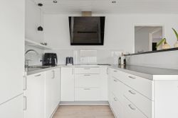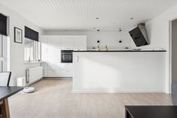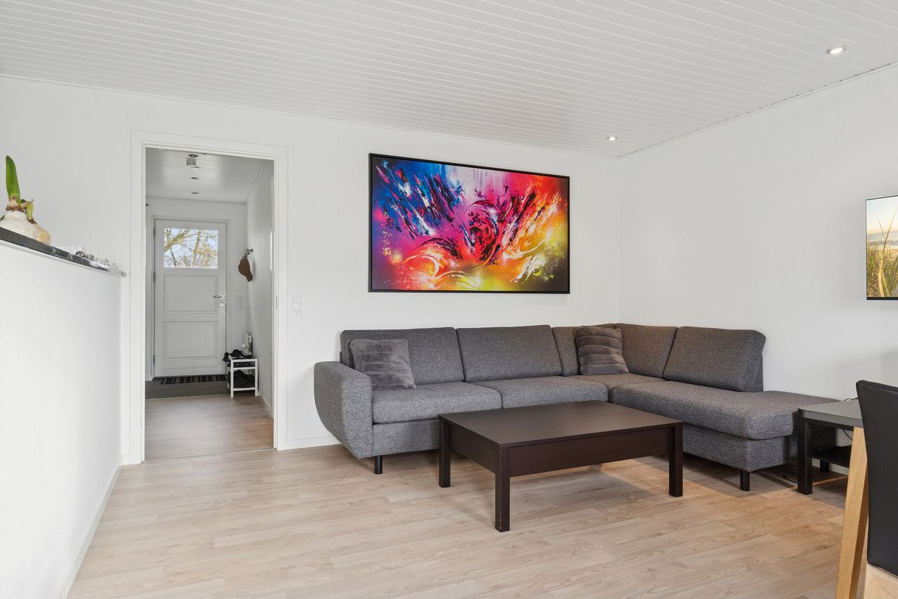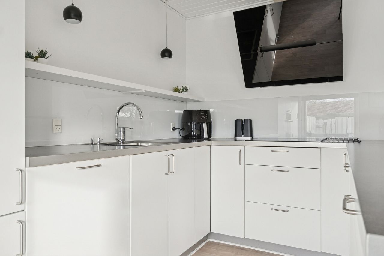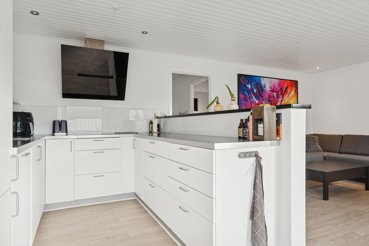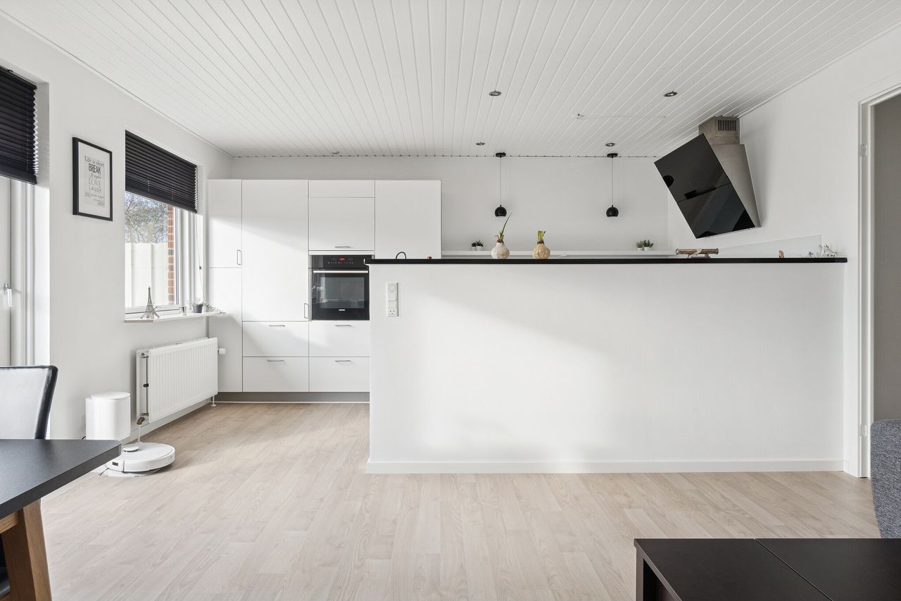 Udtrykket er stilrent med røde mursten og hvide vinduesrammer. Inden døre er der masser af dagslys, og det får I særligt øje på i det åbne opholdsmiljø, hvor vinduespartierne og terrassedøren vender mod sydvest. Køkkenet er stilrent i hvid, og dele af arbejdsfladerne vender ud mod opholdsmiljøet, hvilket giver en dejlig sammenhæng i rummet. Forbindelsen til terrassen sørger for harmoni mellem ude og inde.