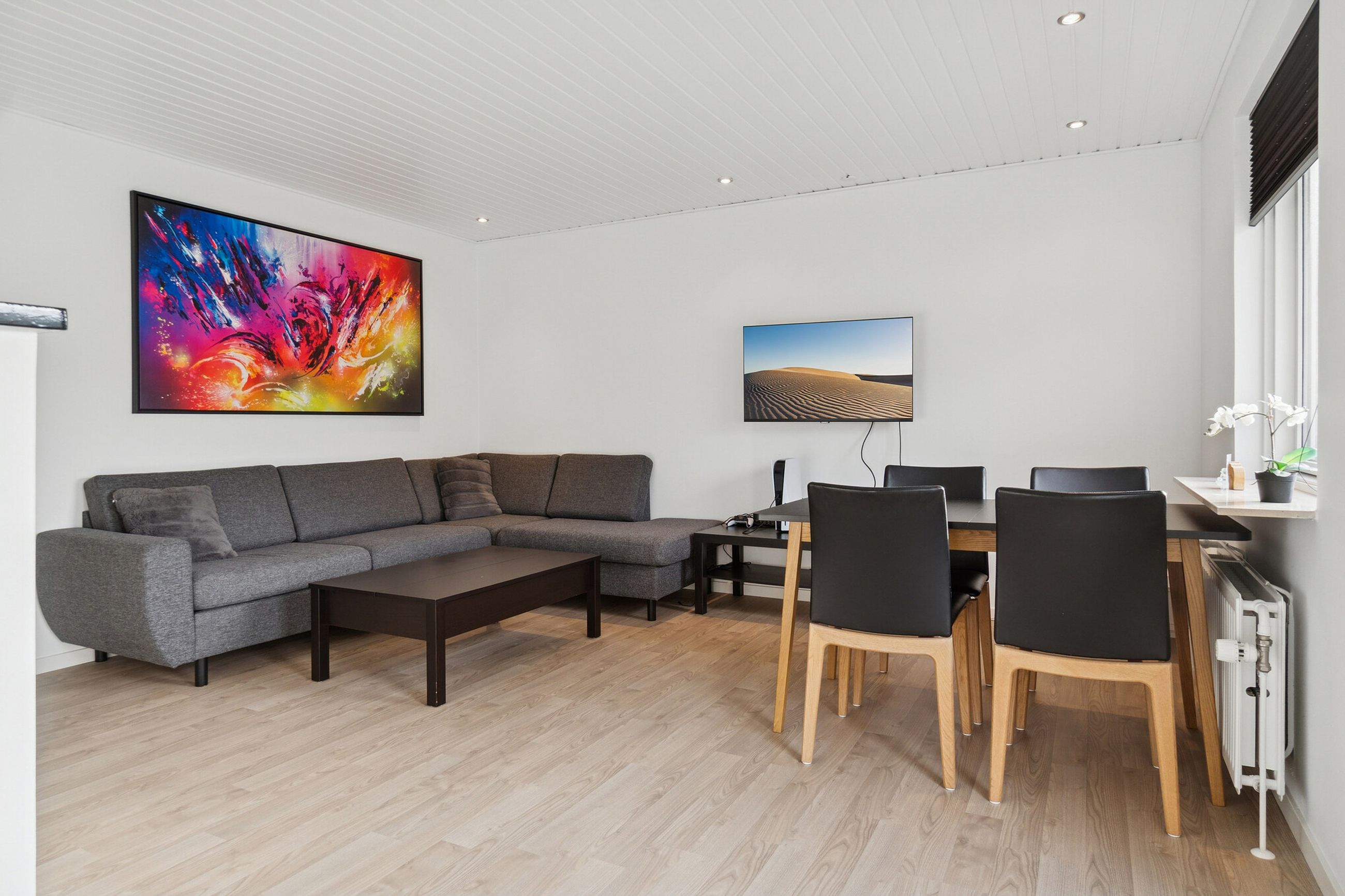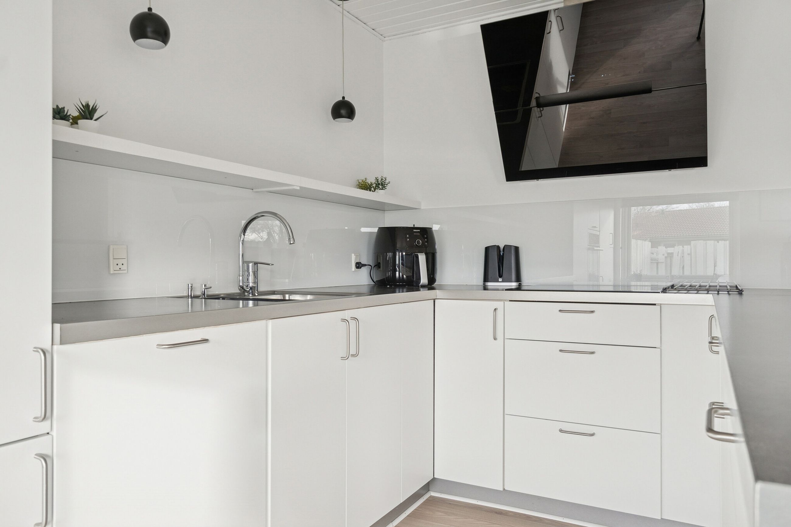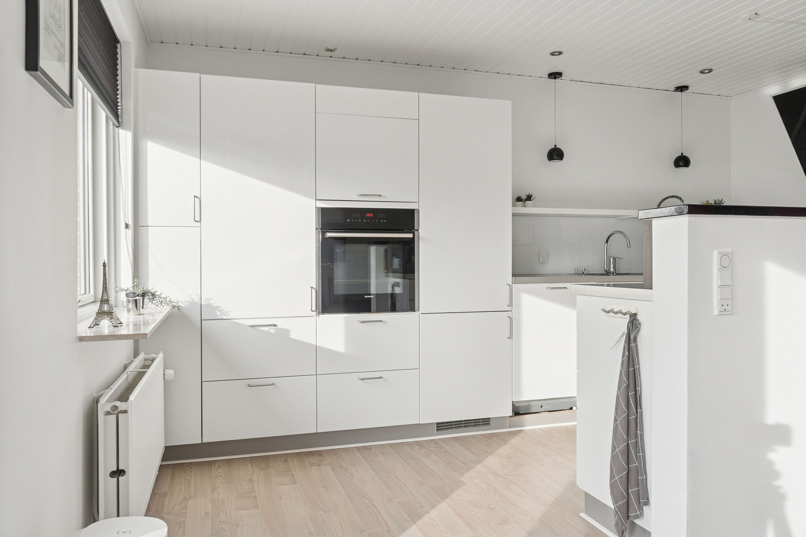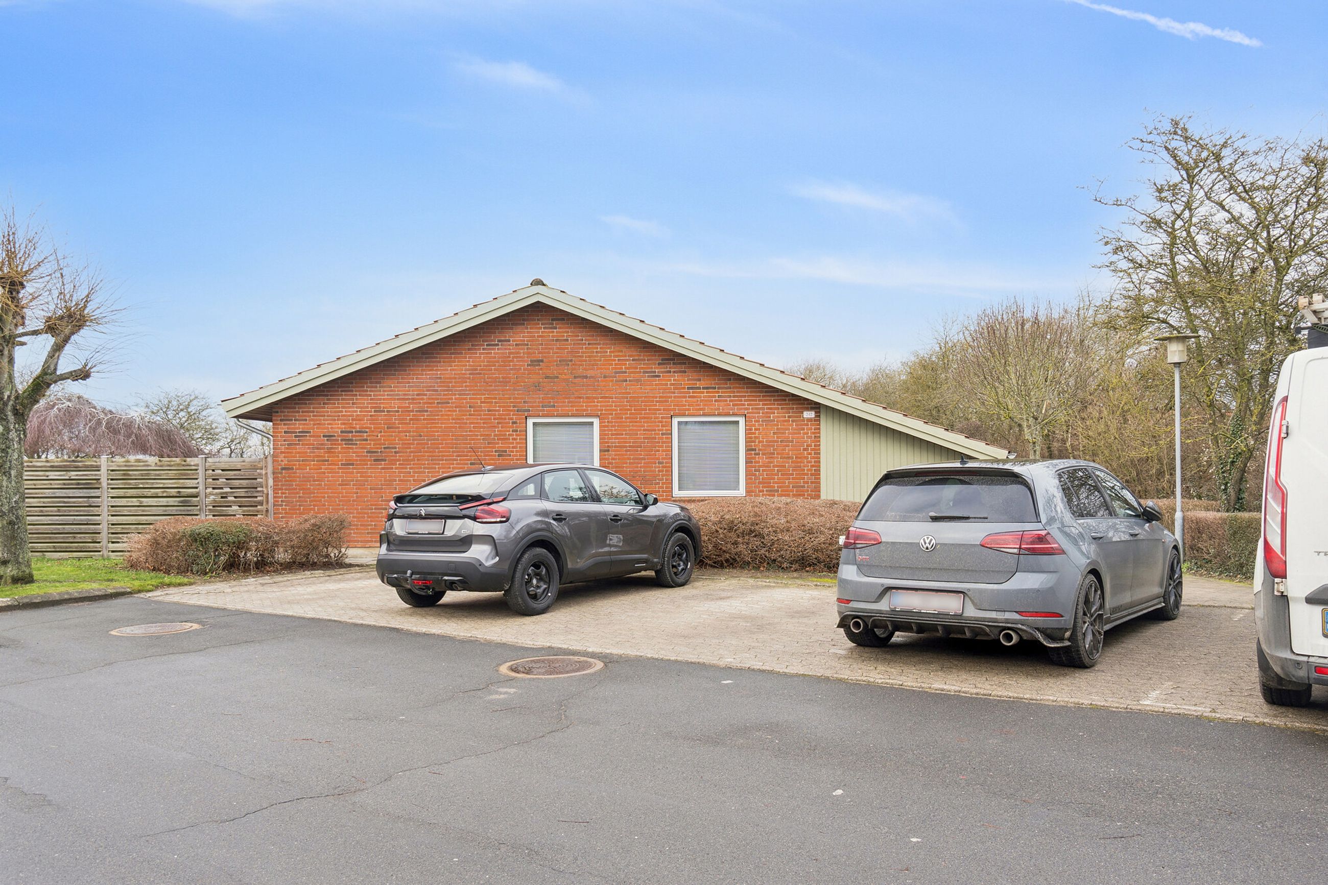 Udtrykket er stilrent med røde mursten og hvide vinduesrammer. Inden døre er der masser af dagslys, og det får I særligt øje på i det åbne opholdsmiljø, hvor vinduespartierne og terrassedøren vender mod sydvest. Køkkenet er stilrent i hvid, og dele af arbejdsfladerne vender ud mod opholdsmiljøet, hvilket giver en dejlig sammenhæng i rummet. Forbindelsen til terrassen sørger for harmoni mellem ude og inde.