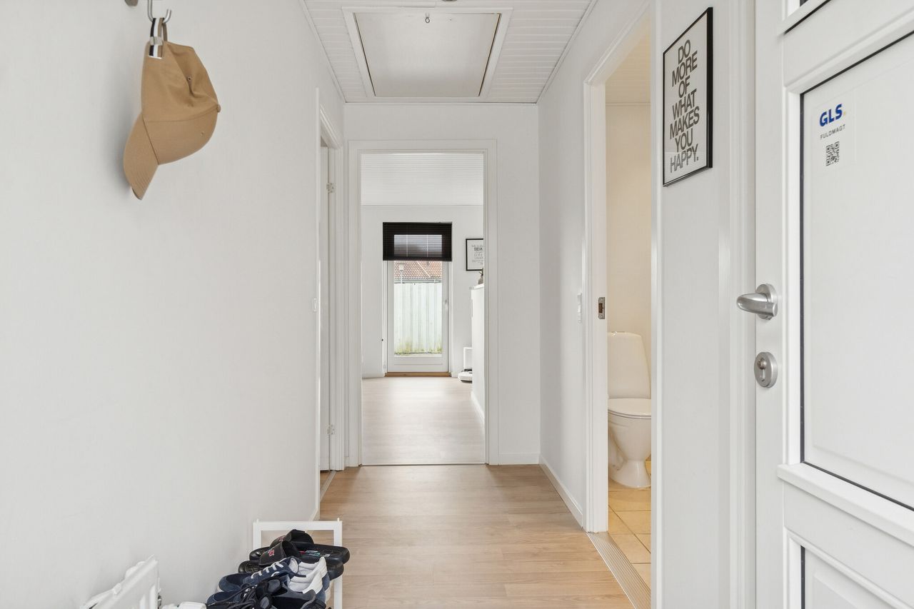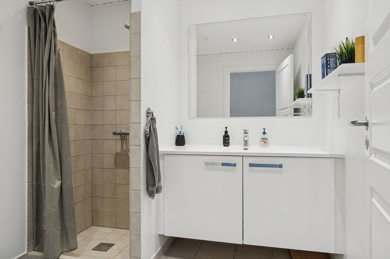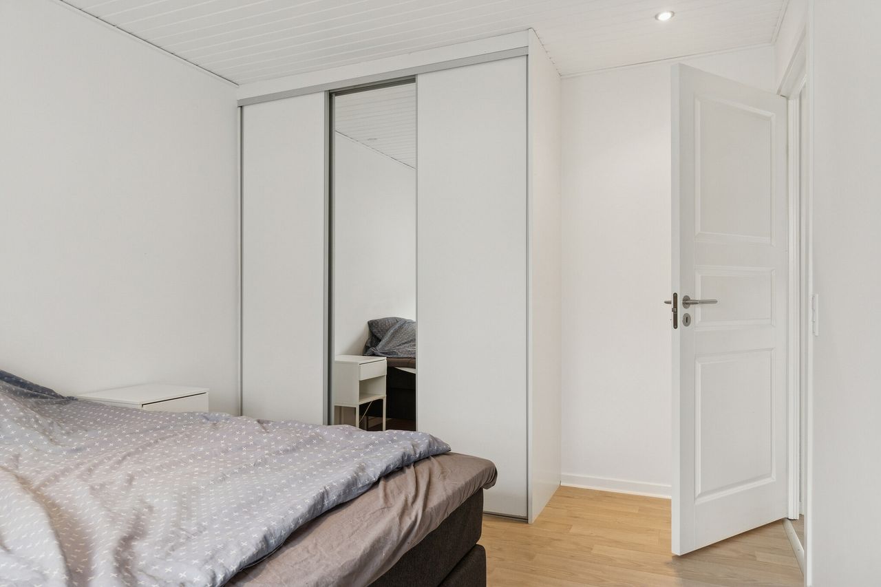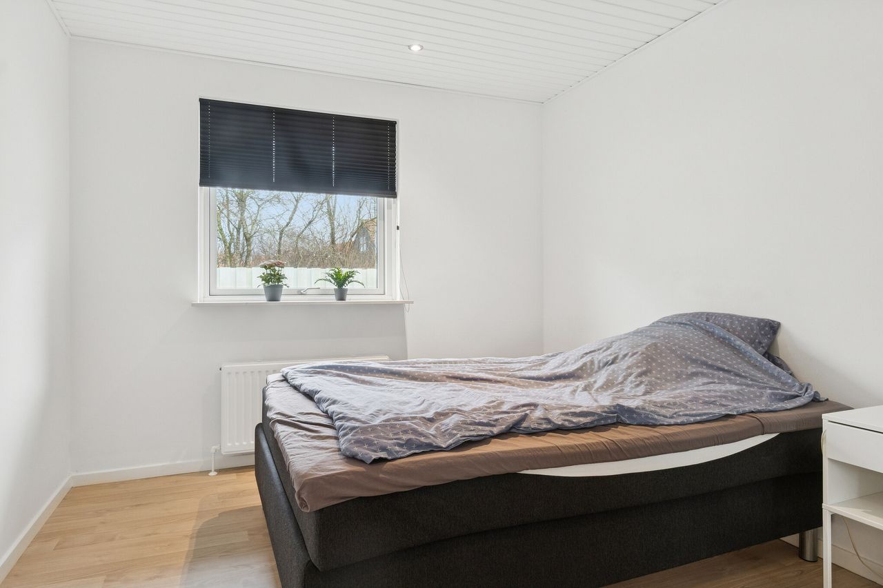Der er også en god størrelse på soveværelset, så du finder plads til garderoben foruden dobbeltsengen. Badeværelset byder på en bruseniche, og endelig kan du se frem til et bryggers og et udhus.