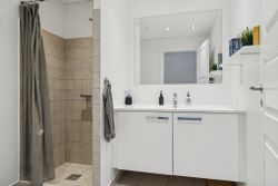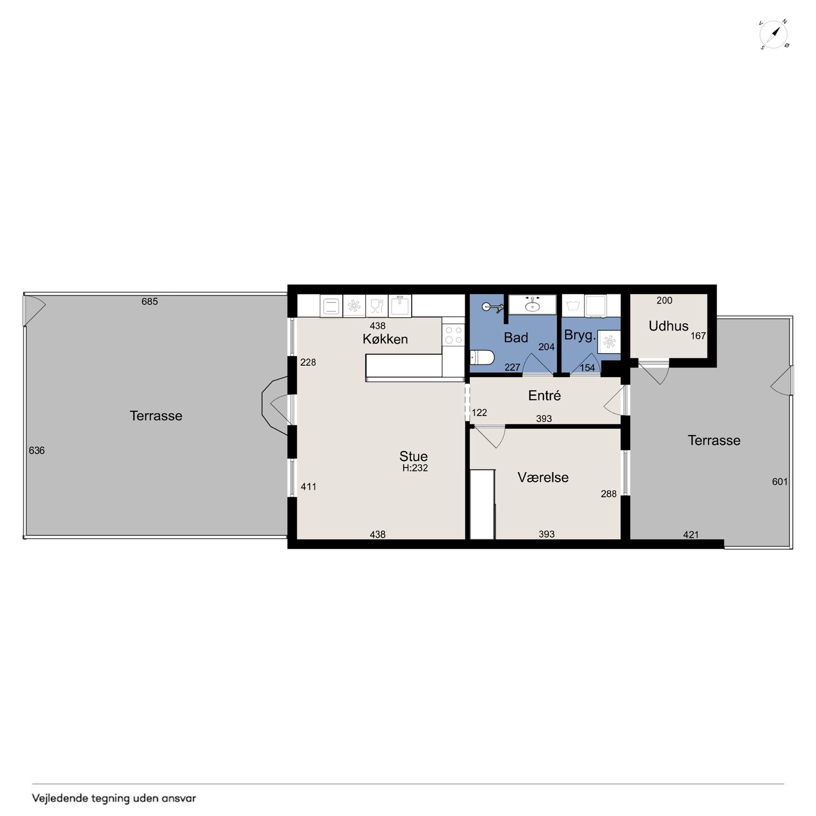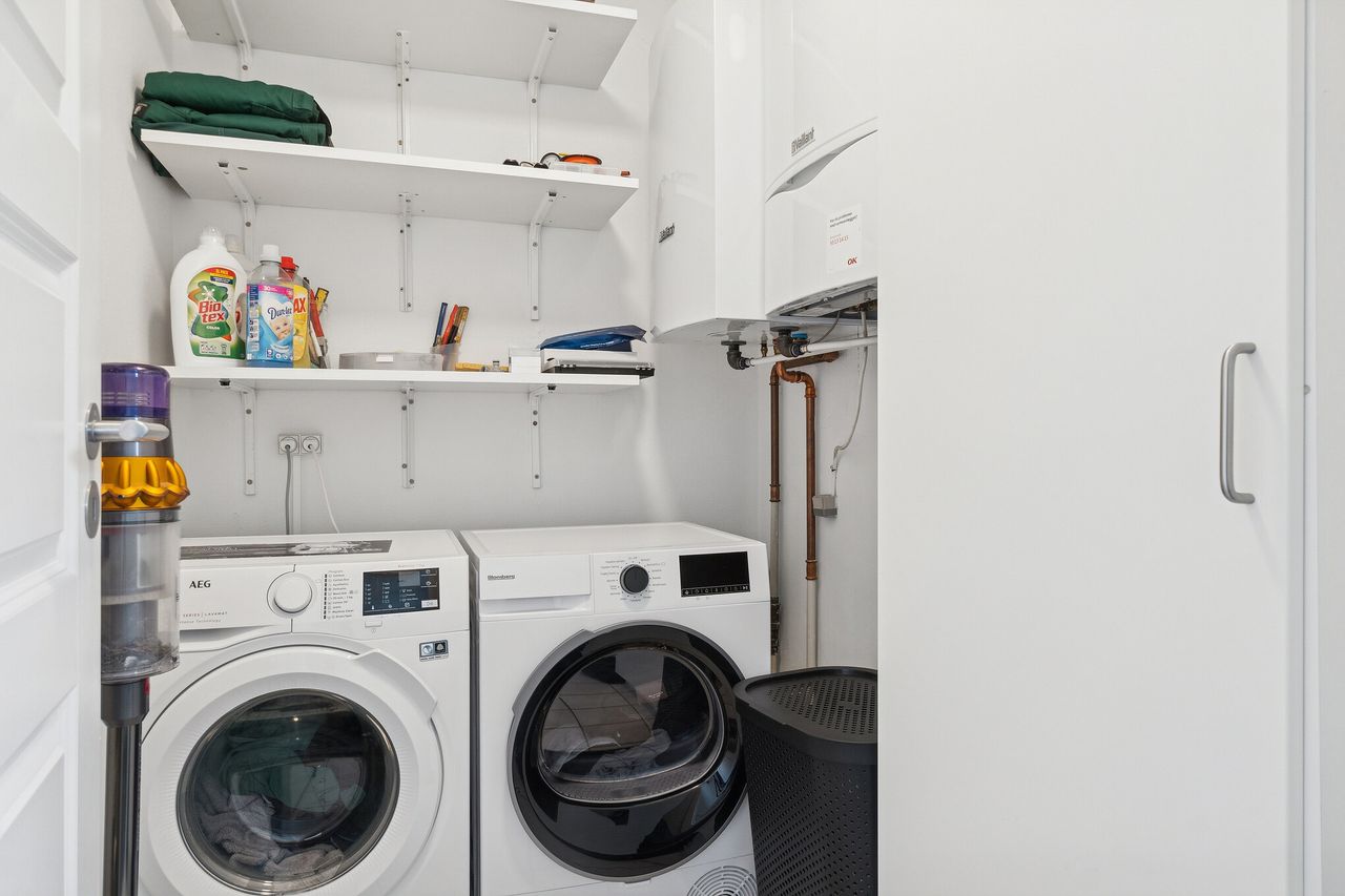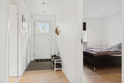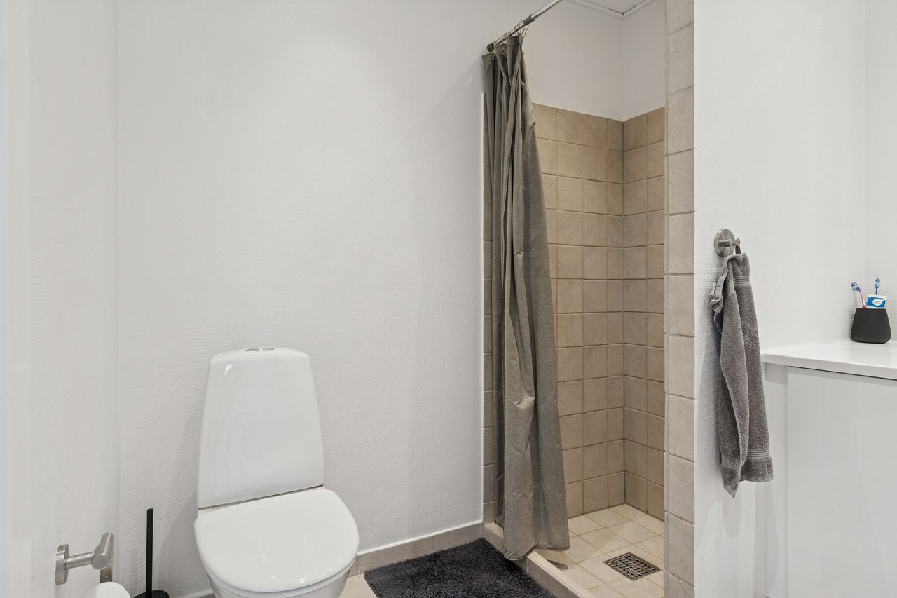 Der er også en god størrelse på soveværelset, så du finder plads til garderoben foruden dobbeltsengen. Badeværelset byder på en bruseniche, og endelig kan du se frem til et bryggers og et udhus.