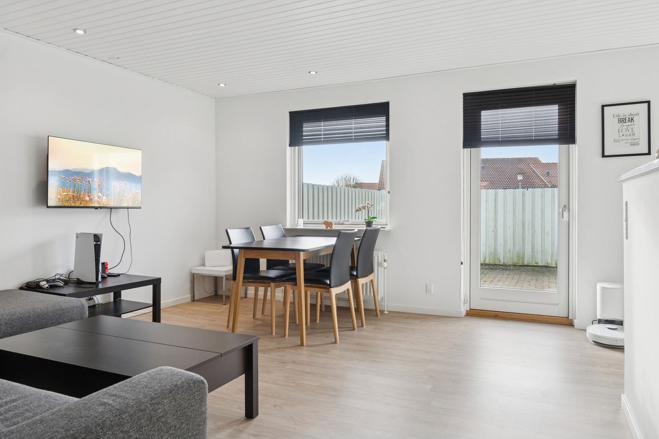 Det er lige til at flytte ind i dette nemme rækkehus, der er udført med en overskuelig indretning i ét plan. Indretningen er lys, og udendørs kan du se frem til terrasser i begge retninger. Boligen ligger dejligt på en lukket vej i Slagelse vestby.