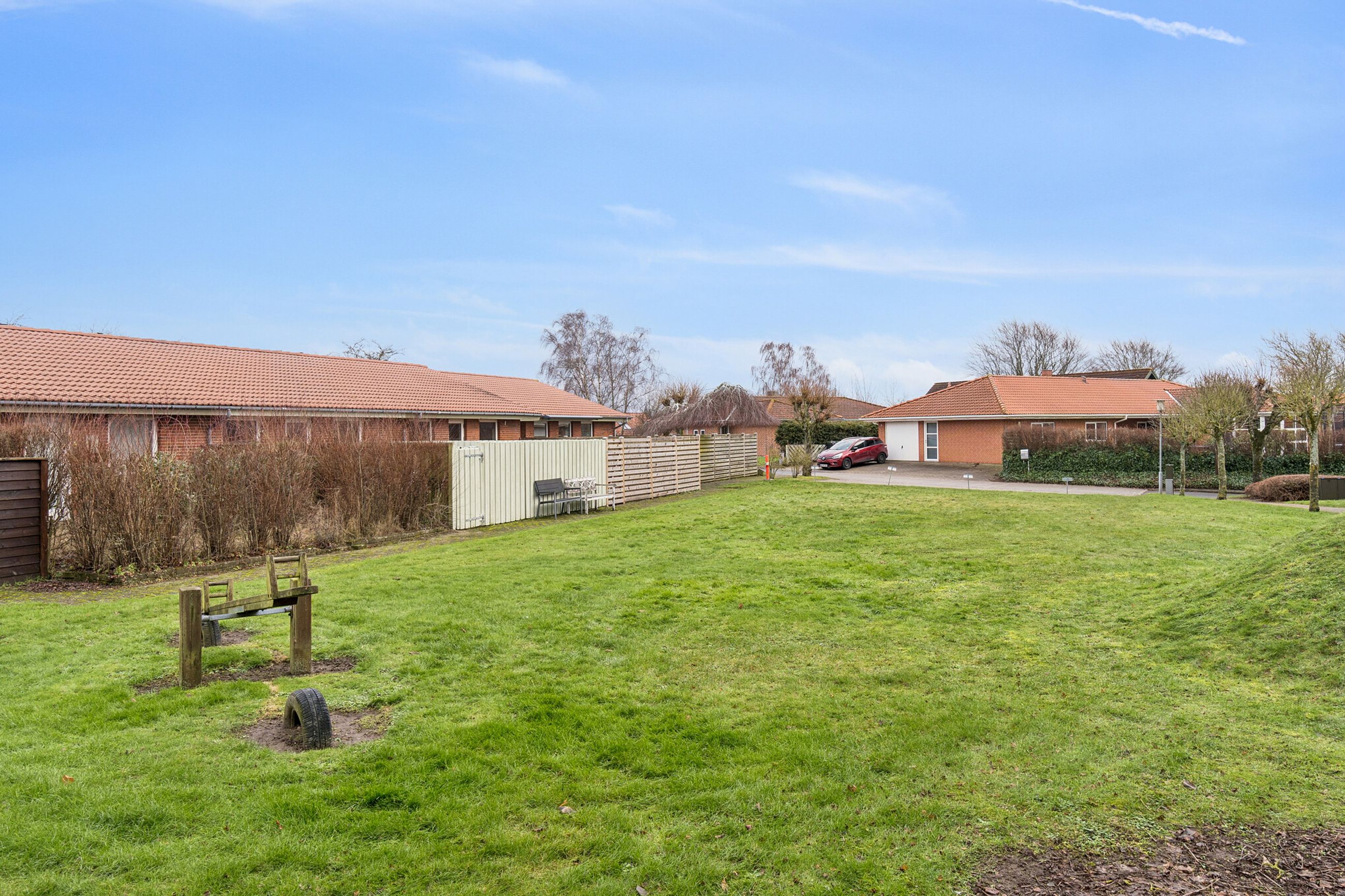På begge sider af huset er der terrasser. Det gør, at der er optimale chancer for at finde en plads i solen. Baghaven vender mod sydvest, og der er fin plads til havemøblerne og grillen. Terrassen er placeret lige op til et grønt fællesareal.