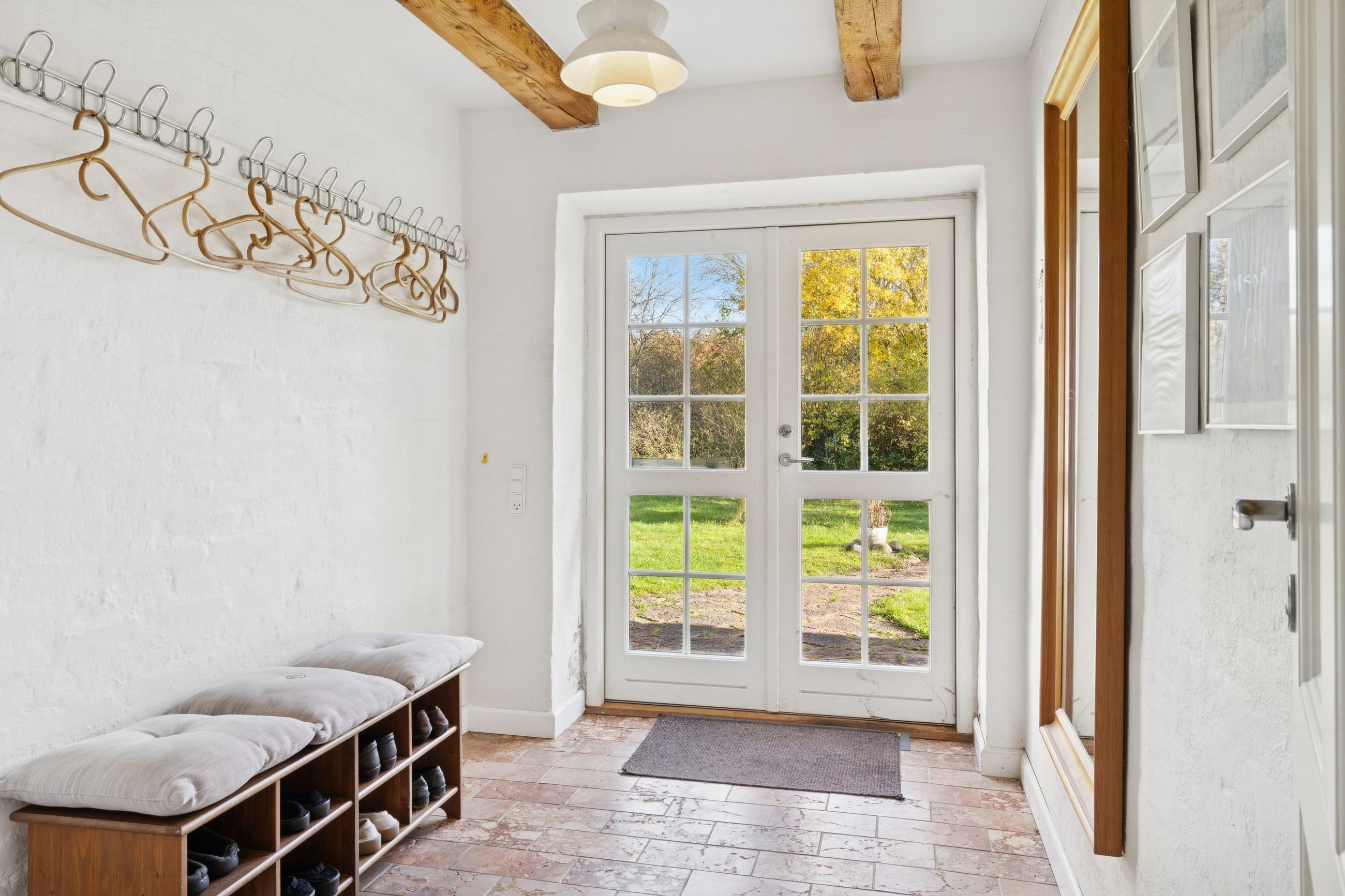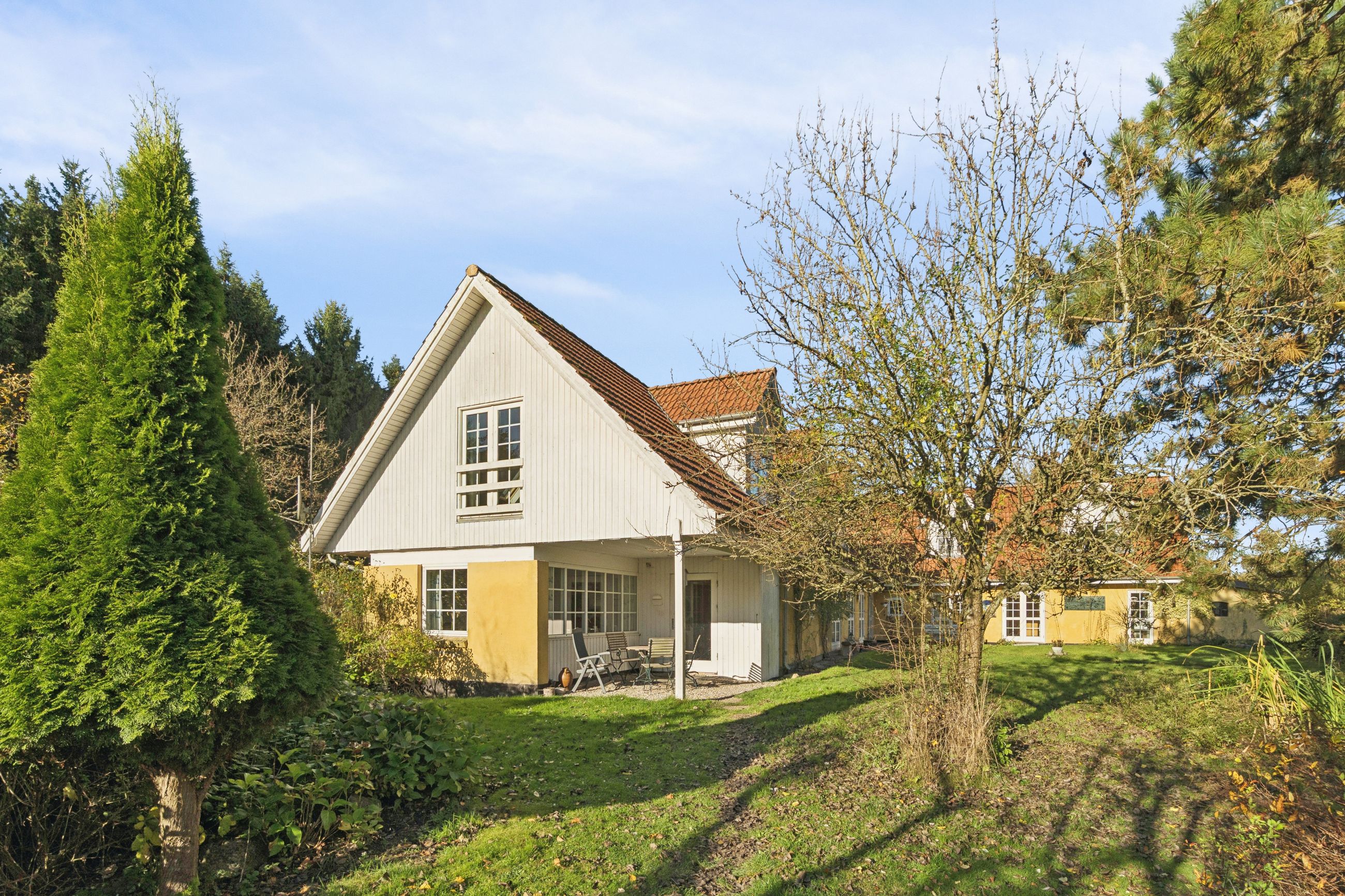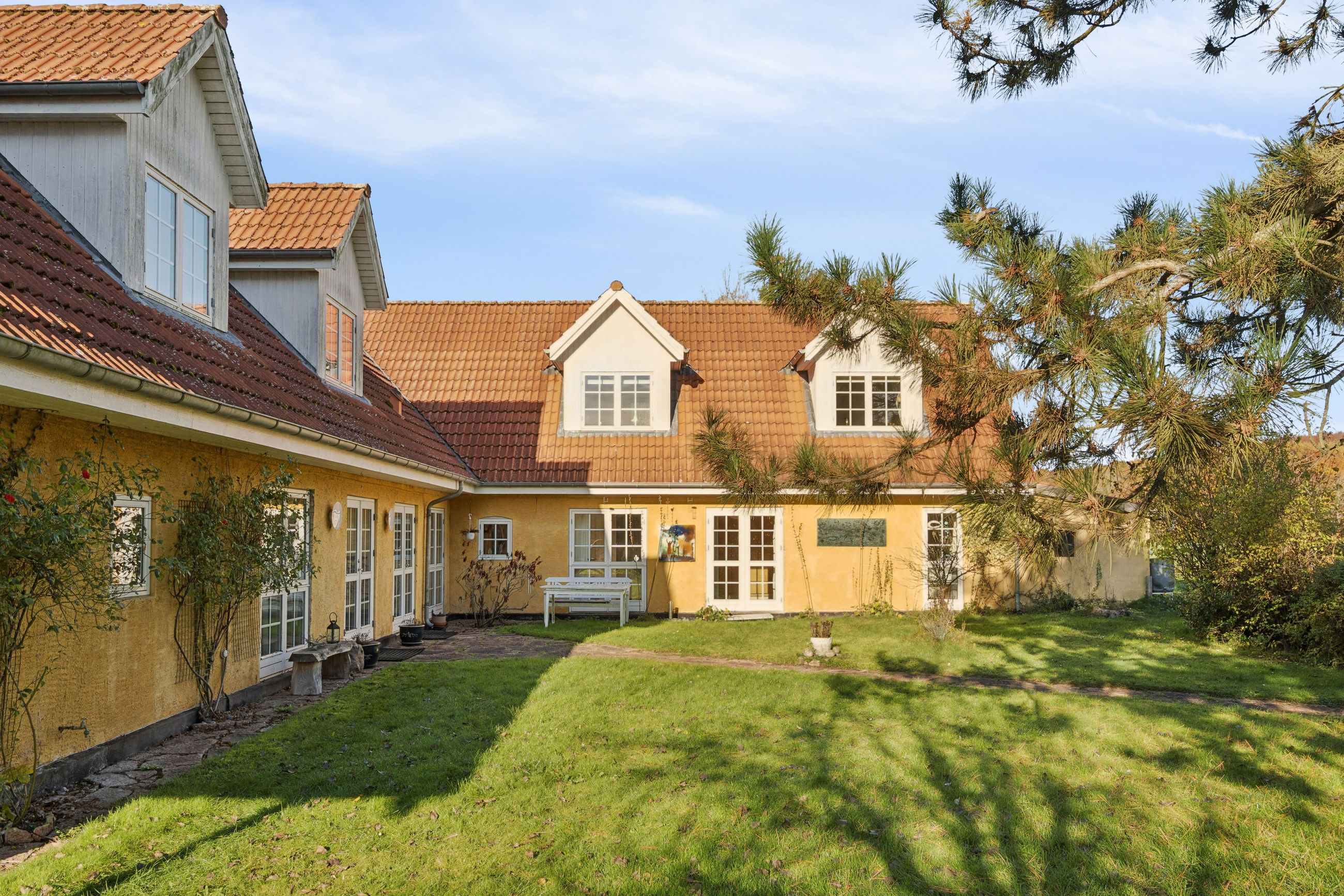 Nærmest huset er der flere terrasser at tage plads på, mens I spejder ud over landskabet og legende børn på græsplænen.