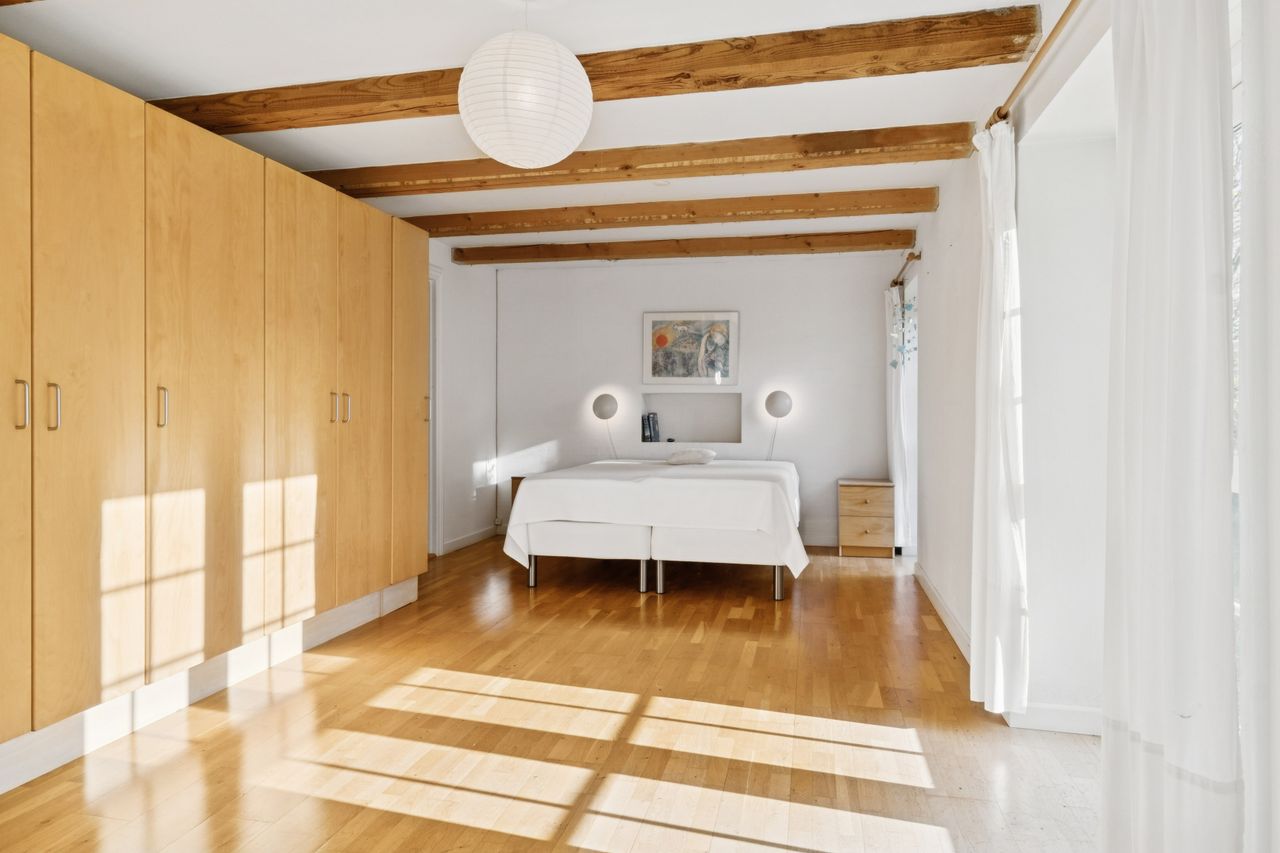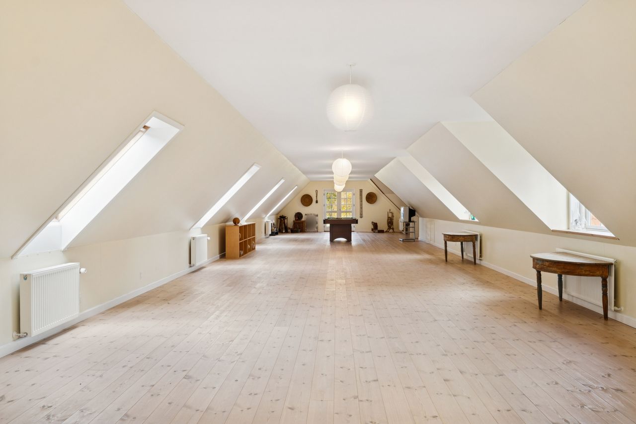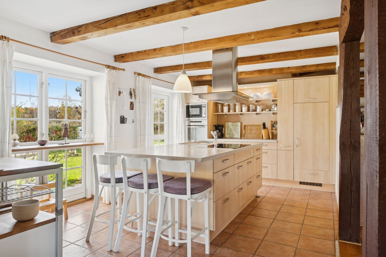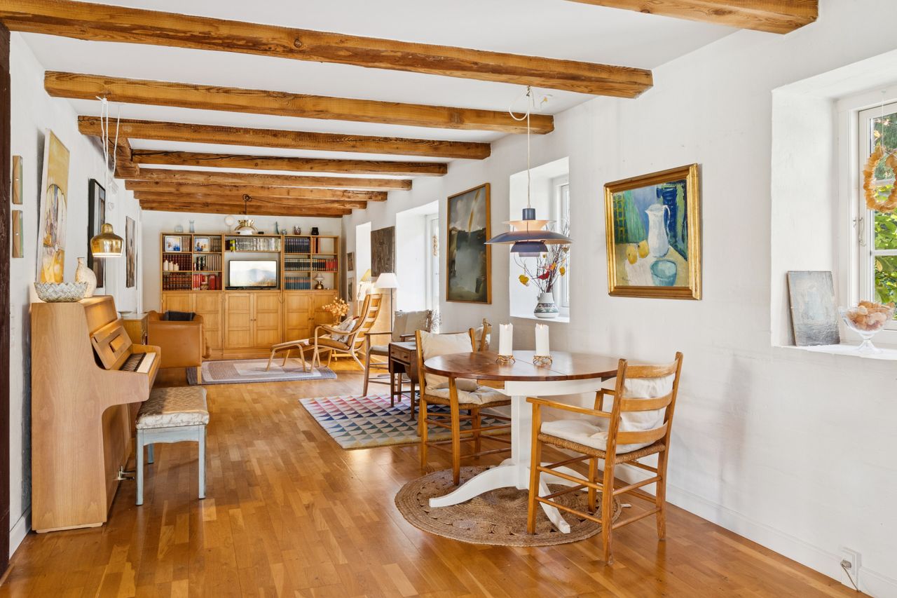 Ombygningen har medført gulvvarme i hele stueplanet, og I får straks øje på de charmerende finesser såsom loftsbjælker og hanebånd. Hjemmets hjerte er et vældigt stort opholdsmiljø med stue, alrum og køkken, der inviterer til festlige lejligheder såvel som nærvær med familie. Der er tilmed et ekstra køkken, som kan blive sit eget afsnit med et værelse, en stue og et badeværelse. Samme etage har yderligere et værelse, et badeværelse og et bryggers. Førstesalen byder på fine plankegulve samt en stor stue og to værelser, og her kan I tænke på flere udnyttelsesmuligheder.