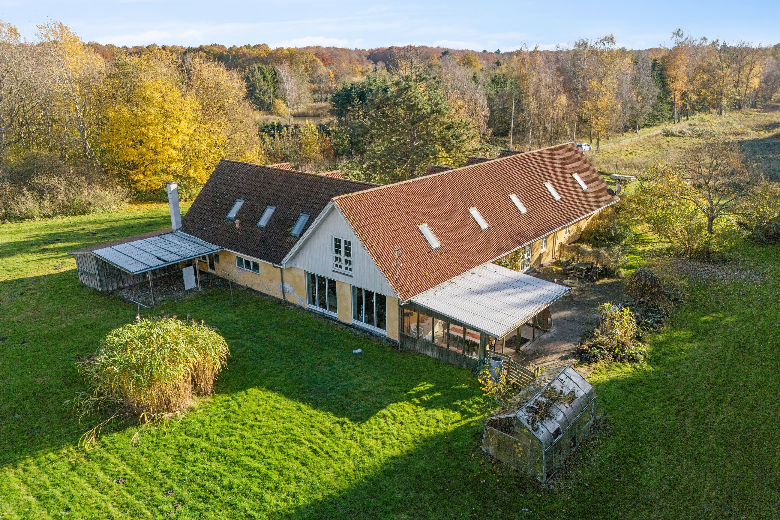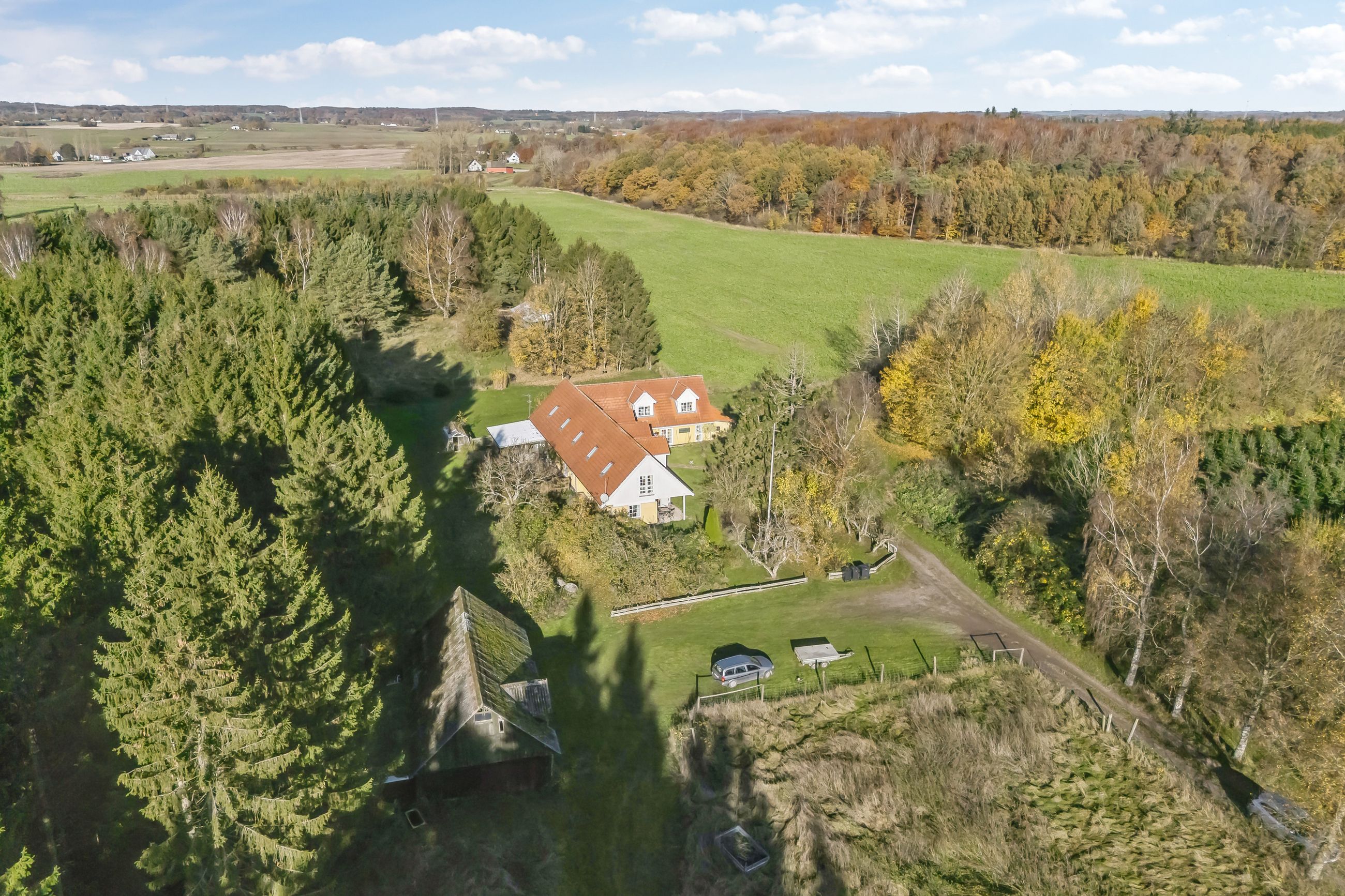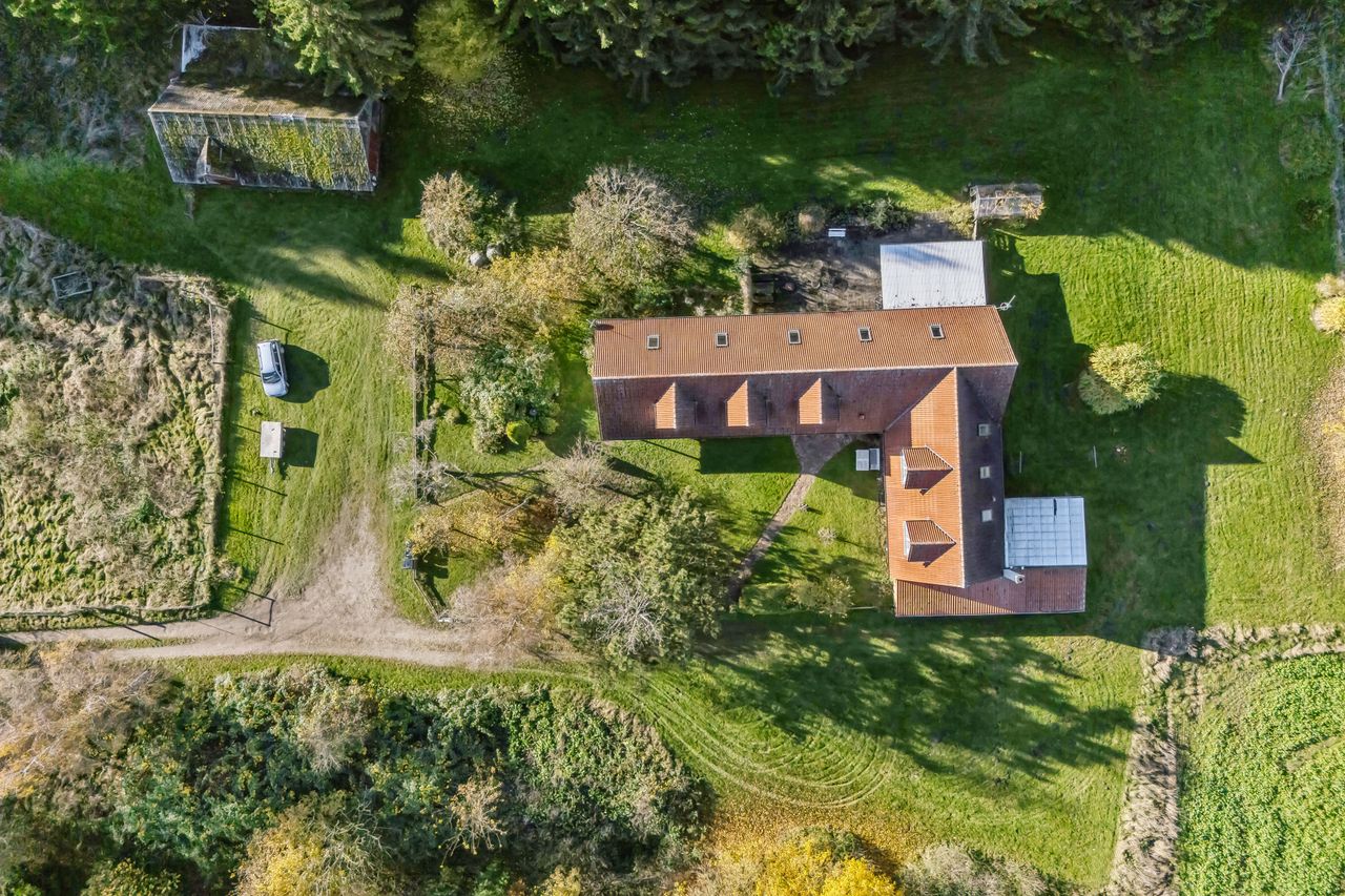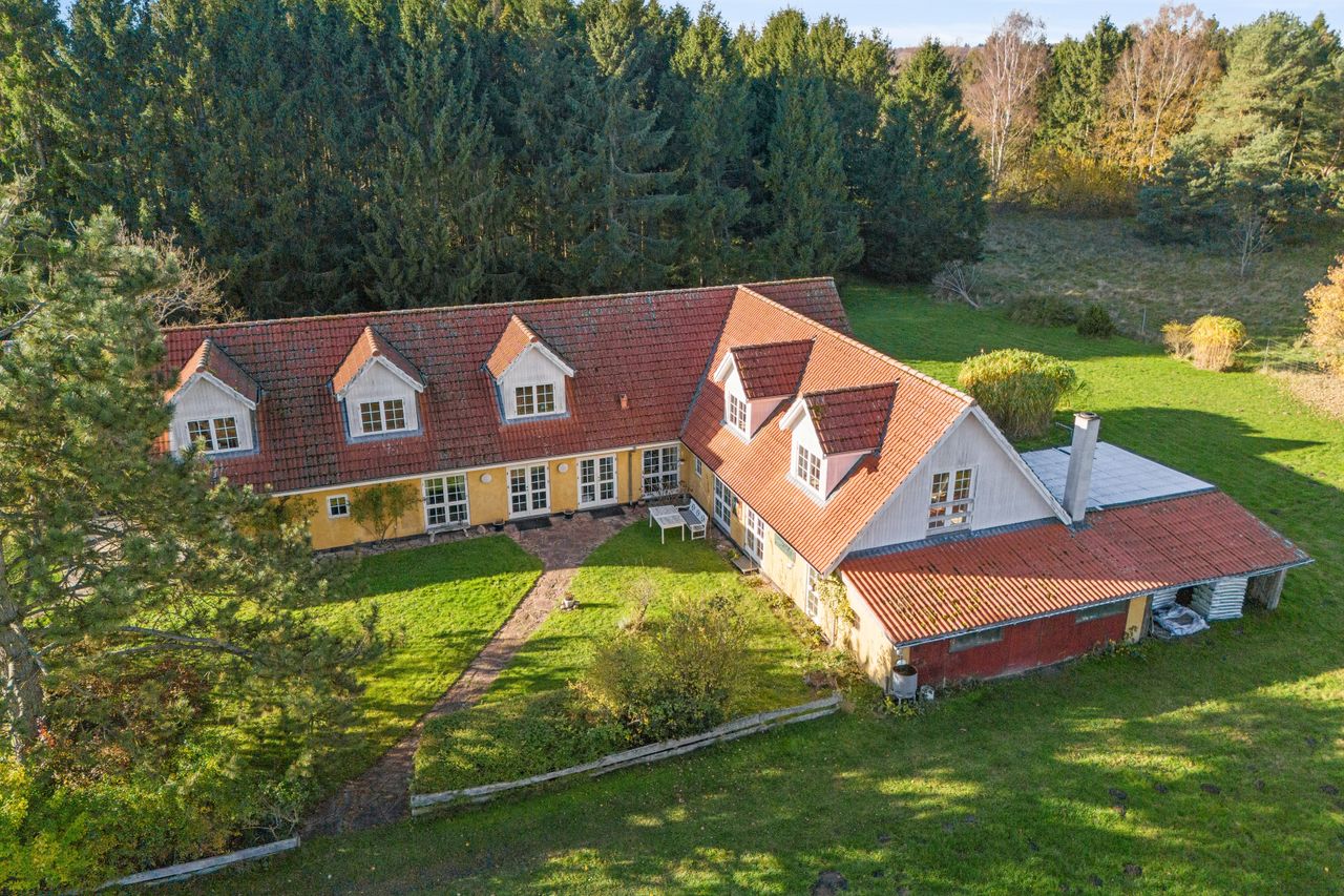 Nirvana på Jorden. Sådan er denne ejendom blevet beskrevet, og det er forståeligt. Ejendommen er nemlig en fantastisk naturgrund, der ikke bare selv er beplantet med gran, men også har skov og marker som nabo. Huset fremtræder i flot, klassisk stil ude som inde, og det blev delvist genopført i 2004. Her kan I både have bolig og hobbyvirksomhed.