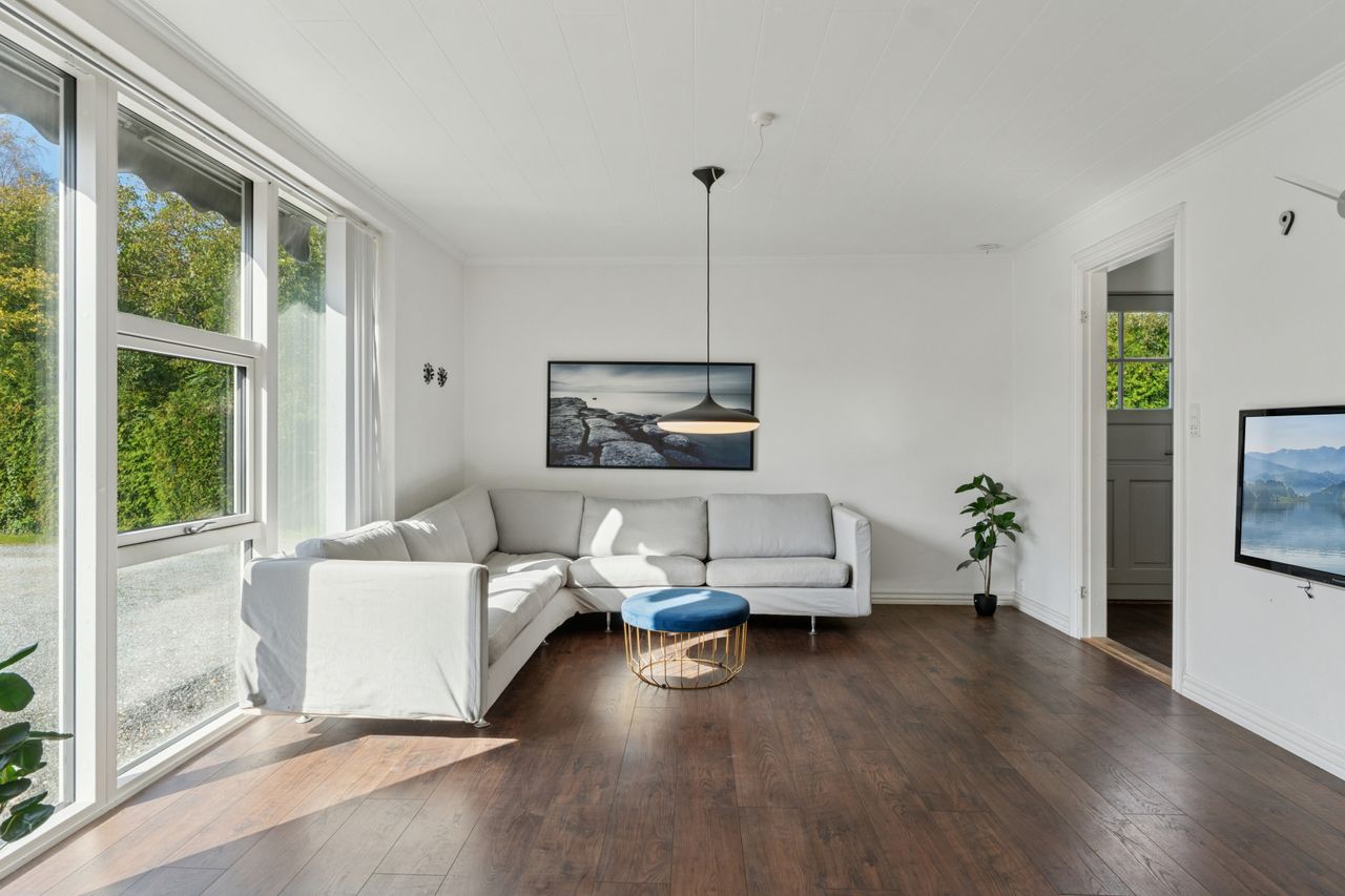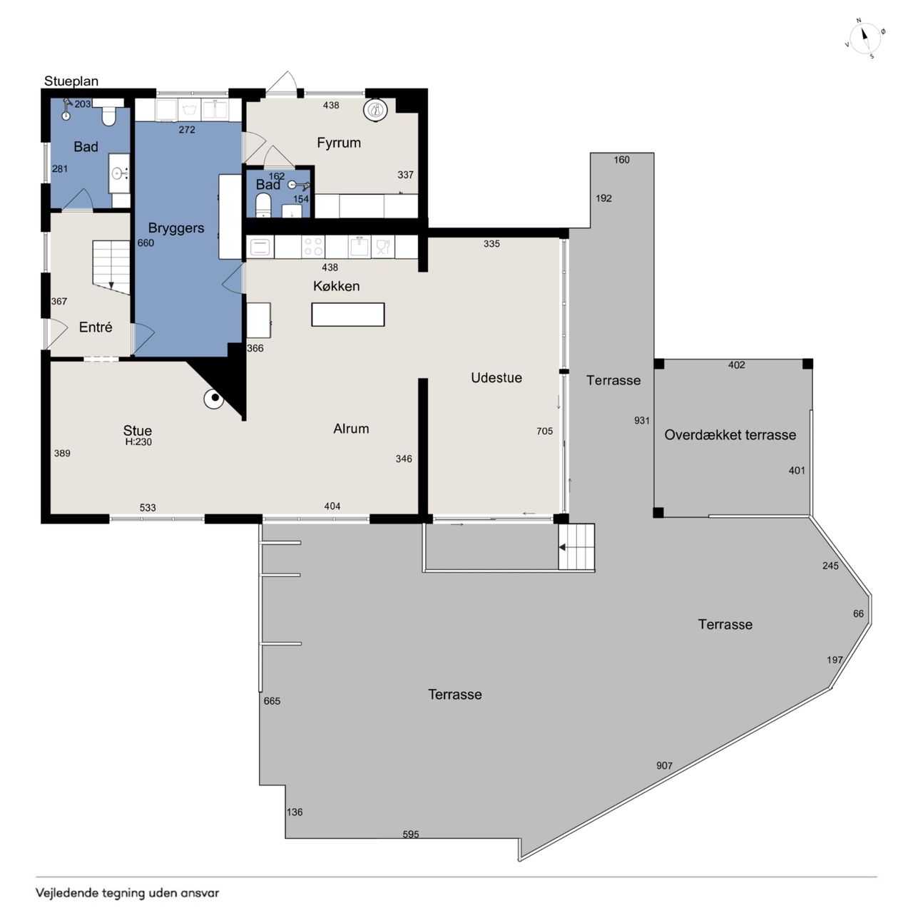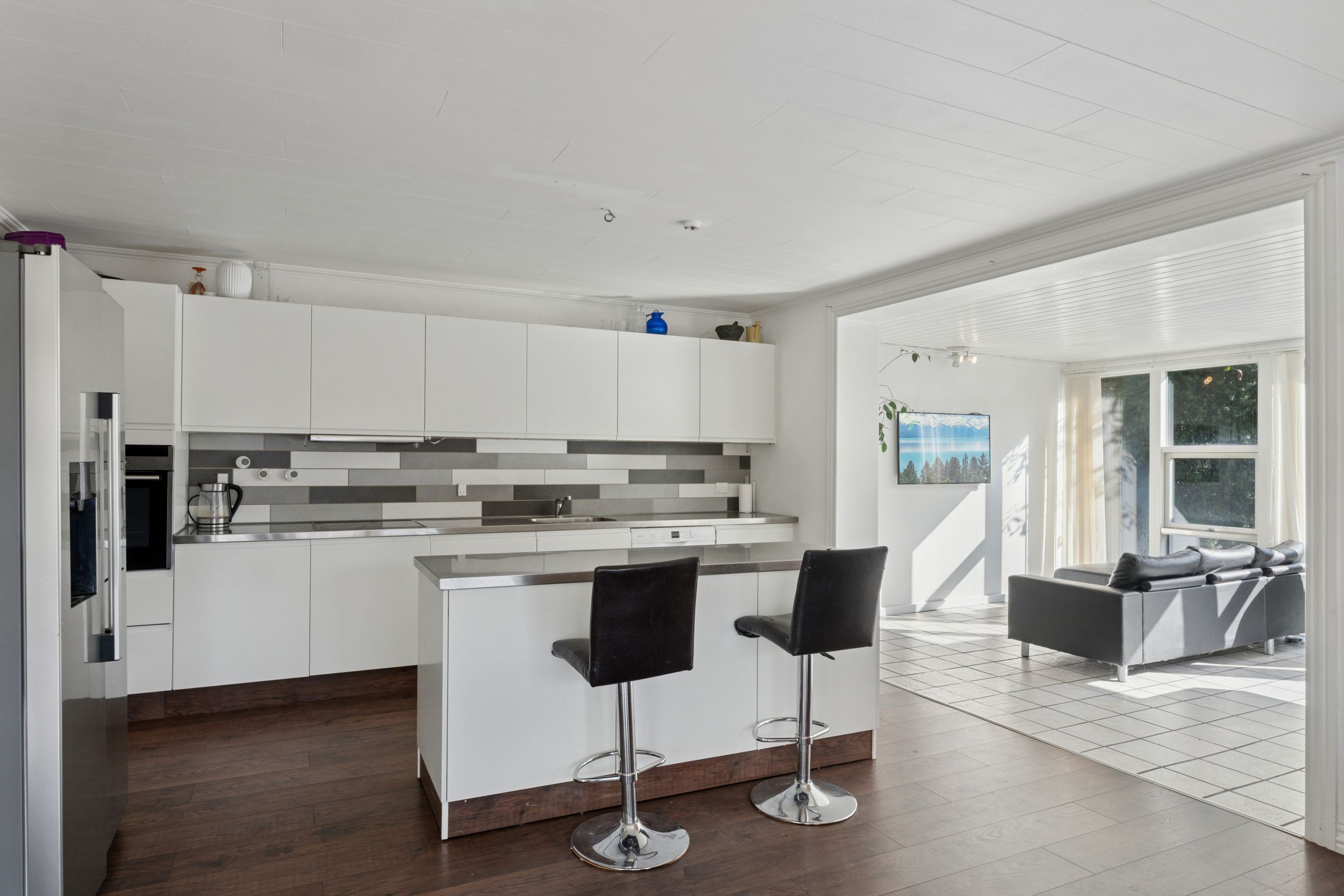 Boligens stueplan byder på en separat forældreafdeling med soveværelse og eget badeværelse, hvilket giver en praktisk og privat indretning. Herudover finder man et stort bryggers med god opbevaringsplads og direkte adgang til husets nyere køkken. Sidstnævnte er på mange måder husets hovedåre, og det er herfra, al social sammenkomst udspringer med stuearealerne bredt ud i tre grene fra køkkenet. Et dejligt lysindfald fra de store vinduespartier vælter ind fra flere verdenshjørner, mens en hyggelig brændeovn bliver et trækplaster på kølige aftener. Den indbydende udestue, som forlænger boligen, giver mulighed for at nyde udsigten til haven og de omkringliggende marker året rundt.