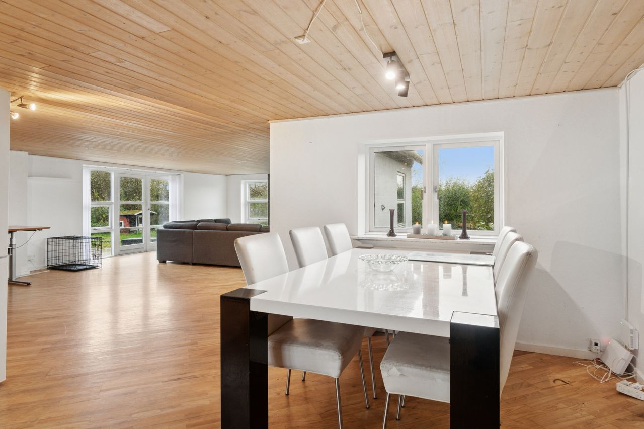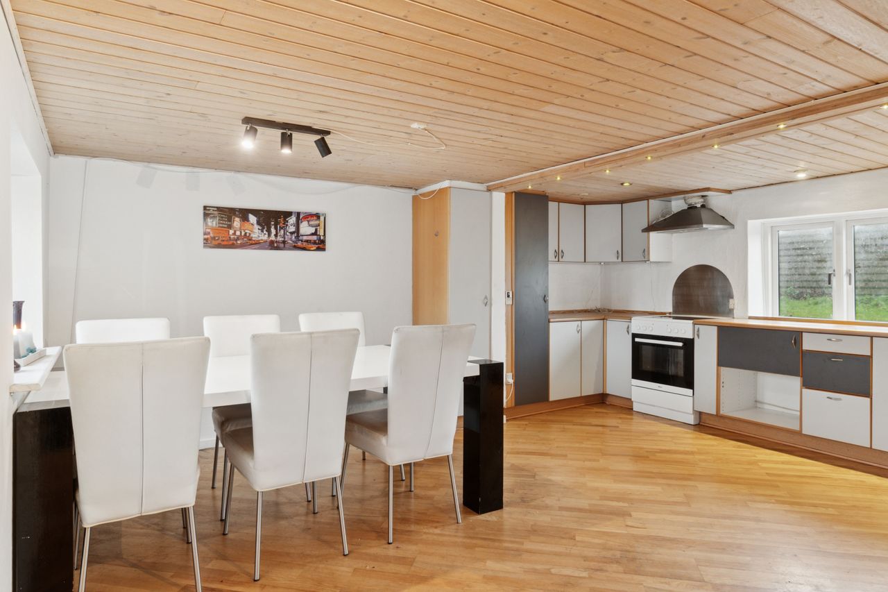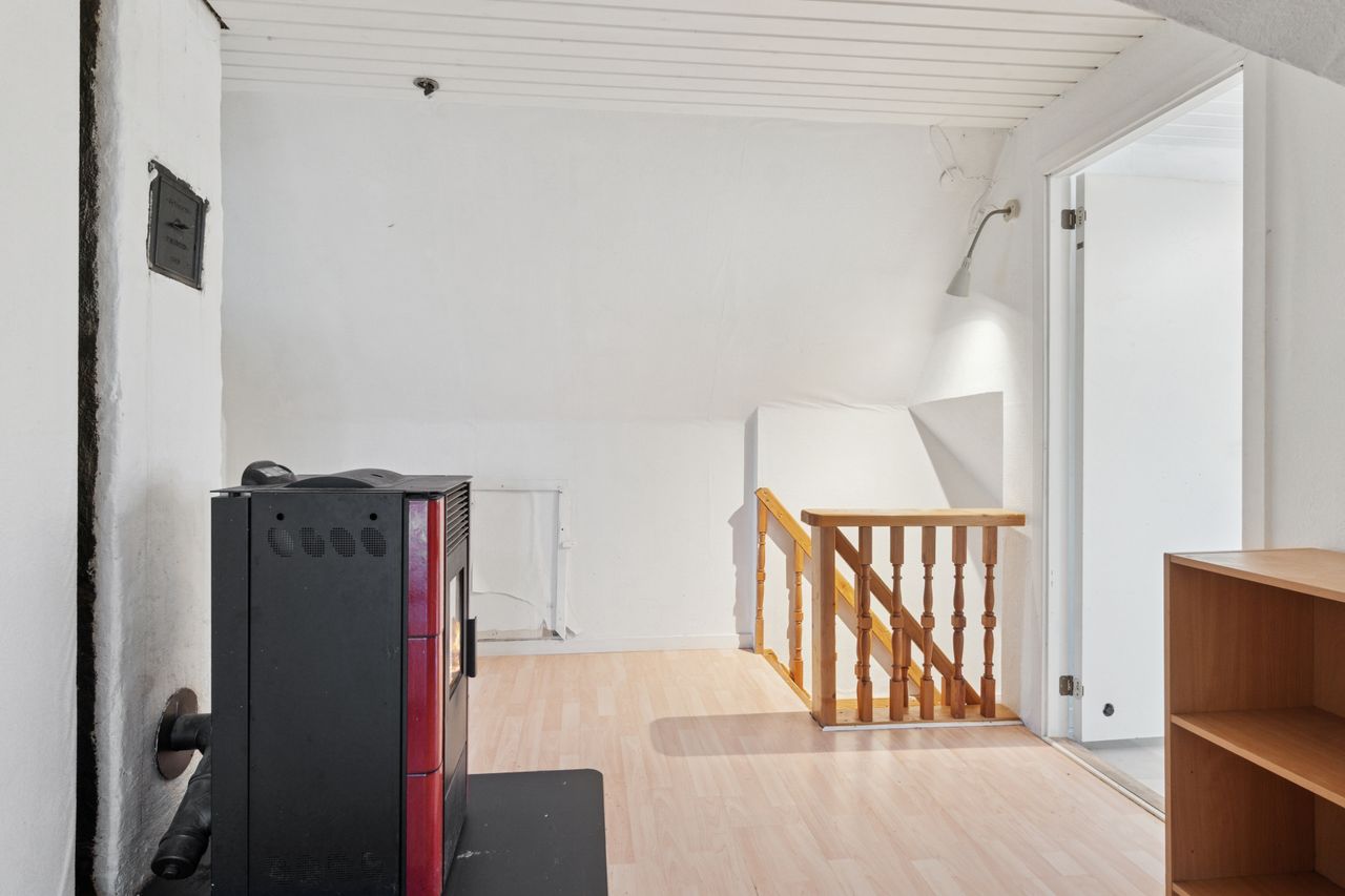 Størstedelen af stueetagen er afsat til et åbent opholdsrum, hvor køkken og stue er forenet. Her strømmer sollyset ind fra flere sider, og der er også god plads til at indrette hyggelige sektioner. Selve køkkenet er lyst og funktionelt. To gode pilleovne sørger for en billig og behagelig opvarmning i de kolde måneder.