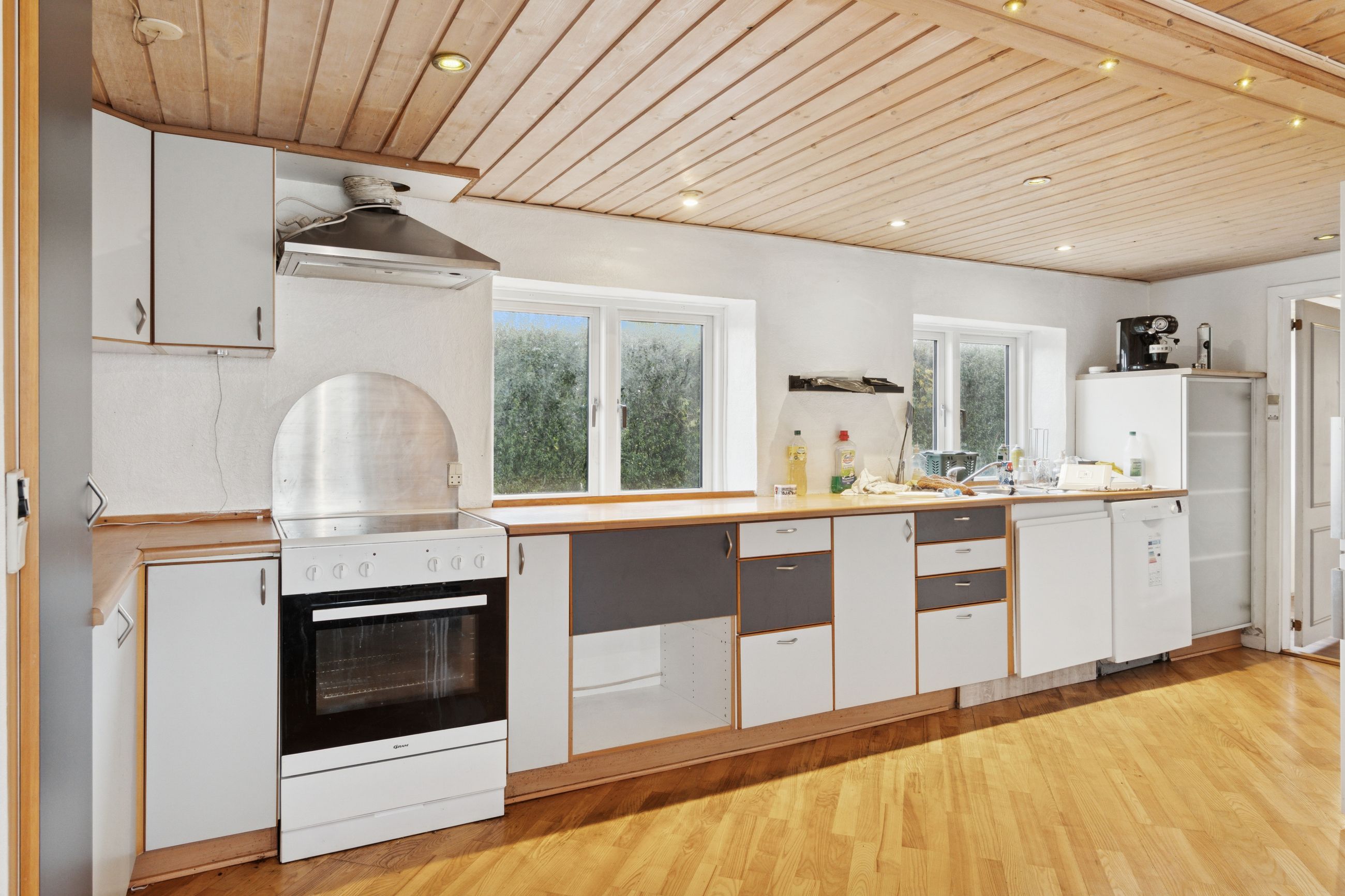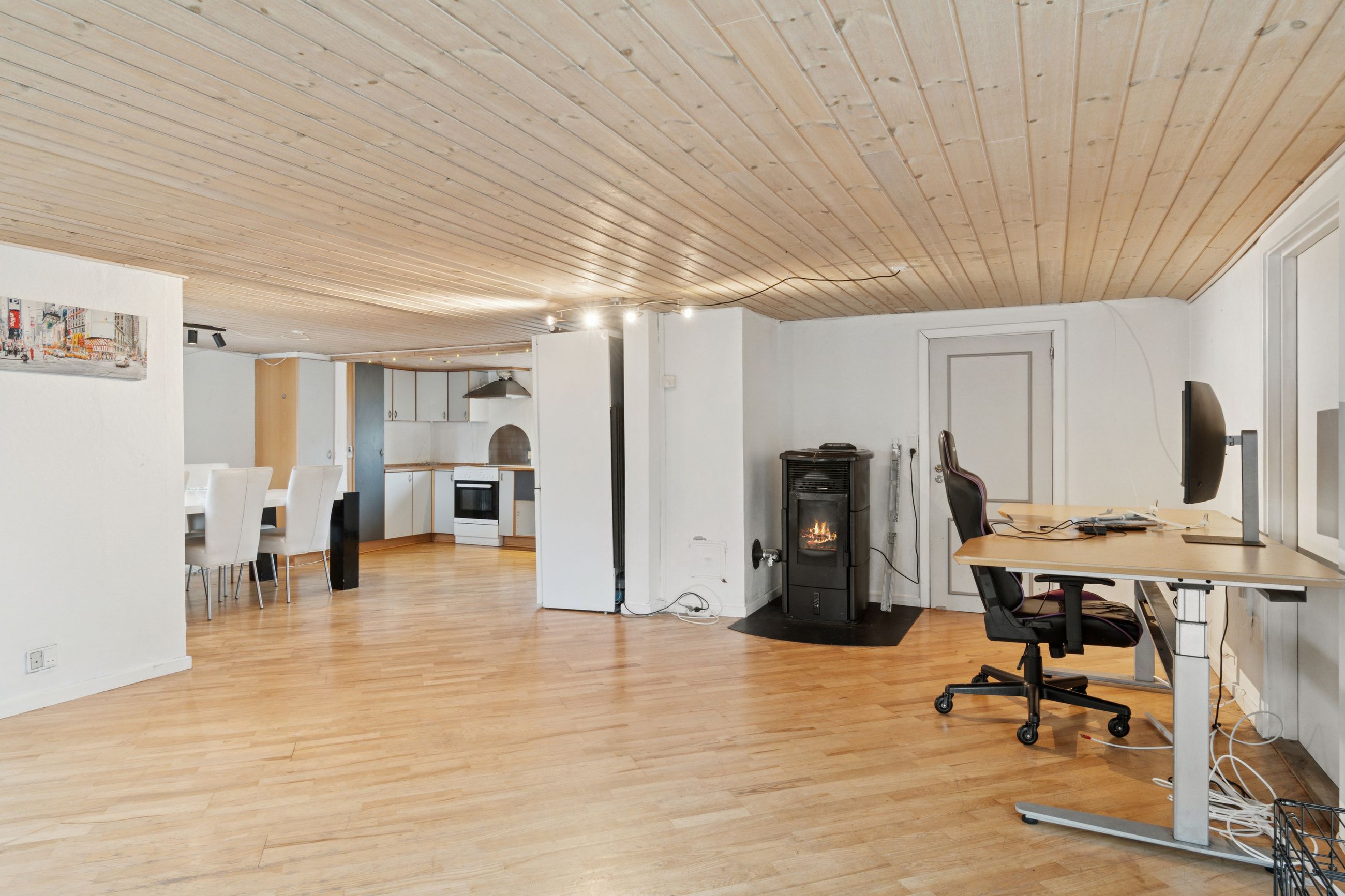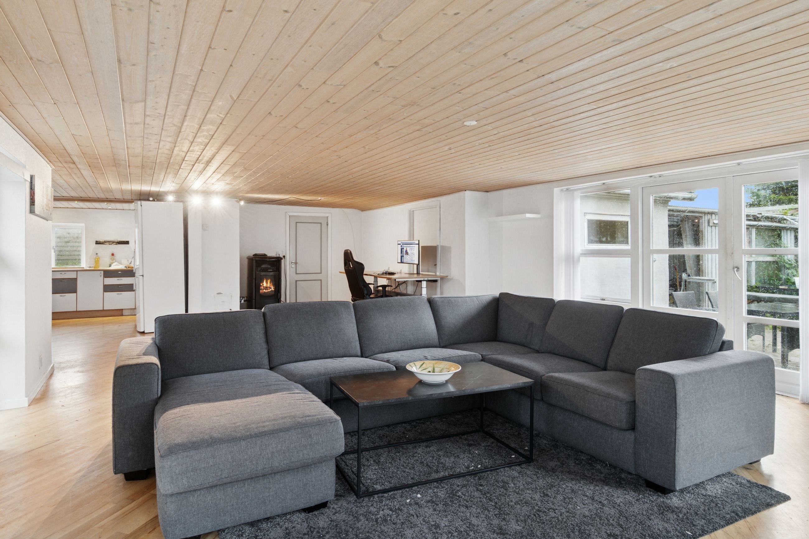 Størstedelen af stueetagen er afsat til et åbent opholdsrum, hvor køkken og stue er forenet. Her strømmer sollyset ind fra flere sider, og der er også god plads til at indrette hyggelige sektioner. Selve køkkenet er lyst og funktionelt. To gode pilleovne sørger for en billig og behagelig opvarmning i de kolde måneder.