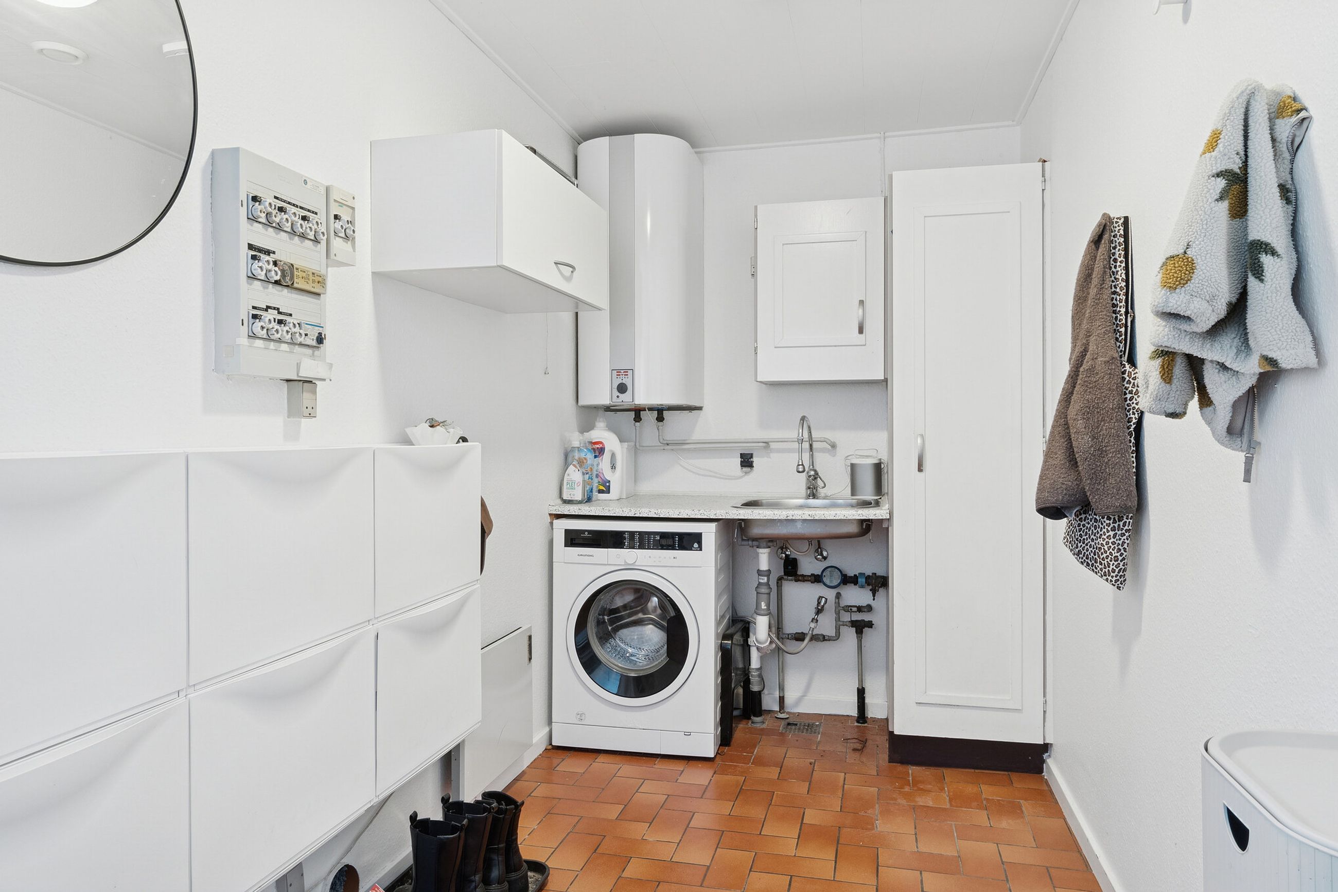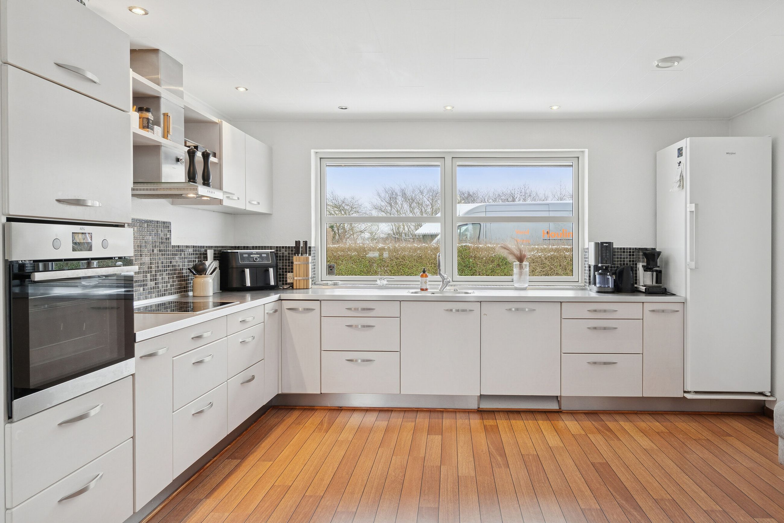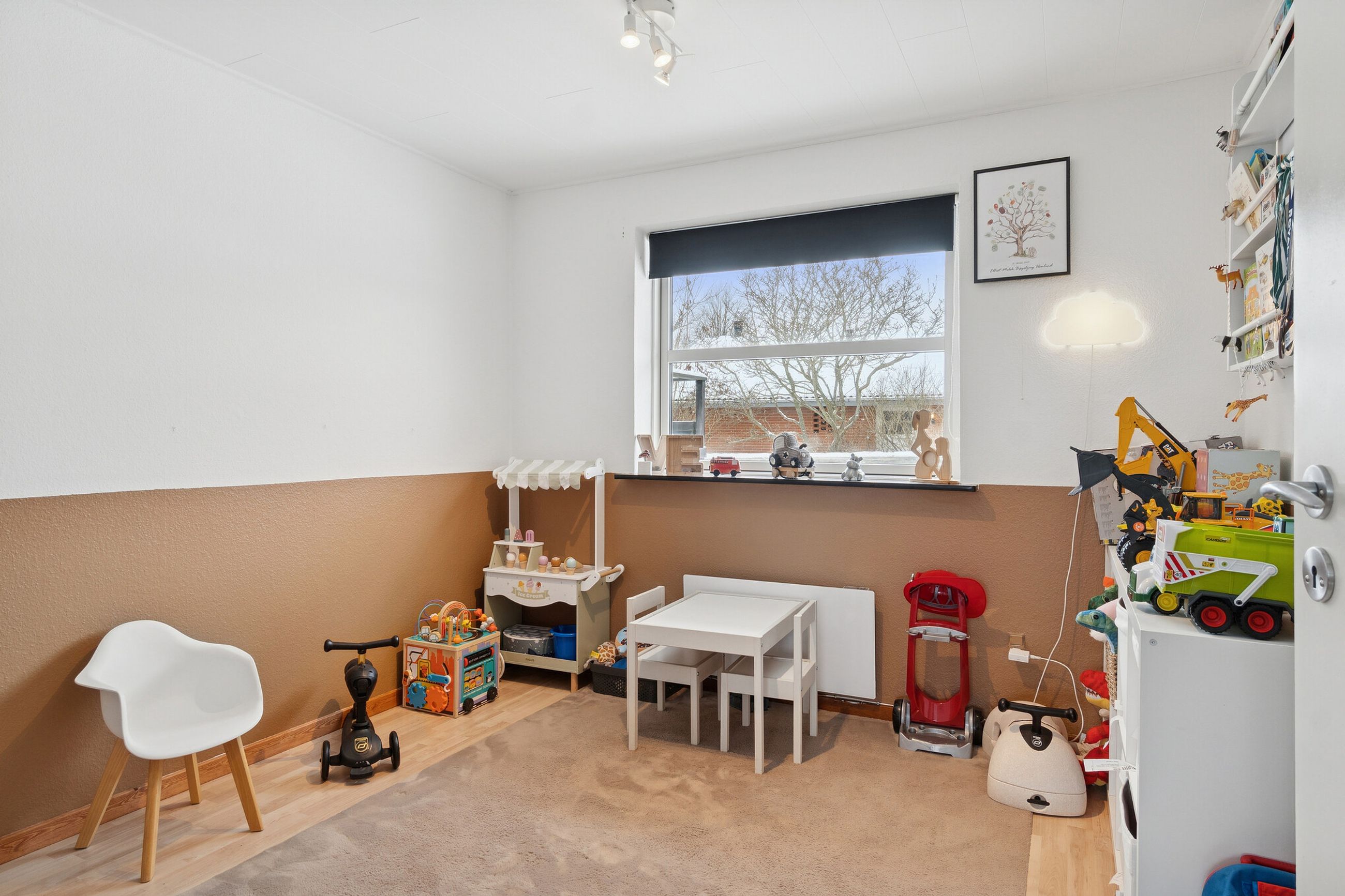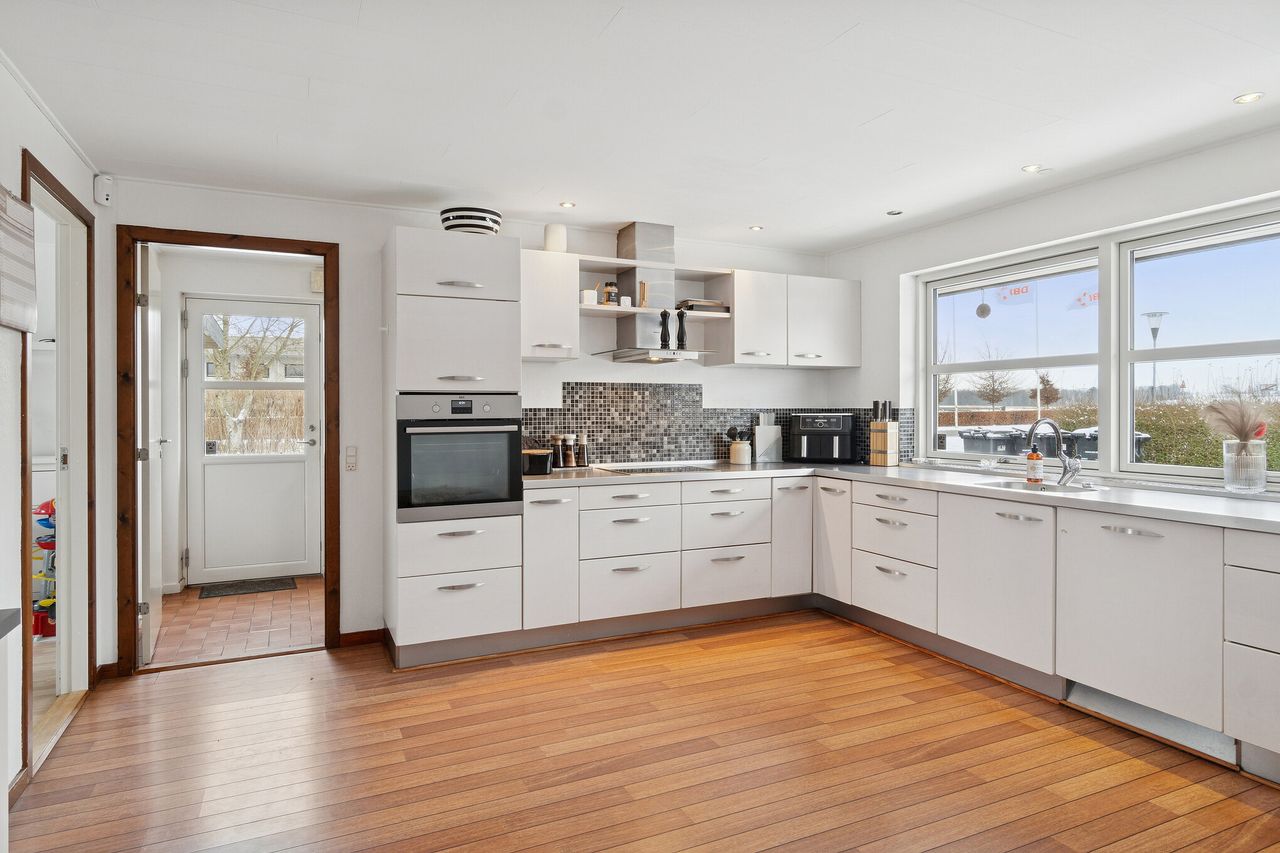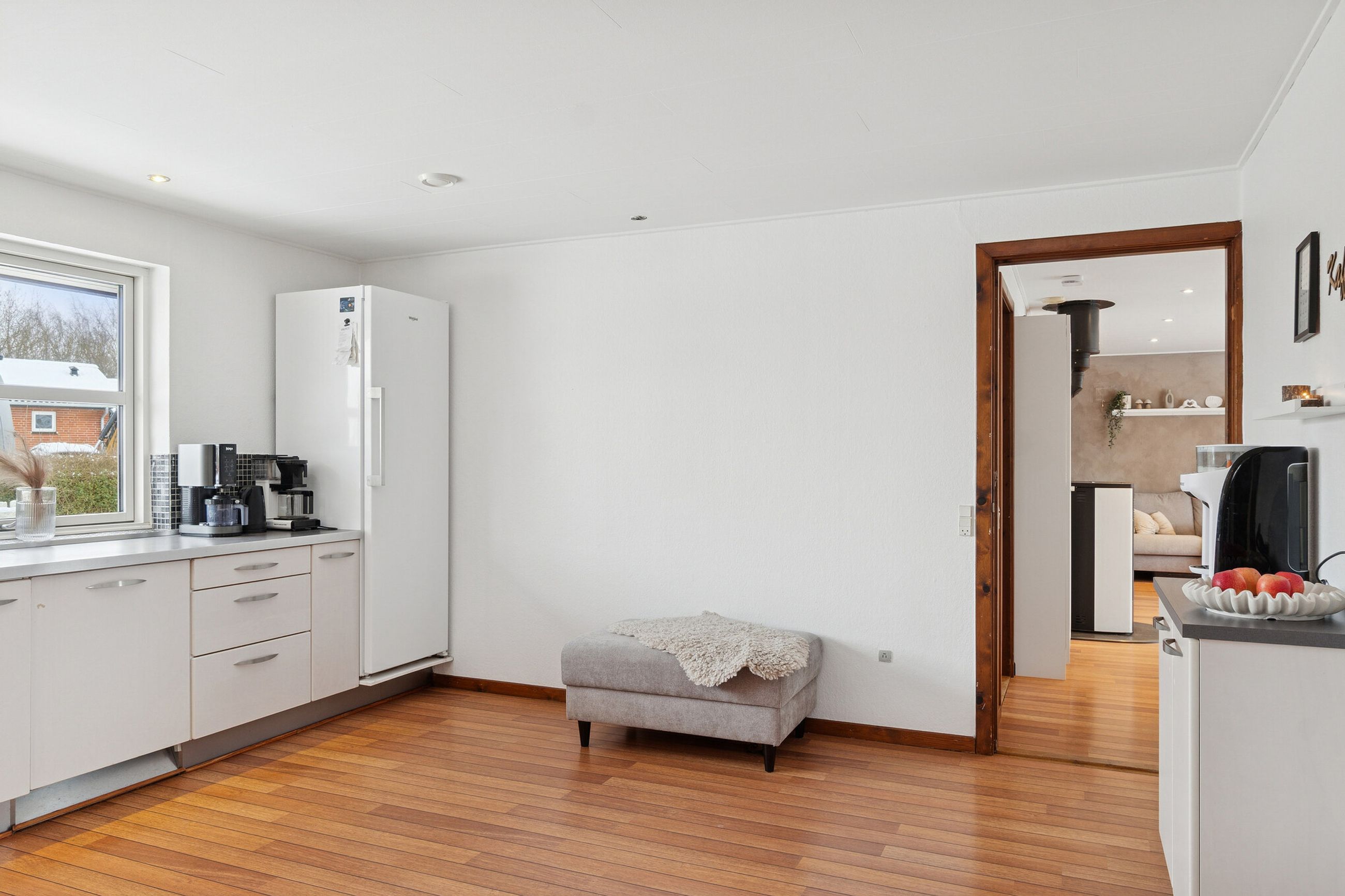 Køkkenet er placeret tæt på stuen, men dog alligevel separat. Her er god plads til både opbevaring og arbejdsgange, og fra køkkenet er der videre adgang til bryggerset med vaskefaciliteter og udgang til haven. Badeværelset ligger midt i boligen, og dertil kommer tre værelser, som kan anvendes fleksibelt som soveværelse, børneværelser eller hjemmekontor. Ejendommen har fået nye vinduer og døre inden for de seneste fem år, hvilket giver både et lavere energiforbrug og mindre vedligeholdelse.