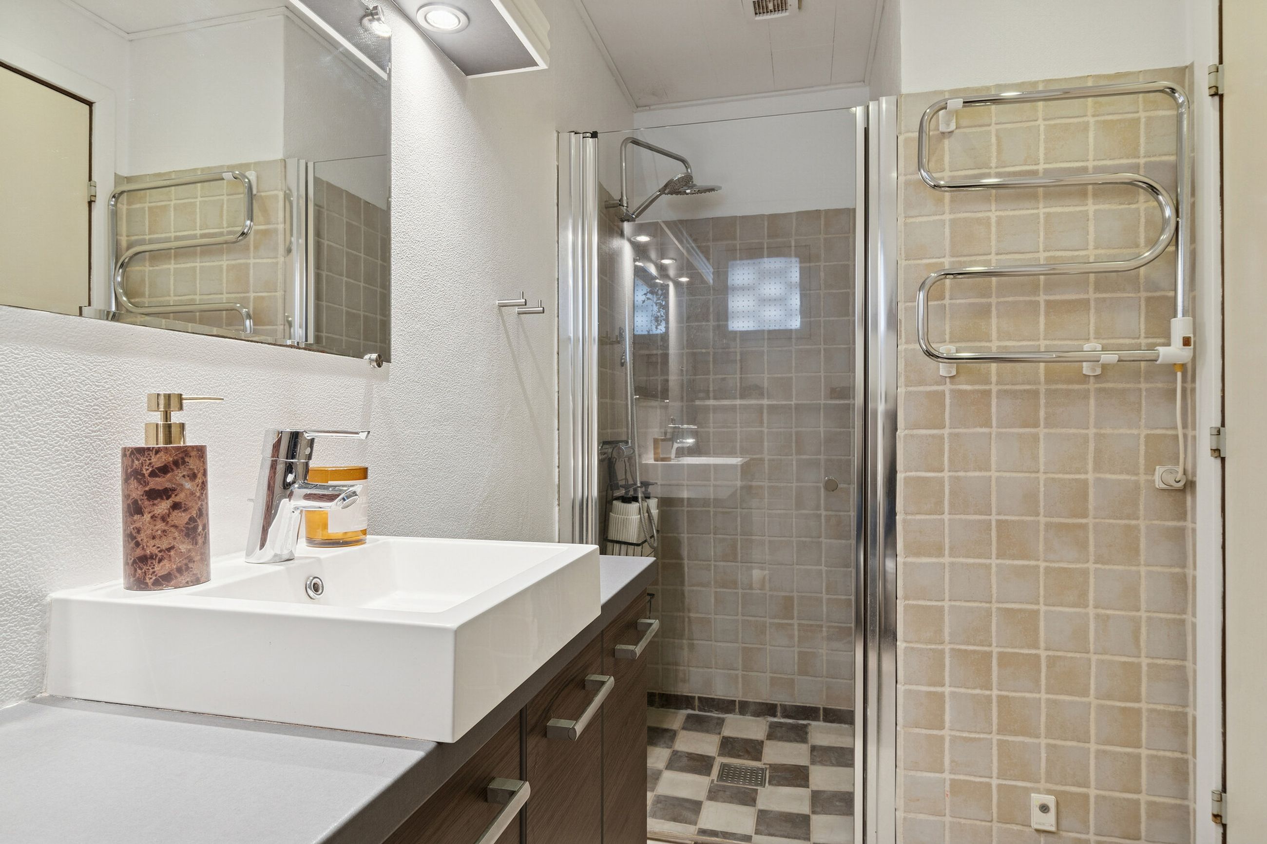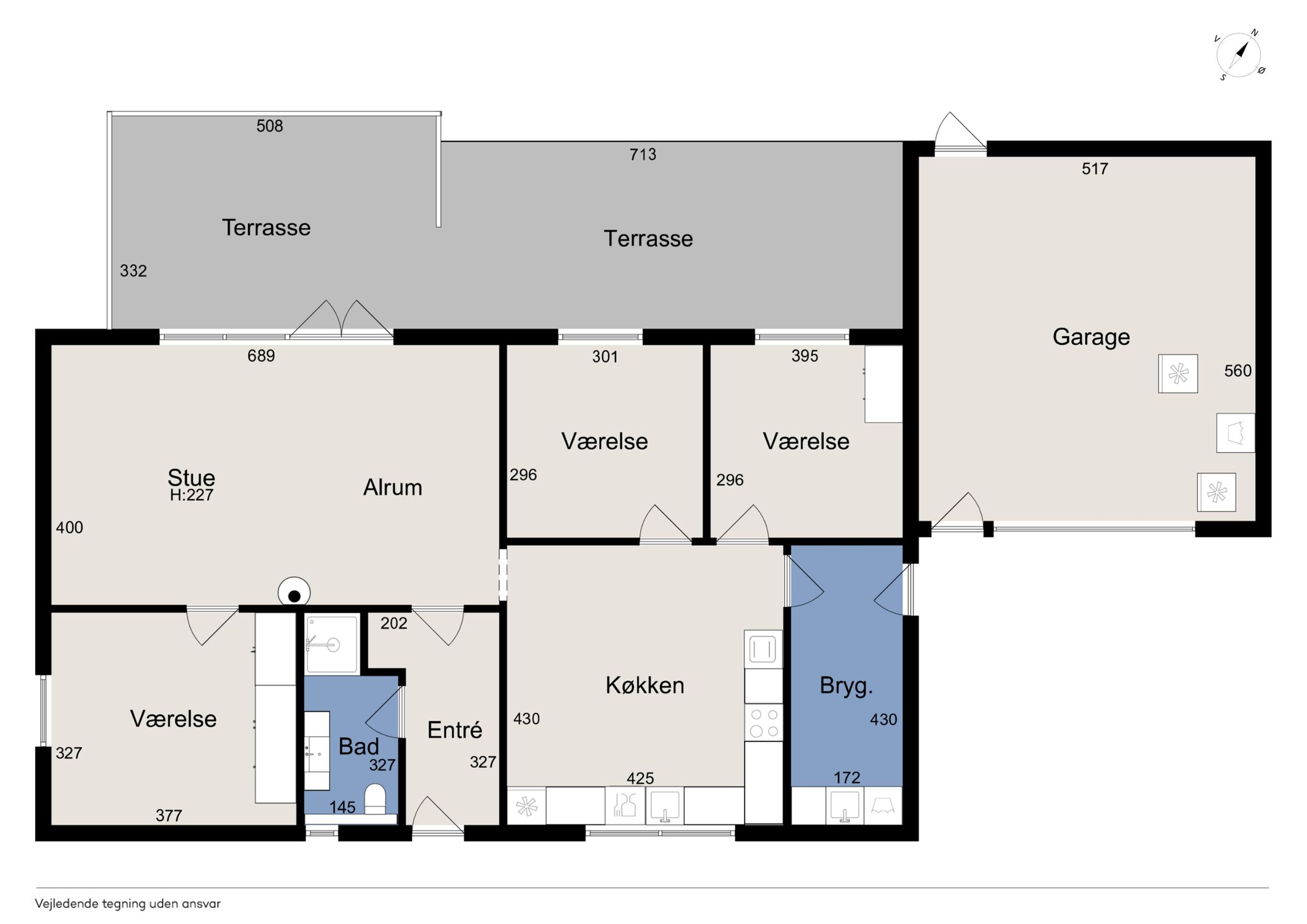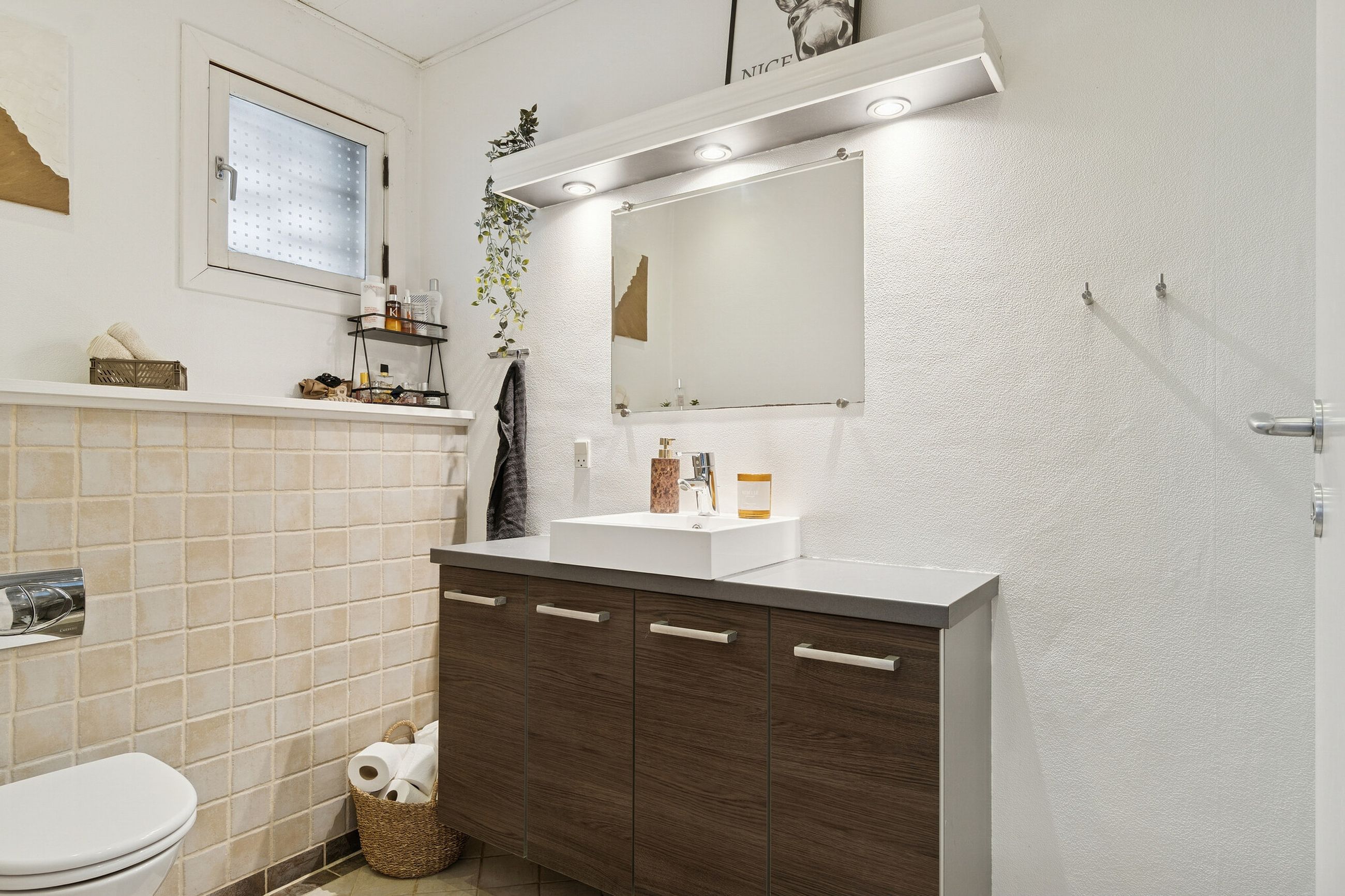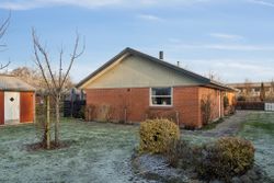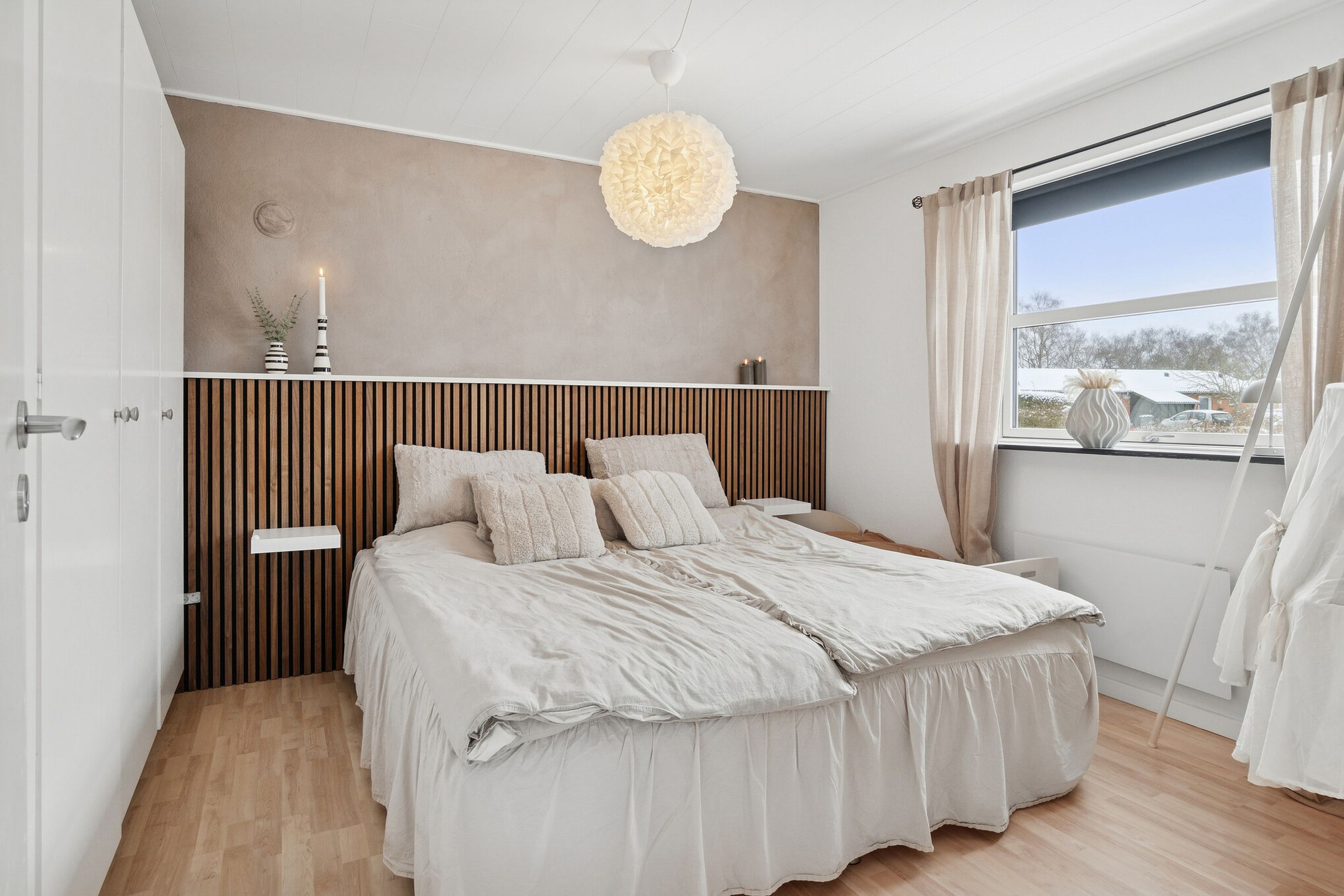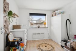 Køkkenet er placeret tæt på stuen, men dog alligevel separat. Her er god plads til både opbevaring og arbejdsgange, og fra køkkenet er der videre adgang til bryggerset med vaskefaciliteter og udgang til haven. Badeværelset ligger midt i boligen, og dertil kommer tre værelser, som kan anvendes fleksibelt som soveværelse, børneværelser eller hjemmekontor. Ejendommen har fået nye vinduer og døre inden for de seneste fem år, hvilket giver både et lavere energiforbrug og mindre vedligeholdelse.