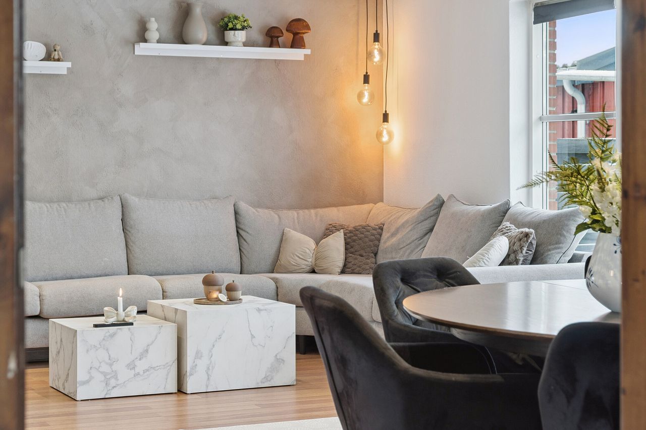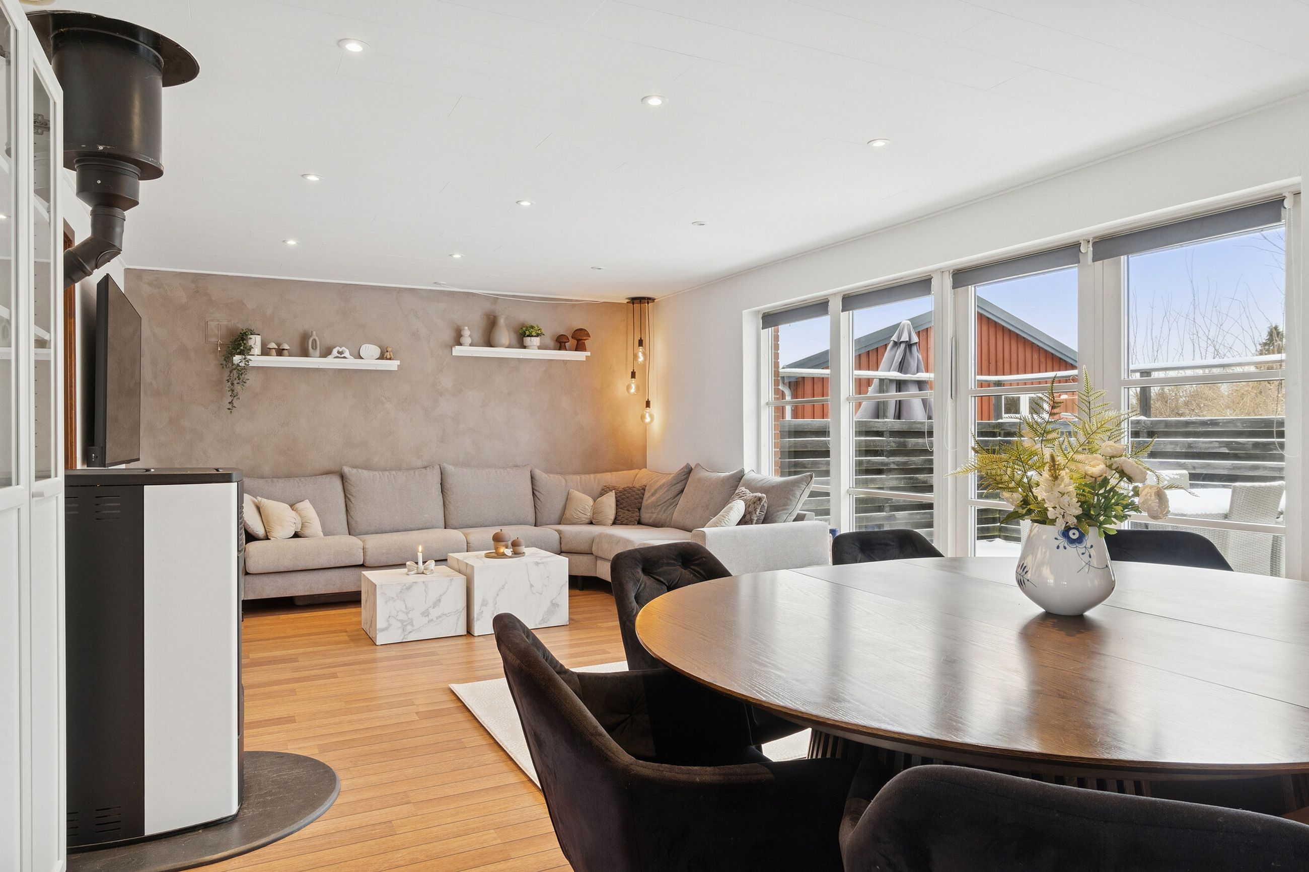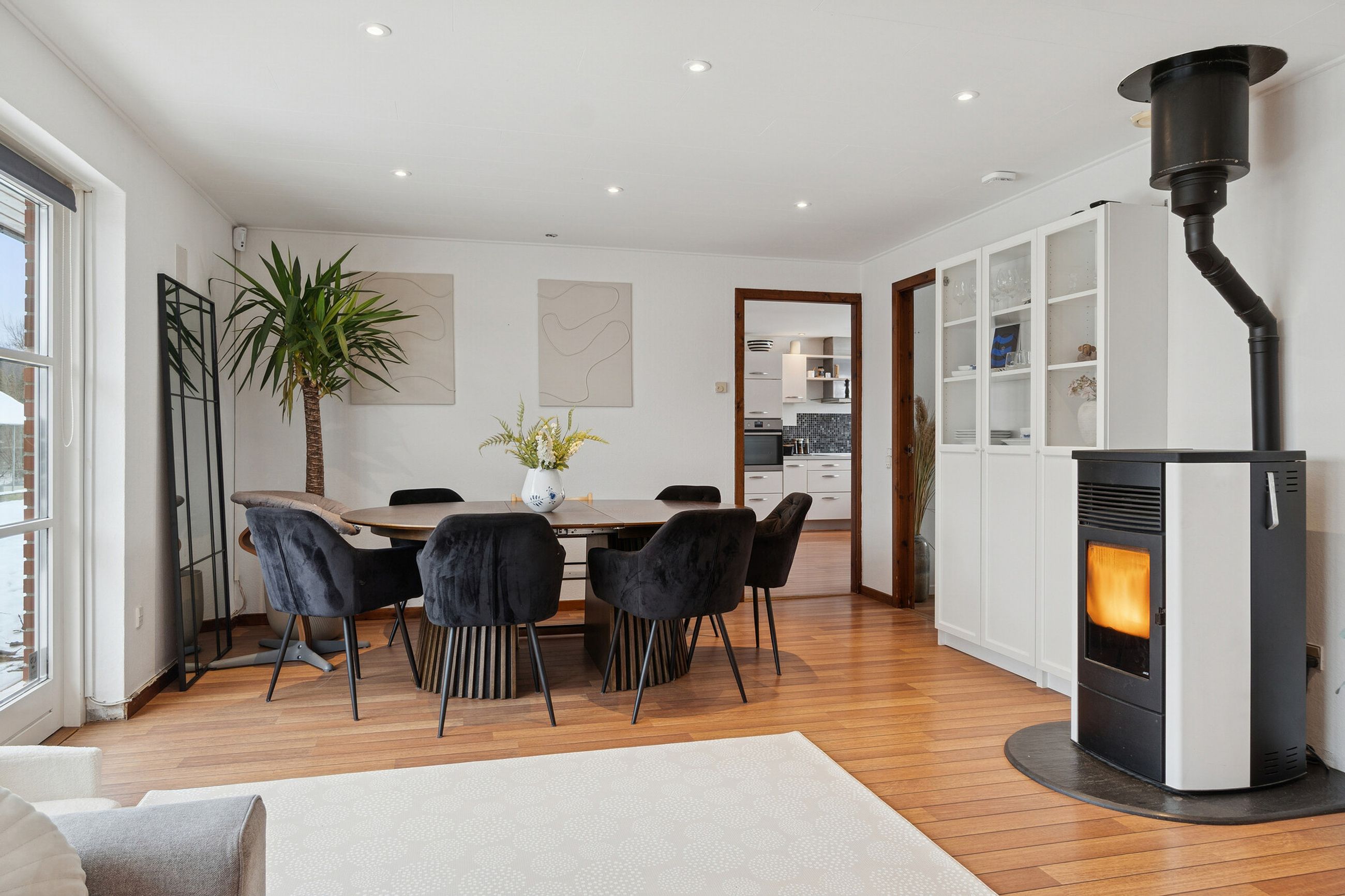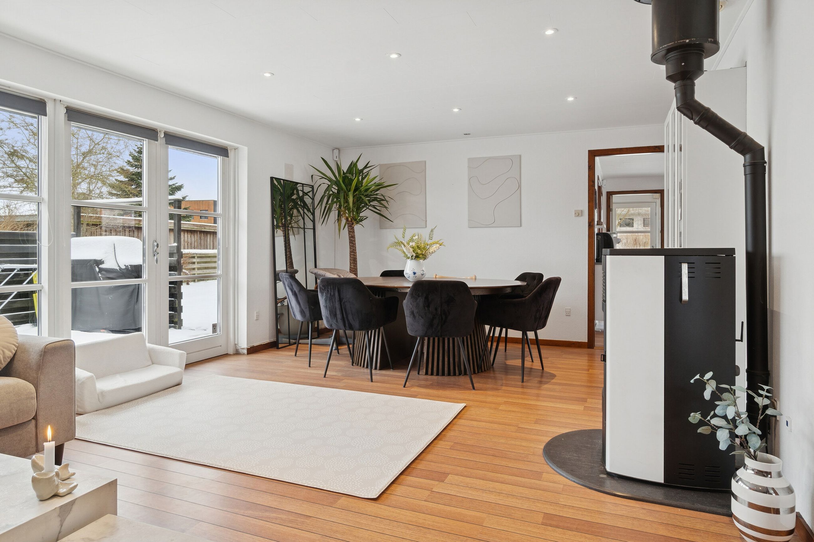 Fra entréen træder man ind i boligens hjerte: den lyse stue. De store vinduespartier sikrer et flot lysindfald og skaber en behagelig atmosfære. Der er direkte udgang til terrassen og stuen er desuden udstyret med en pillebrændeovn, der bidrager til ekstra hygge og varme i de kolde måneder. Takket være dens størrelse er det nemt at indrette med både spisebord og sofagruppe.
