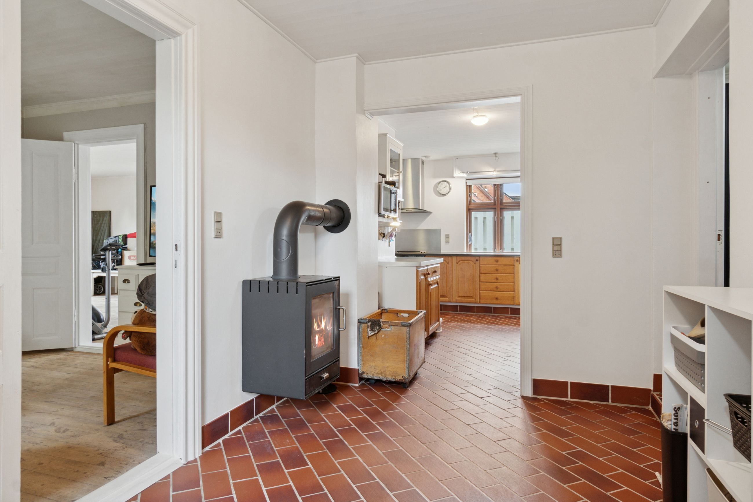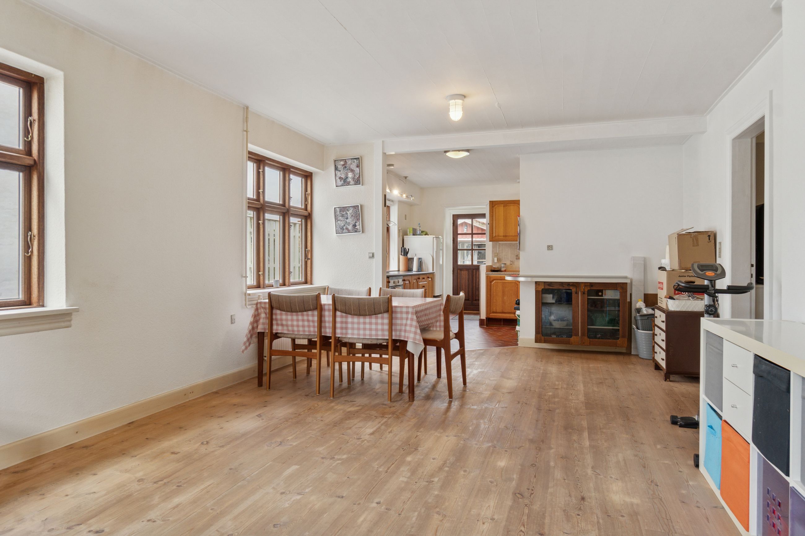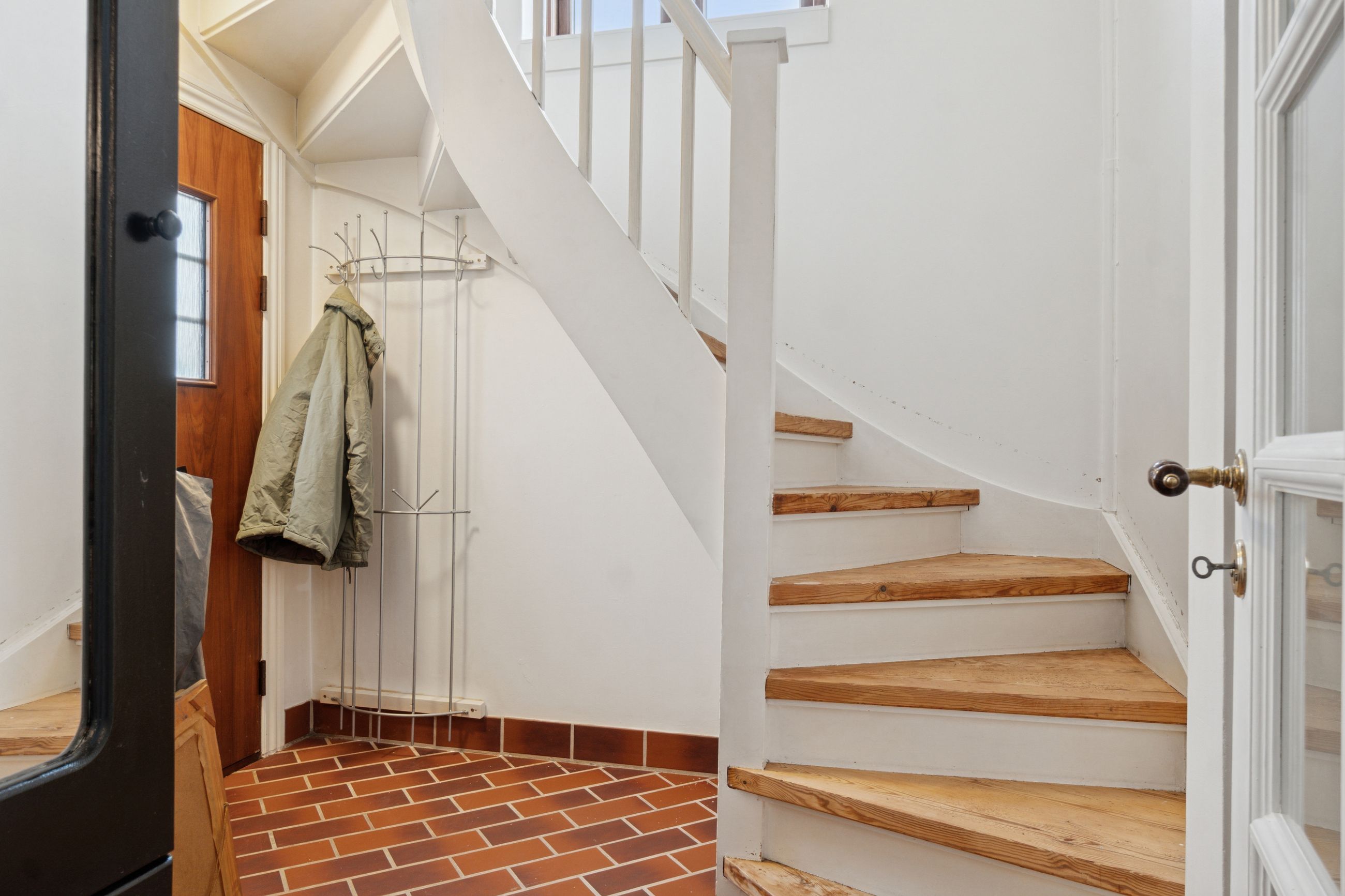 Huset fordeler sine kvadratmeter over to etager. Der er etableret et badeværelse på hver etage, og i stueplan finder I et køkken i åben forbindelse med en af to stuer, et soveværelse og tre indgange. Den ene indgang leder direkte til førstesalen, og hvis I ønsker det, kan I lukke af til stueplanet, så de to etager er helt adskilte.