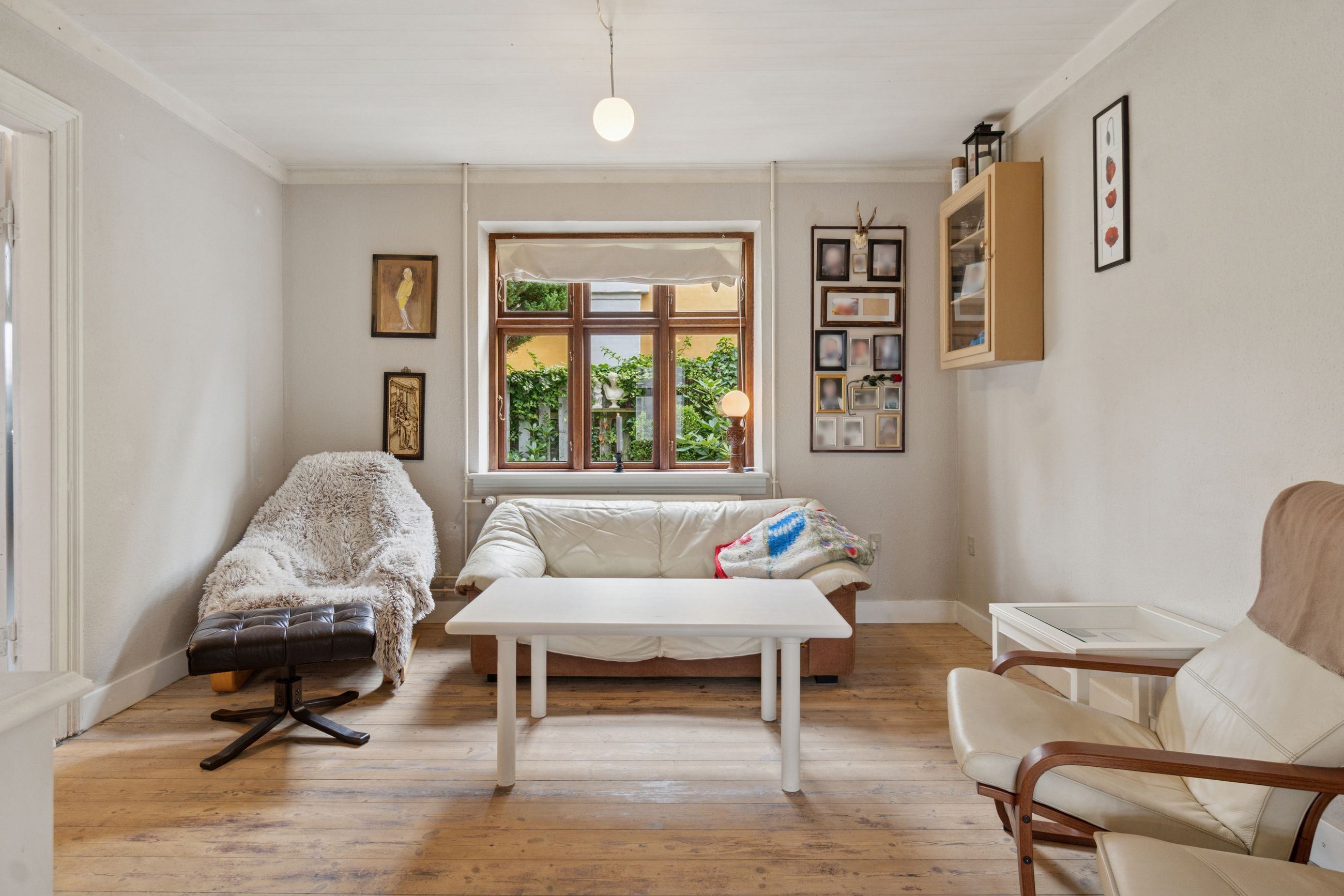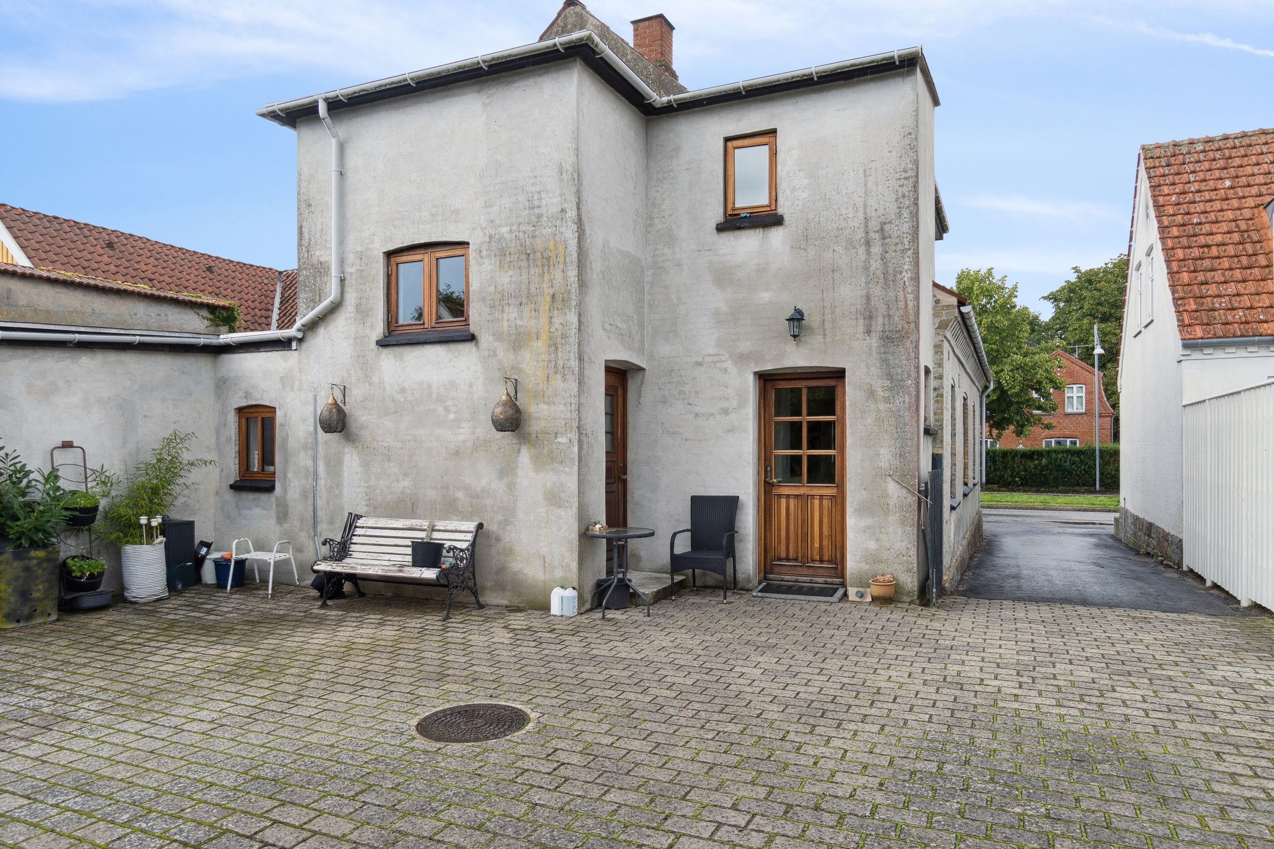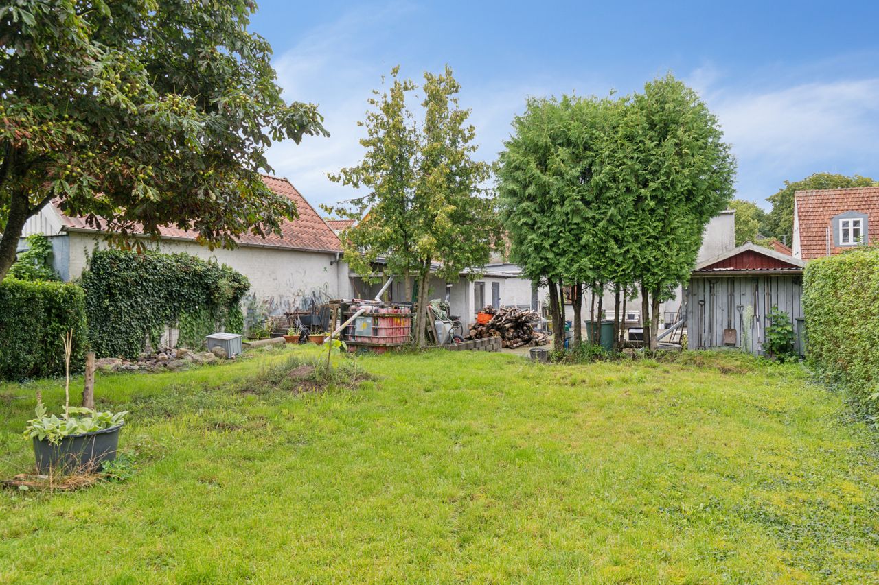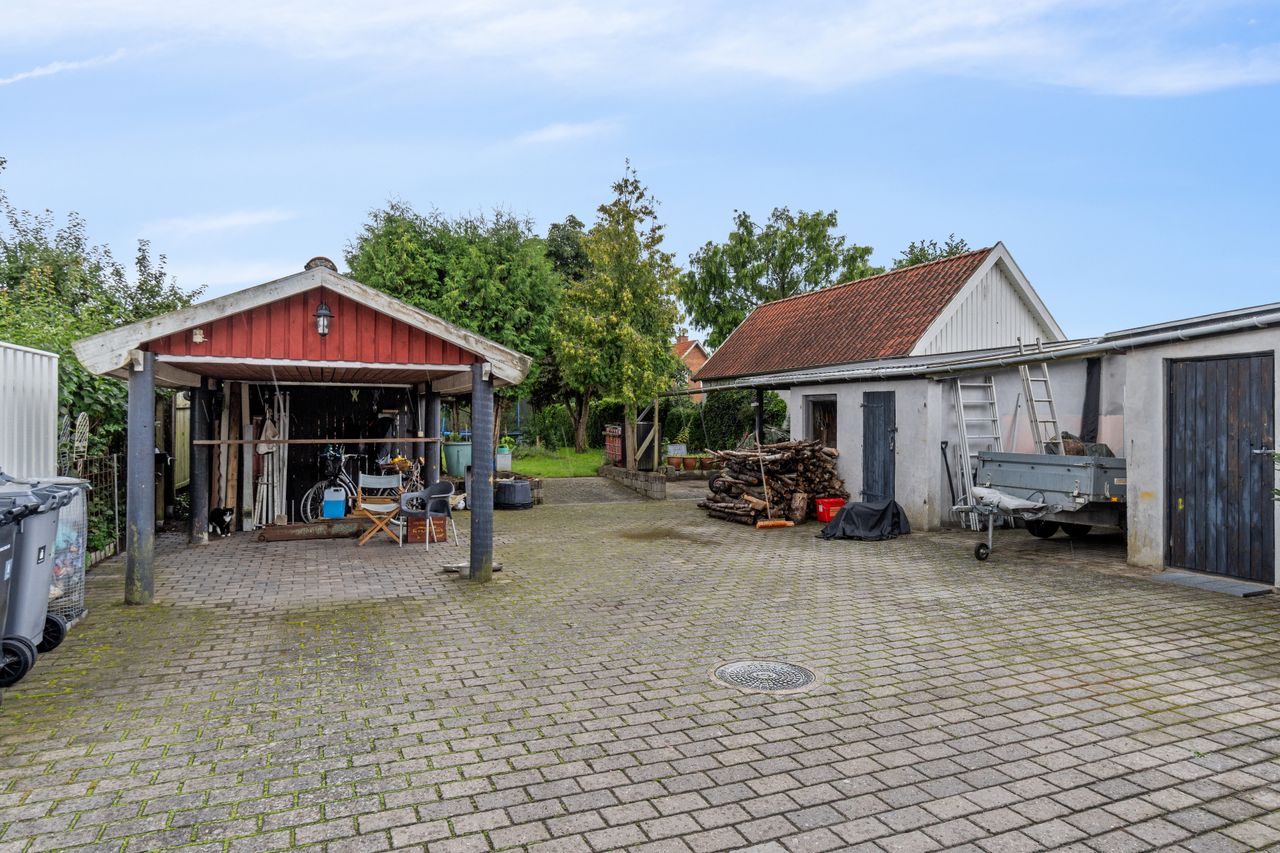 Udenfor kan I glæde jer til at indtage det henrivende gårdhavemiljø, hvor solen skinner mange timer om dagen, og pladsen er god, så I kan have havemøbler og en grill. Flere skure og en carport til opbevaringsløsninger til haveredskaber, en bil, barnevogn og cykler, og endelig er der bagerst på grunden anlagt græsplæne og gamle træer.