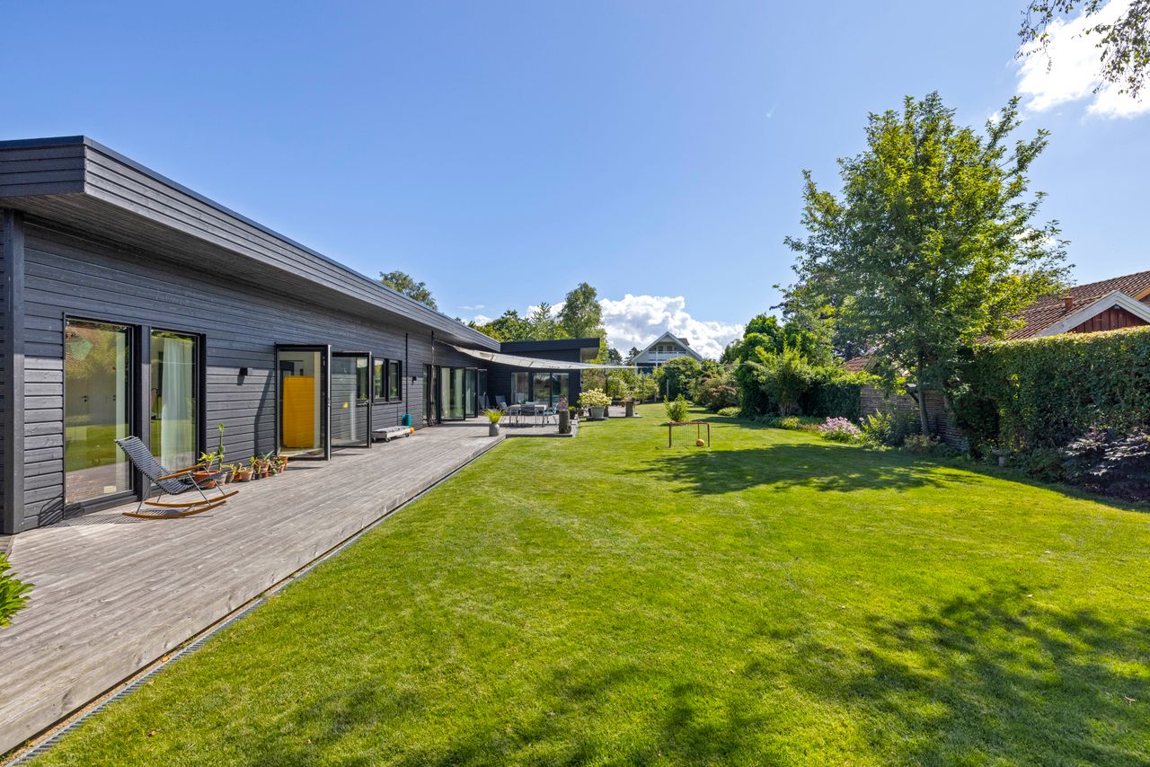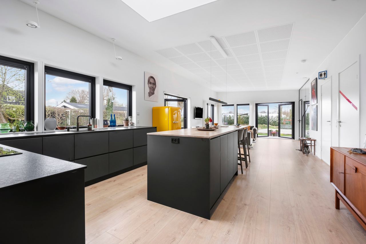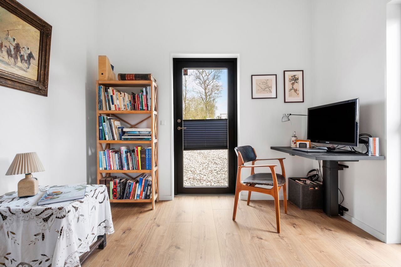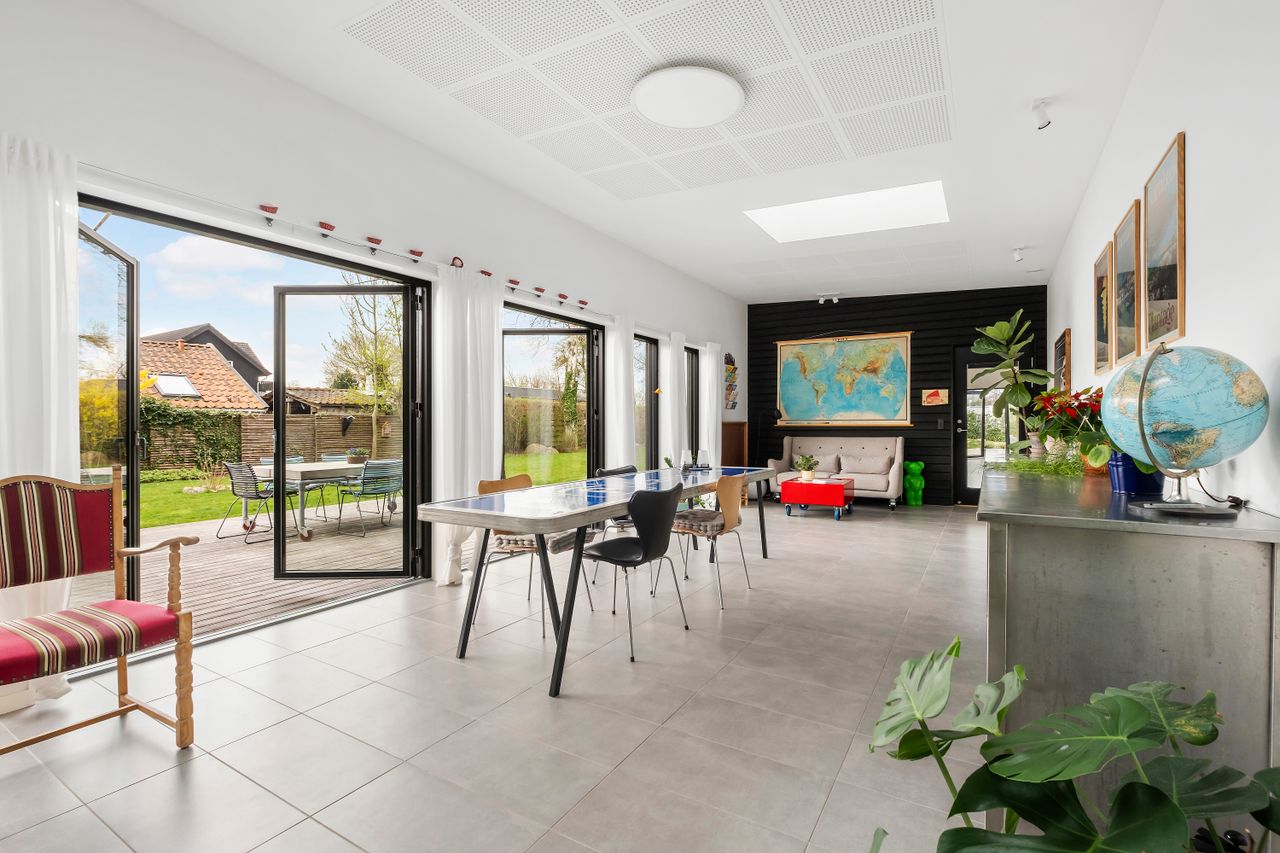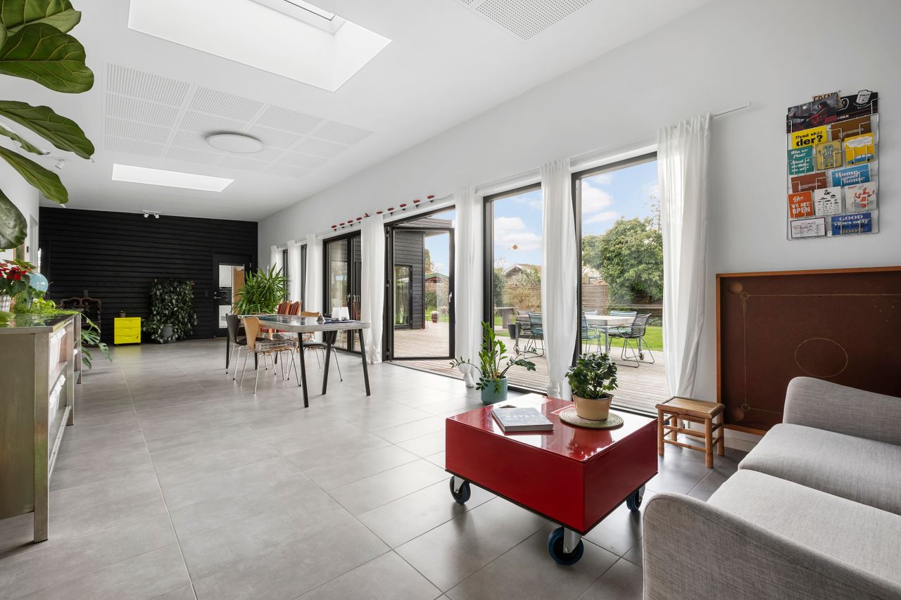 Denne boligdel er designet til at være lys og funktionel – ideel til enlige, par eller familier. Der er 100 m2 til fri indretning og 104 m2 fællesareal. Køkken og stue ligger på tværs af huset med stort tagvindue, der giver gennemlys og god ventilation. Highlights: Morgensol i køkkenet, sol på sydsiden og solnedgang mod vest. Spiseplads til 8 i forlængelse af stuen. To store soveværelser + kontor/værelse med mulighed for udvidelse. Badeværelse med varme og funktionalitet. Højt til loftet og store syd-/vestvendte vinduer. Nem adgang til tre terrasser og egen indgang via kontoret Udsigt gennem haven mod vest.