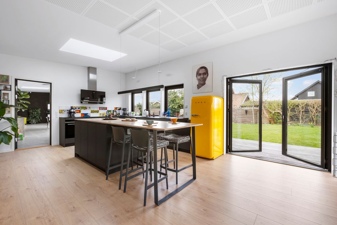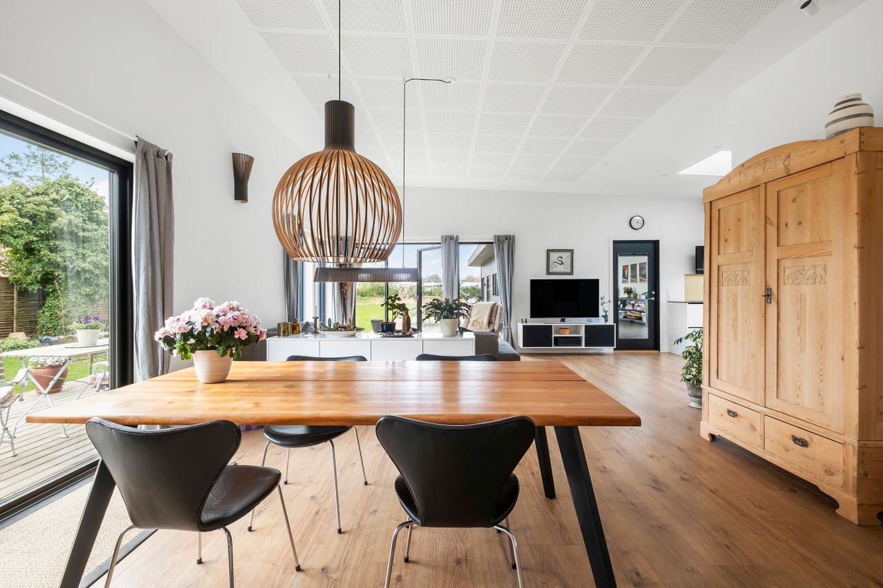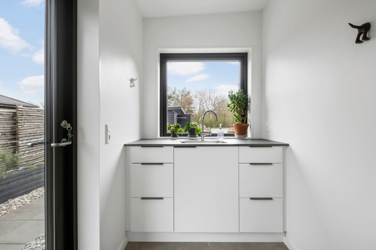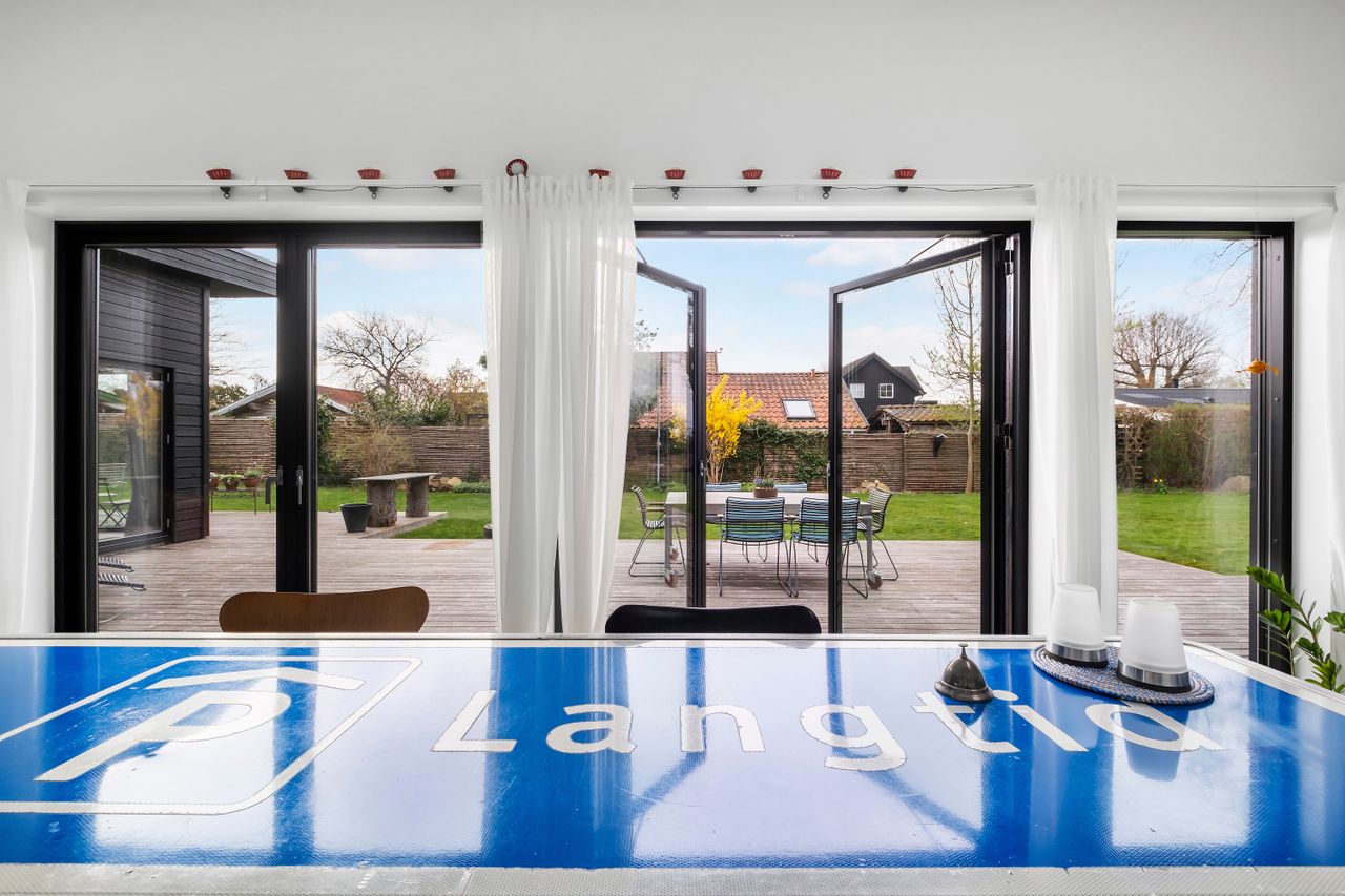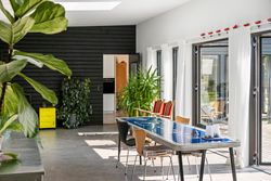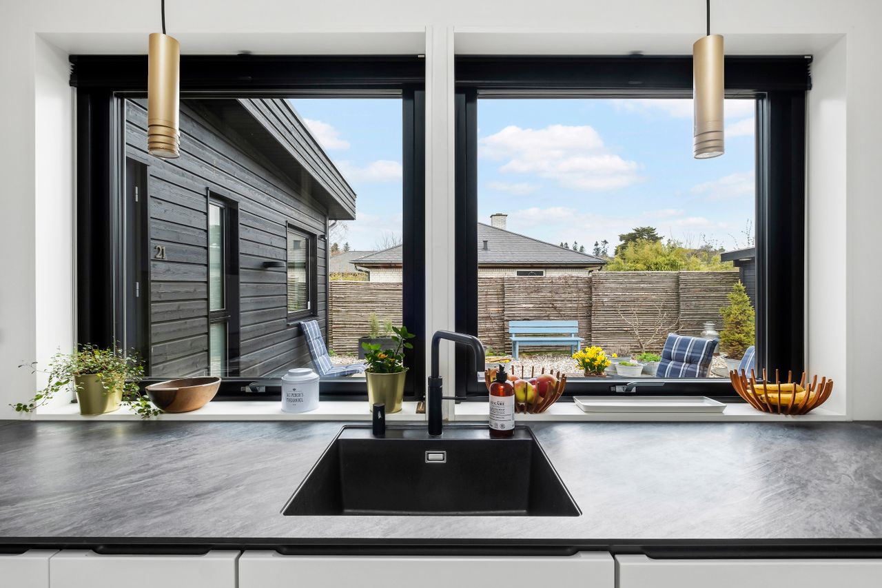 Denne boligdel er designet til at være lys og funktionel – ideel til enlige, par eller familier. Der er 100 m2 til fri indretning og 104 m2 fællesareal. Køkken og stue ligger på tværs af huset med stort tagvindue, der giver gennemlys og god ventilation. Highlights: Morgensol i køkkenet, sol på sydsiden og solnedgang mod vest. Spiseplads til 8 i forlængelse af stuen. To store soveværelser + kontor/værelse med mulighed for udvidelse. Badeværelse med varme og funktionalitet. Højt til loftet og store syd-/vestvendte vinduer. Nem adgang til tre terrasser og egen indgang via kontoret Udsigt gennem haven mod vest.