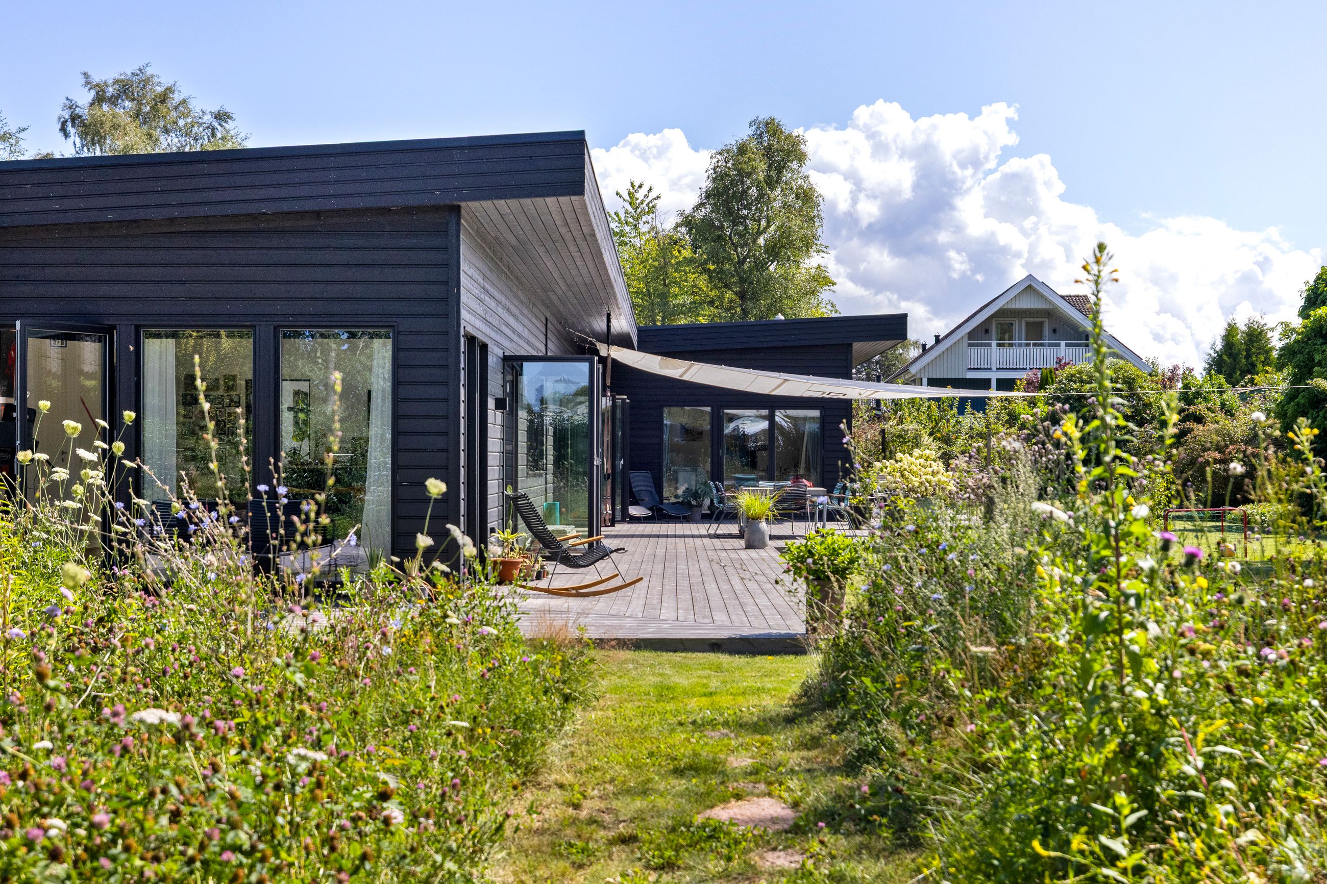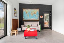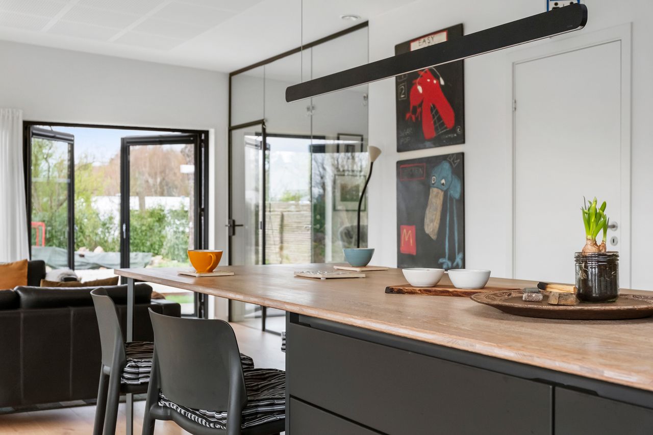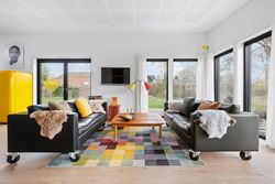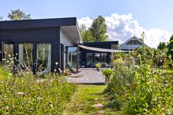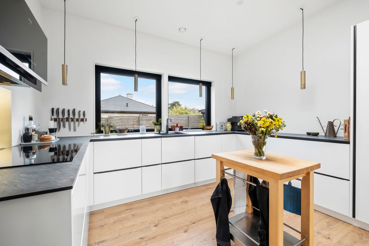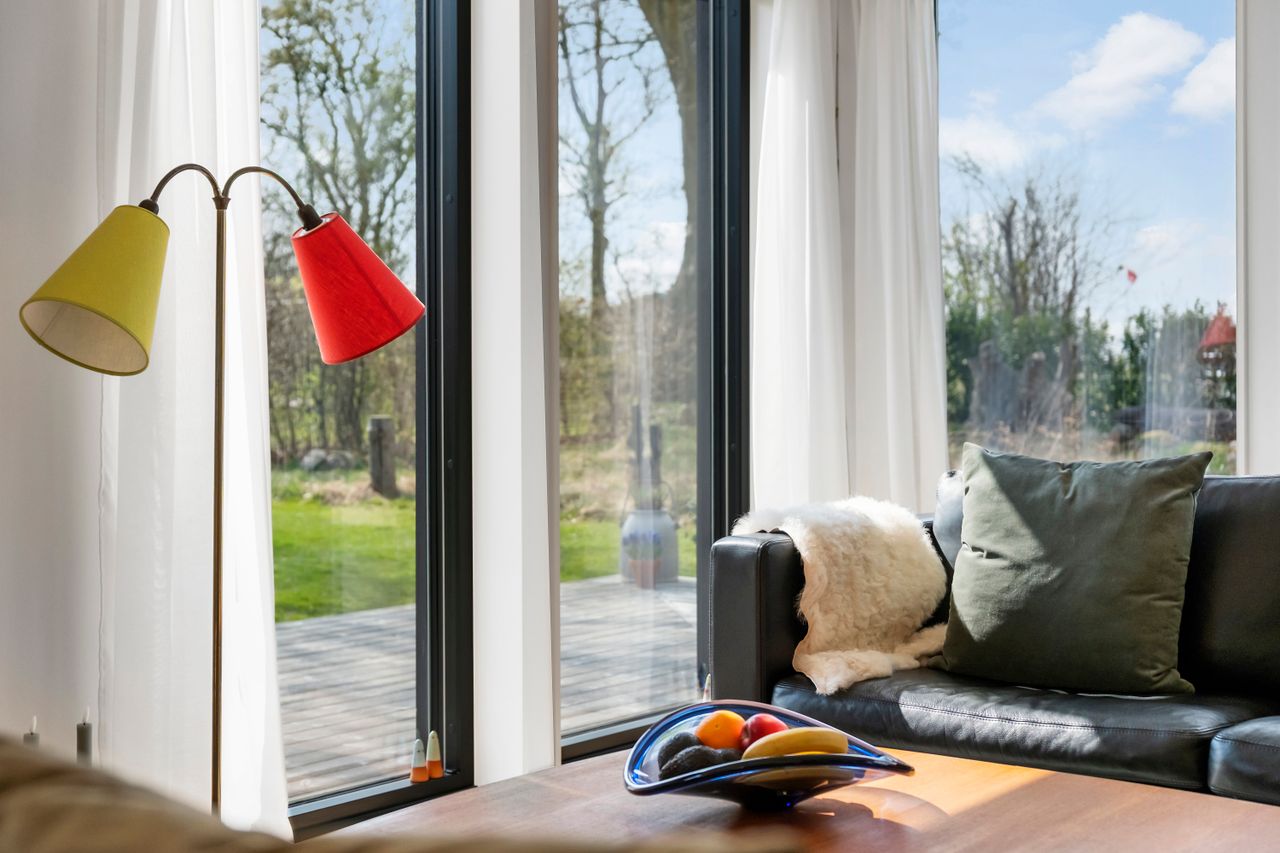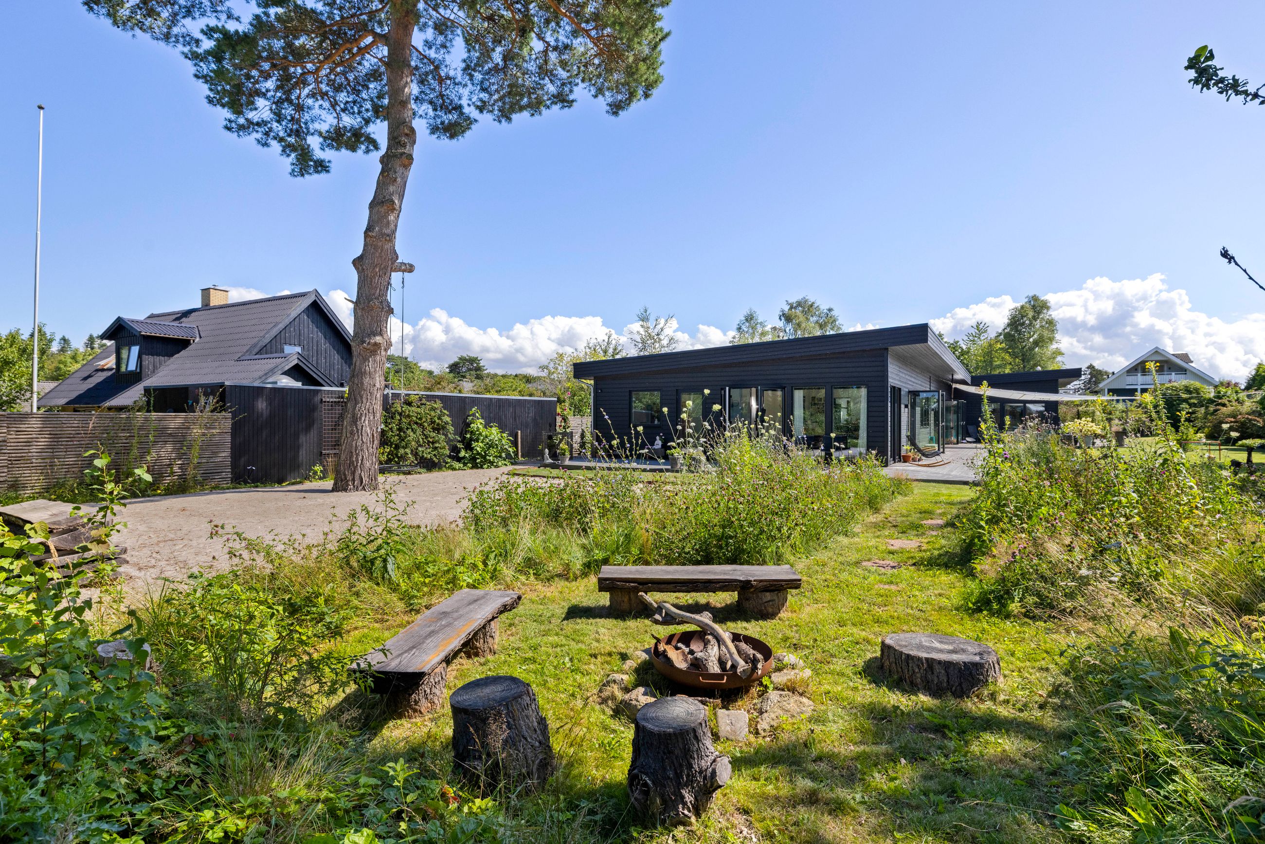 Denne boligdel er designet til at være lys og funktionel – ideel til enlige, par eller familier. Der er 100 m2 til fri indretning og 104 m2 fællesareal. Køkken og stue ligger på tværs af huset med stort tagvindue, der giver gennemlys og god ventilation. Highlights: Morgensol i køkkenet, sol på sydsiden og solnedgang mod vest. Spiseplads til 8 i forlængelse af stuen. To store soveværelser + kontor/værelse med mulighed for udvidelse. Badeværelse med varme og funktionalitet. Højt til loftet og store syd-/vestvendte vinduer. Nem adgang til tre terrasser og egen indgang via kontoret Udsigt gennem haven mod vest.