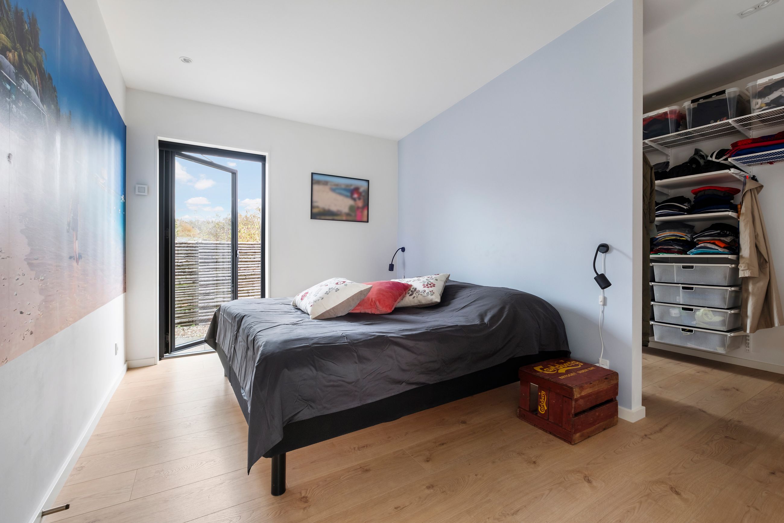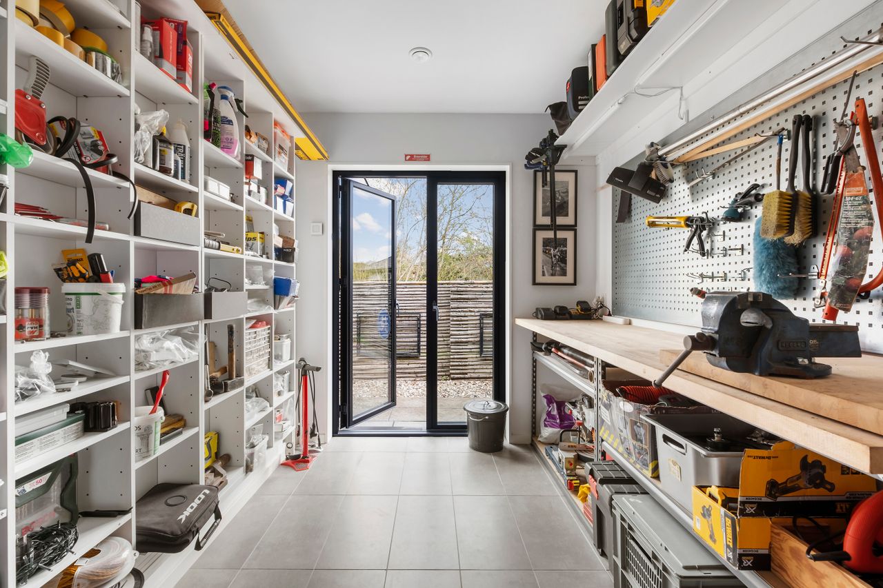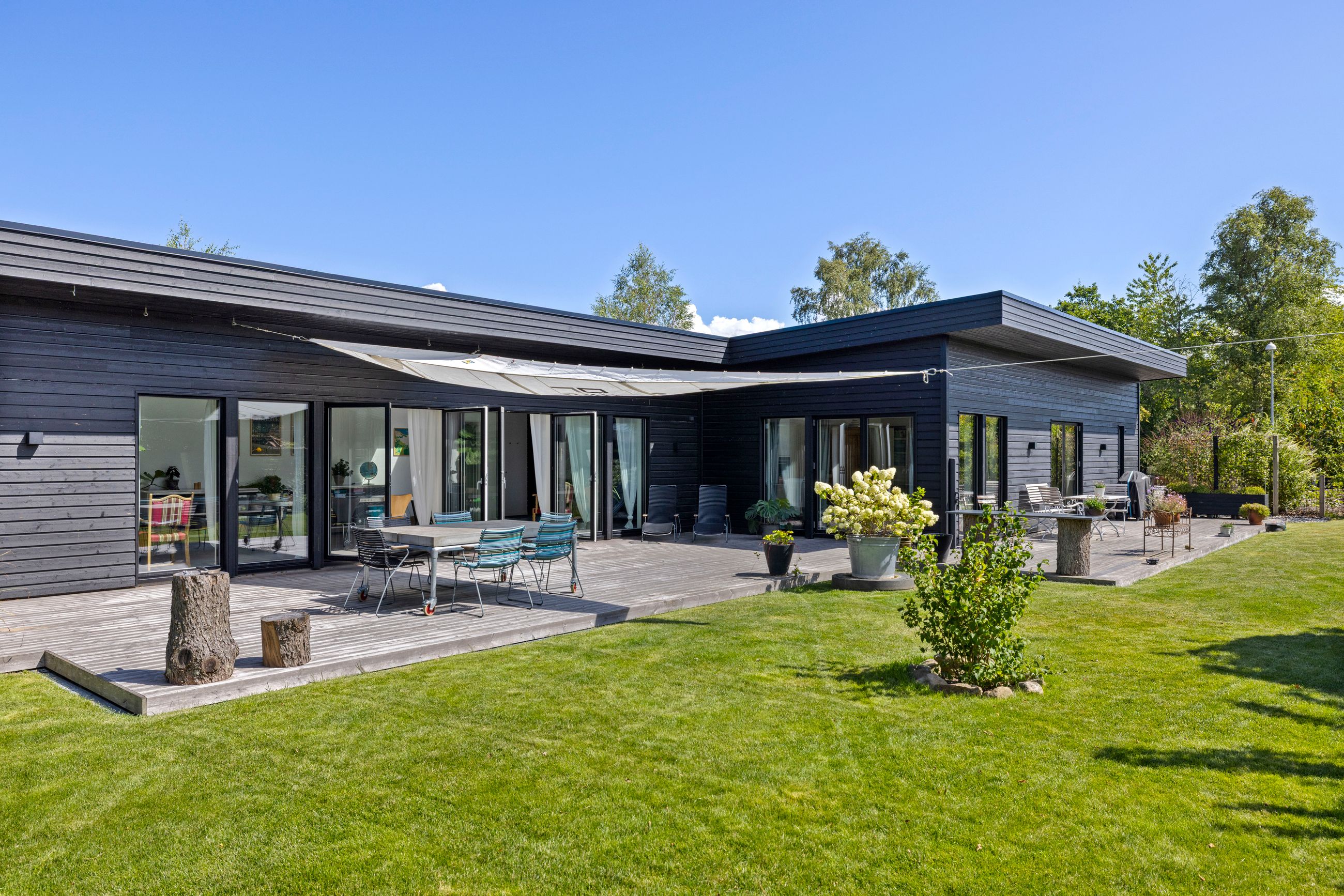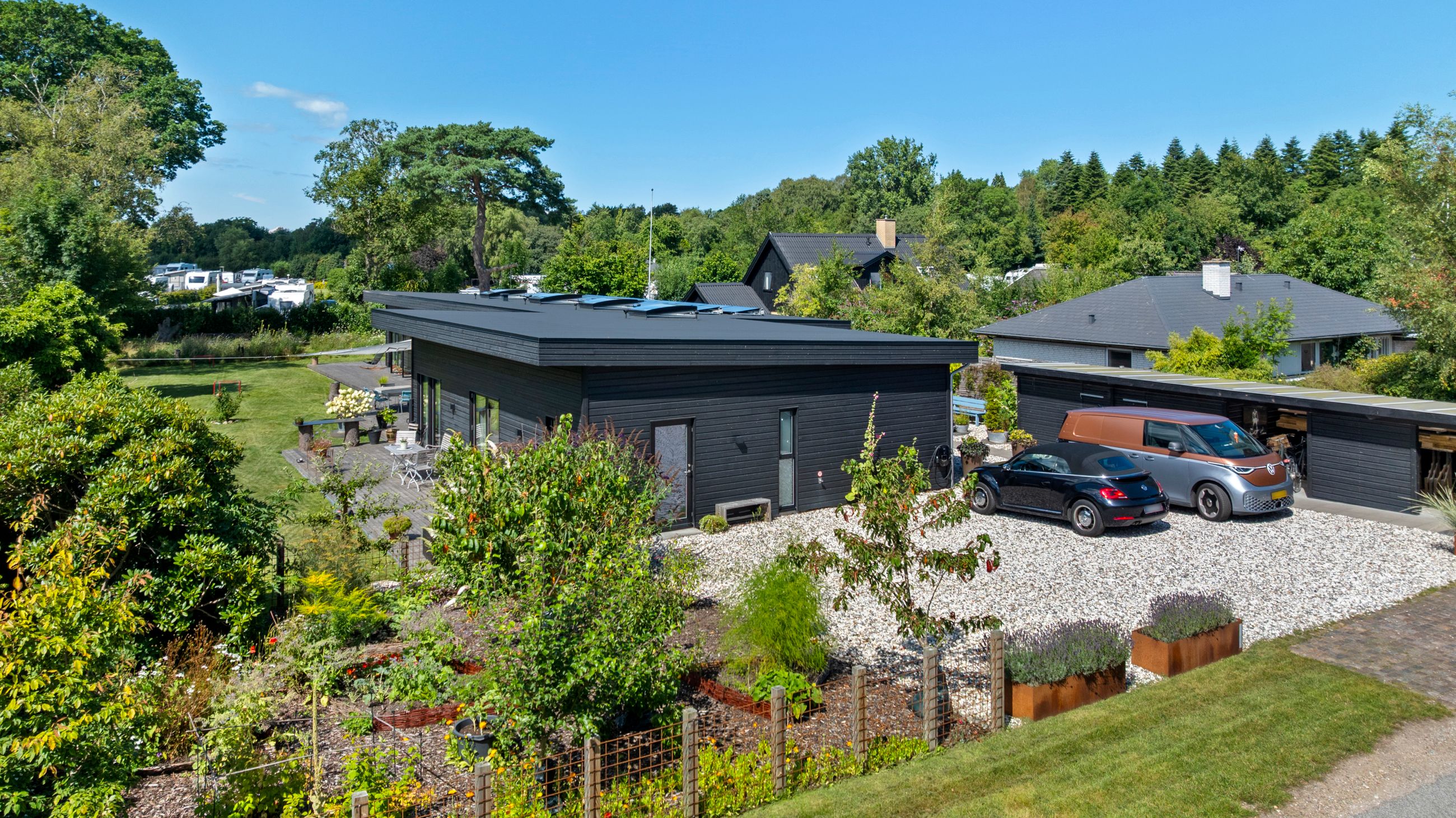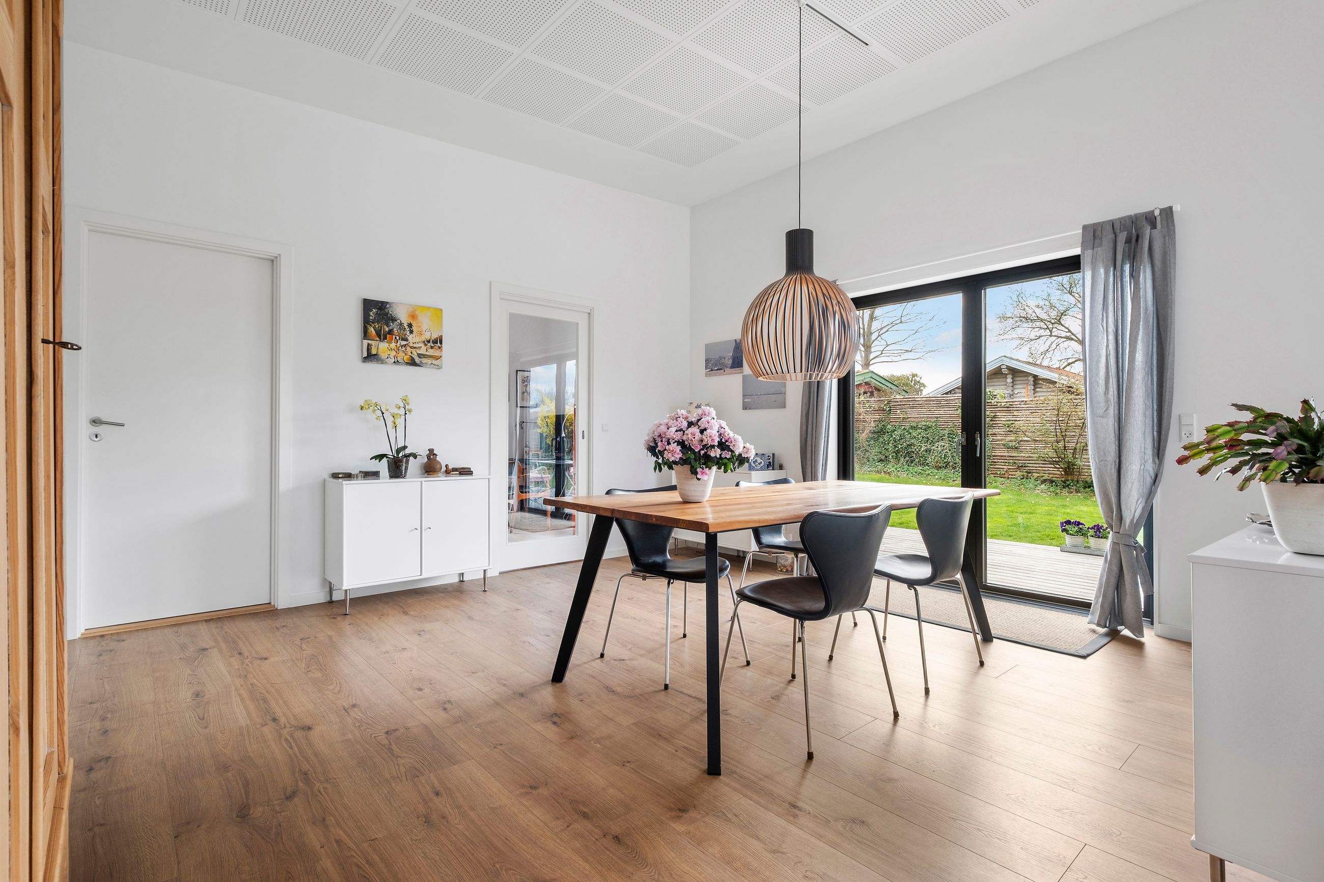 Denne boligdel er designet til at være lys og funktionel – ideel til enlige, par eller familier. Der er 100 m2 til fri indretning og 104 m2 fællesareal. Køkken og stue ligger på tværs af huset med stort tagvindue, der giver gennemlys og god ventilation. Highlights: Morgensol i køkkenet, sol på sydsiden og solnedgang mod vest. Spiseplads til 8 i forlængelse af stuen. To store soveværelser + kontor/værelse med mulighed for udvidelse. Badeværelse med varme og funktionalitet. Højt til loftet og store syd-/vestvendte vinduer. Nem adgang til tre terrasser og egen indgang via kontoret Udsigt gennem haven mod vest.