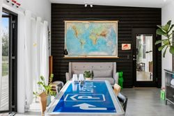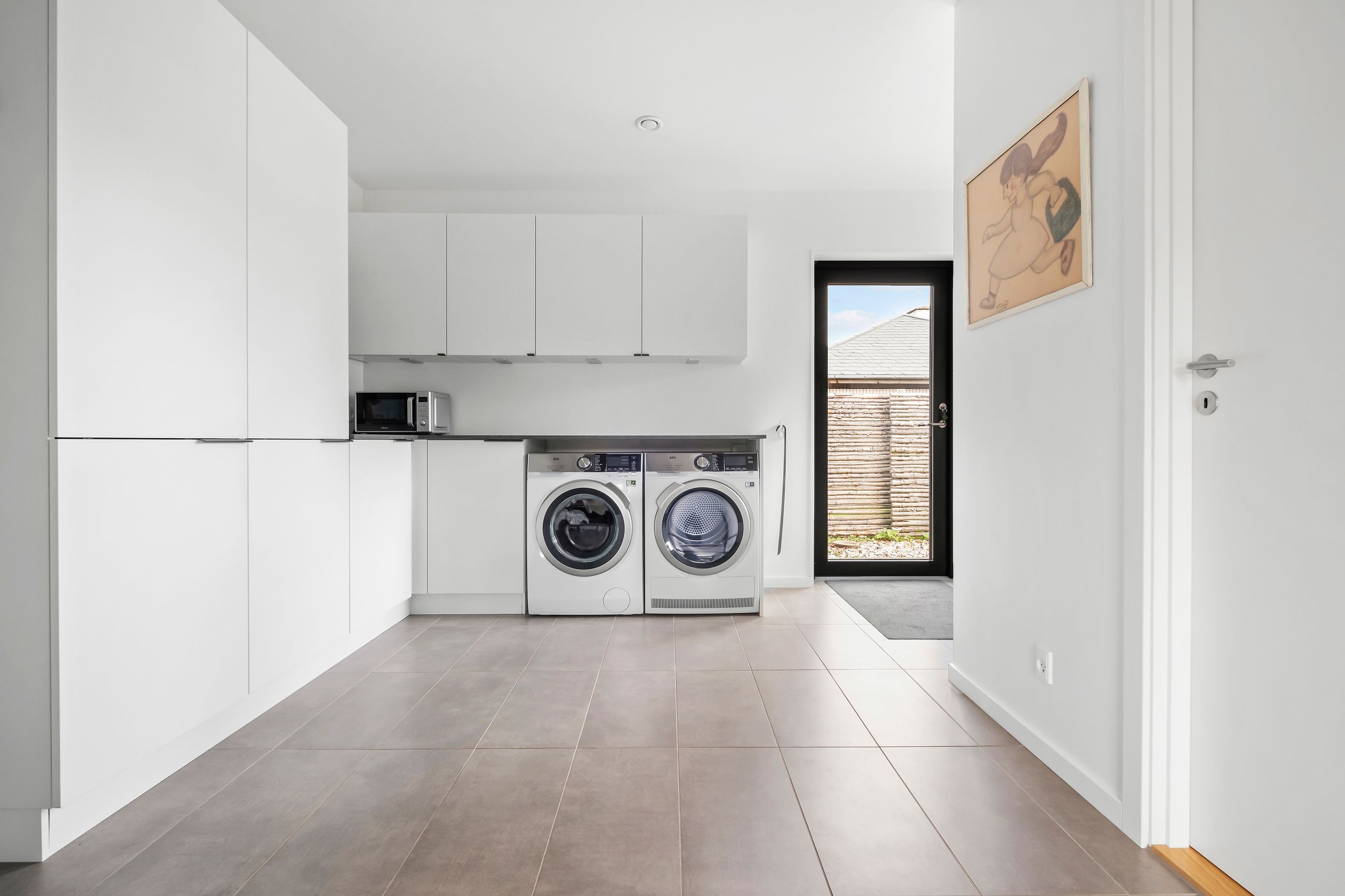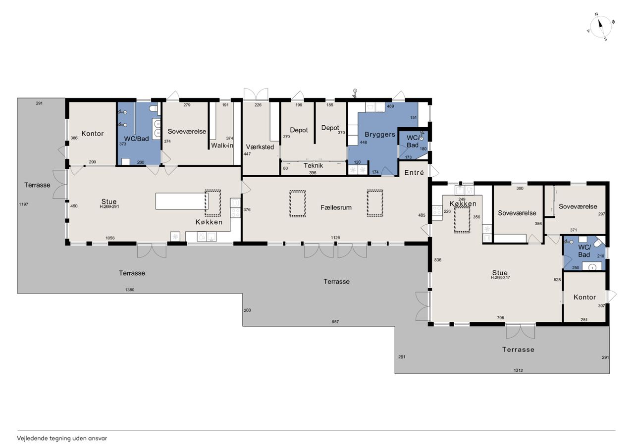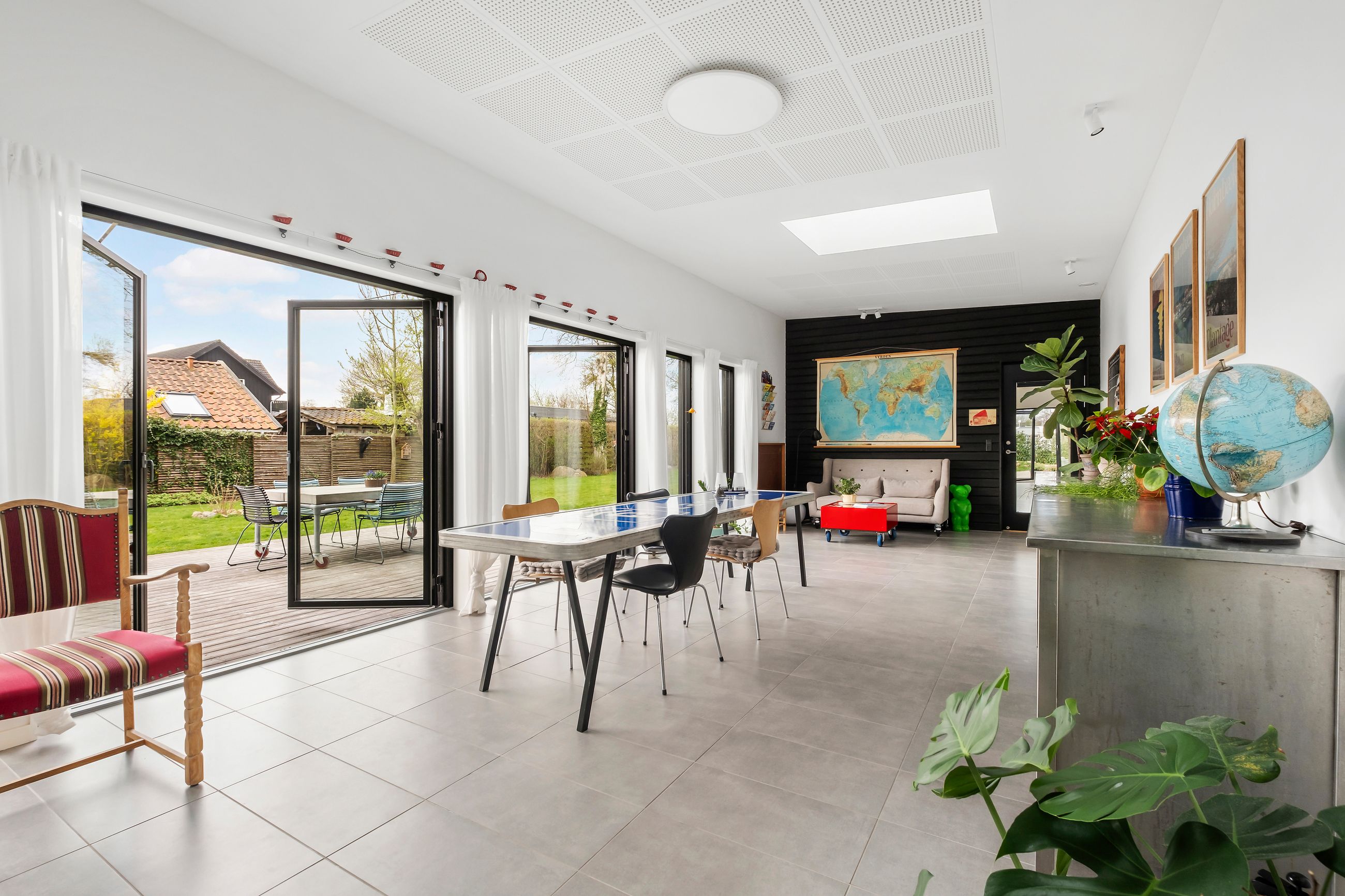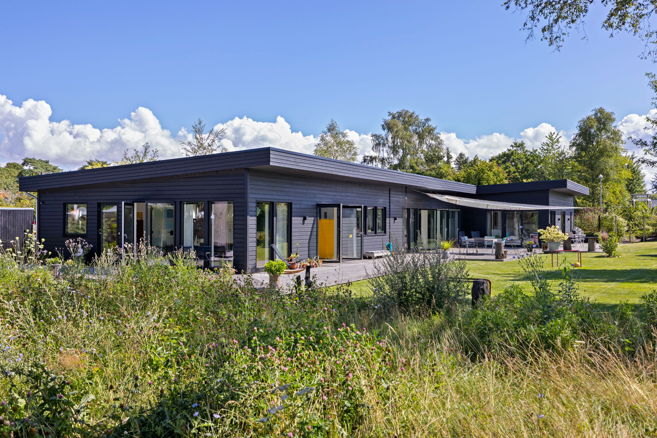 Det fælles areal rummer alt det, der ikke behøver være privat: vaskeri, depot, værksted, ekstra bad/toilet, teknikrum og stort multirum med mulighed for fællesspisning plads til op til 40 personer. Highlights: Udendørsbruser under åben himmel. Depot og værksted giver praktisk opbevaring. Stor fællesterrasse med fire terrassedøre. Hyggekrog under verdenskortet i fællesrummet. Køkkenhave som samtalestarter. Sansegyngen og sandkassen under fyrretræet