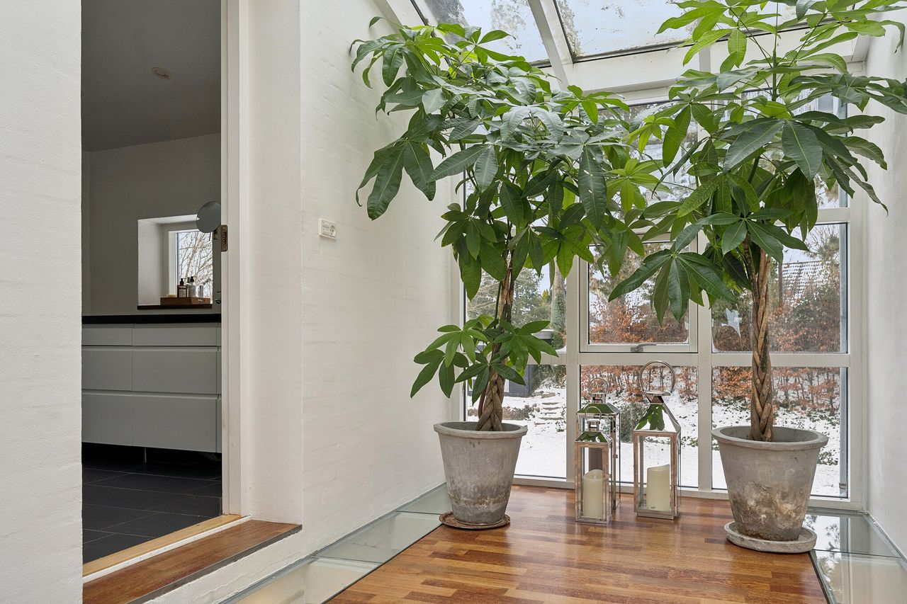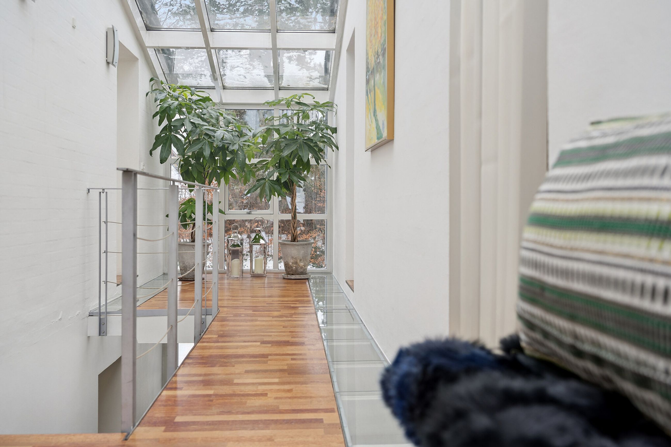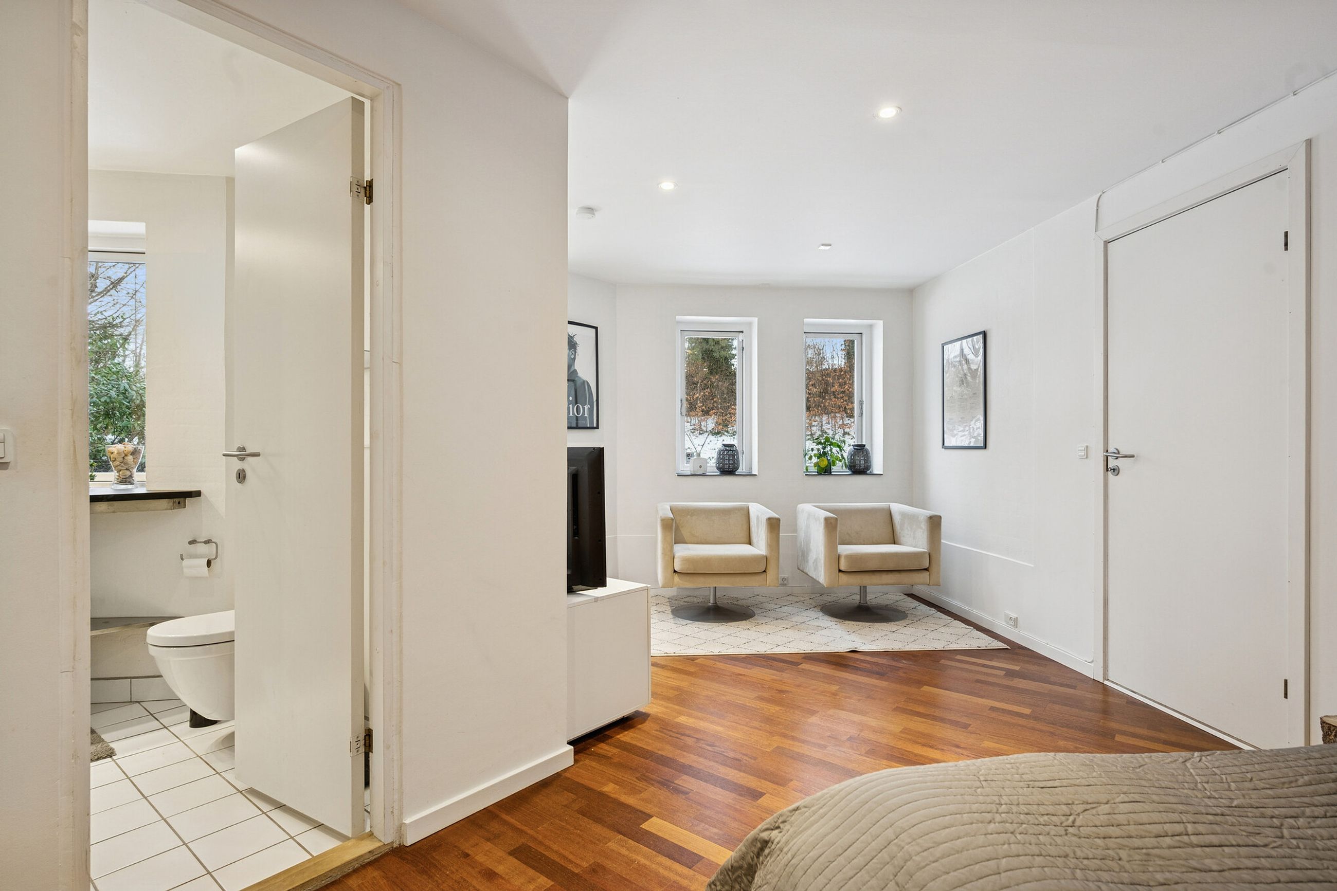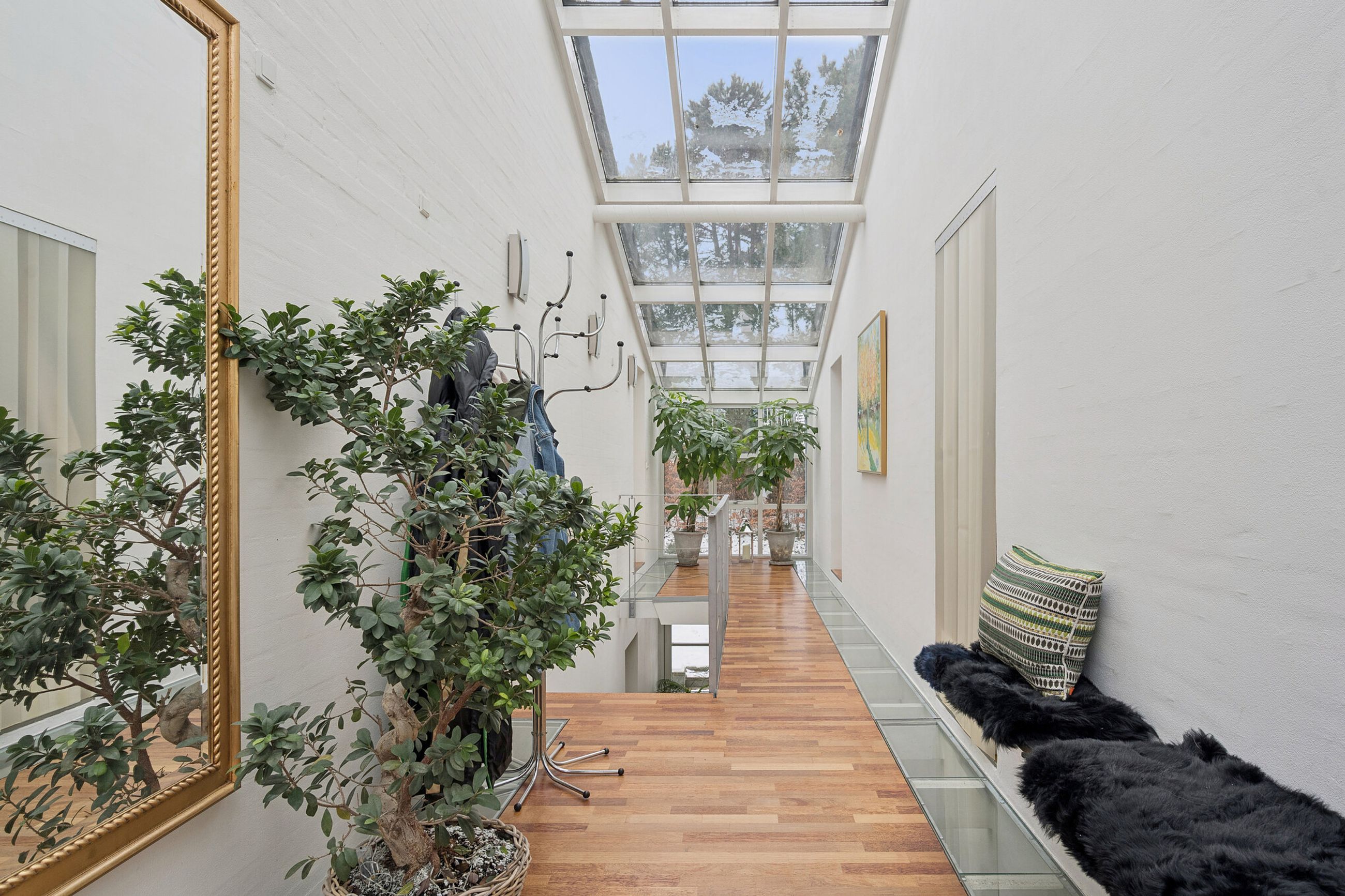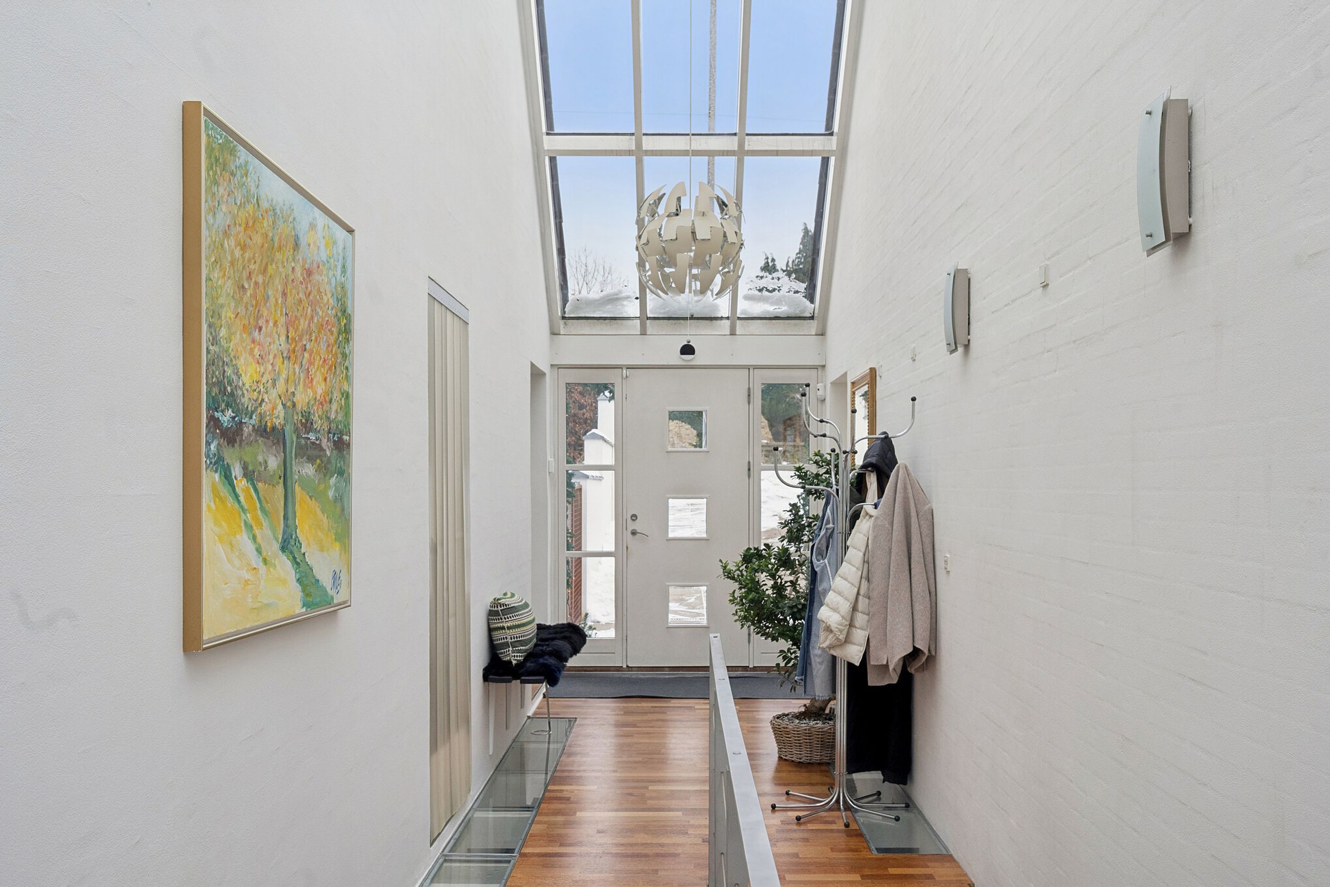 Indeholder: Indgang til den store brede mellemgang, med ovenlys og fordeling til ejendommens mange afdelinger og rum. Indgang til stort køkken/alrum, ligeledes med ovenlys g udgang til terrasseområdet. Her er sat en væg op, som kan tages ned igen, så der er kommet en afdeling med to værelser en-suite med ovenlys. På den anden side af gangen stort badeværelse med ovenlys. Der ud over stor indbygget garage på 45 kvm og stort disponibelt rum.