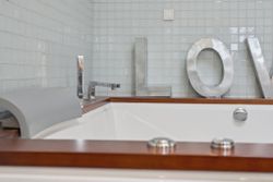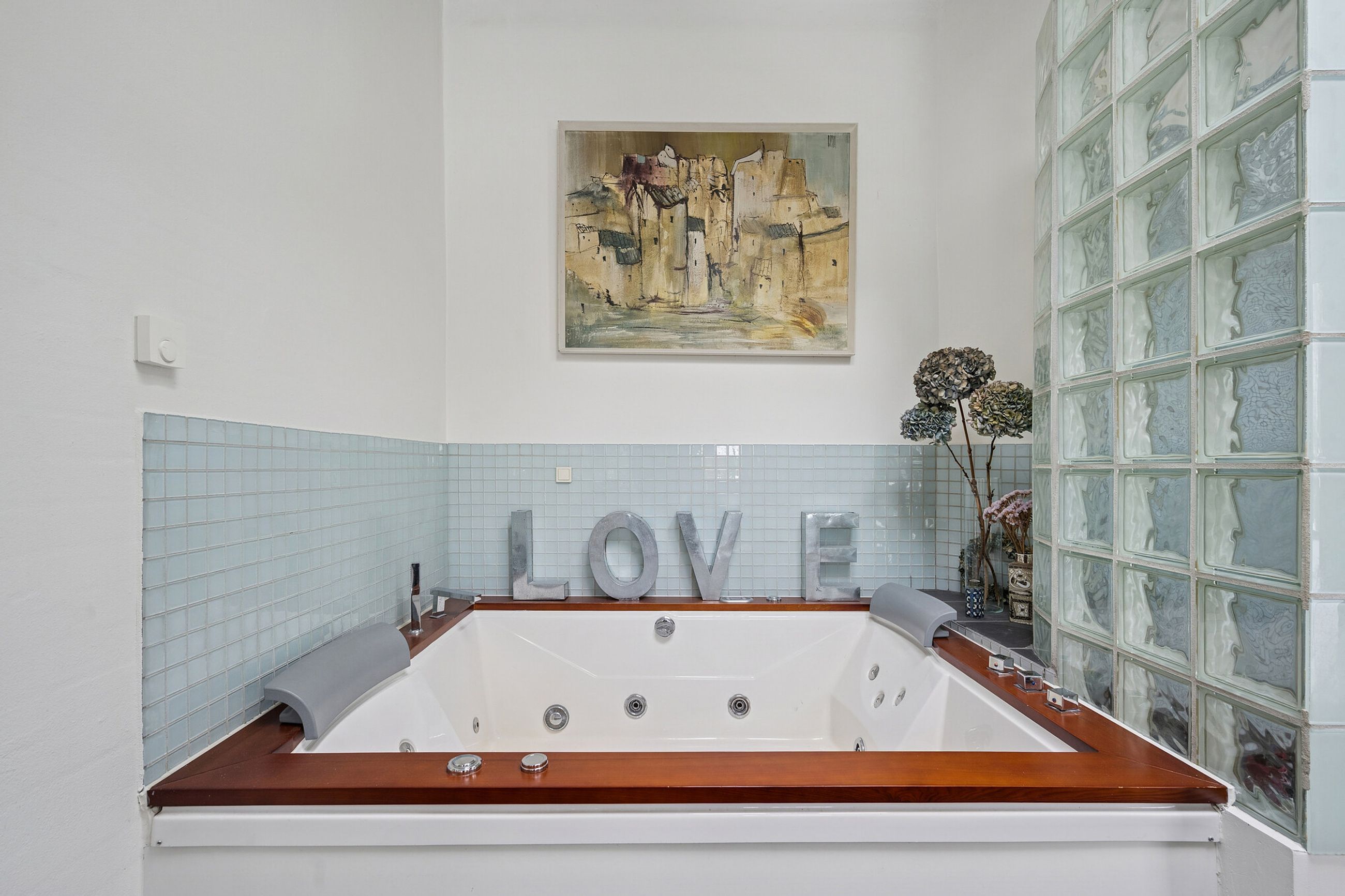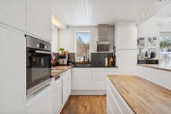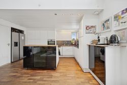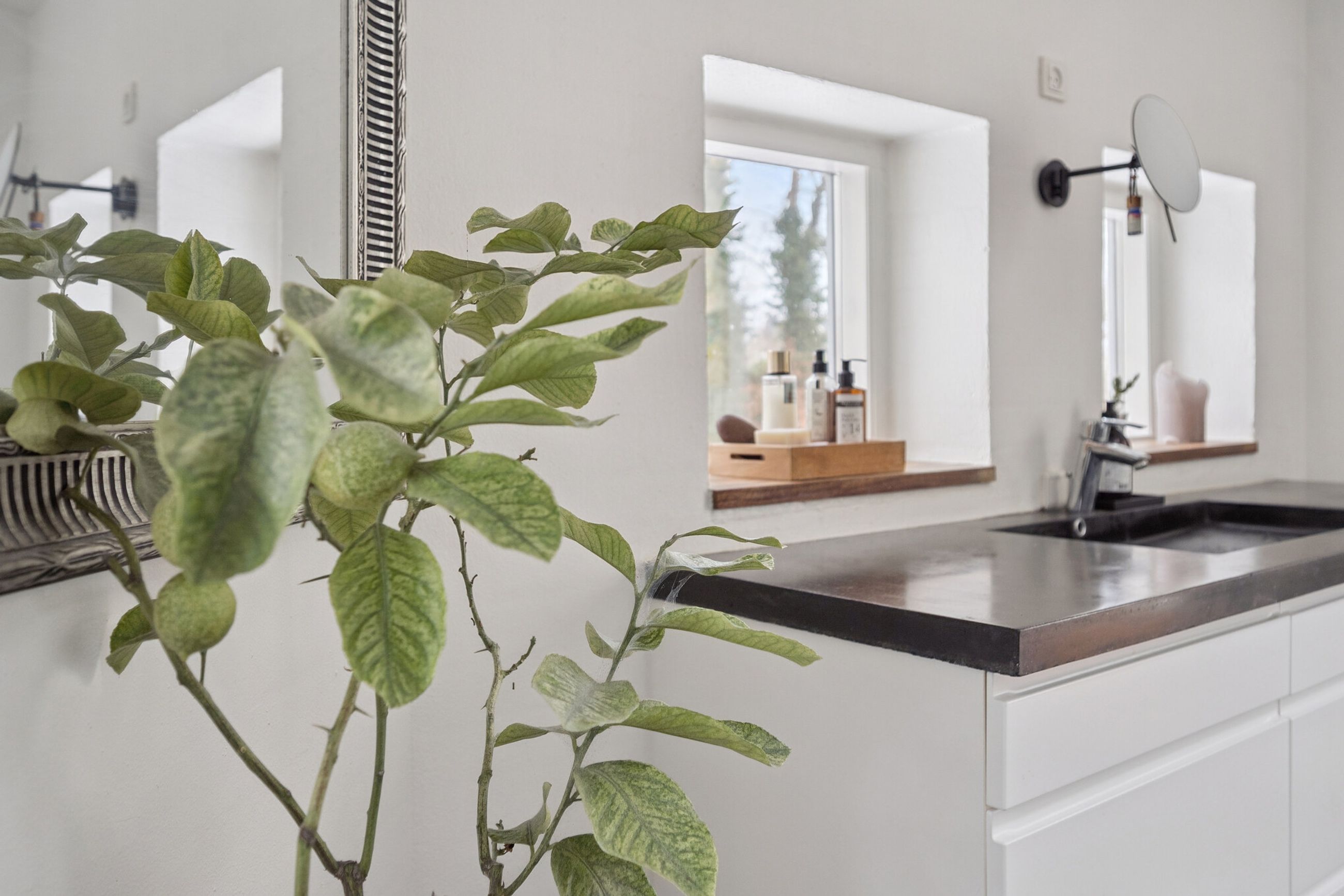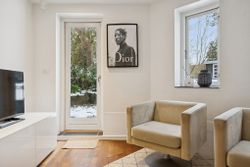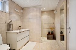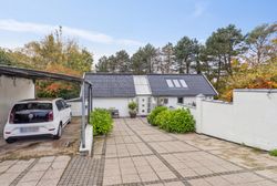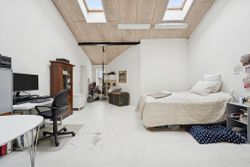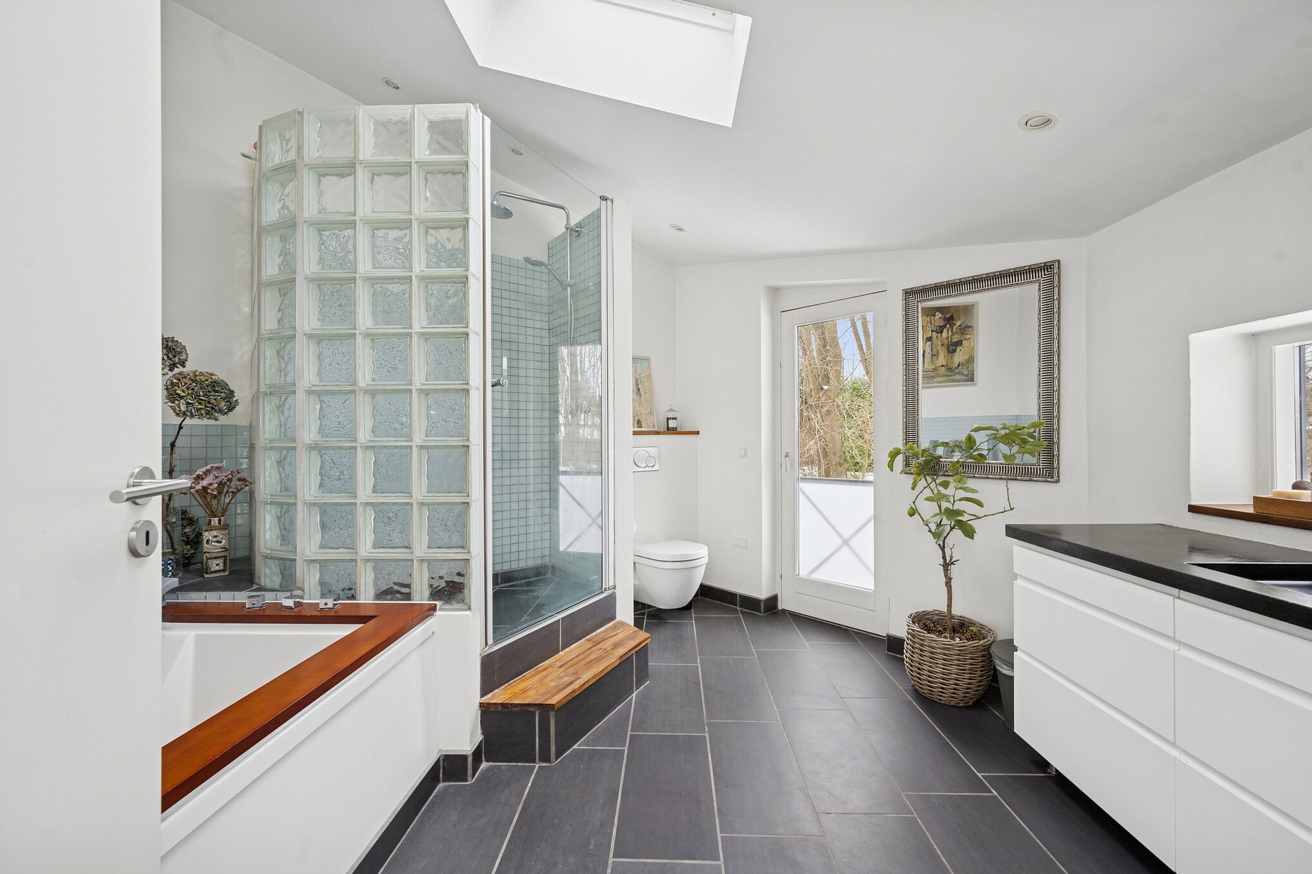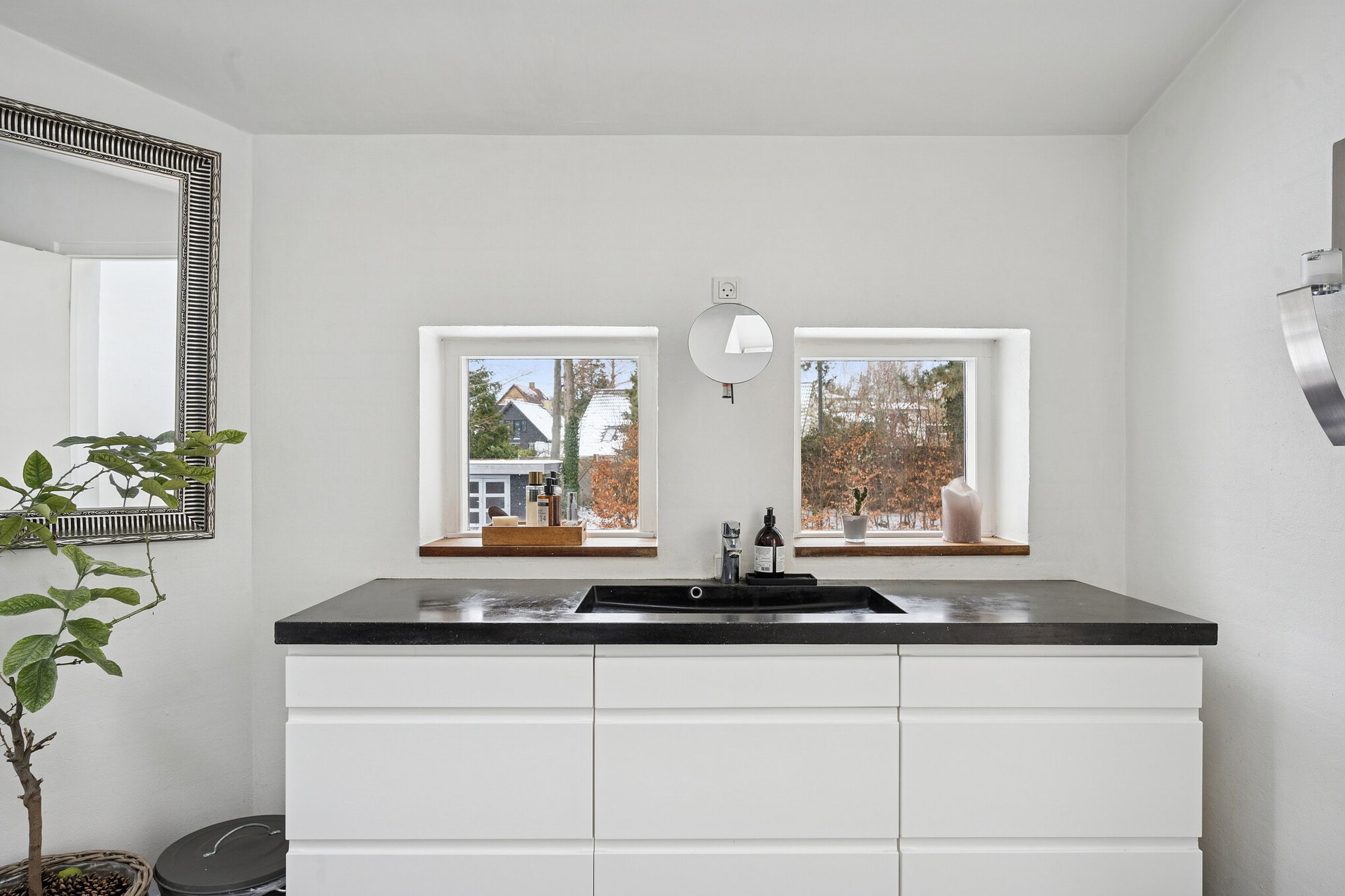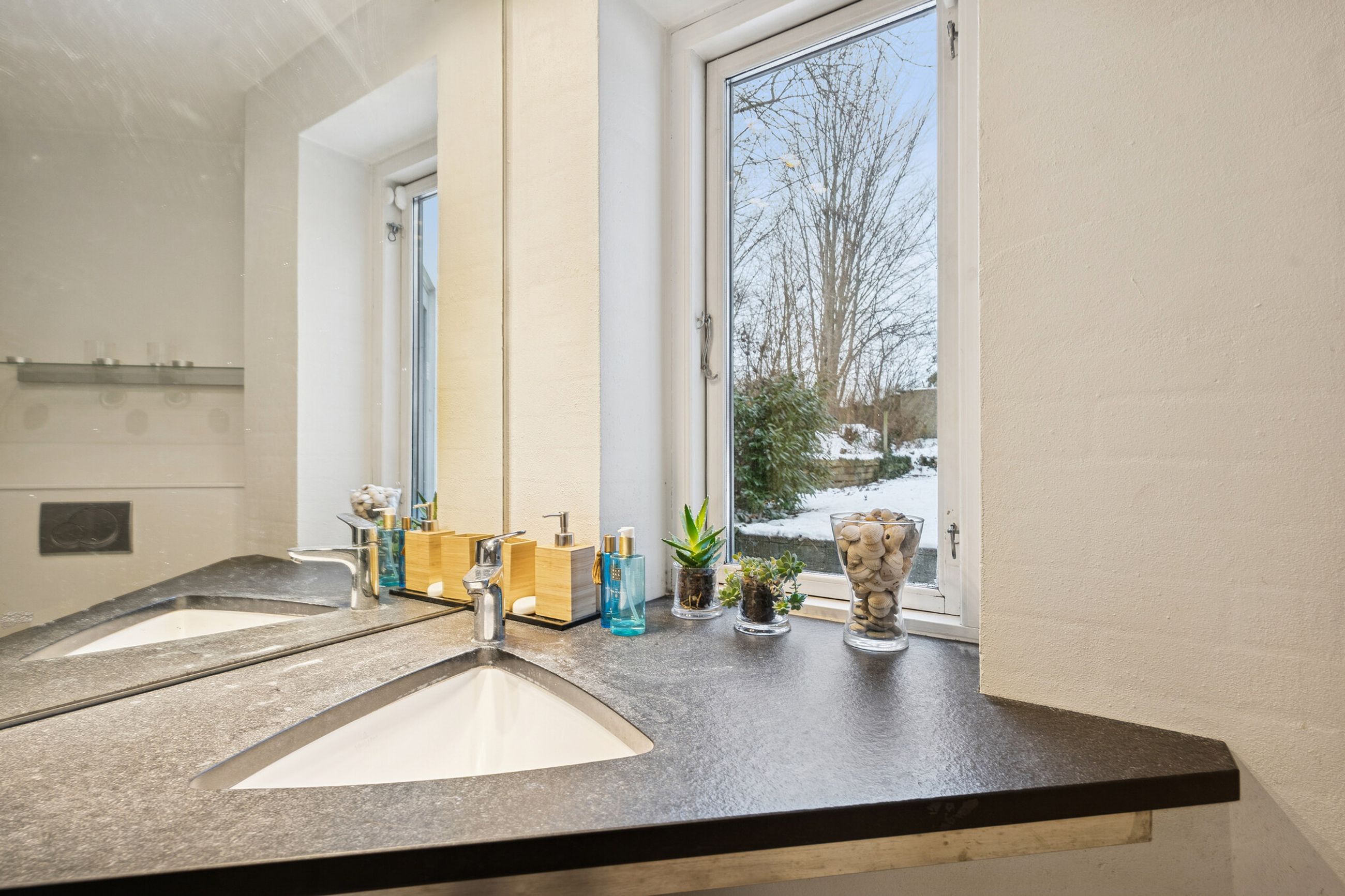 Indeholder: Indgang til den store brede mellemgang, med ovenlys og fordeling til ejendommens mange afdelinger og rum. Indgang til stort køkken/alrum, ligeledes med ovenlys g udgang til terrasseområdet. Her er sat en væg op, som kan tages ned igen, så der er kommet en afdeling med to værelser en-suite med ovenlys. På den anden side af gangen stort badeværelse med ovenlys. Der ud over stor indbygget garage på 45 kvm og stort disponibelt rum.
