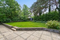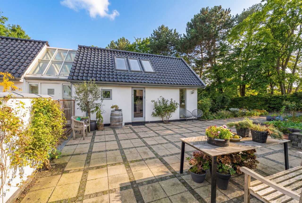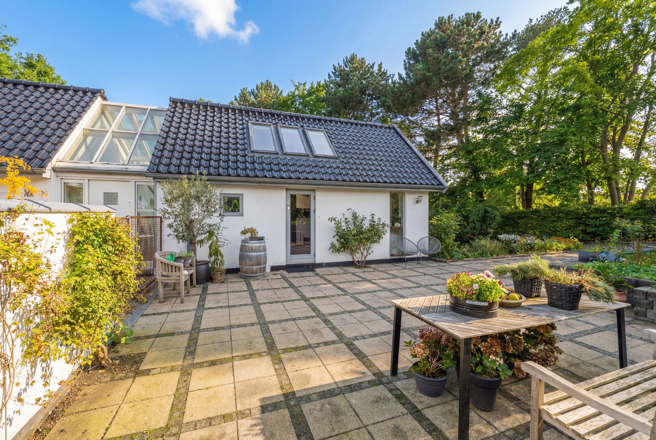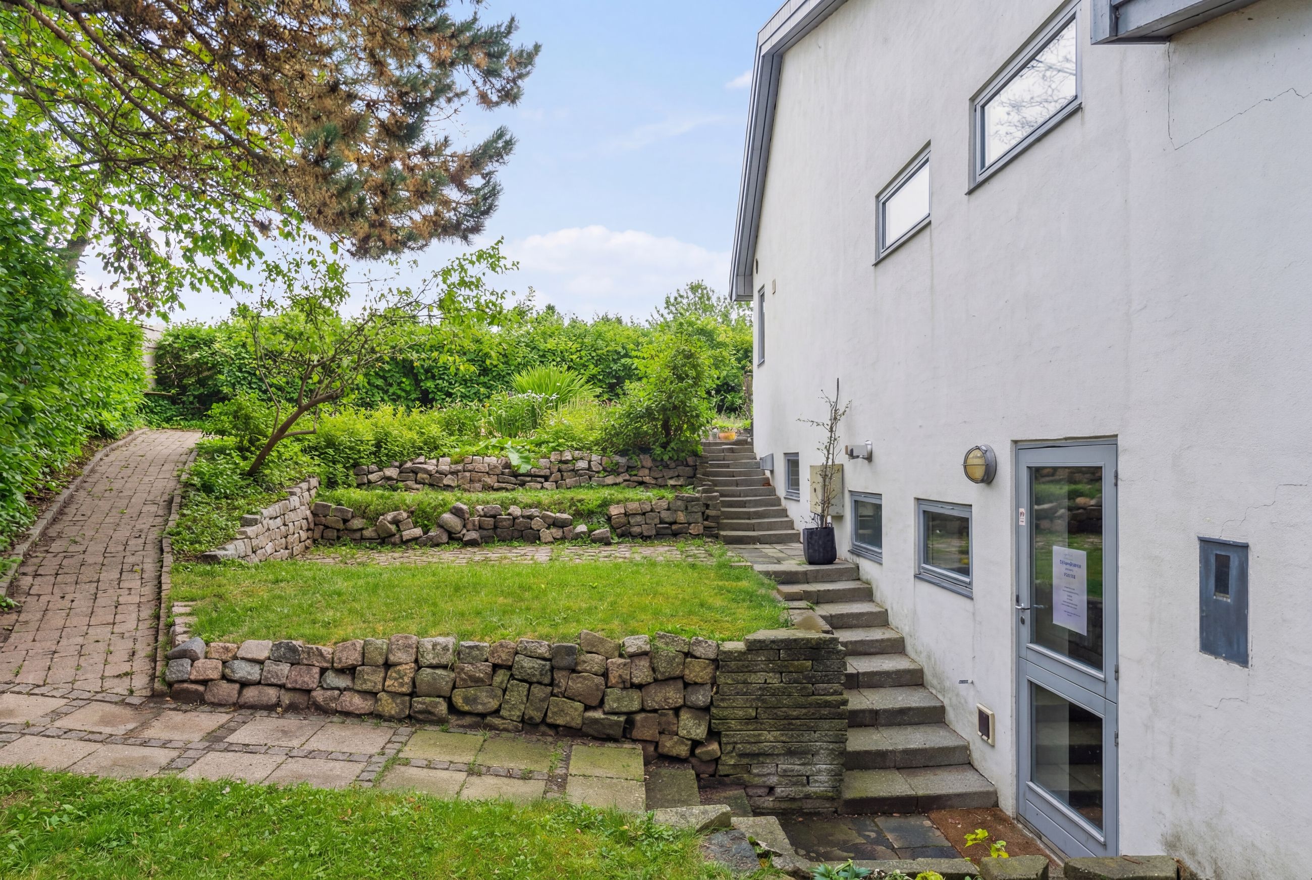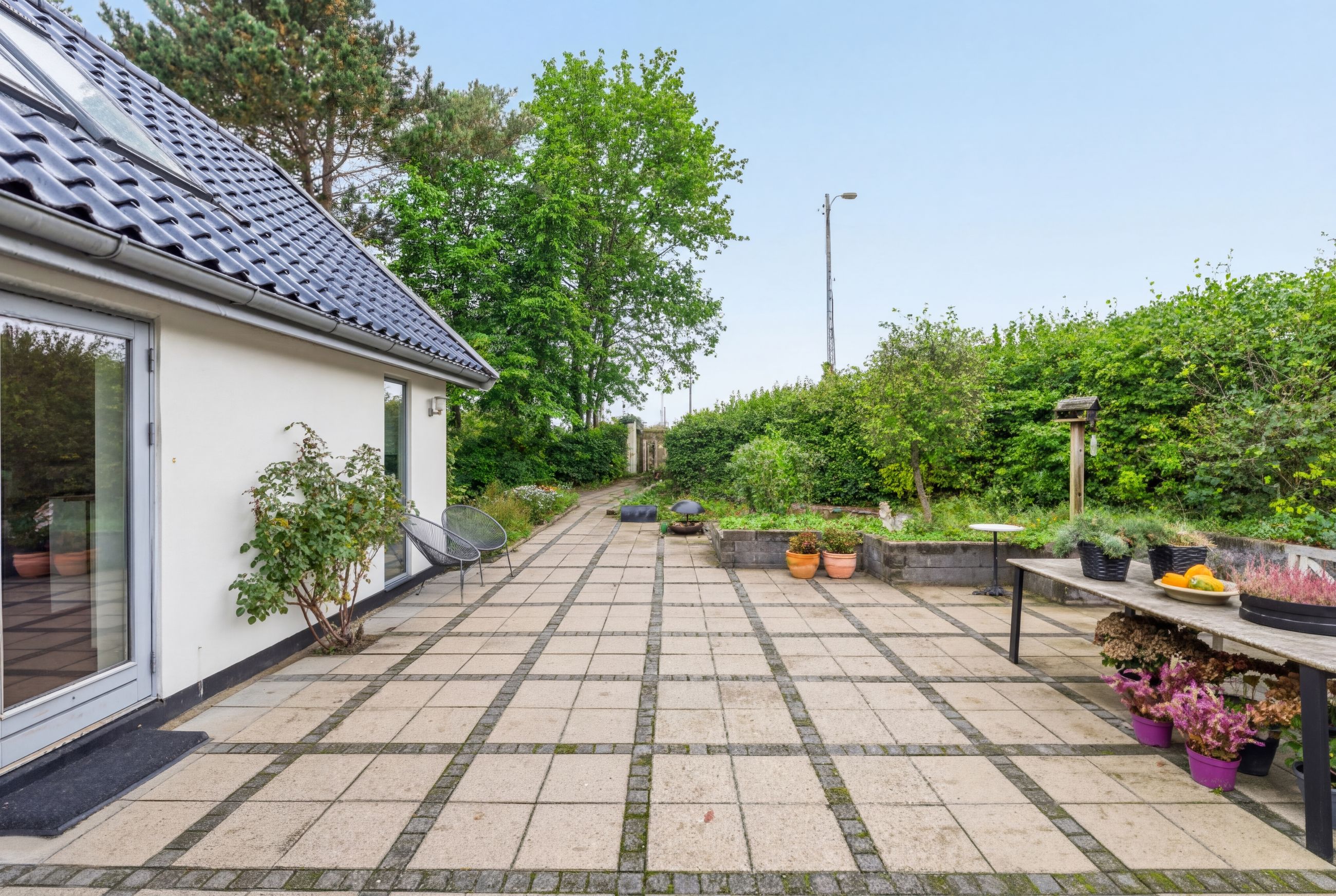 Grunden er en stor hjørnegrund på 1.138 kvm med mange træer og buske. Foran ejendommen er der et hyggeligt gårdhavemiljø, med flere terrasser, sol- og lækroge. Endvidere gode parkeringsforhold.