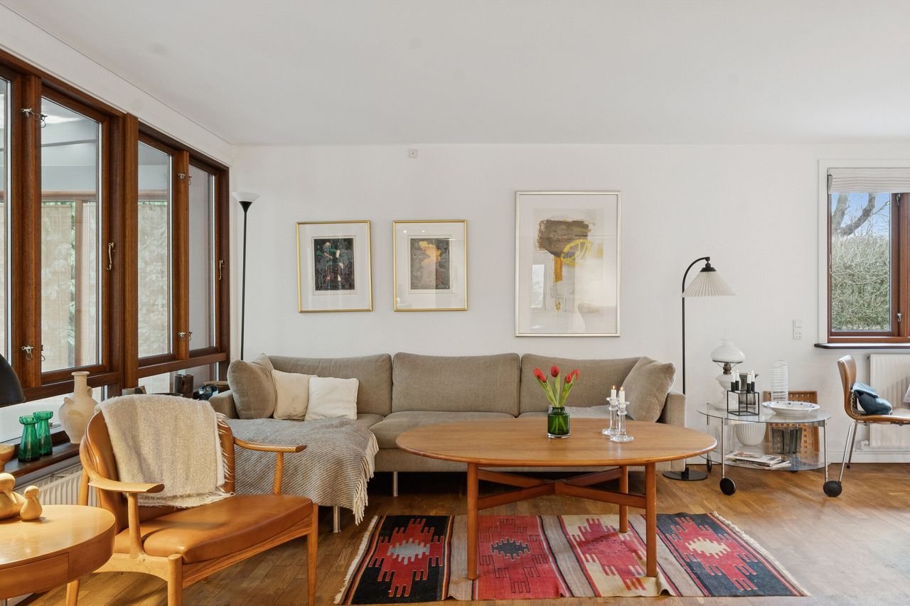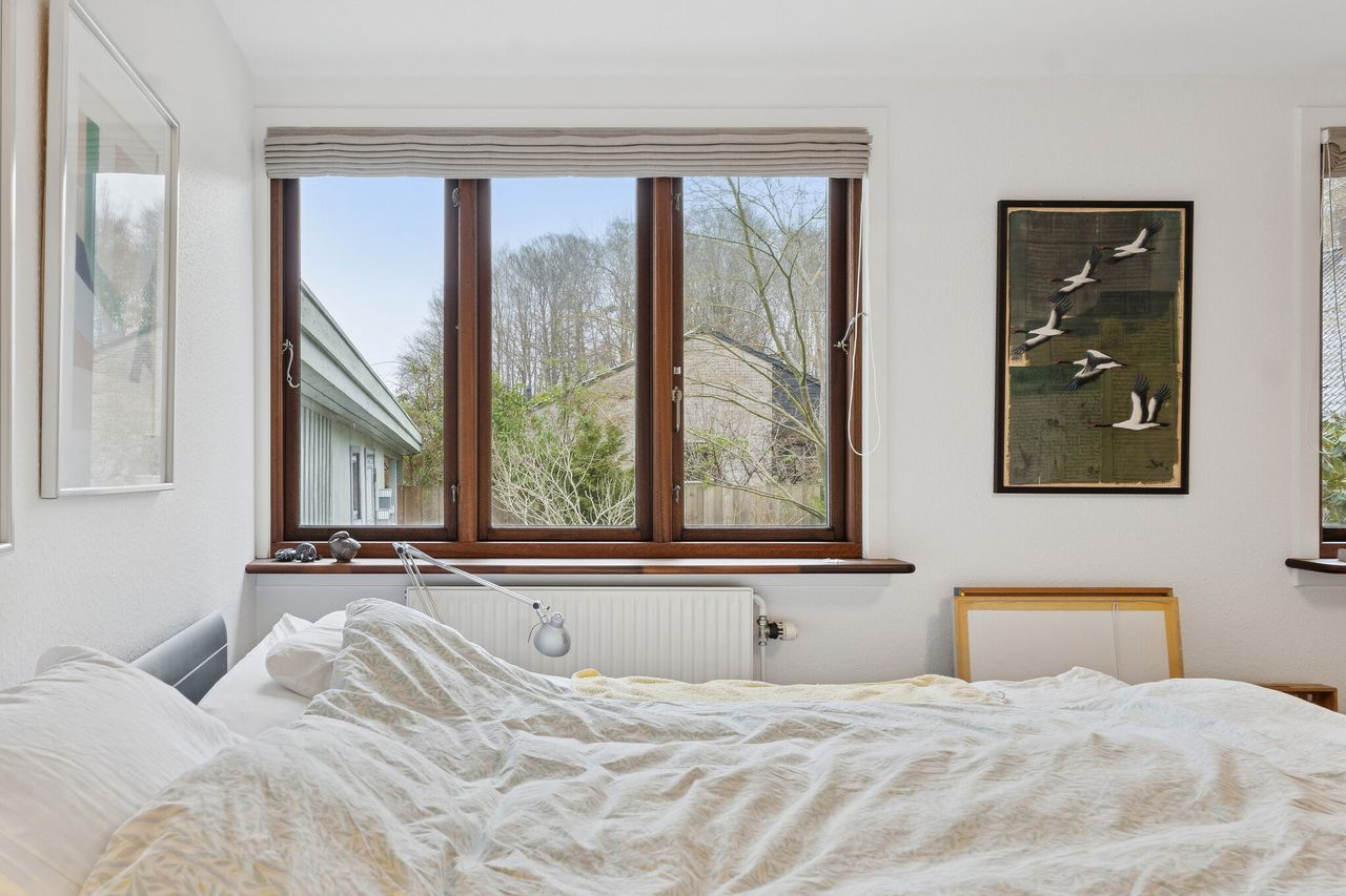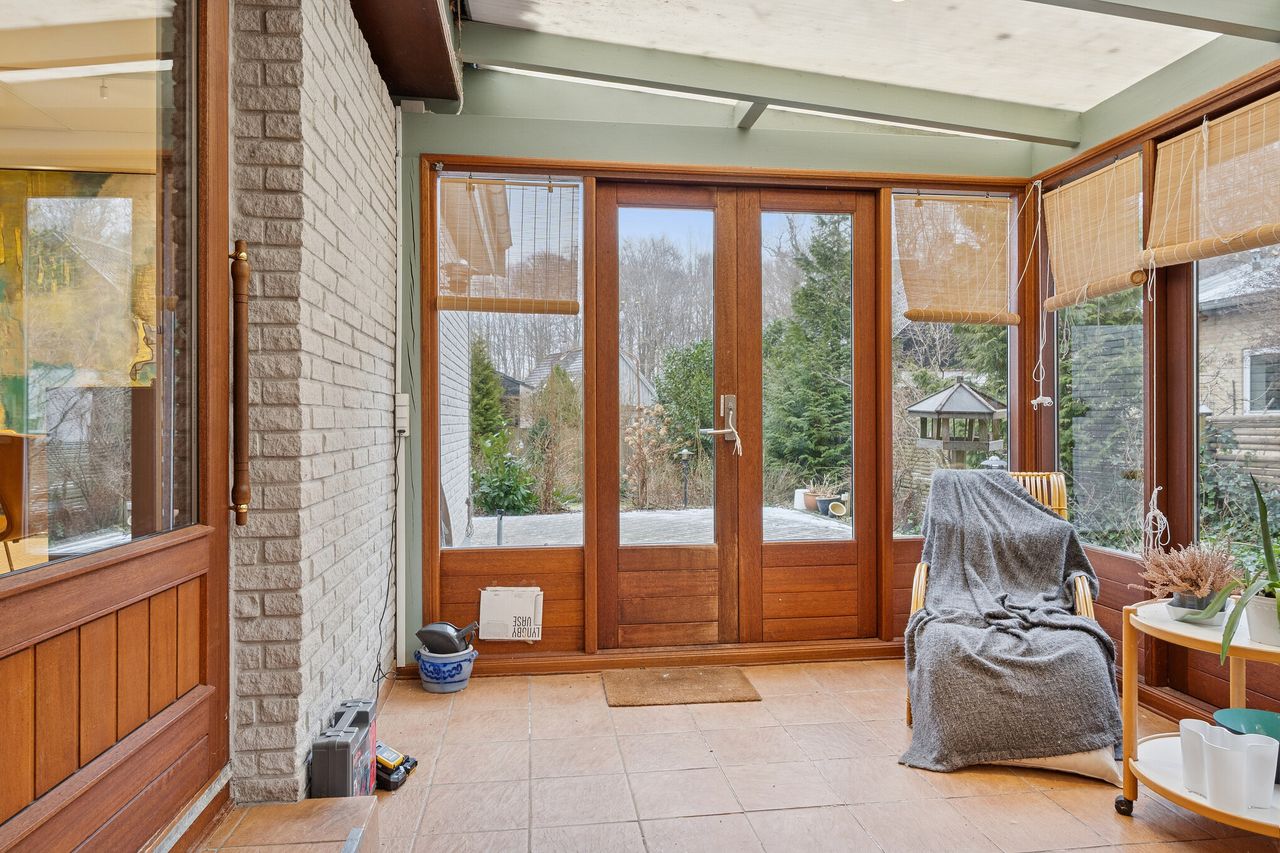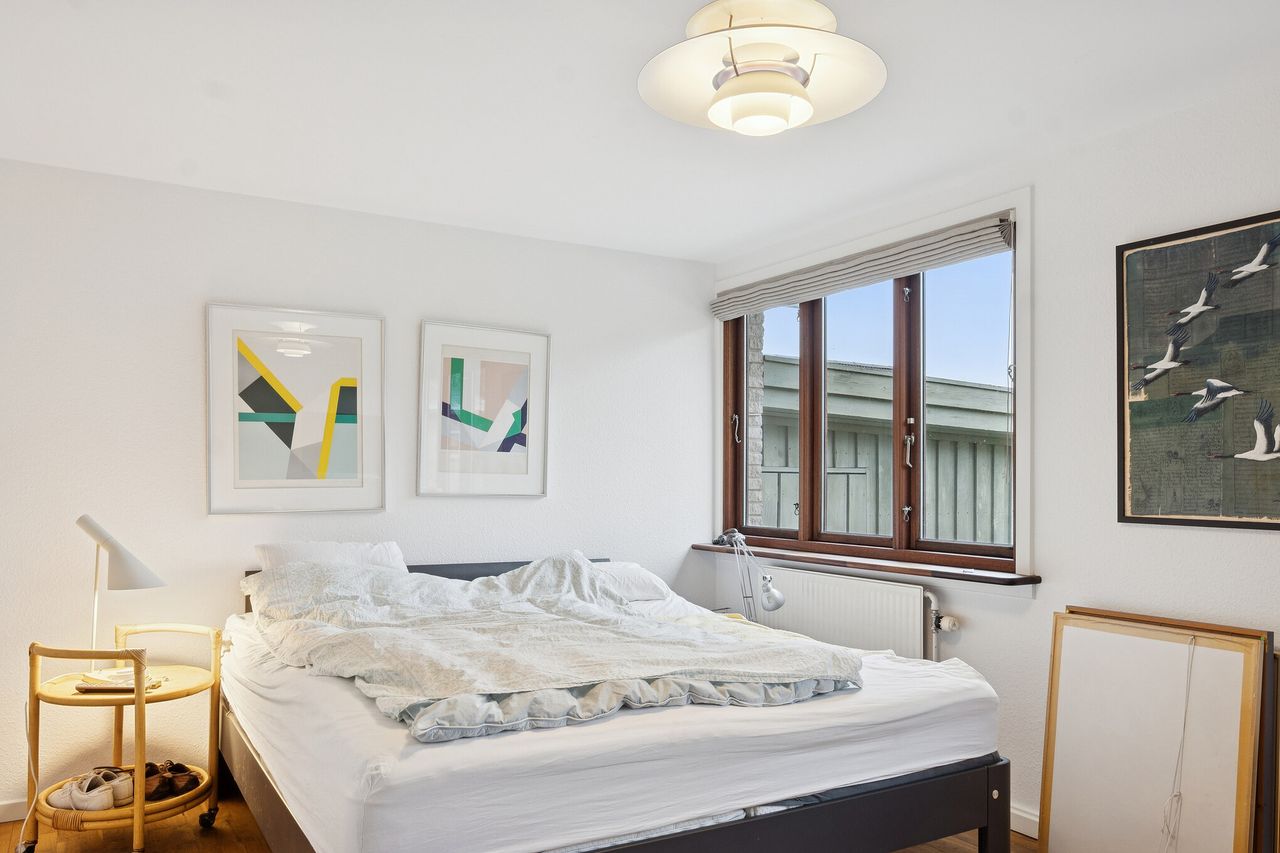 Ialt 106 kvm bolig og 21 kvm udestue er indrettet som følger: Indgang til entré/mellemgang, hvorfra der er adgang til husets badeværelse og stort soveværelse, som oprindeligt har været 2 værelser. Med indgang fra stuen, endnu et værelse/kontor. Værelserne ligger til havesiden af huset. Bryggers med egen indgang og indrettet med vaskemaskine og naturgasfyr. Åbent stuemiljø, med halvmur til køkkenet og dagligstue med udgang til udestuen. Herfra er der videre udgang til terrasse og haven vendt mod syd.