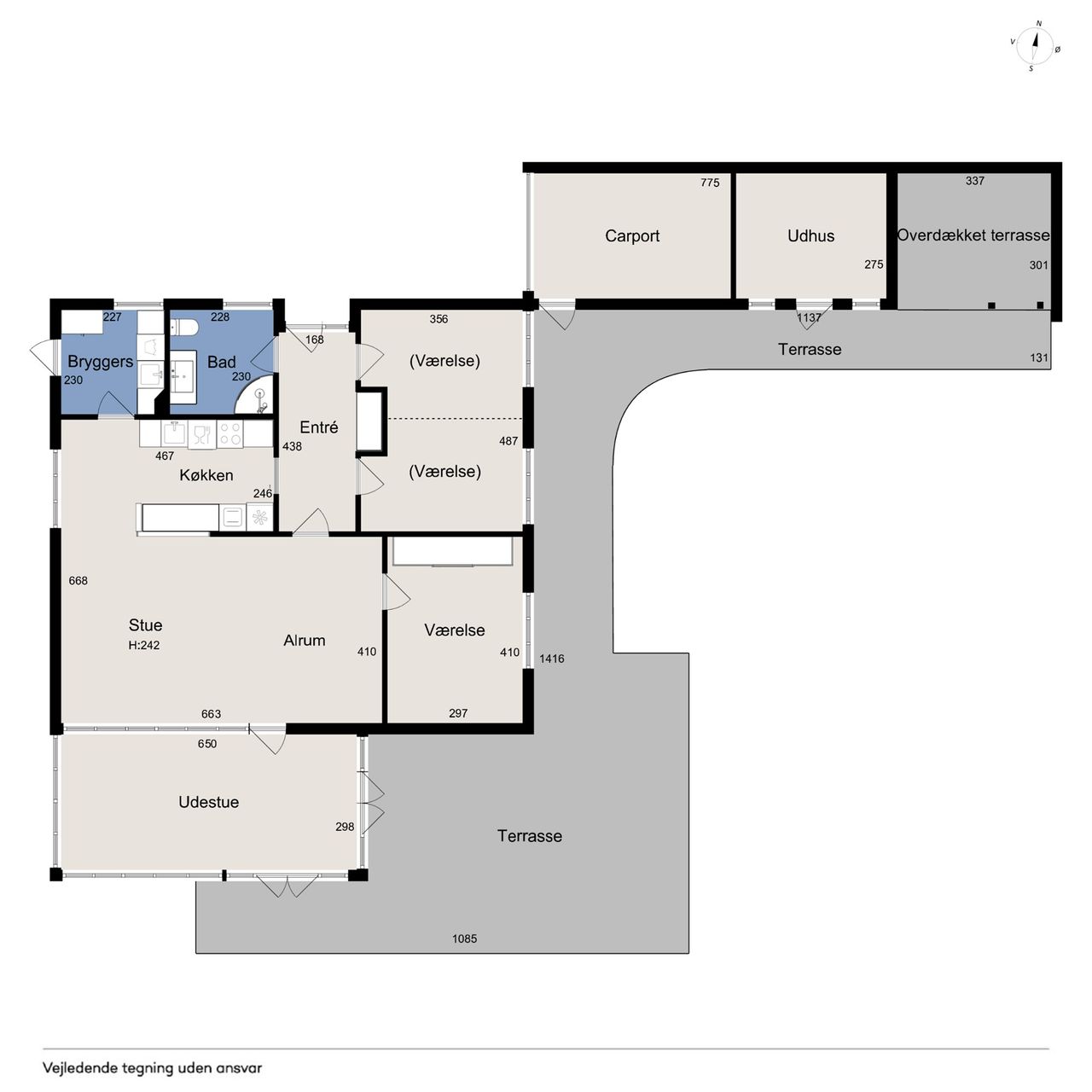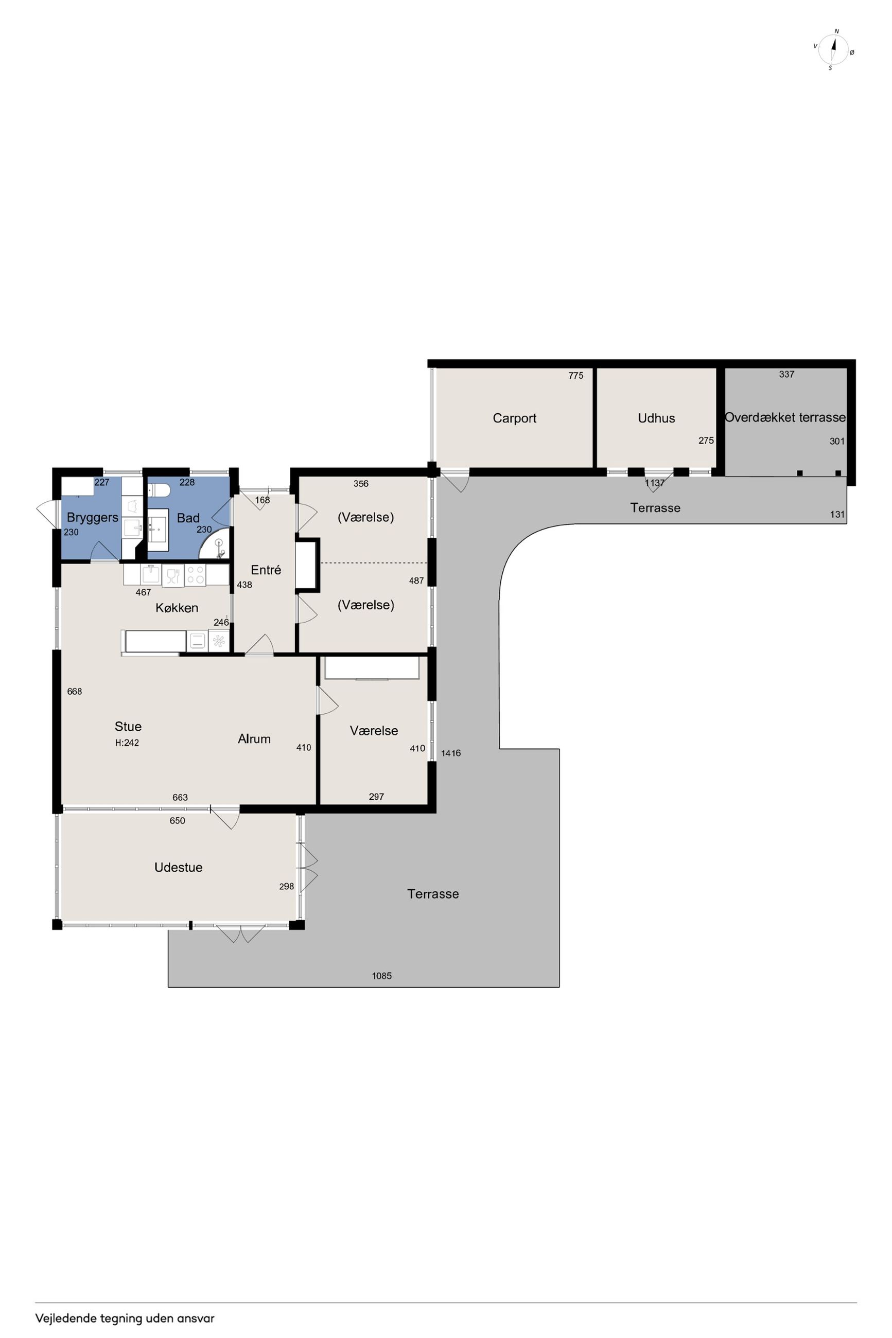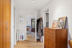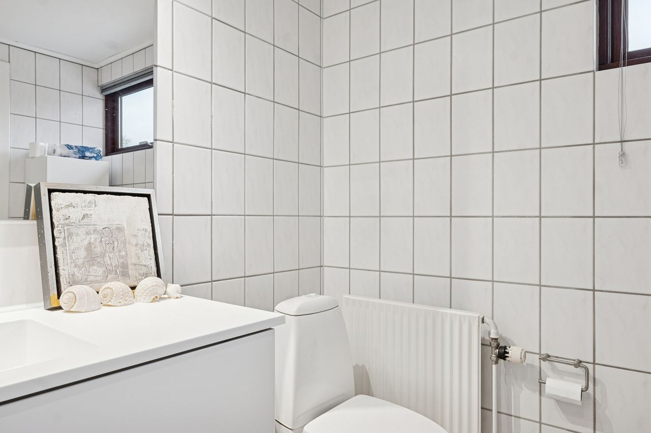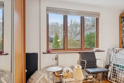 Ialt 106 kvm bolig og 21 kvm udestue er indrettet som følger: Indgang til entré/mellemgang, hvorfra der er adgang til husets badeværelse og stort soveværelse, som oprindeligt har været 2 værelser. Med indgang fra stuen, endnu et værelse/kontor. Værelserne ligger til havesiden af huset. Bryggers med egen indgang og indrettet med vaskemaskine og naturgasfyr. Åbent stuemiljø, med halvmur til køkkenet og dagligstue med udgang til udestuen. Herfra er der videre udgang til terrasse og haven vendt mod syd.