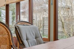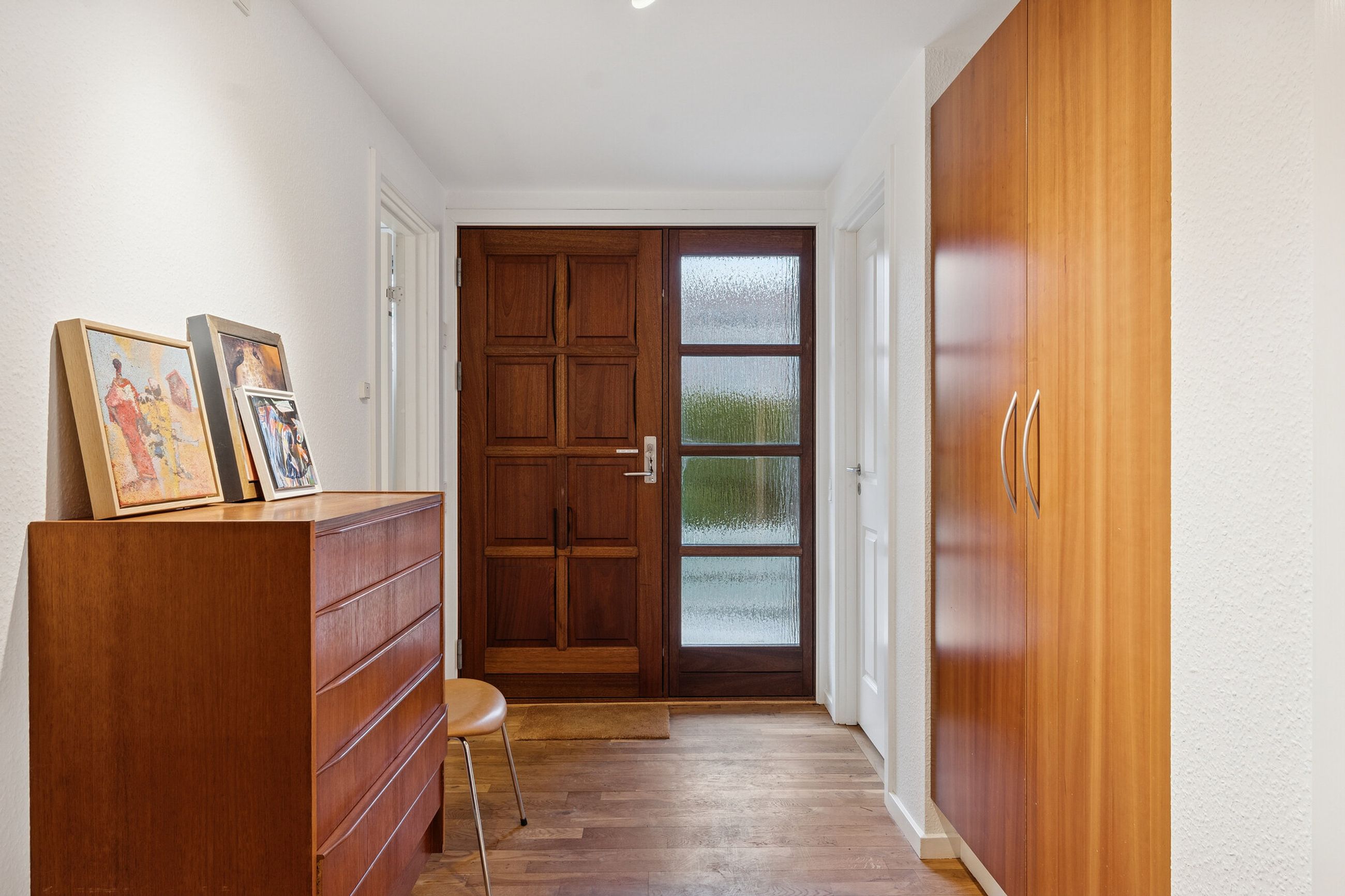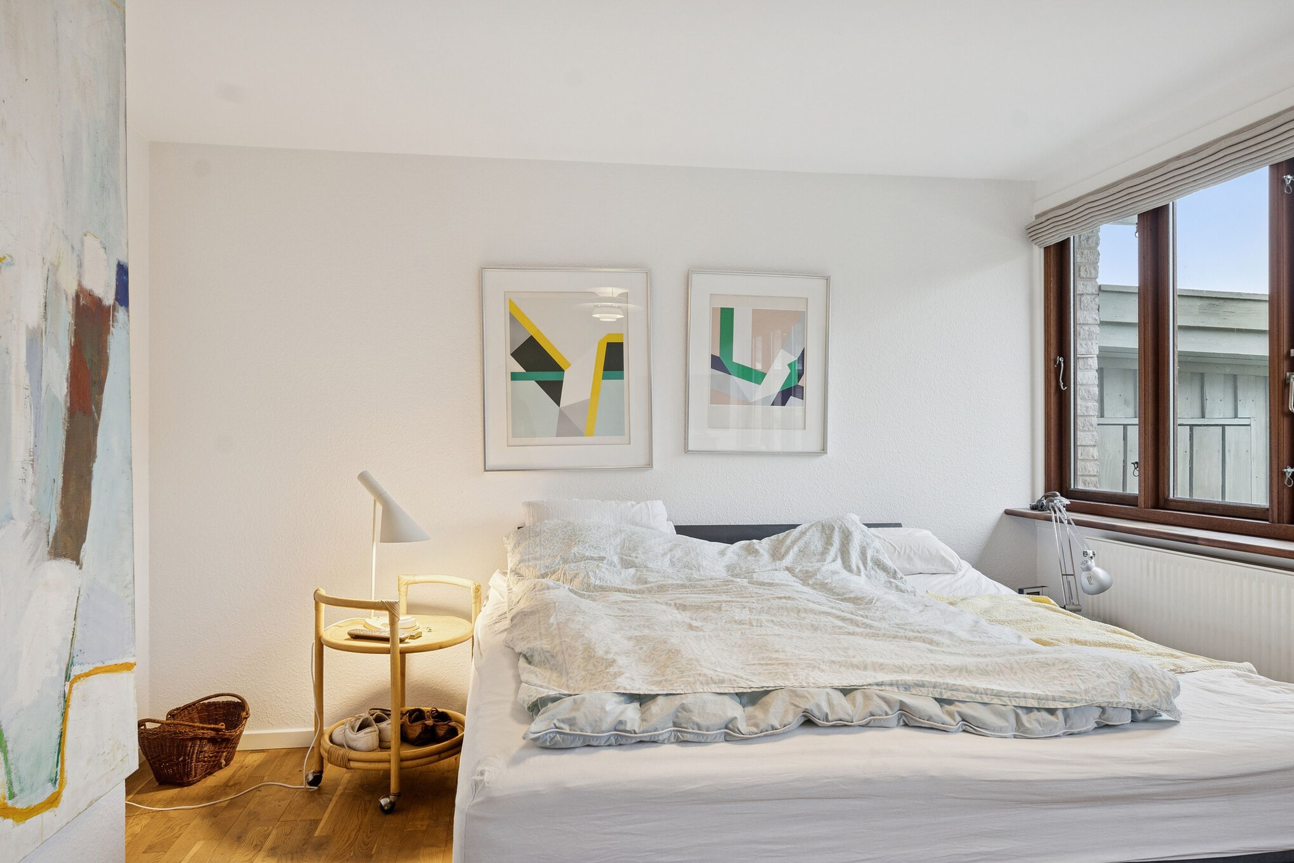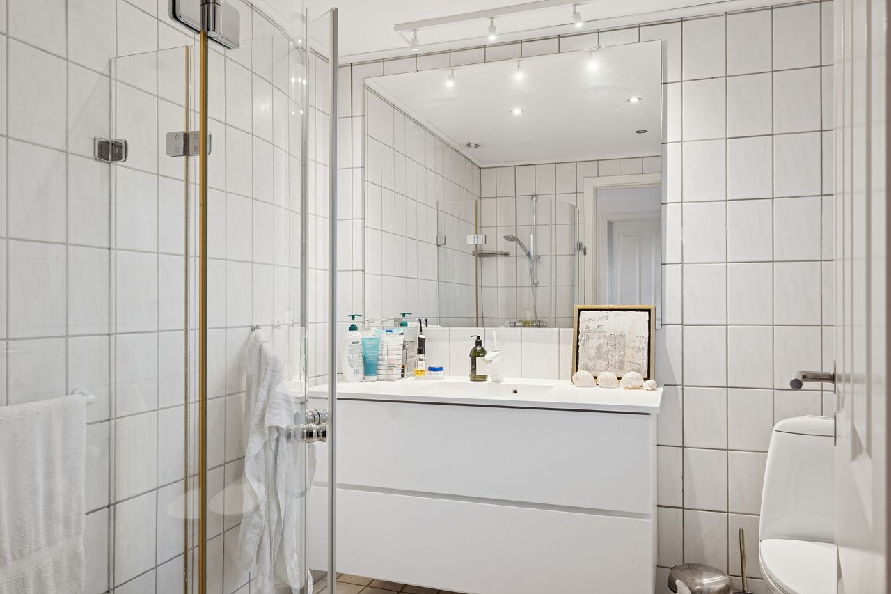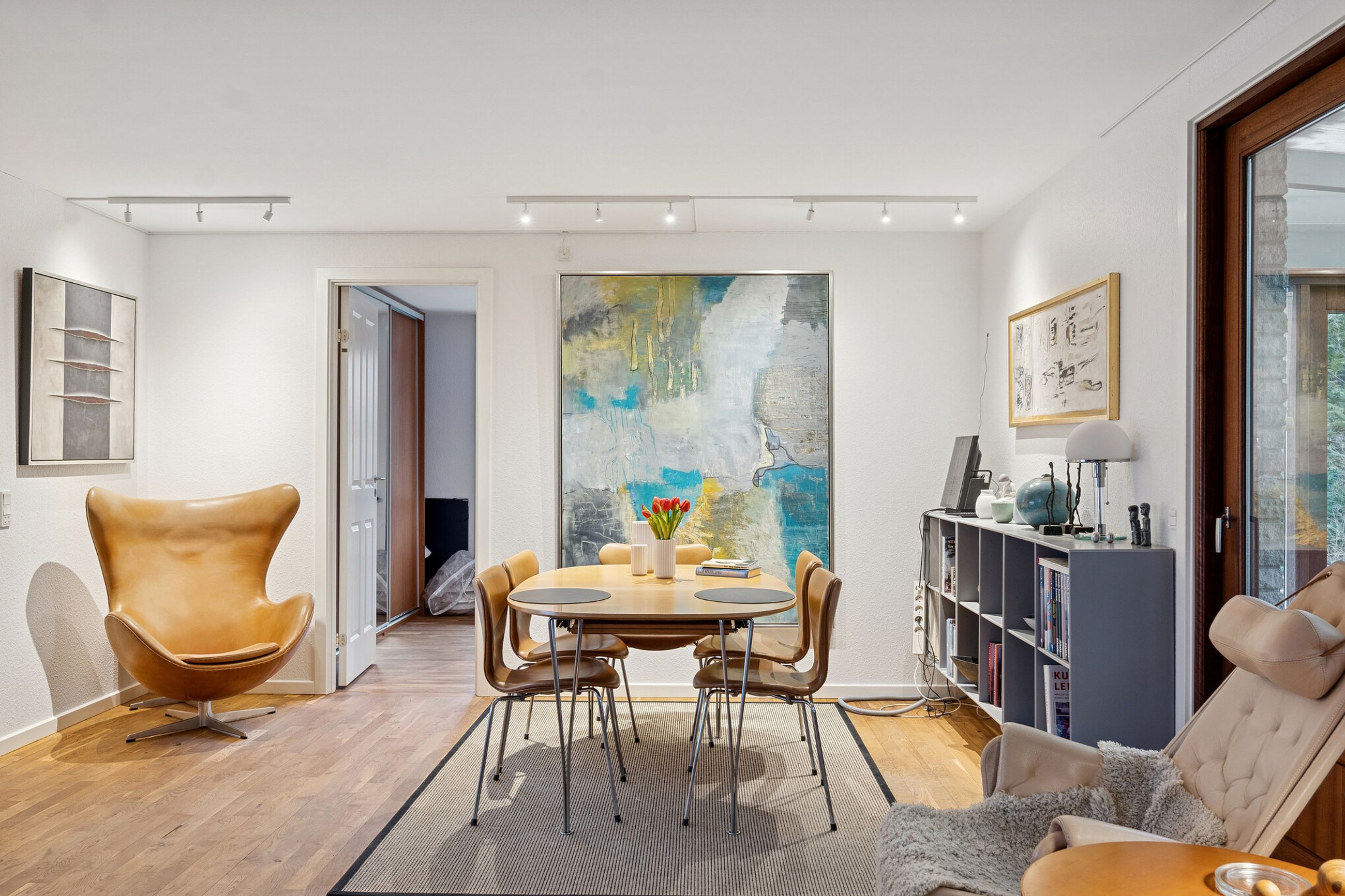 Ialt 106 kvm bolig og 21 kvm udestue er indrettet som følger: Indgang til entré/mellemgang, hvorfra der er adgang til husets badeværelse og stort soveværelse, som oprindeligt har været 2 værelser. Med indgang fra stuen, endnu et værelse/kontor. Værelserne ligger til havesiden af huset. Bryggers med egen indgang og indrettet med vaskemaskine og naturgasfyr. Åbent stuemiljø, med halvmur til køkkenet og dagligstue med udgang til udestuen. Herfra er der videre udgang til terrasse og haven vendt mod syd.