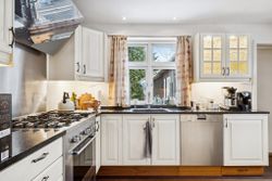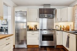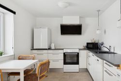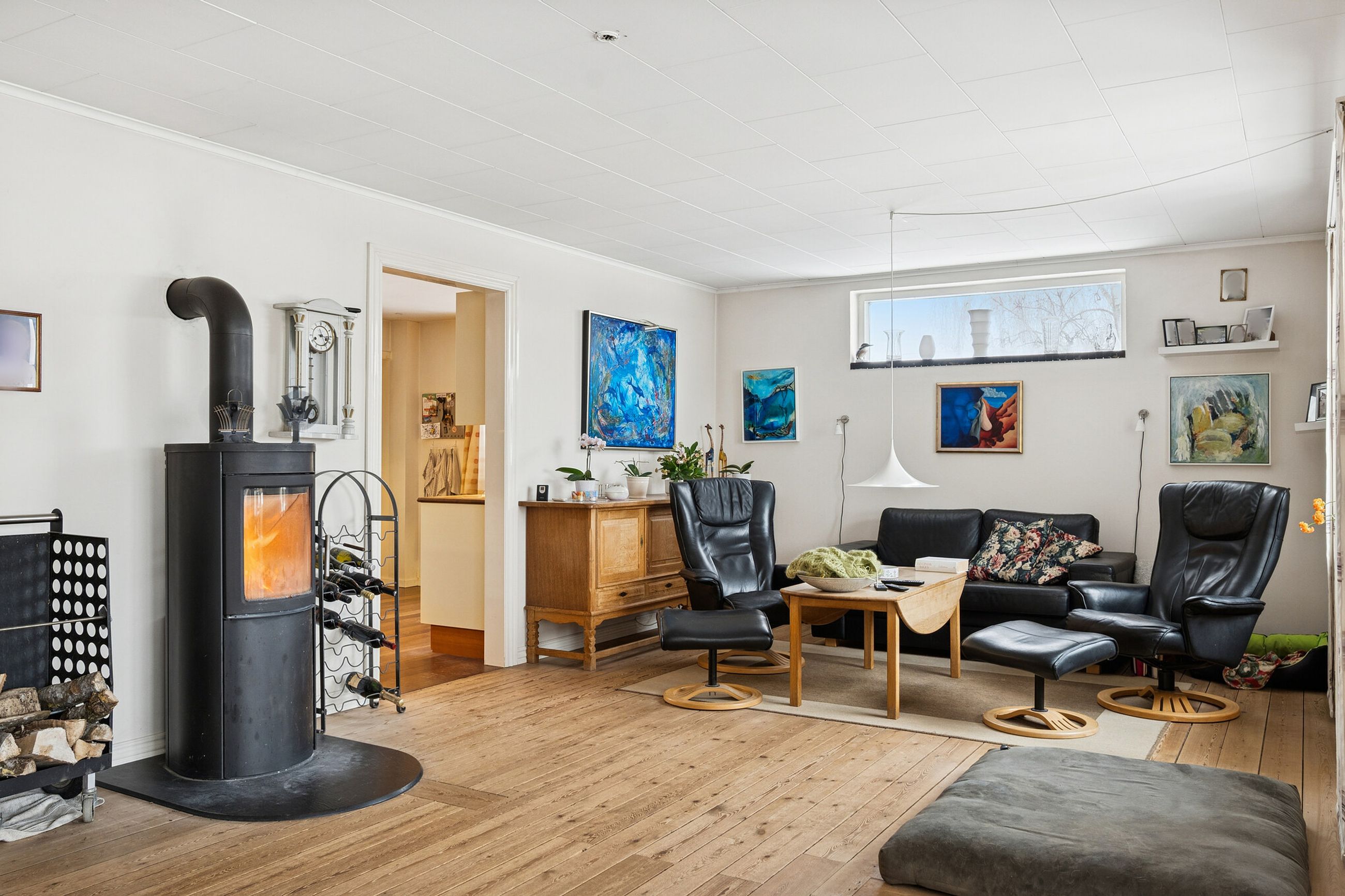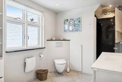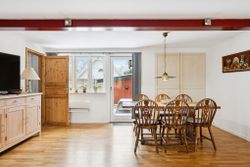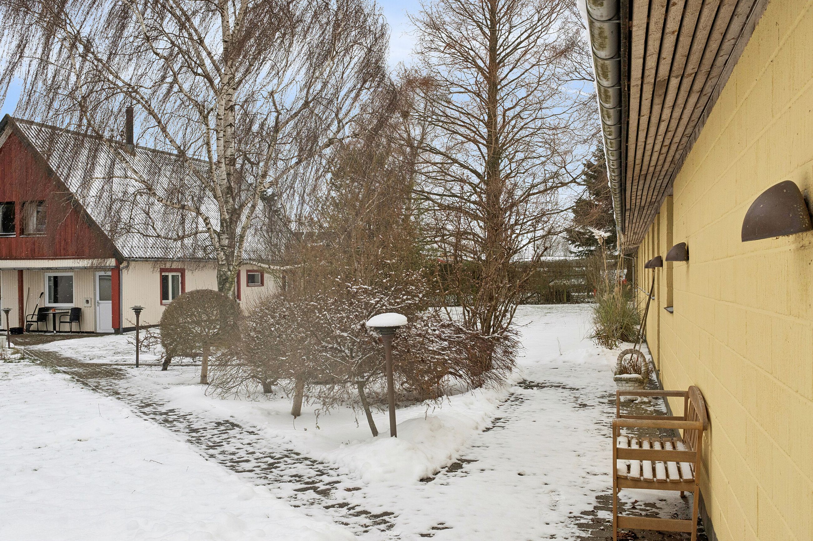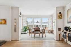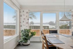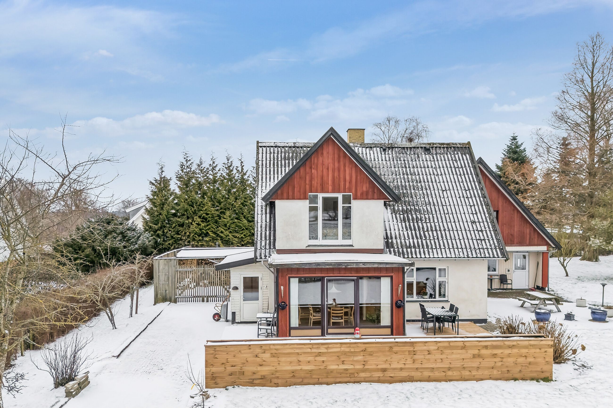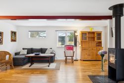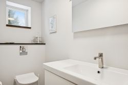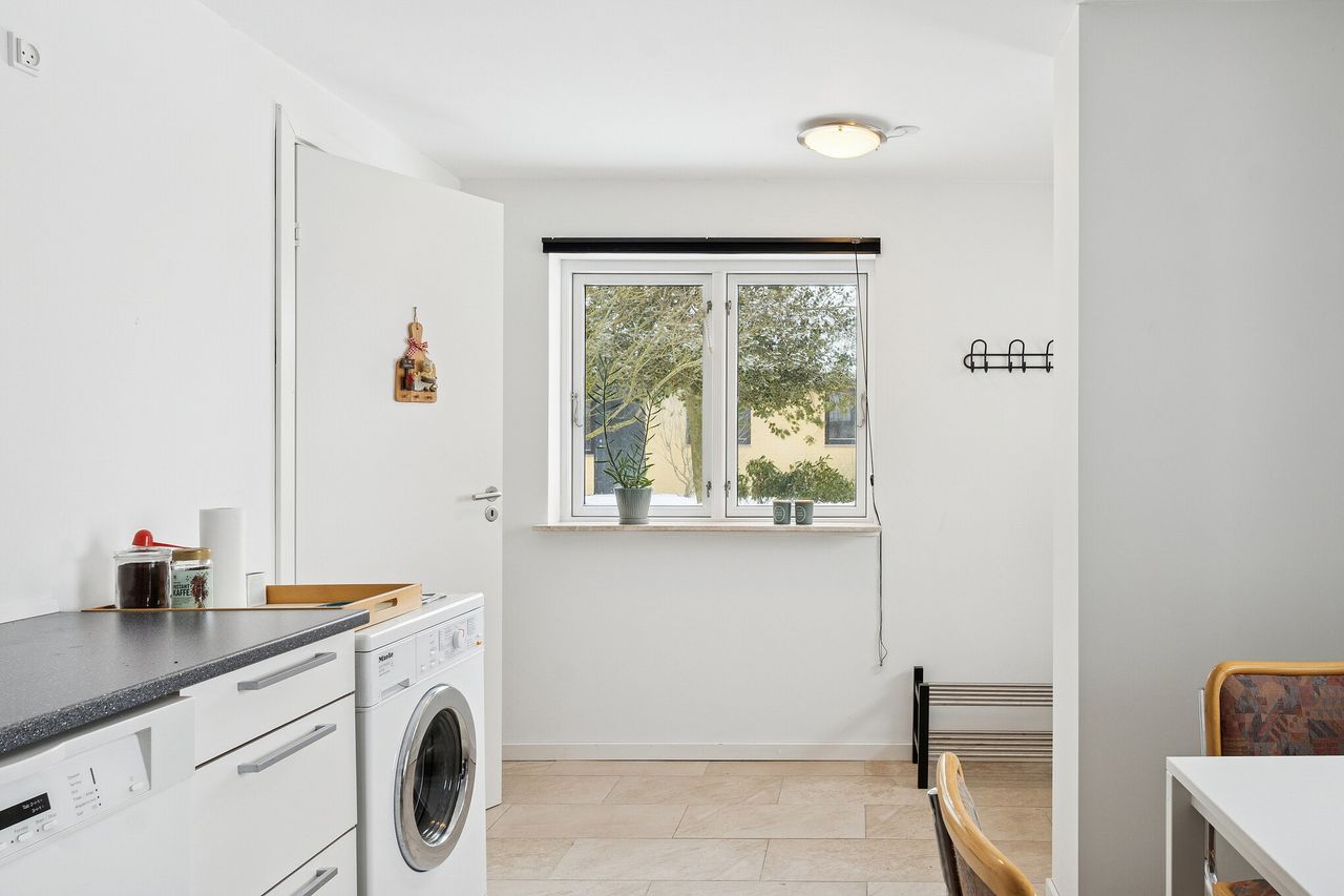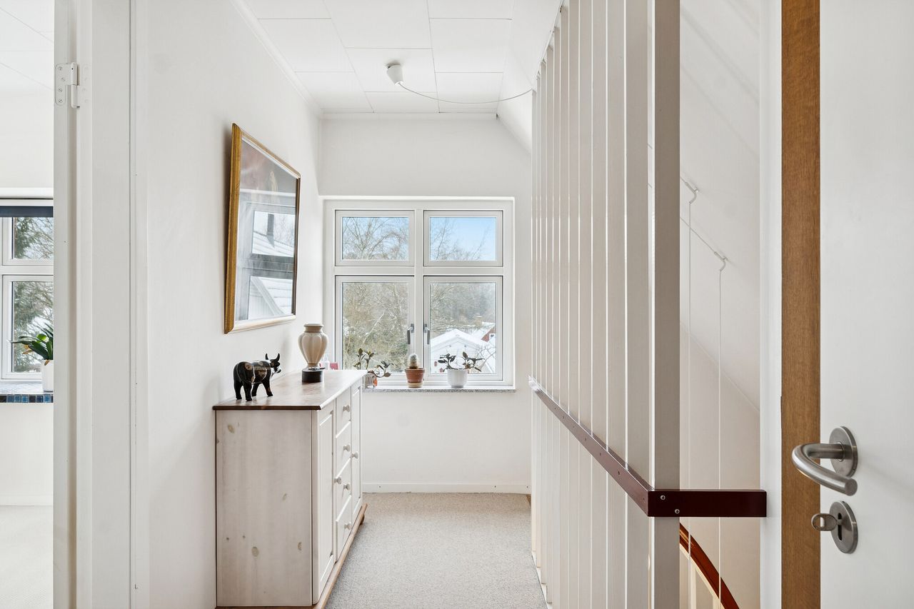 242 boligkvadratmeter er indrettet som følger: Indgang via fælles entre til de to enheder. Indgang til køkken og videre til dagligstue med brændeovn og åben forbindelse til indbygget udestue. Herfra videre udgang til terrasse og haven. Mellemgang med trappe til 1. sal, gæstetoilet og bryggers med egen indgang. Trappe til 1. sal, som er indrettet med soveværelse, brusebadeværelse og værelset indrettet til walk-in-closset. Afdeling til den anden side er indrettet med stue med brændeovn, varmepumpe og udgang til gården. Mellemgang til 2 værelser og pænt brusebadeværelse. Køkken med spiseplads og egen indgang fra haven. Trappe til ekstra kvadratmeter i udnytte loftsrum, som ikke er godkendt til beboelse, men som har 2 disponible rum og en stor gildesal med hjemmebar.