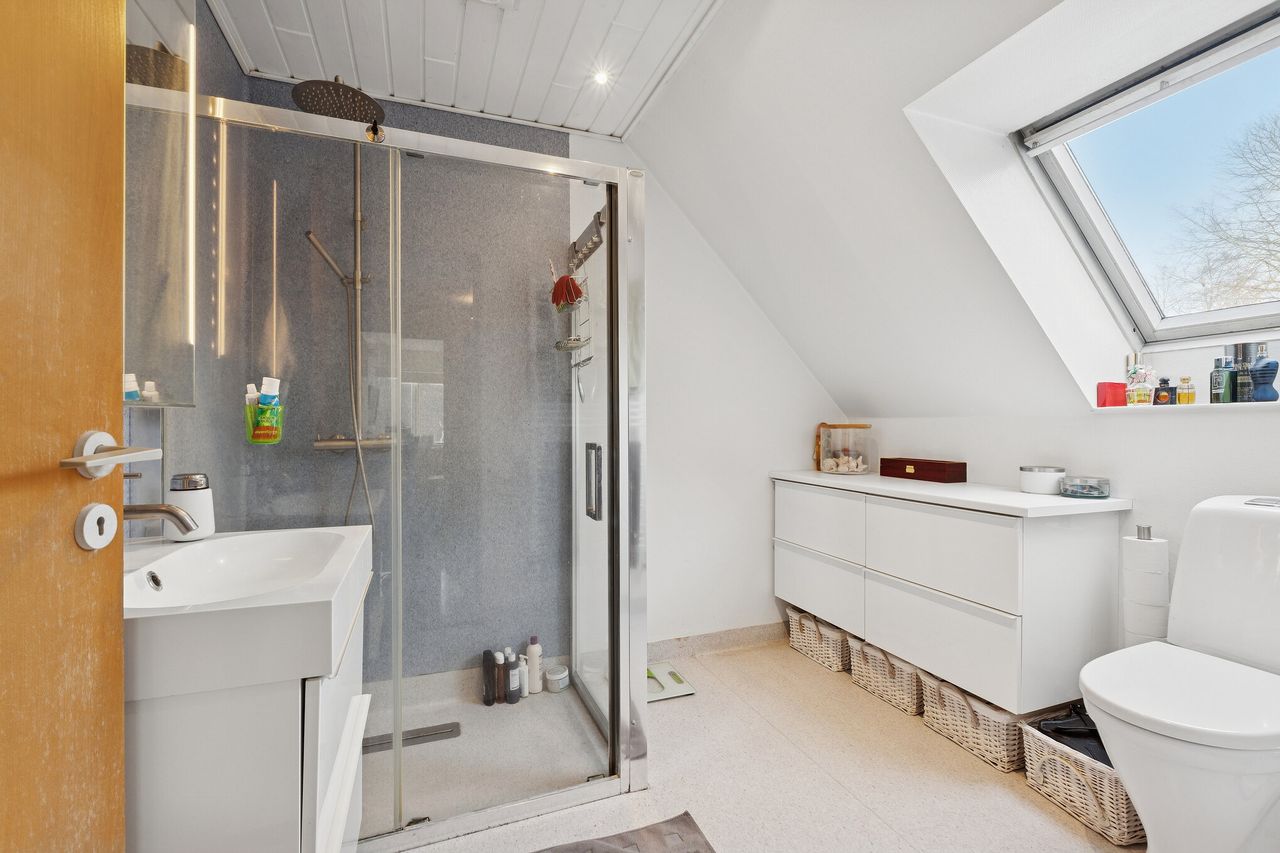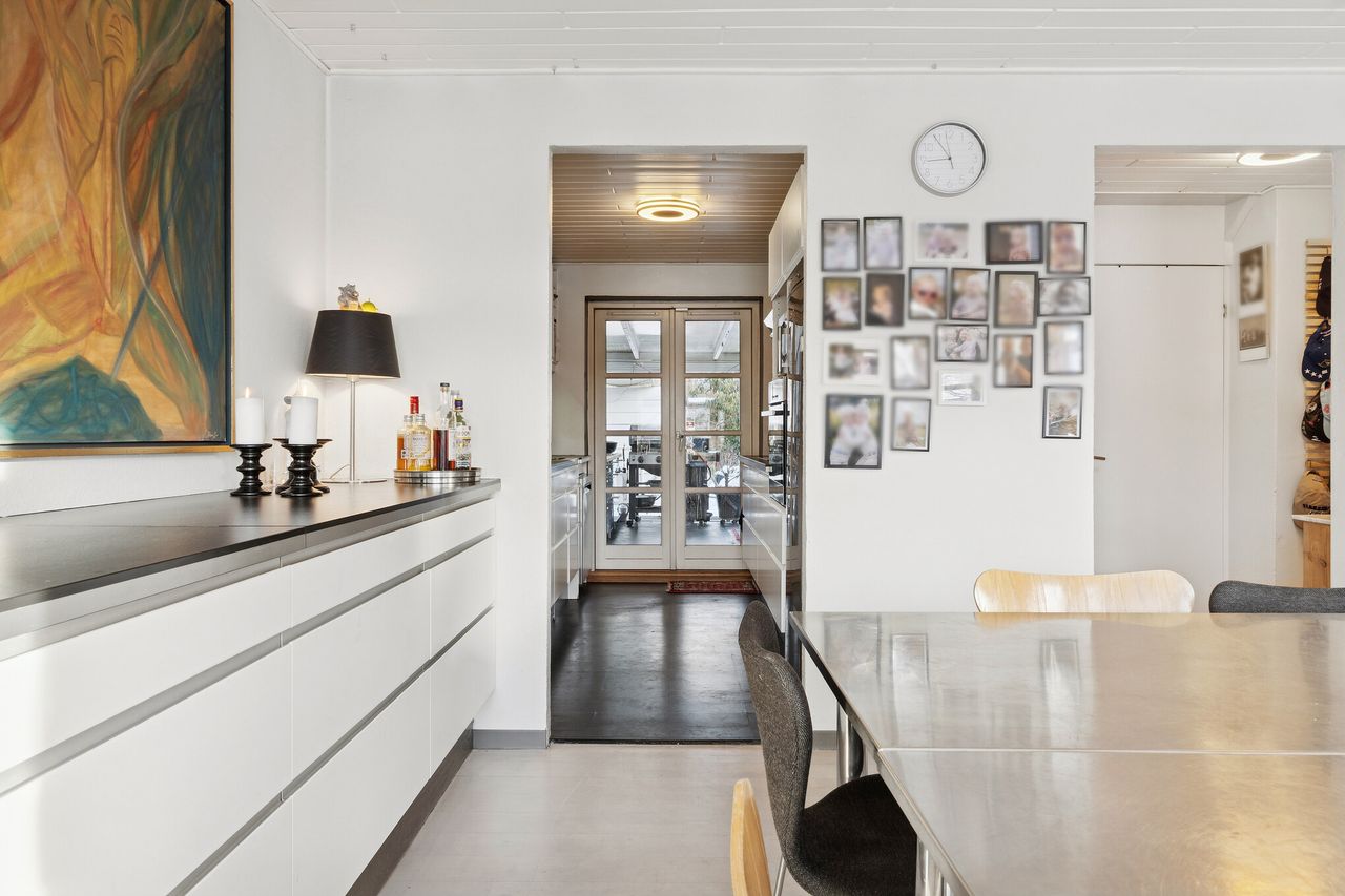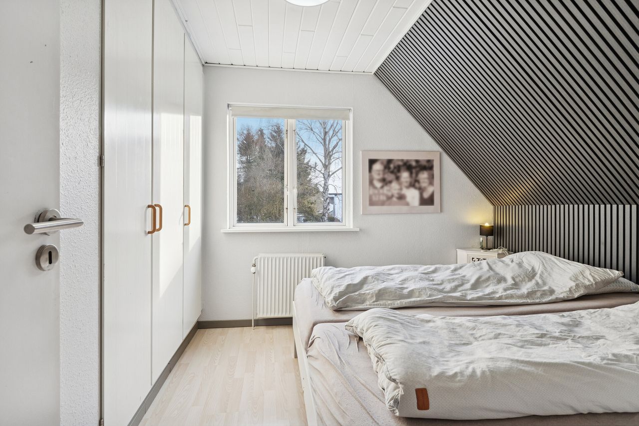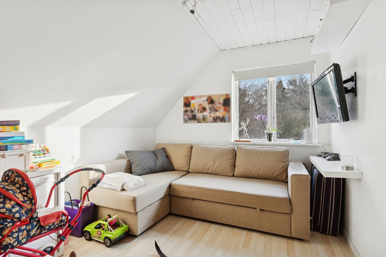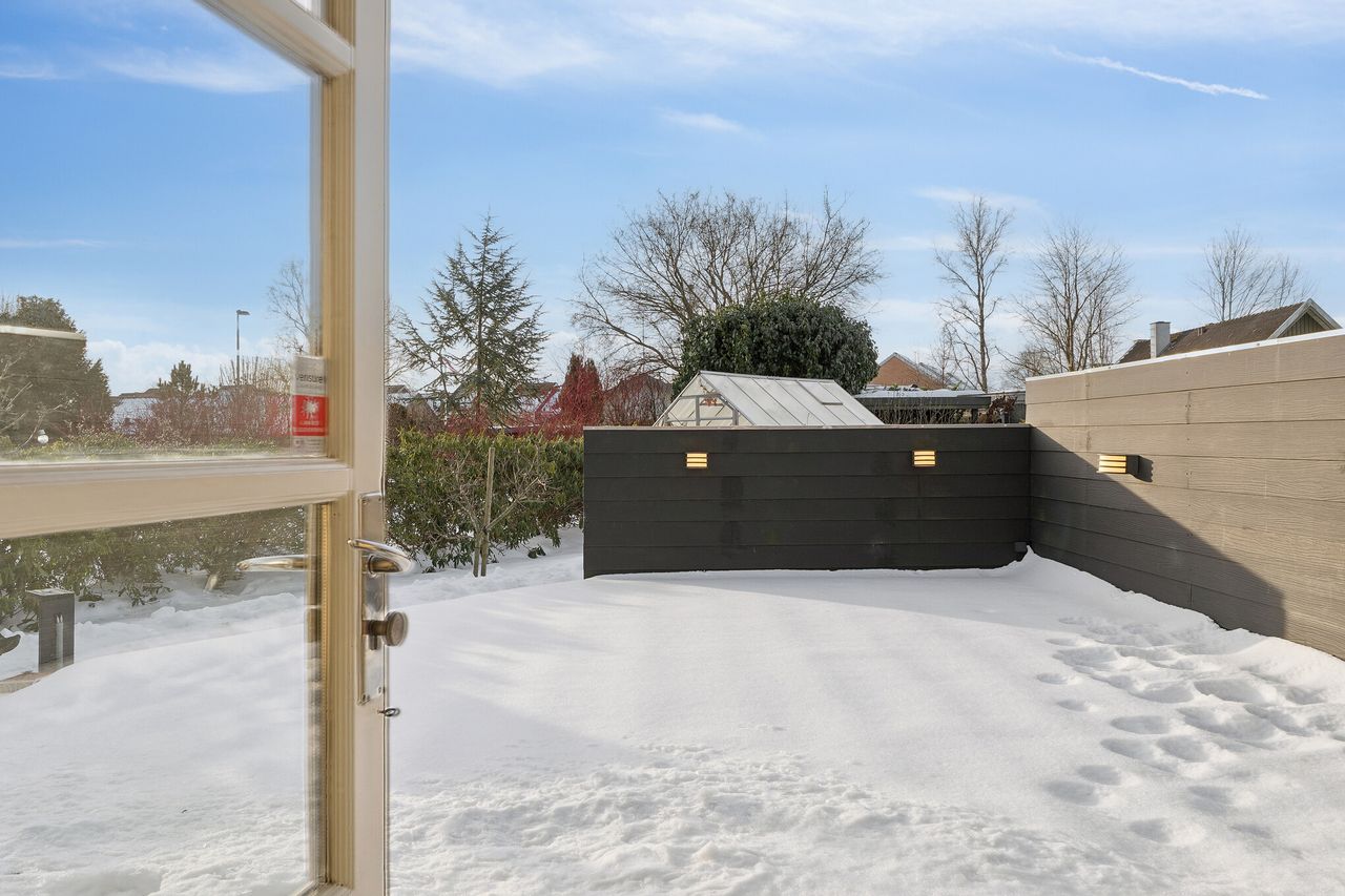I alt 125 kvm bolig er indrettet som følger: Ankomst via havegang fra indkørsel. Entré/mellemgang med fordeling til bryggers med egen indgang, gæstetoilet, pulterrum med garderobeplads og trappe til 1. sal. Hyggelig stue med brændeovn, udgang til terrasse og haven mod syd og spiseplads i forbindelse med åbent køkken. Fra køkkenet er der udgang til udestuen, baghaven og grundstykket ud til Fredensborgvej. 1. sal er indrettet med 3 værelser med god skabsplads, walk in closet og badeværelse med brusekabine.