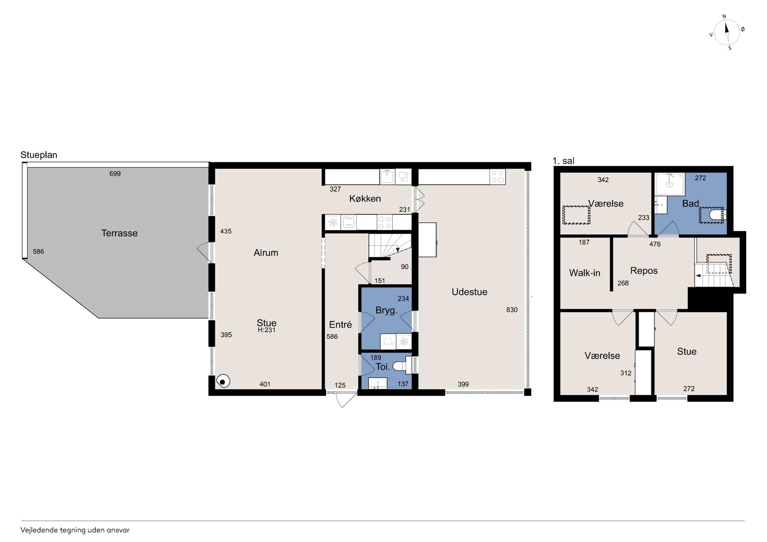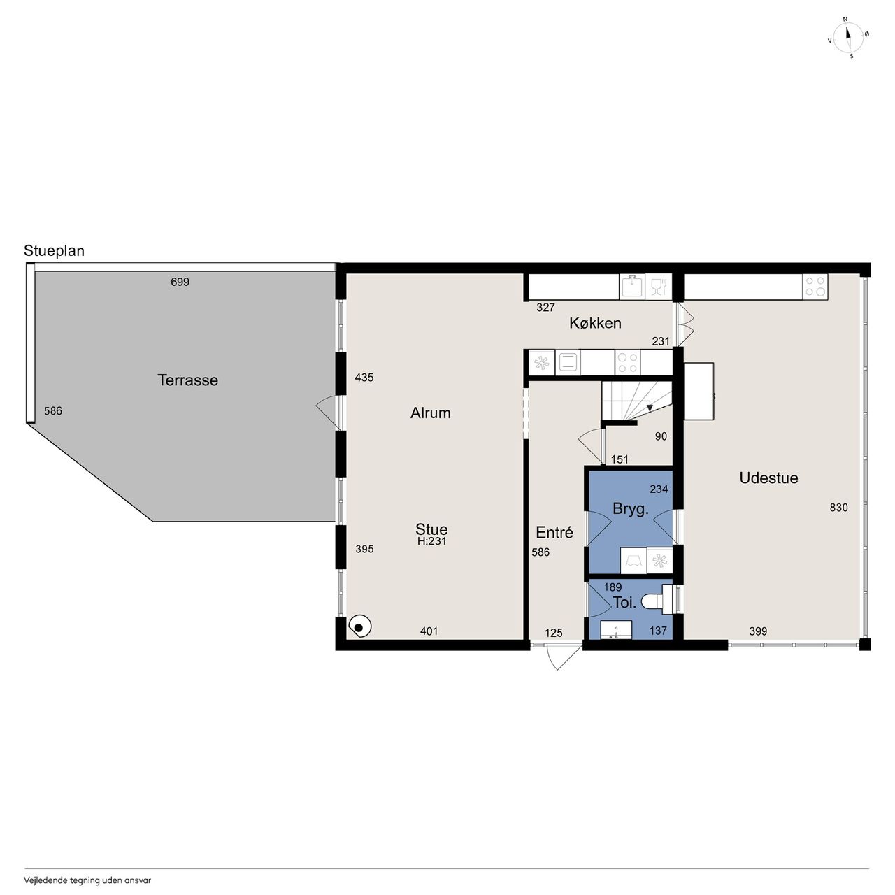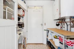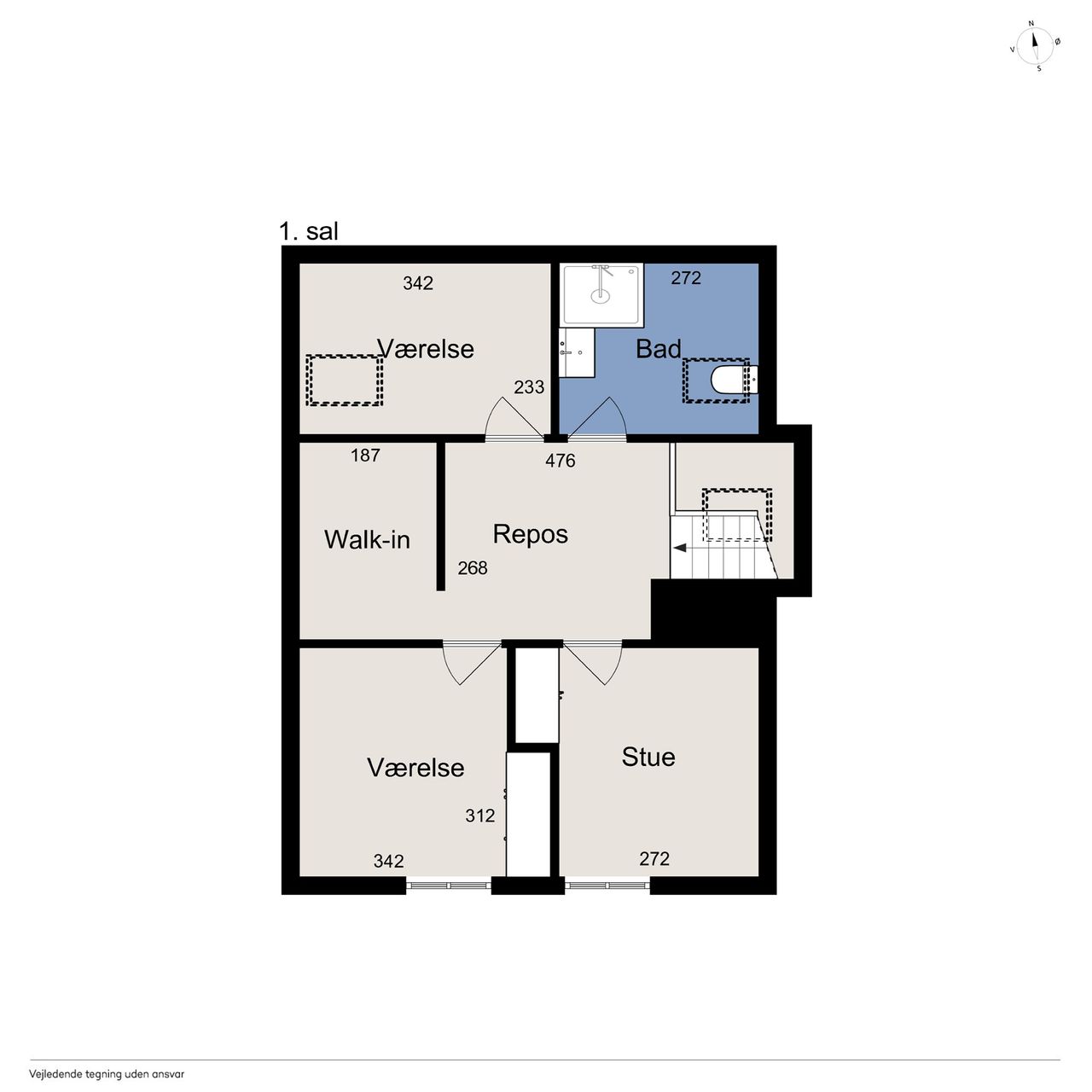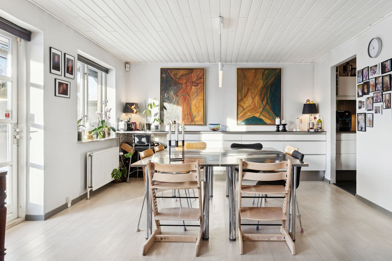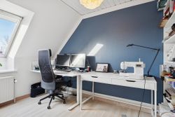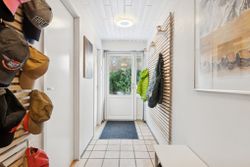 I alt 125 kvm bolig er indrettet som følger: Ankomst via havegang fra indkørsel. Entré/mellemgang med fordeling til bryggers med egen indgang, gæstetoilet, pulterrum med garderobeplads og trappe til 1. sal. Hyggelig stue med brændeovn, udgang til terrasse og haven mod syd og spiseplads i forbindelse med åbent køkken. Fra køkkenet er der udgang til udestuen, baghaven og grundstykket ud til Fredensborgvej. 1. sal er indrettet med 3 værelser med god skabsplads, walk in closet og badeværelse med brusekabine.
