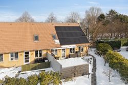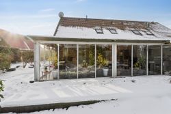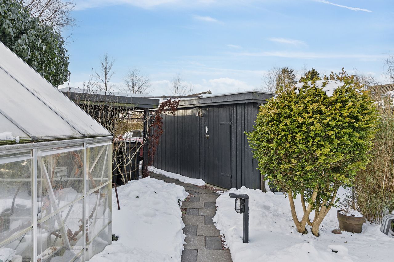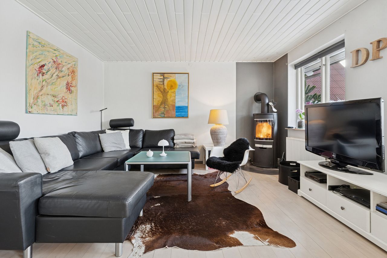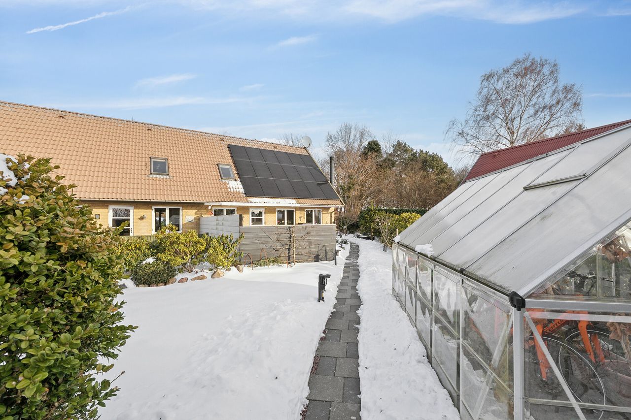 Huset er opført i gule mursten, hulmursisoleret og med vingetegl på taget. 125 boligkvadratmeter i halvandet plan, med tilhørende ikke godkendt udestue, er den ideelle ramme for en børnefamilie. Varmeanlæg med kombination af naturgas og brændeovn i stuen samt effektive solceller fra 2022. Haven er aflukket og med adgang til et ekstra grundstykke, som tilhører kommunen. Endvidere solrig terrasse – perfekt til sommerens grillaftener eller stille morgenkaffe under åben himmel. Der er privat parkering lige foran huset med tilhørende udhus. Ekstra parkering på vejen til gæster.