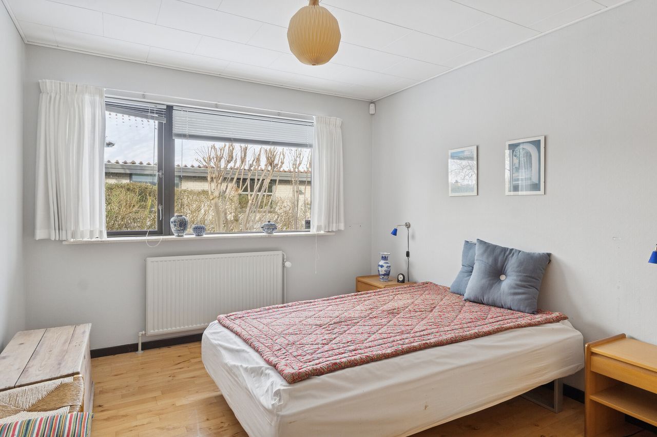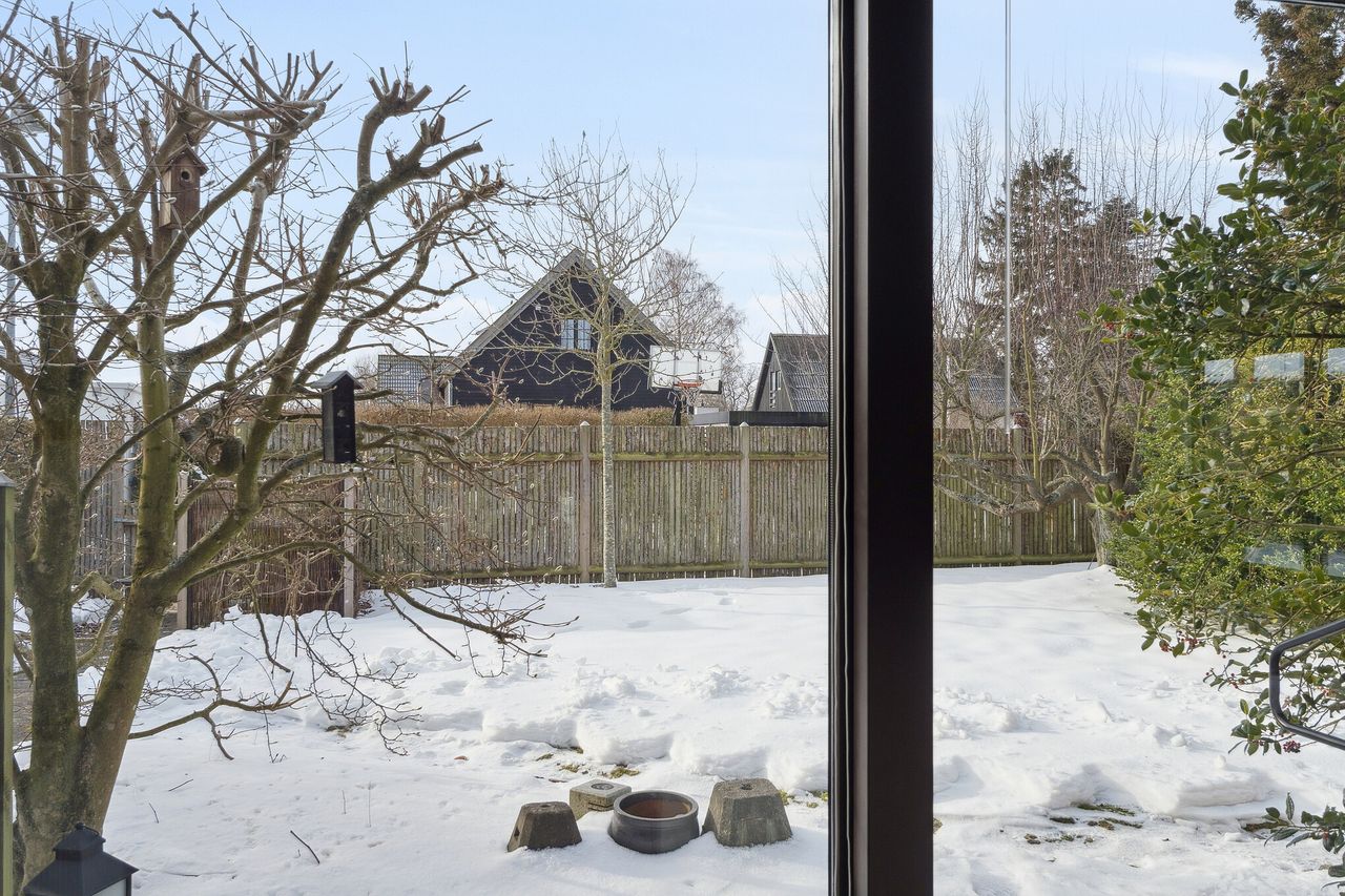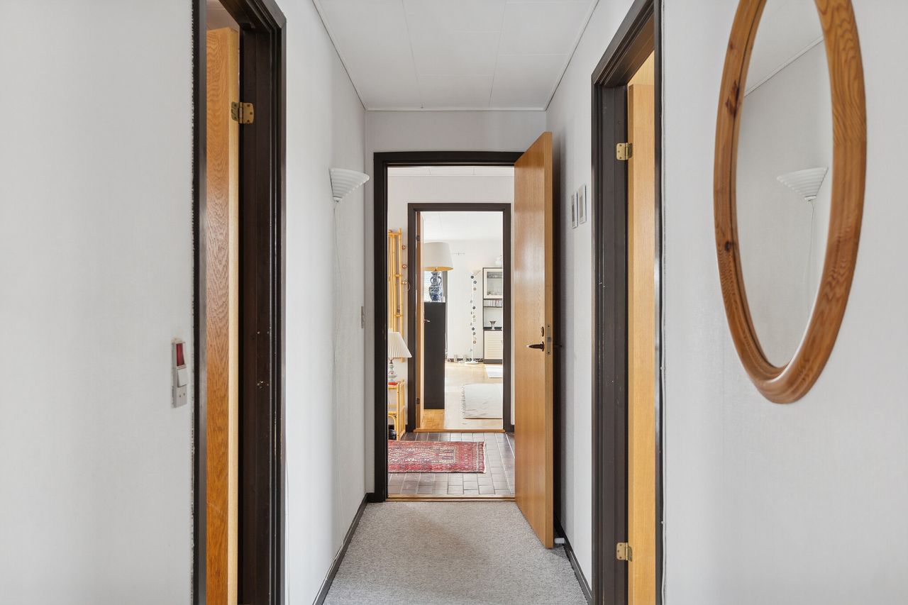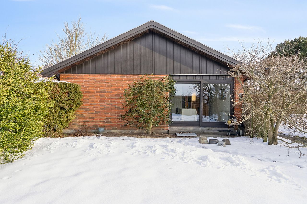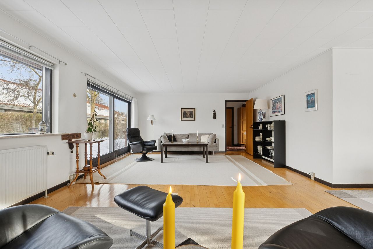 Ejendommen er på 137 kvm i 1 plan og indrettet som følger: Ankomst via havegang til indgangsparti med bred hall. Gæstebadeværelse med muret bruseniche. Mellemgang til to gode børneværelser og et stort soveværelse, alle med faste skabe. Badeværelse med badekar og muret bruseniche. Stort praktisk bryggers med egen indgang fra haven. Lys vinkelstue med udgang ti terrasse og haven og spiseplads i forbindelse med køkken. Huset har mange vinduer, hvilket giver masser af lys overalt. Haven er aflukket og privat og med en god variation i træer, planter og buske.