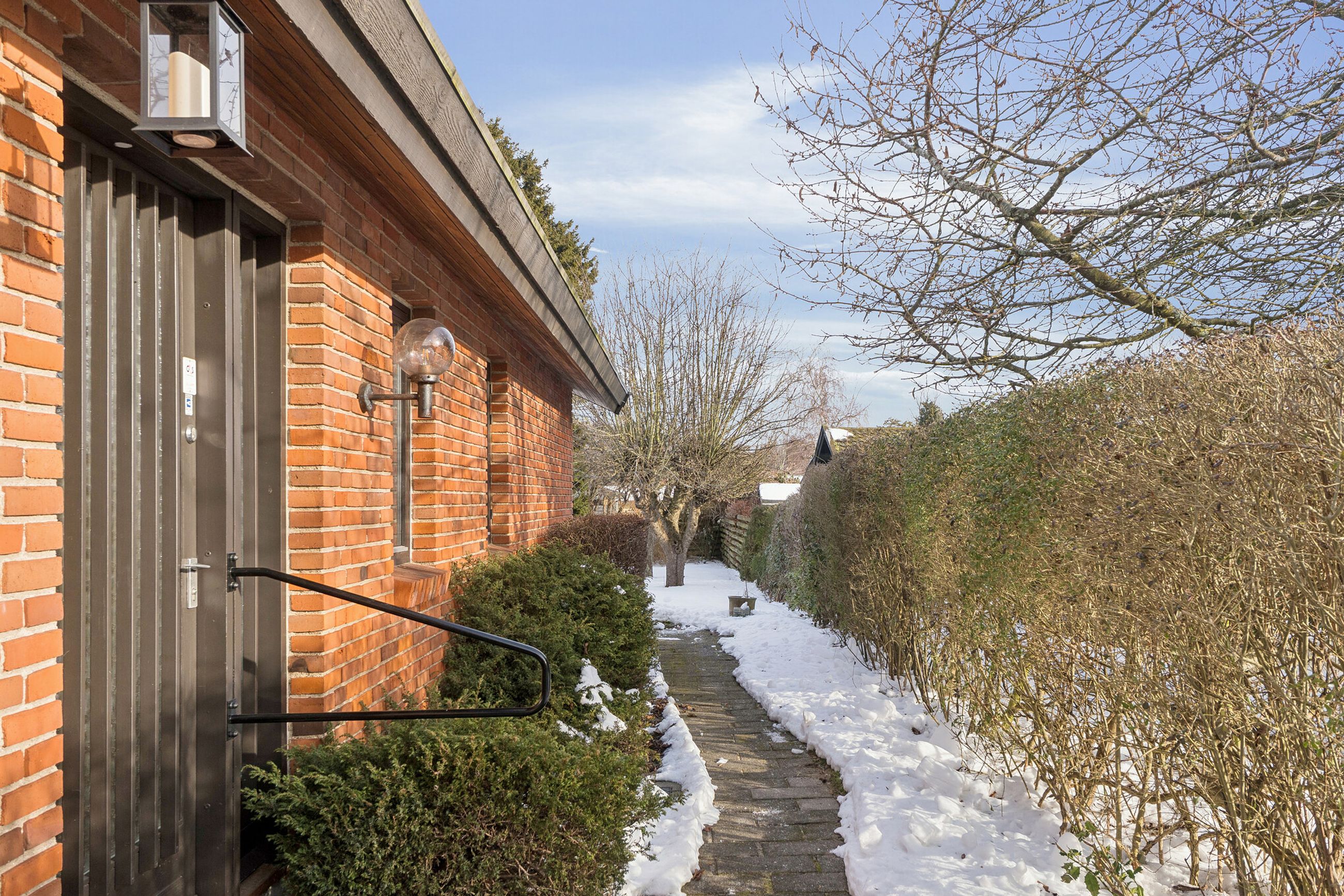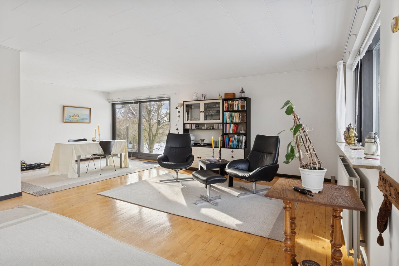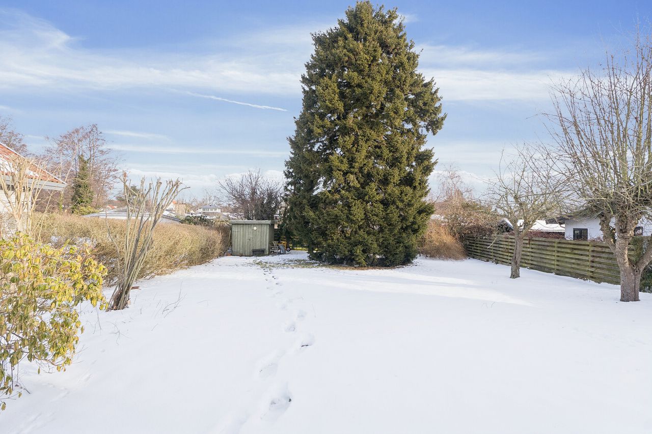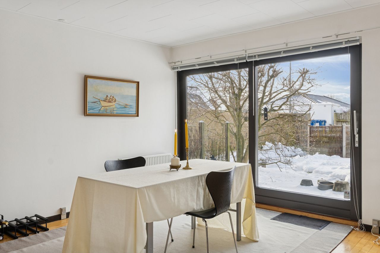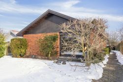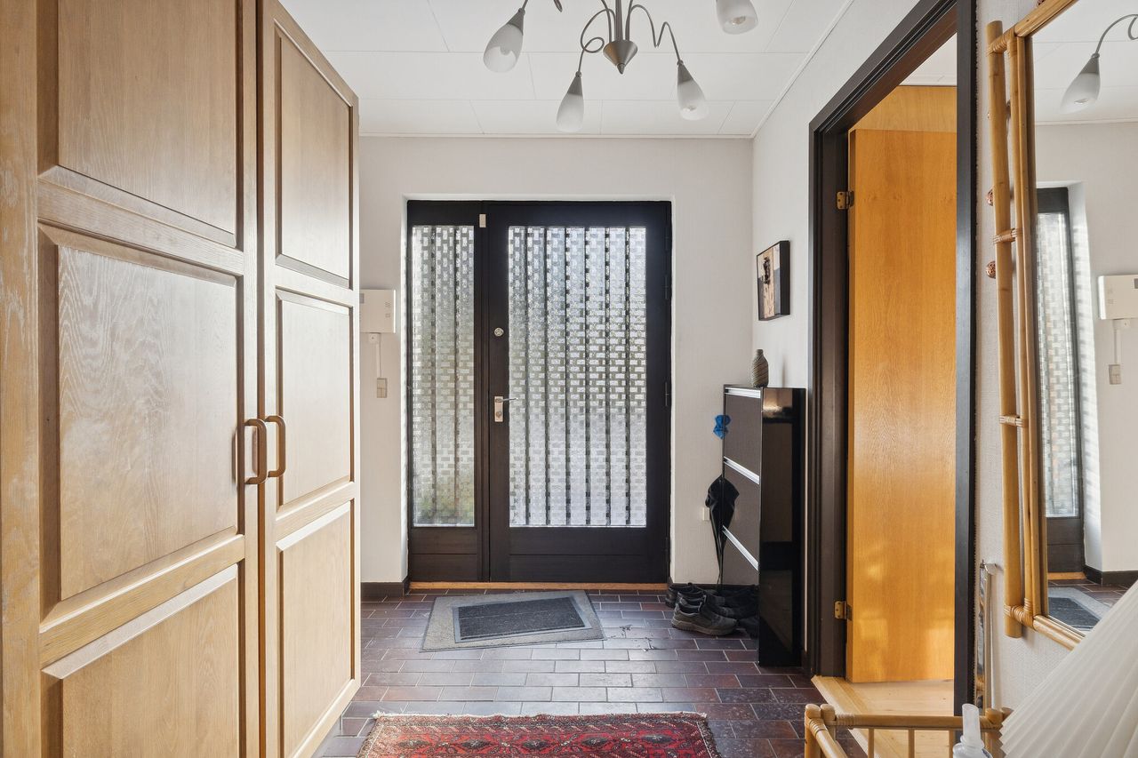 Ejendommen er på 137 kvm i 1 plan og indrettet som følger: Ankomst via havegang til indgangsparti med bred hall. Gæstebadeværelse med muret bruseniche. Mellemgang til to gode børneværelser og et stort soveværelse, alle med faste skabe. Badeværelse med badekar og muret bruseniche. Stort praktisk bryggers med egen indgang fra haven. Lys vinkelstue med udgang ti terrasse og haven og spiseplads i forbindelse med køkken. Huset har mange vinduer, hvilket giver masser af lys overalt. Haven er aflukket og privat og med en god variation i træer, planter og buske.
